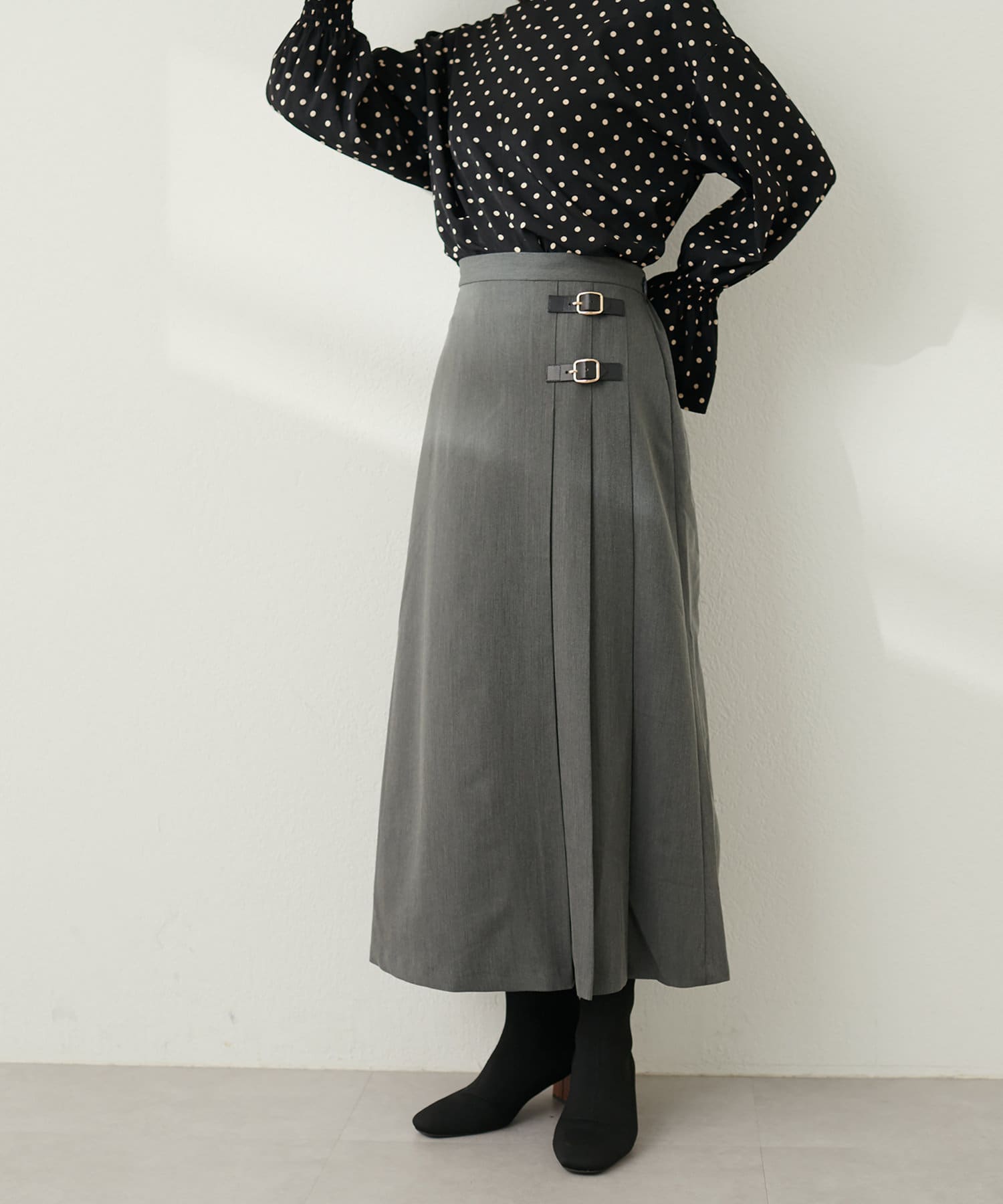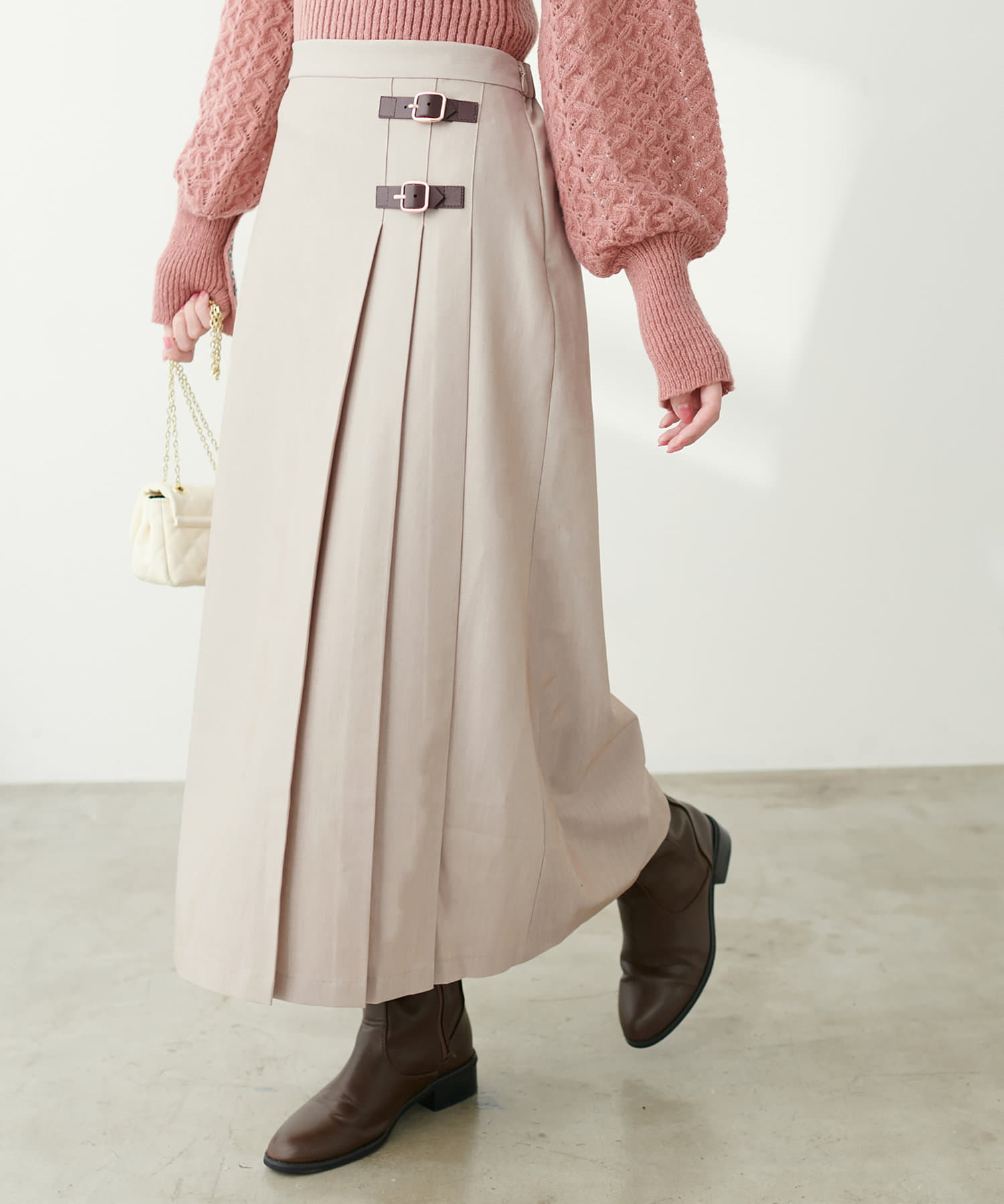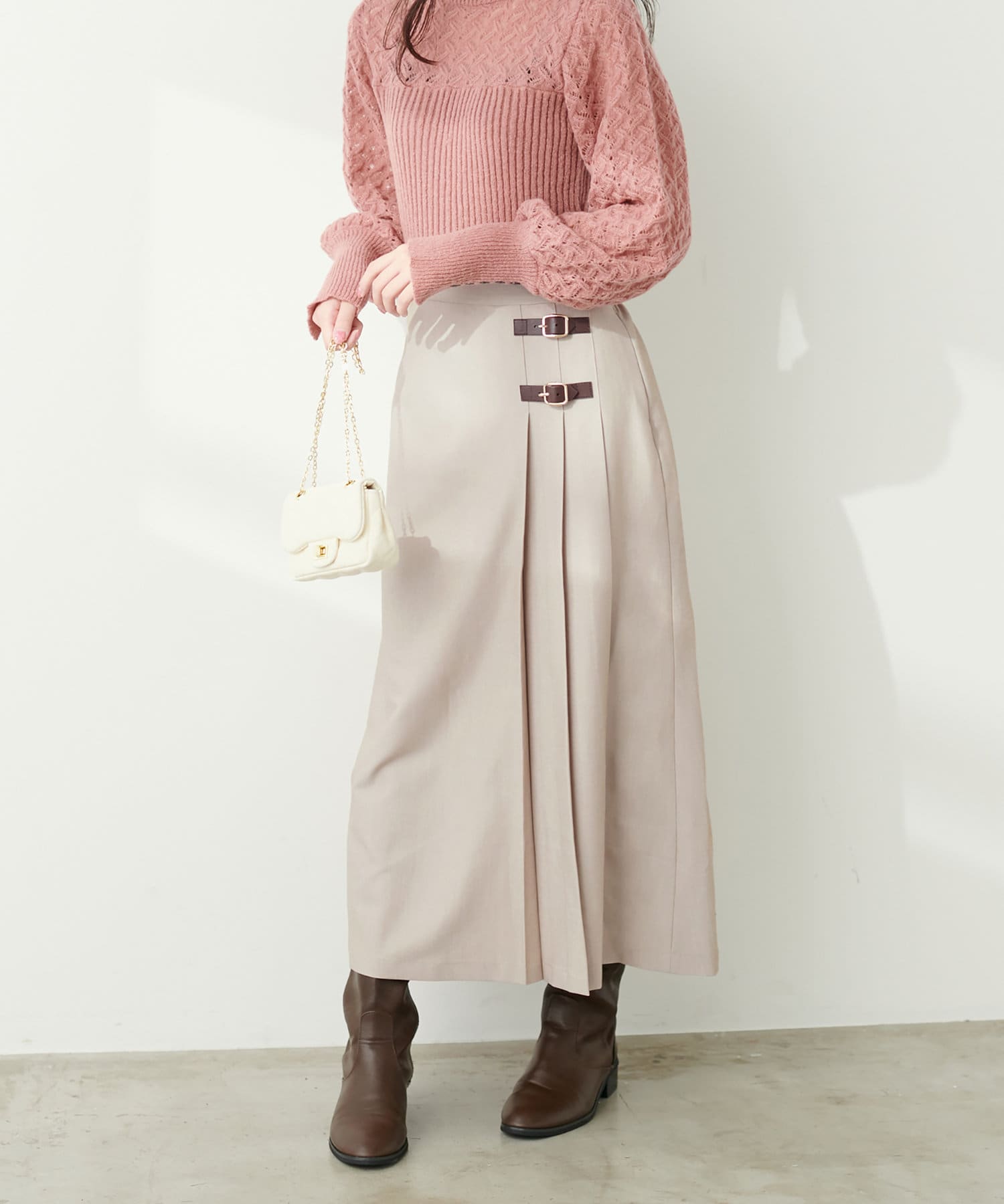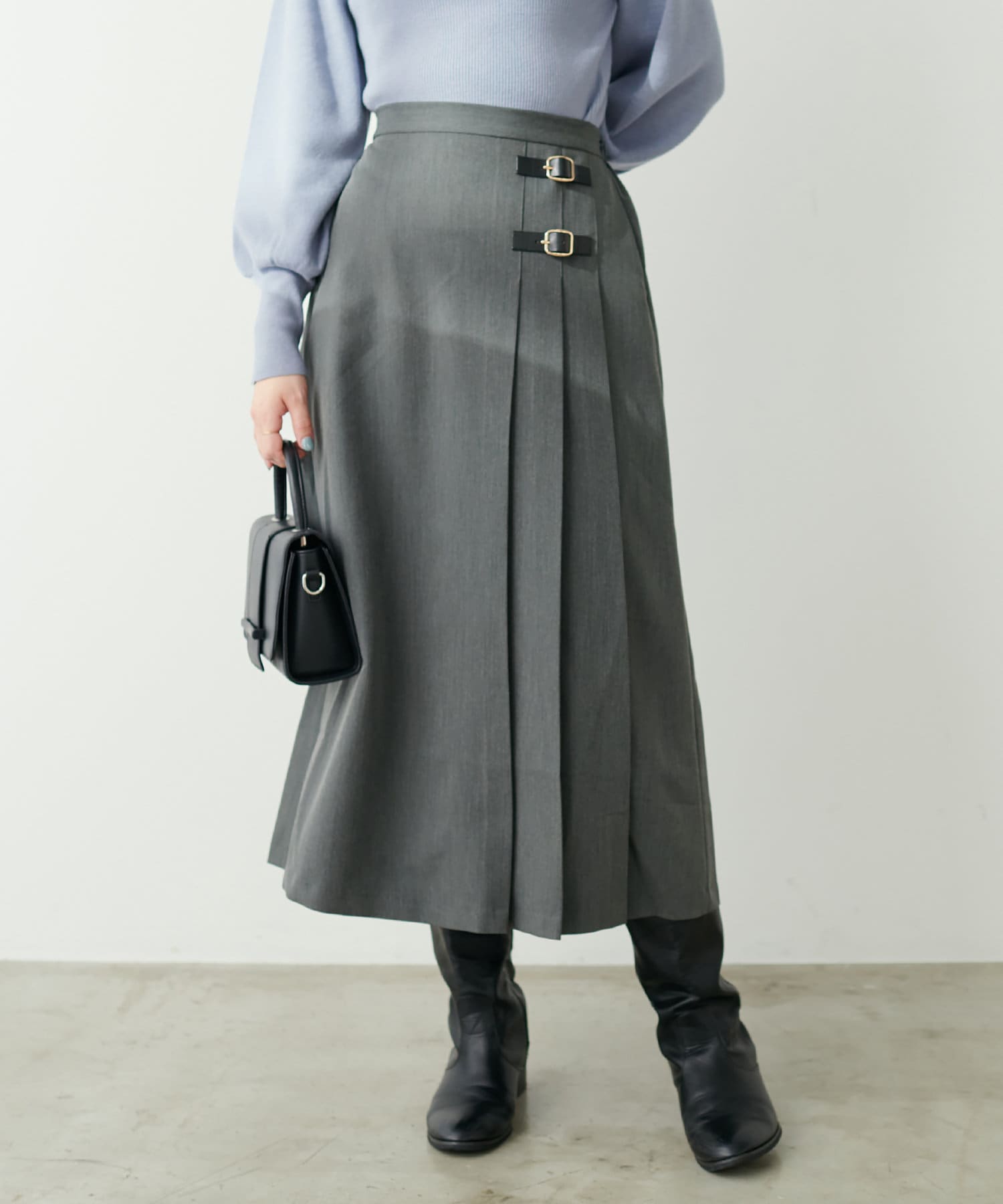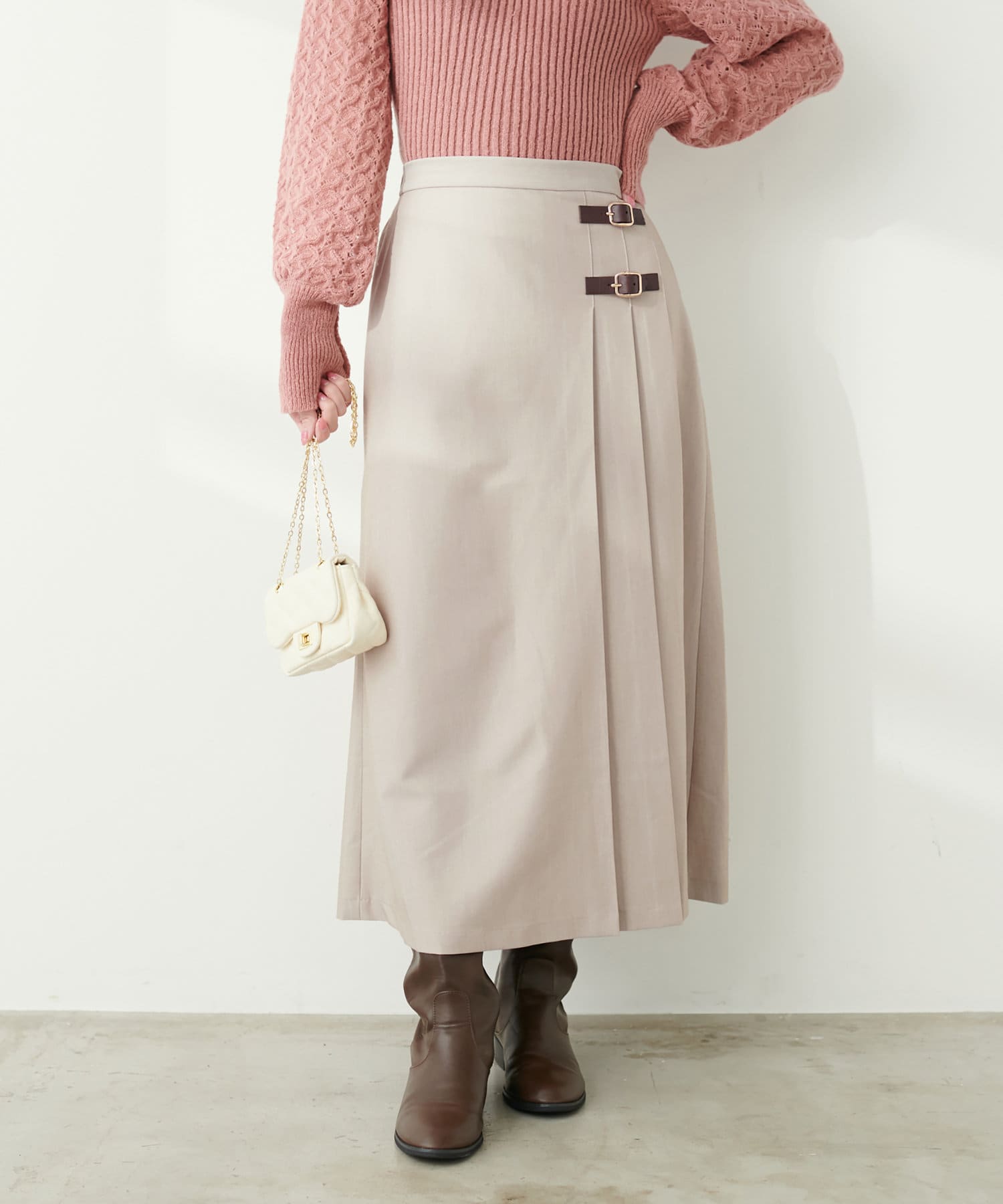 フロントの2本の合皮ベルトが大人レディな印象のAラインスカート。