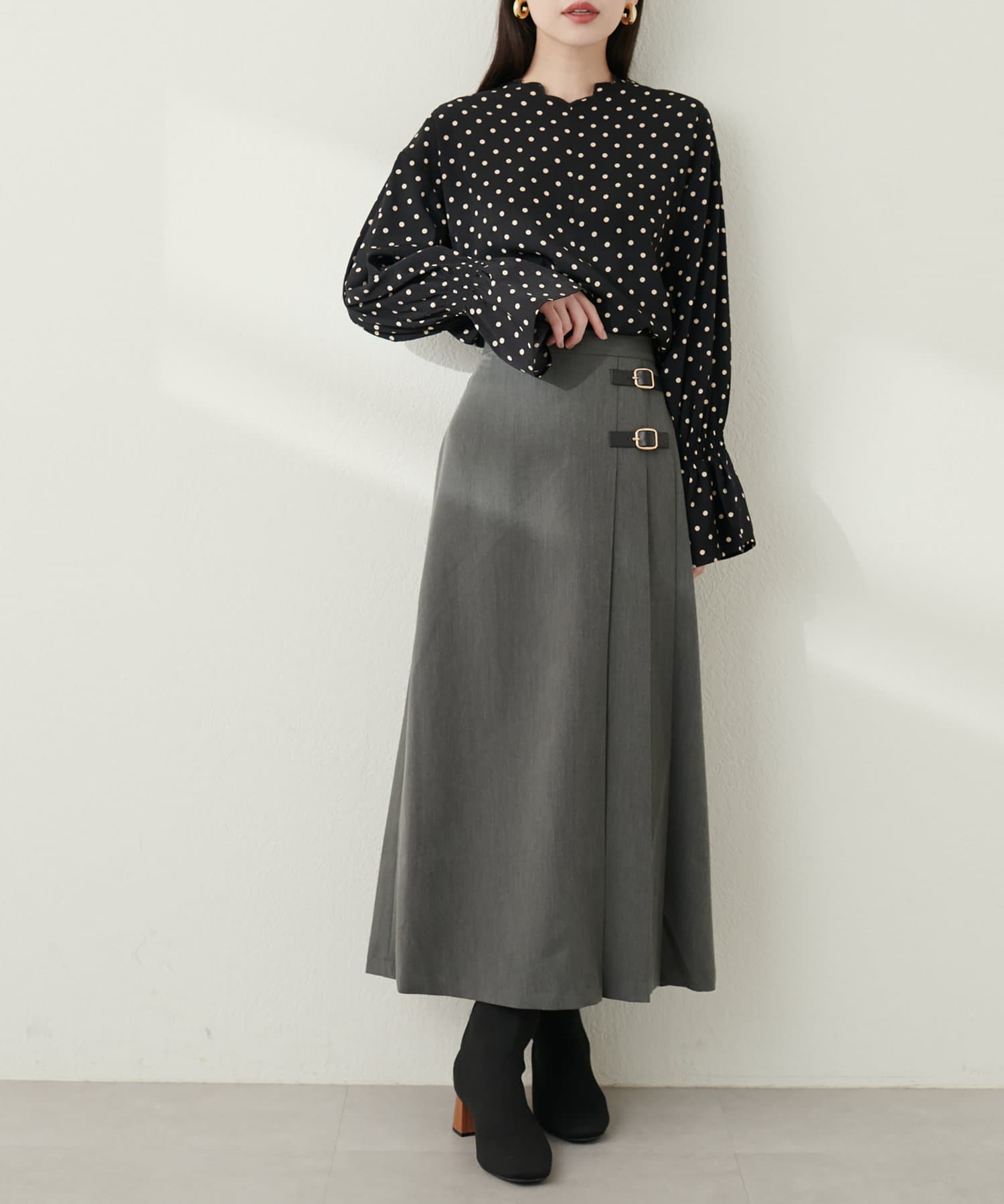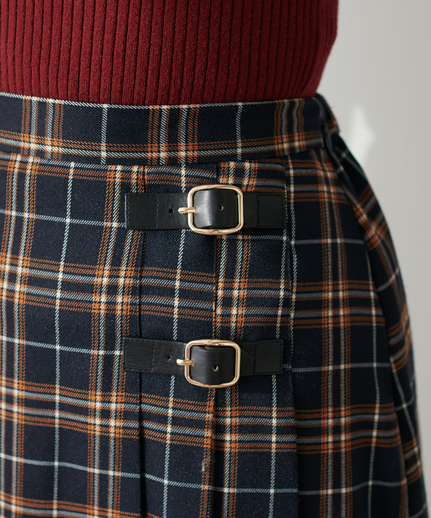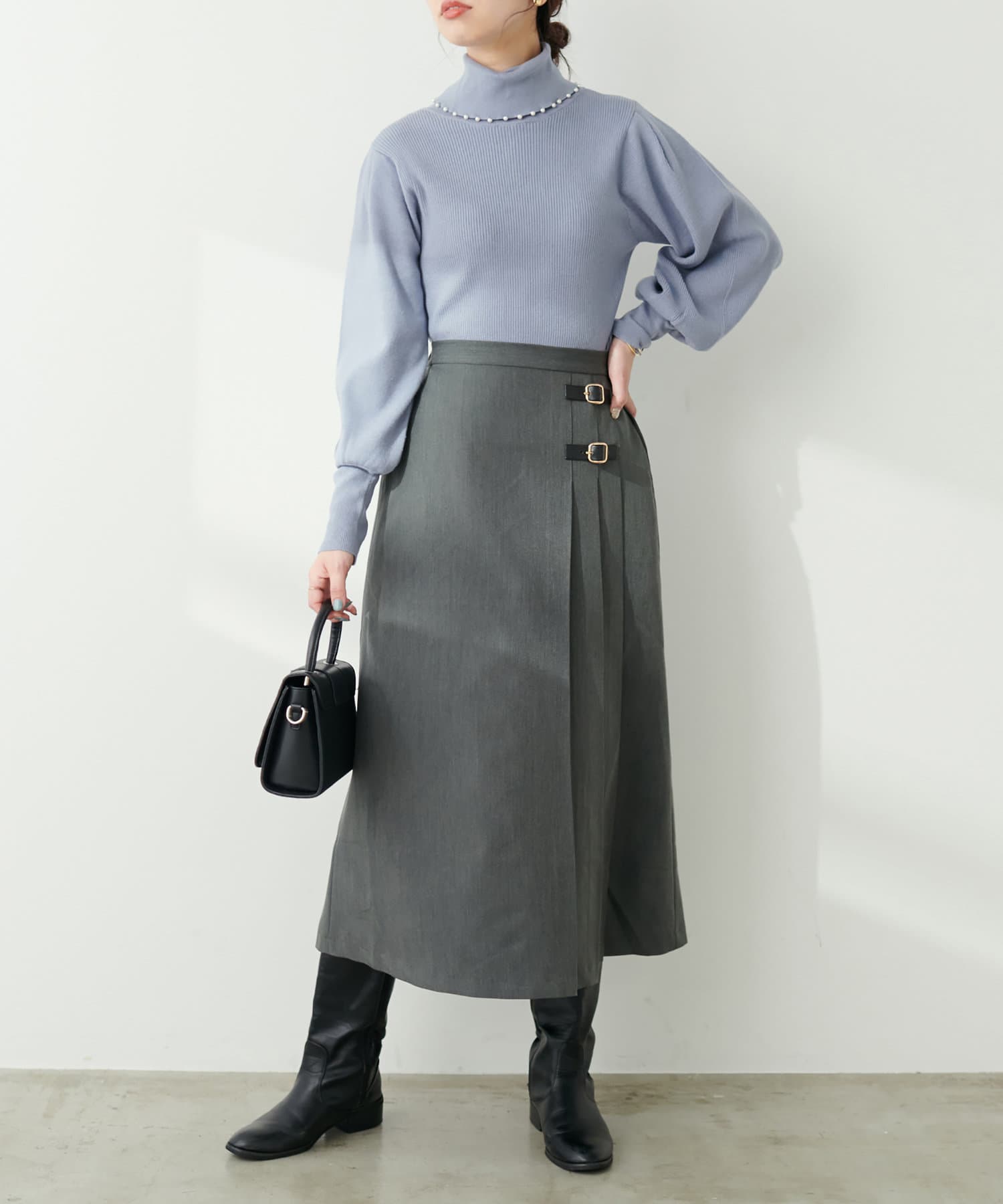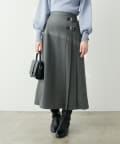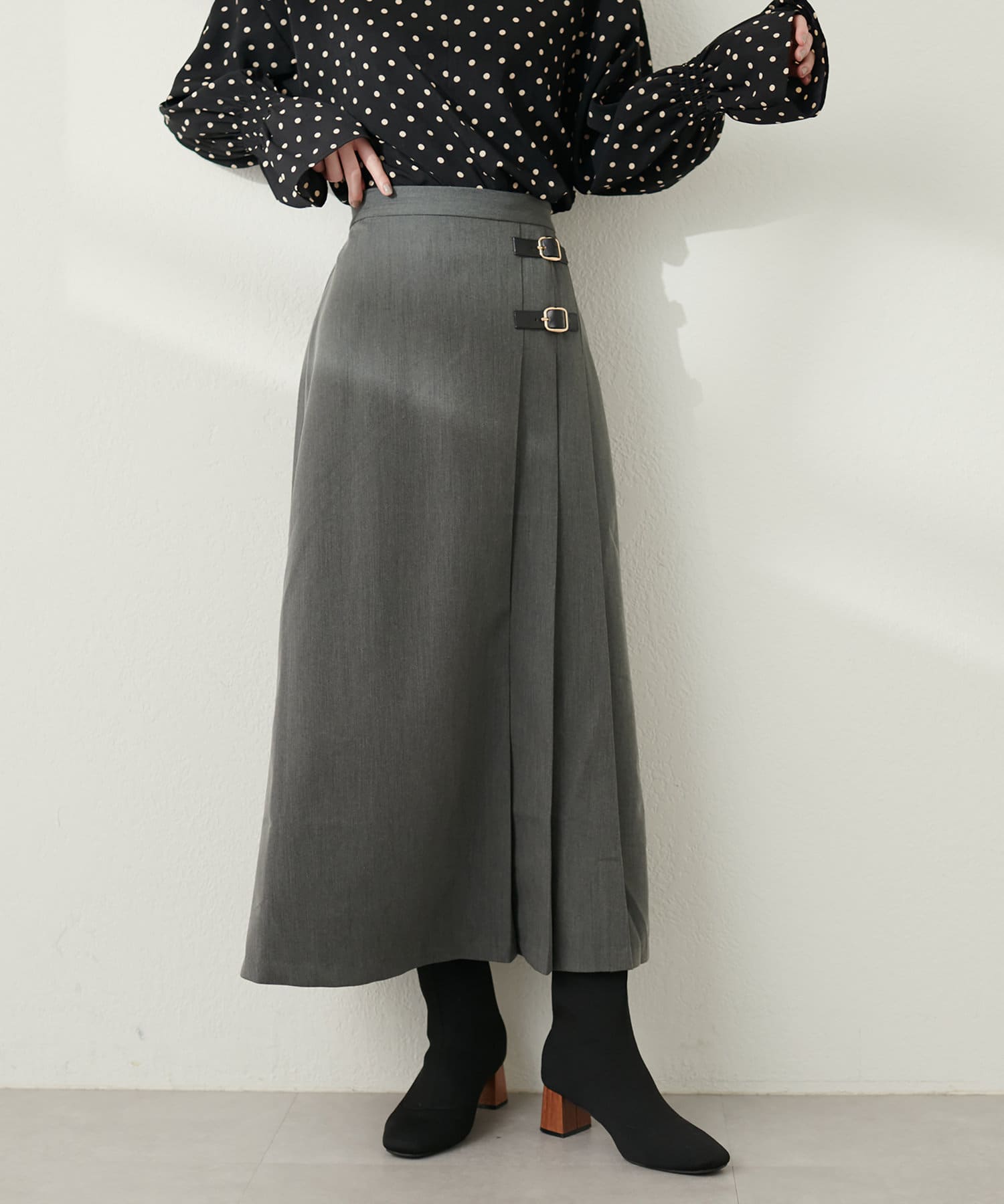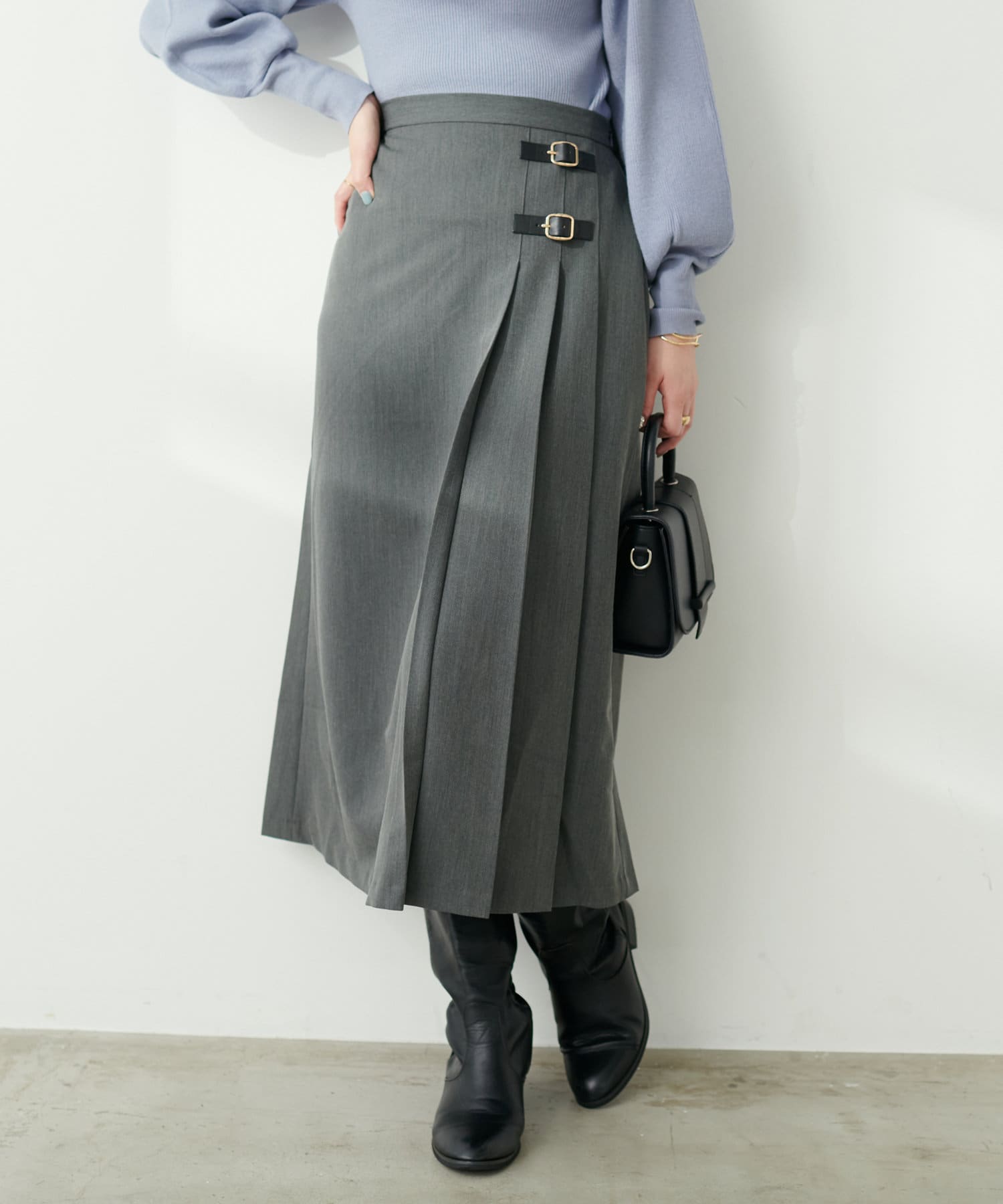 フロントの2本の合皮ベルトが大人レディな印象のAラインスカート。
