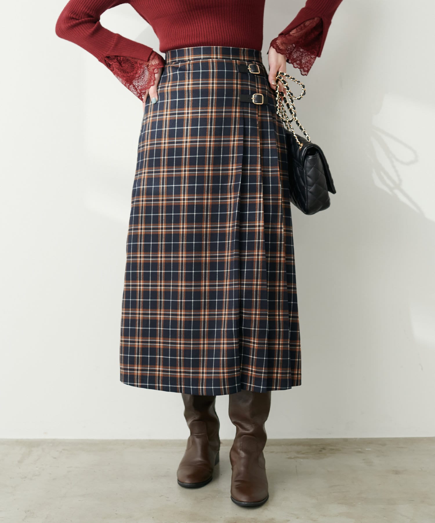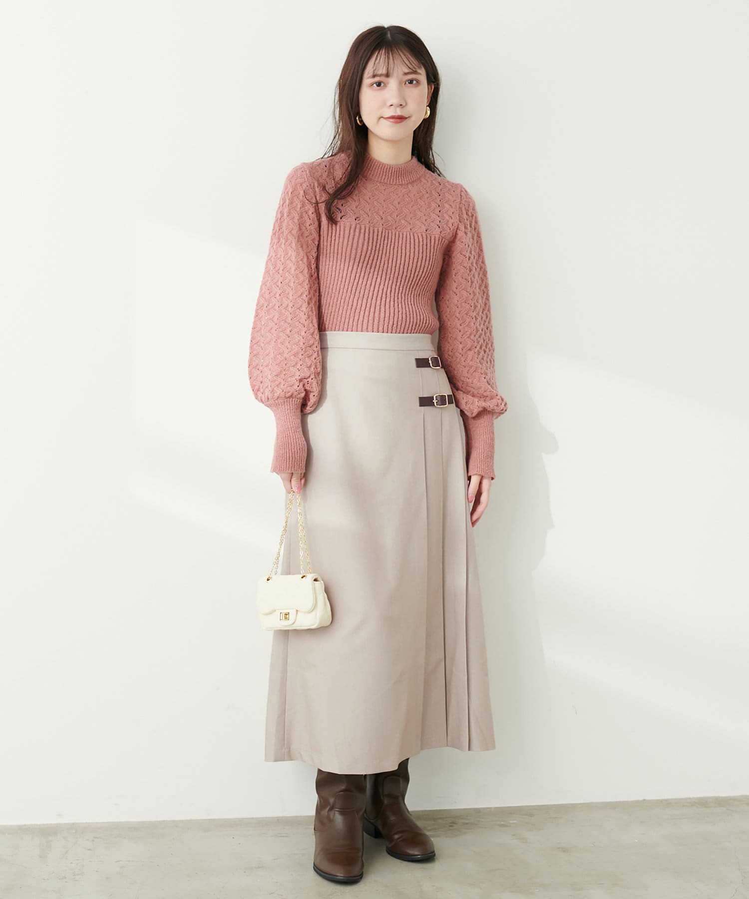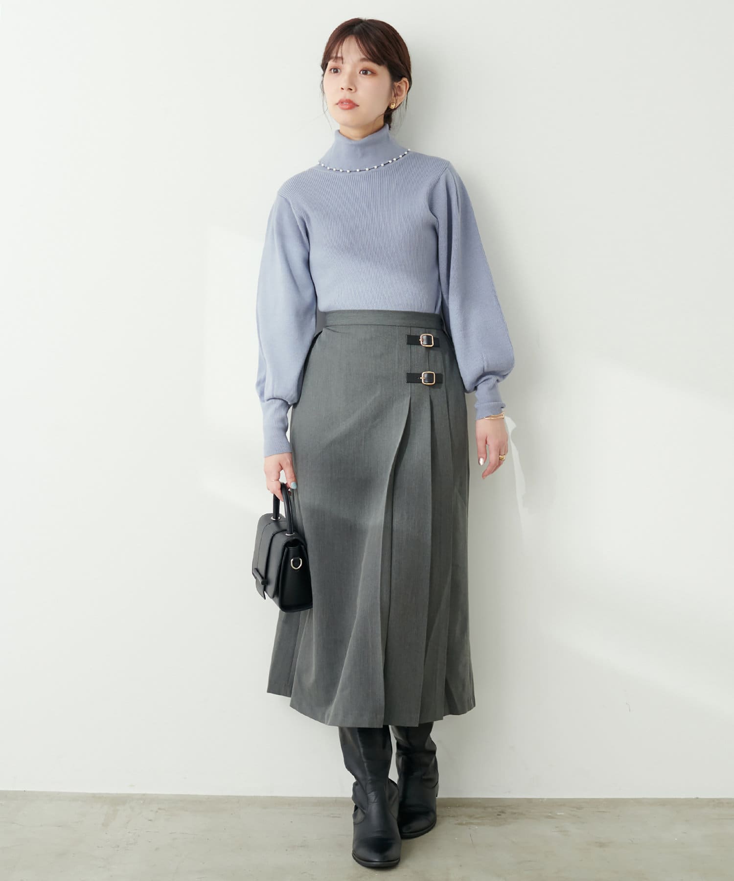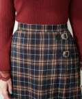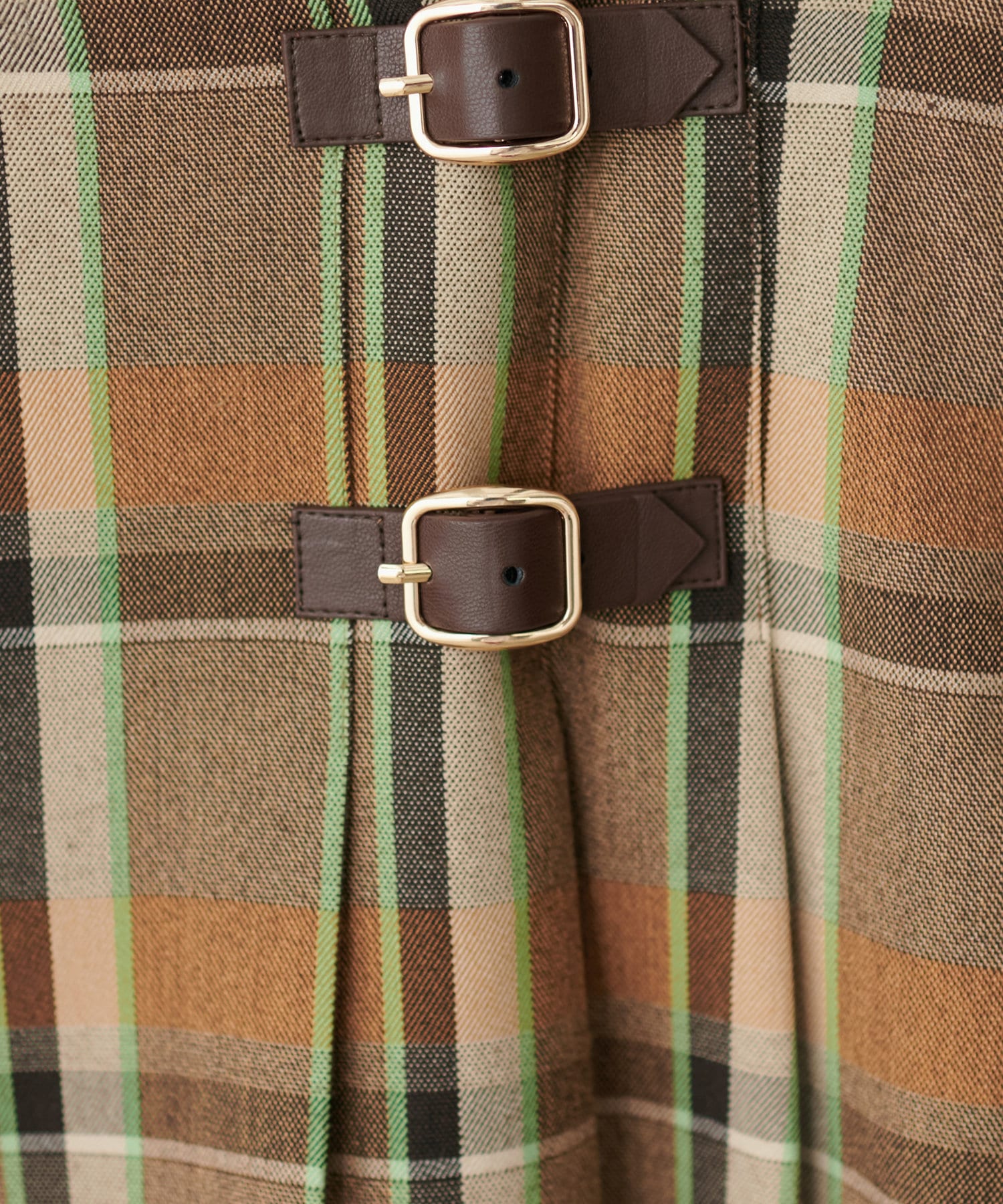 フロントの2本の合皮ベルトが大人レディな印象のAラインスカート。