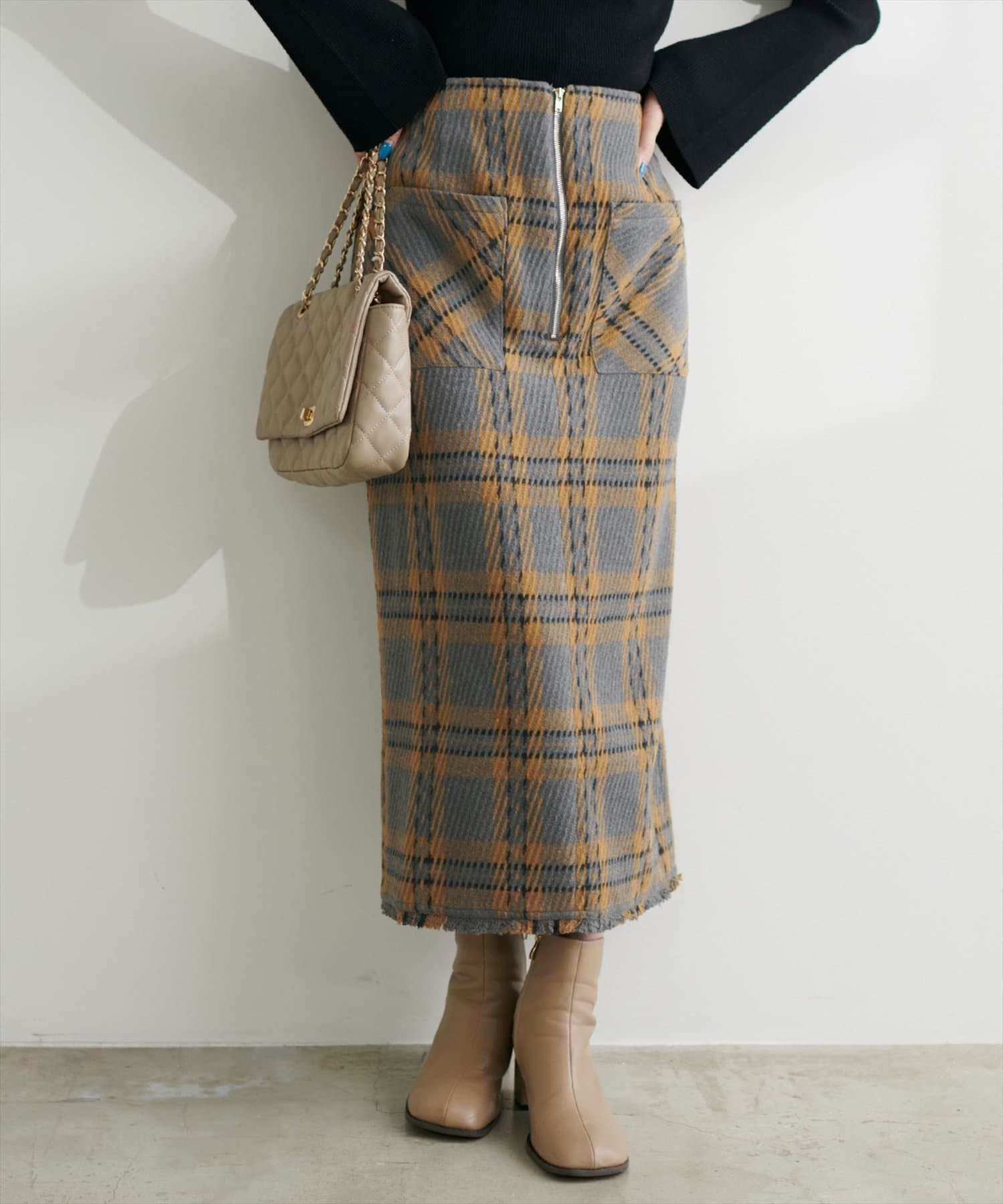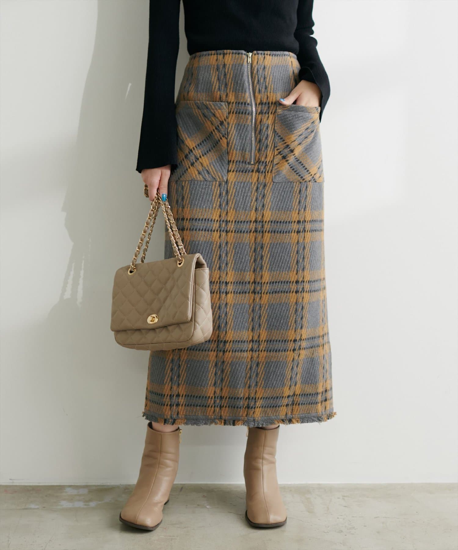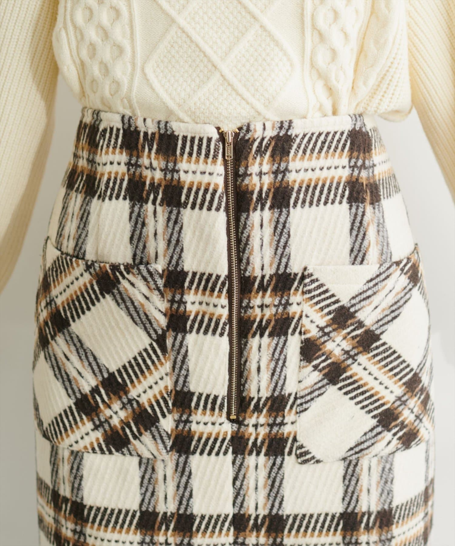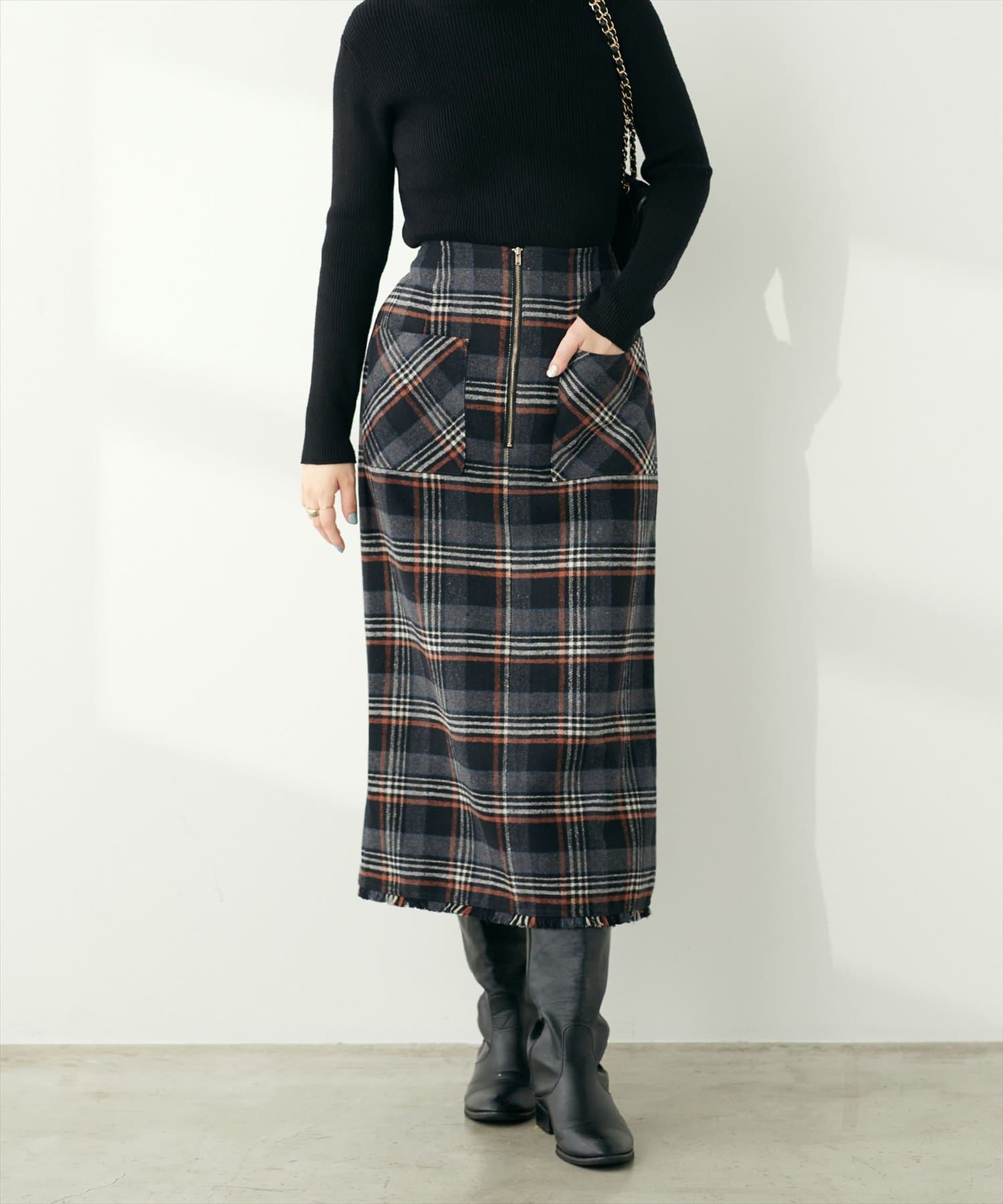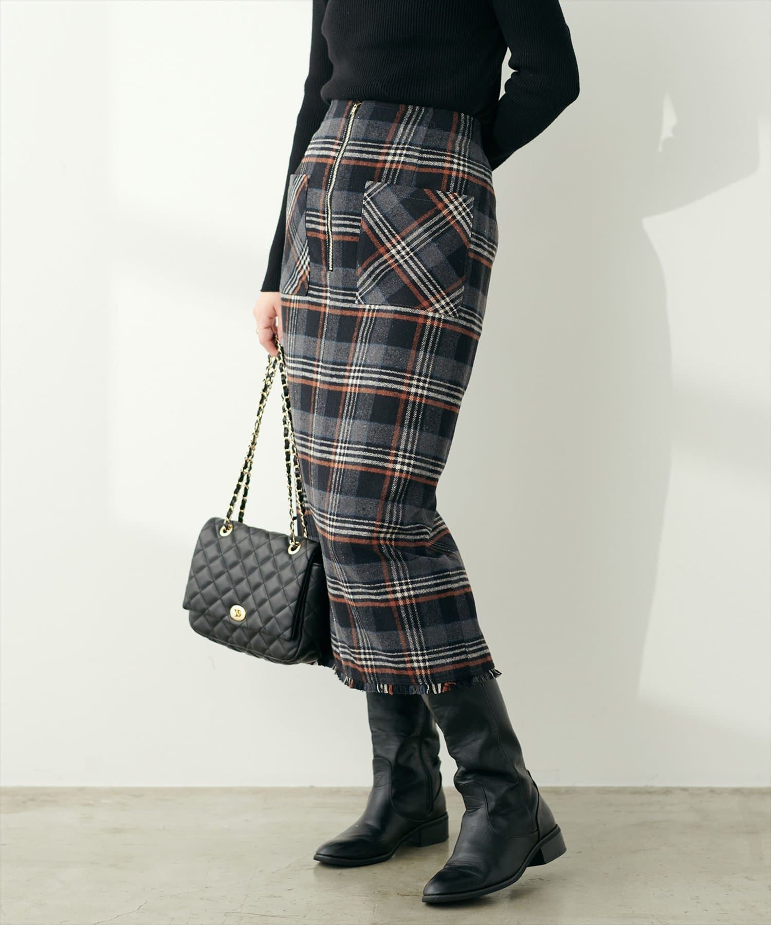 秋冬を先取りできる大き目のチェック柄と、センターに入ったZIPデザインが目を惹くタイトスカート。