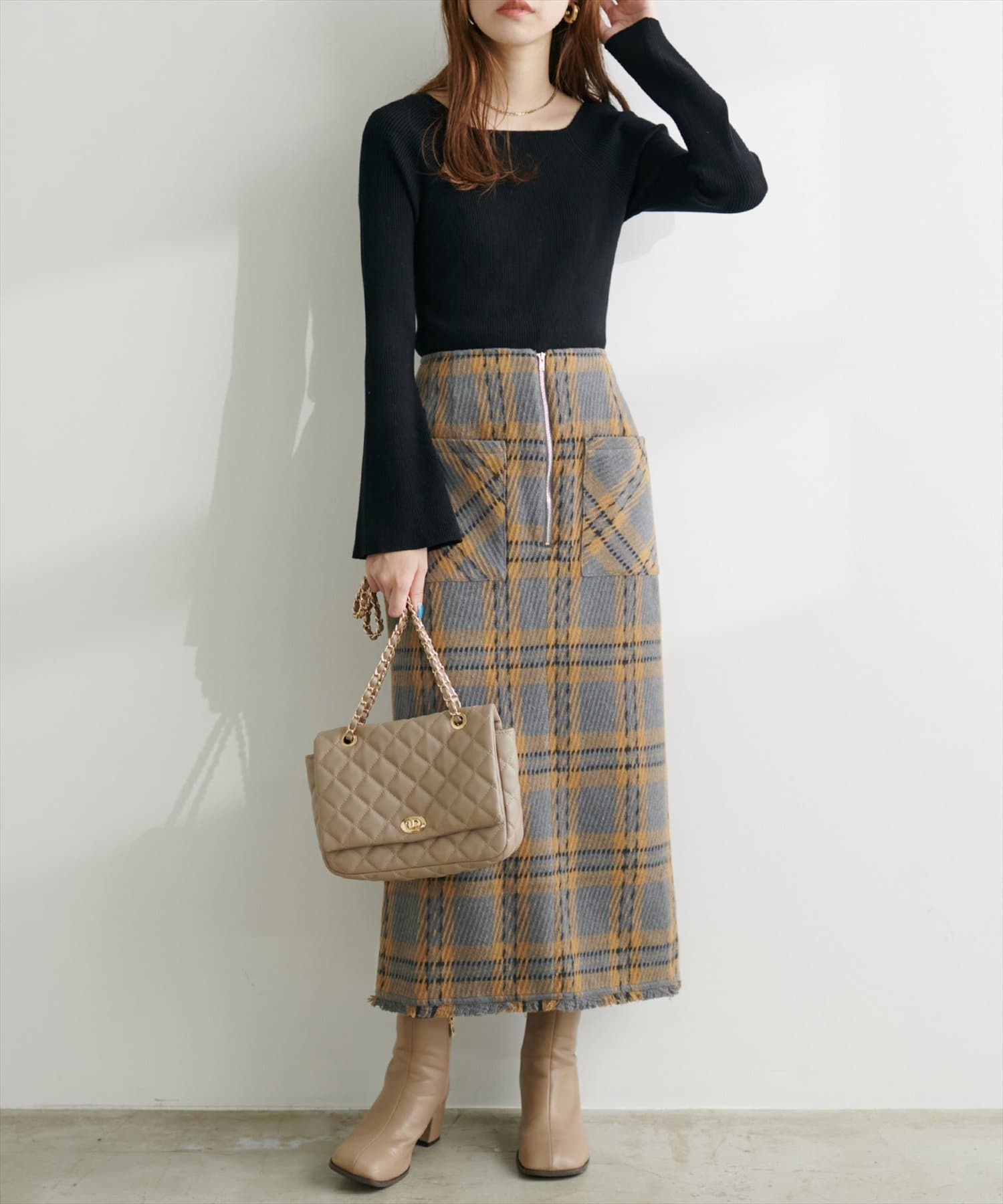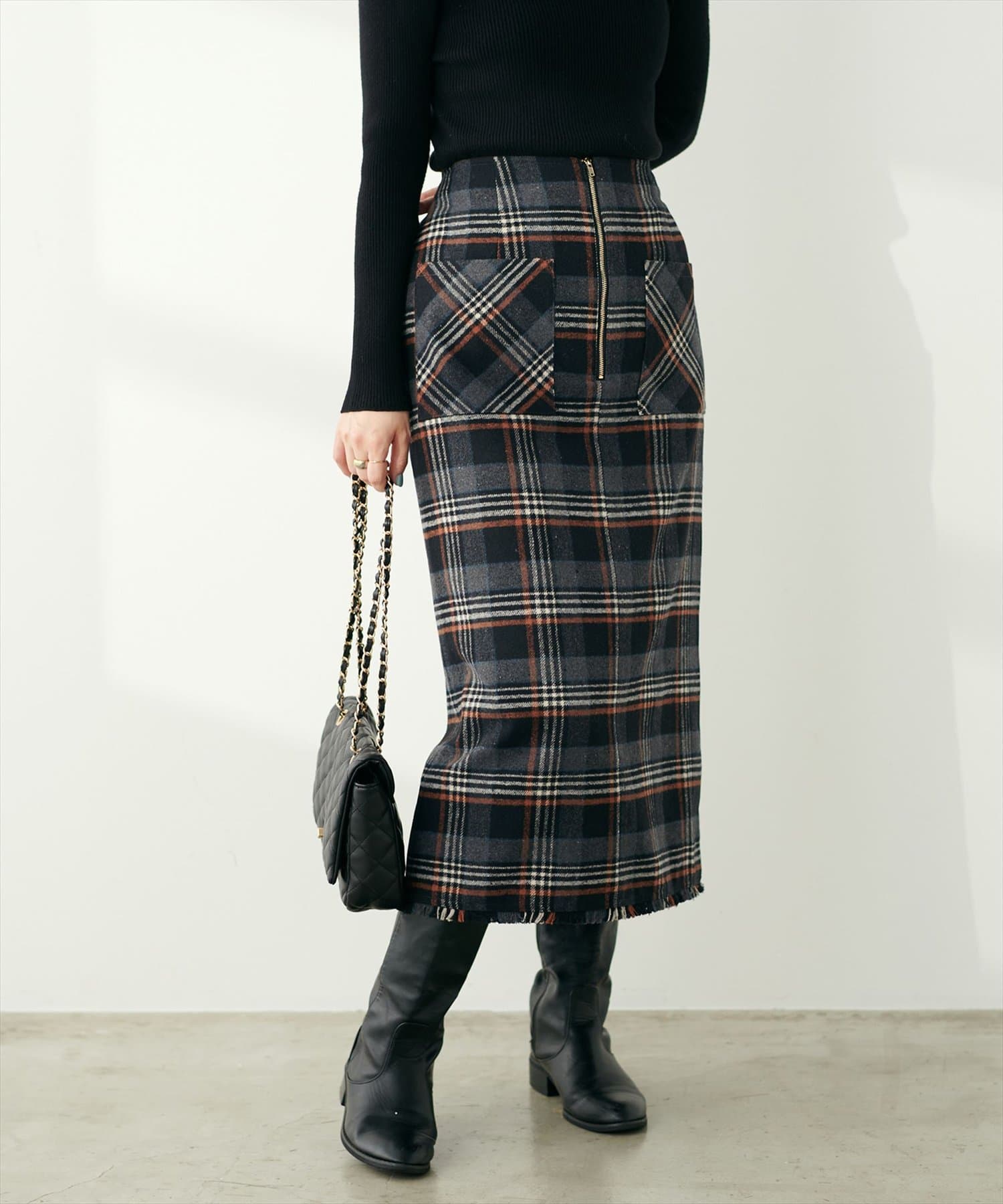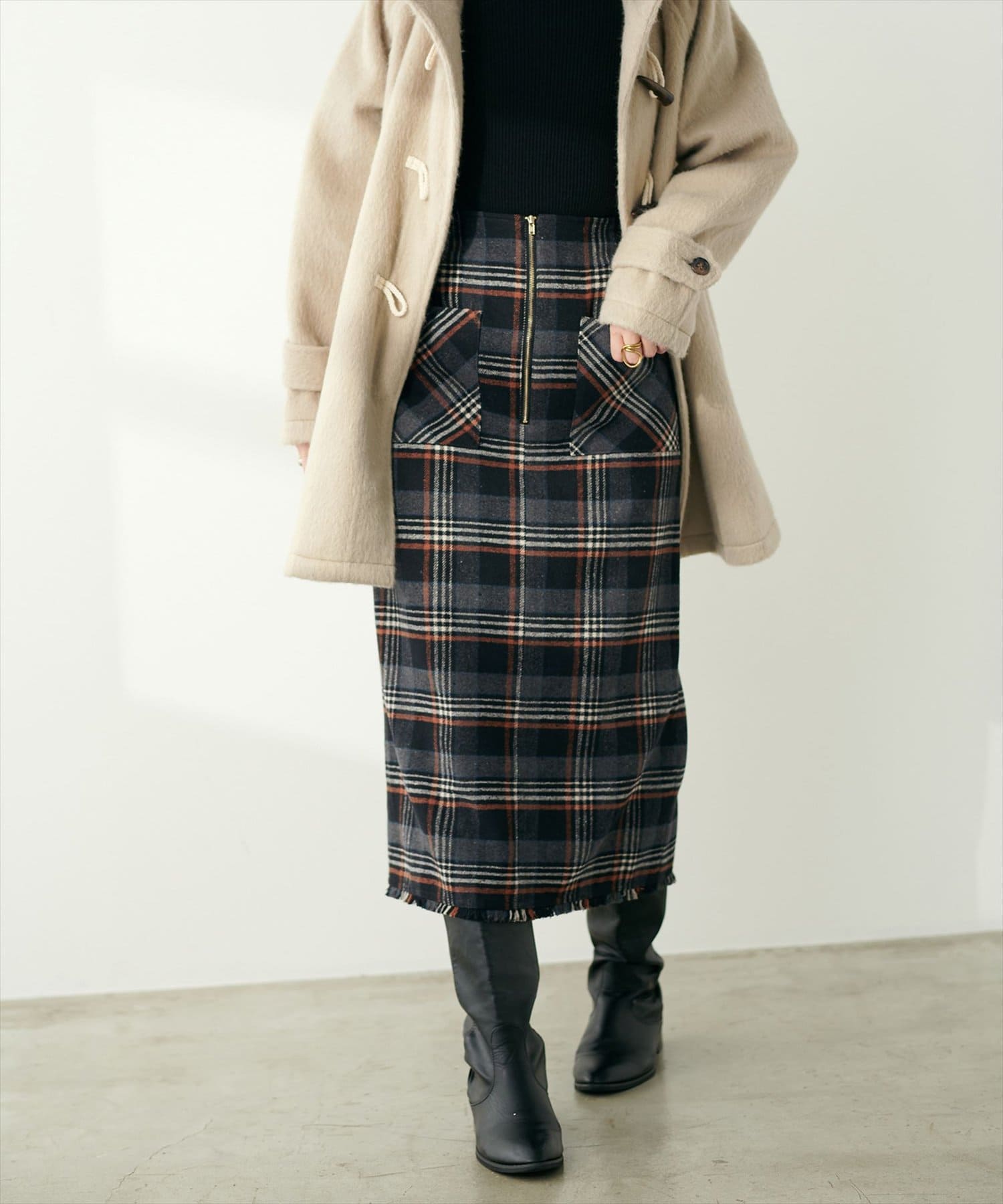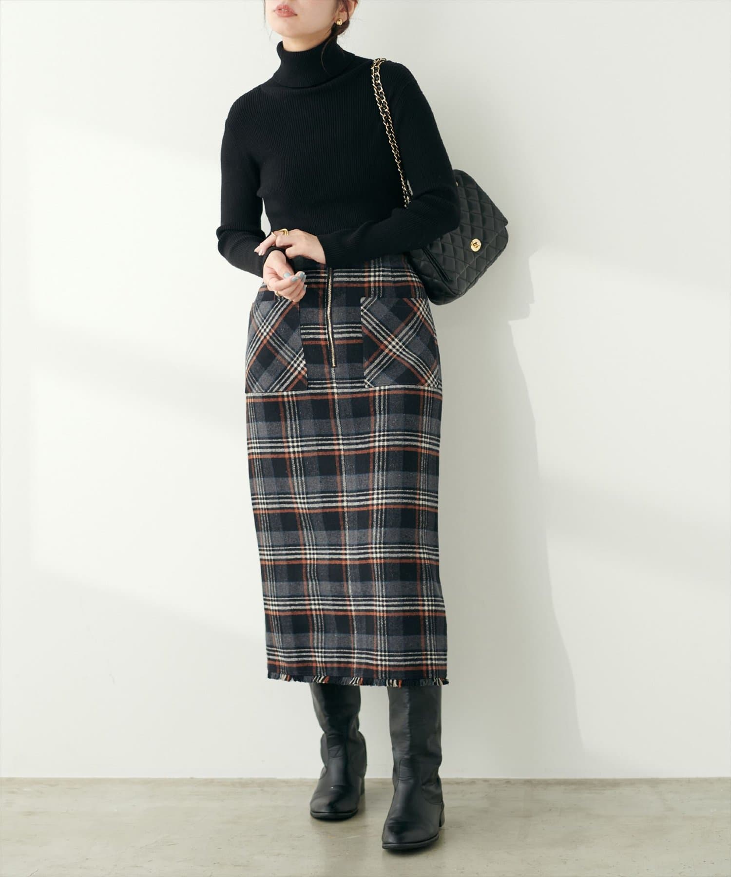 秋冬を先取りできる大き目のチェック柄と、センターに入ったZIPデザインが目を惹くタイトスカート。