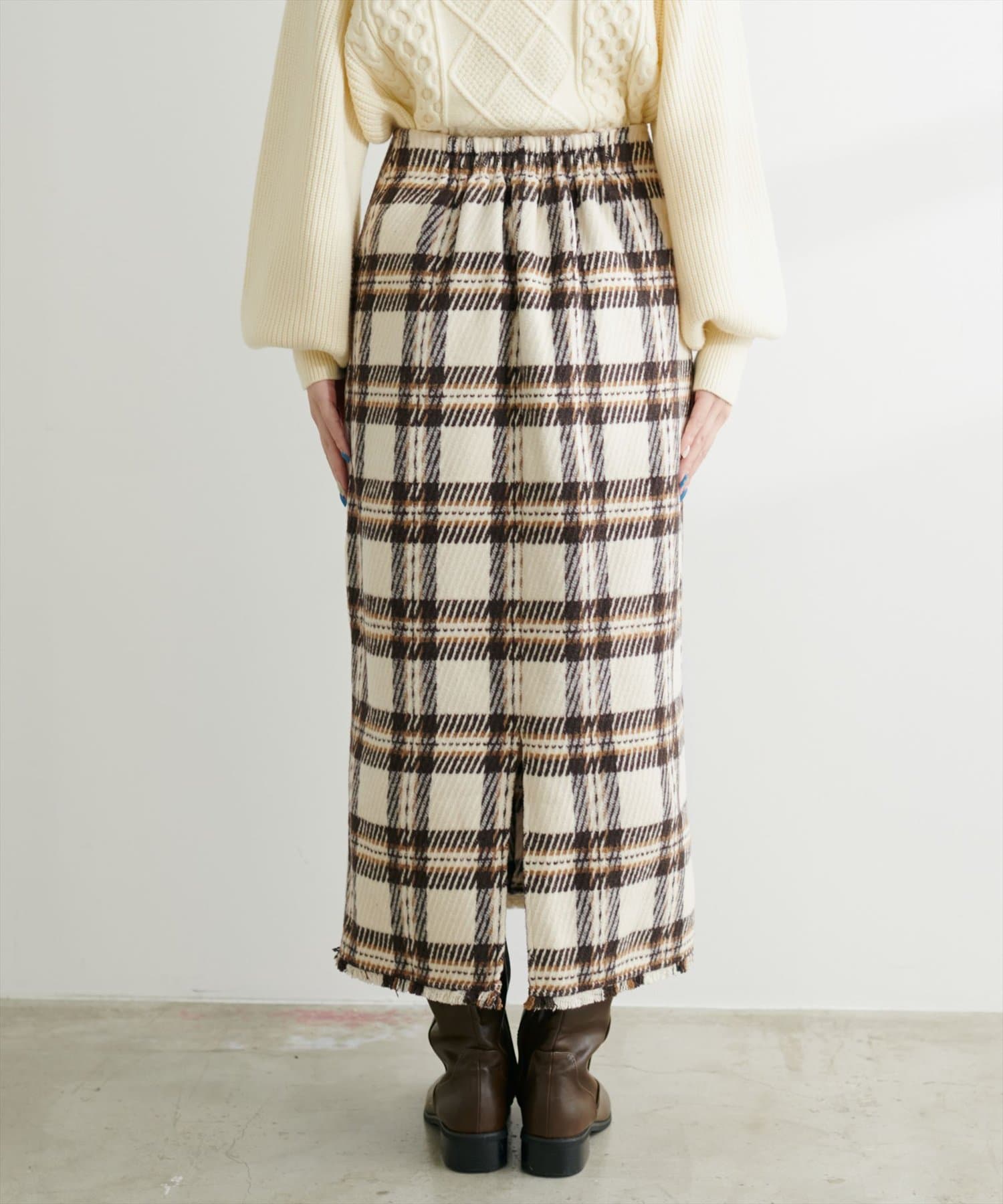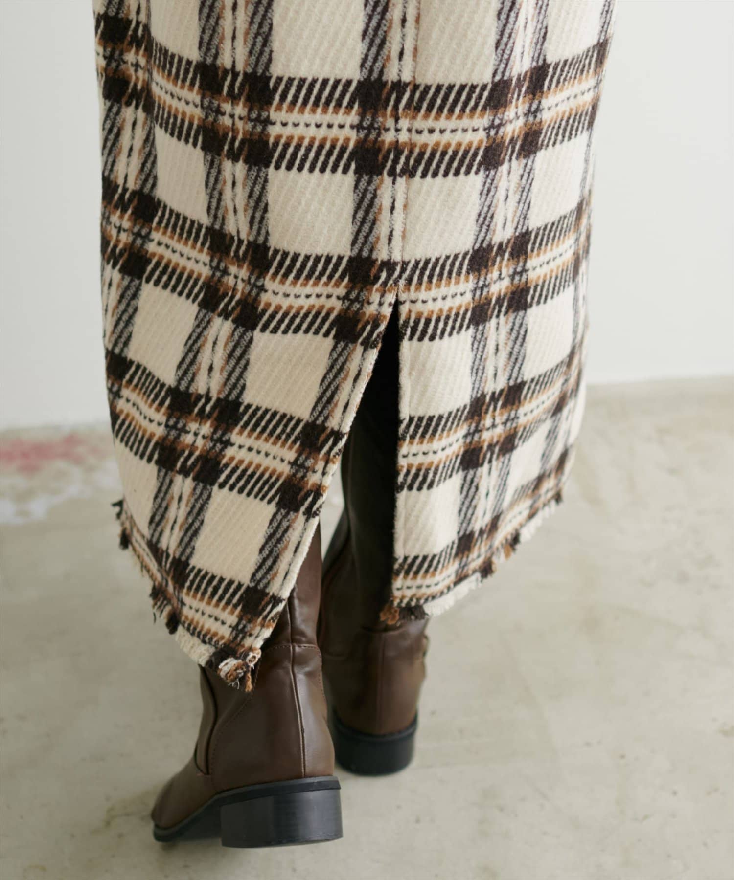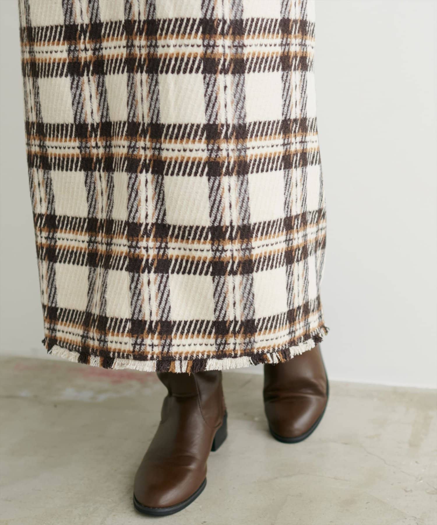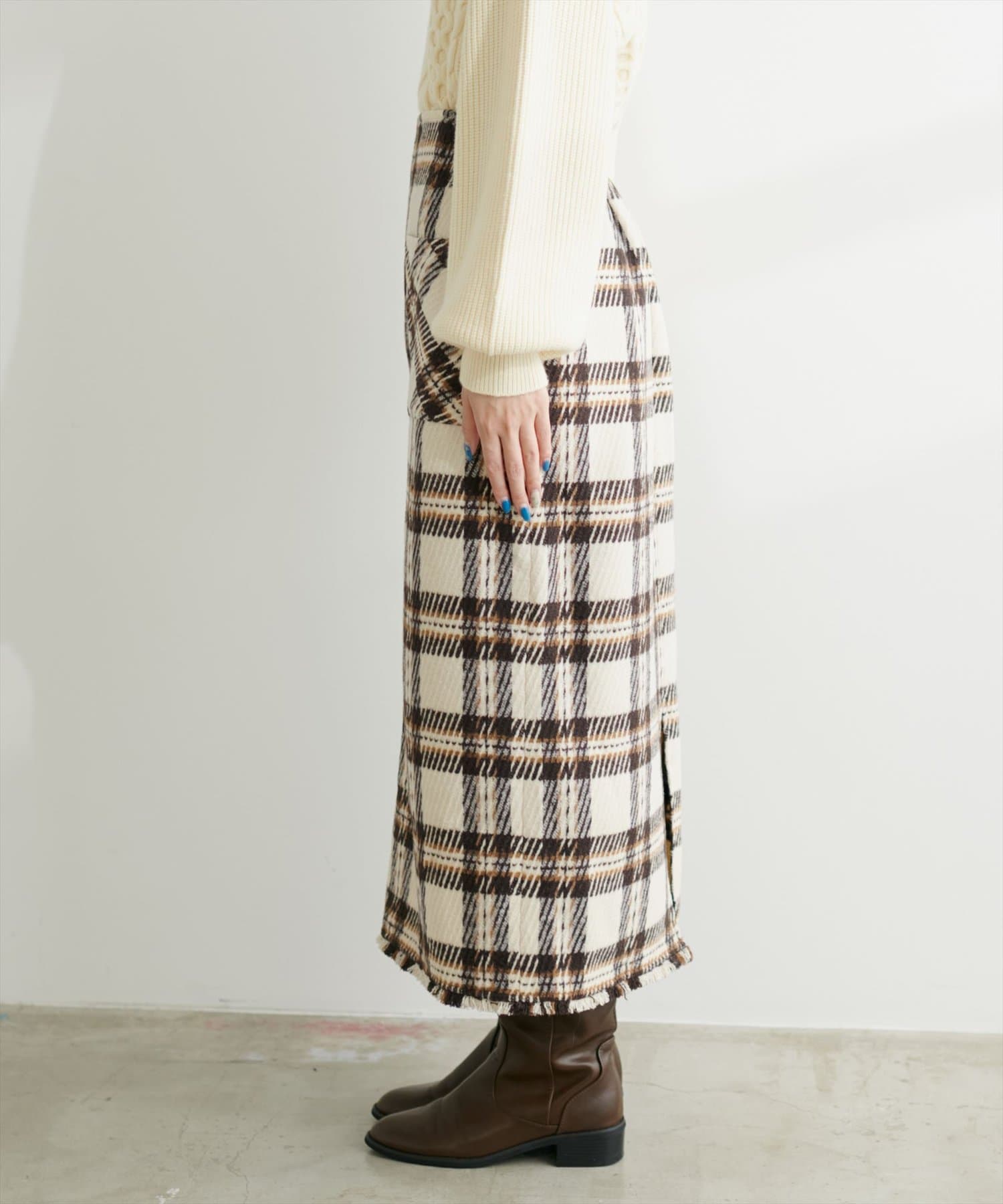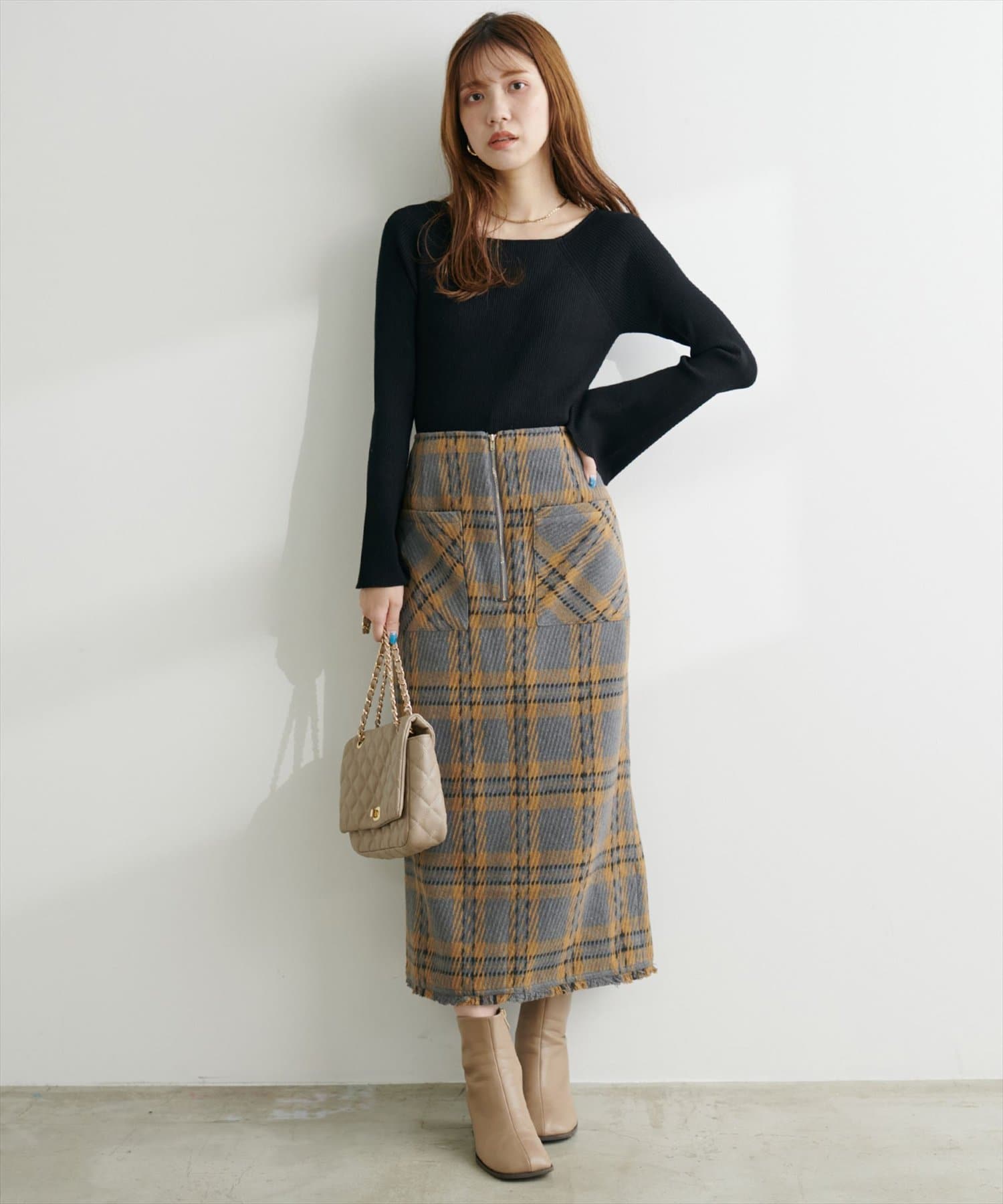 秋冬を先取りできる大き目のチェック柄と、センターに入ったZIPデザインが目を惹くタイトスカート。
