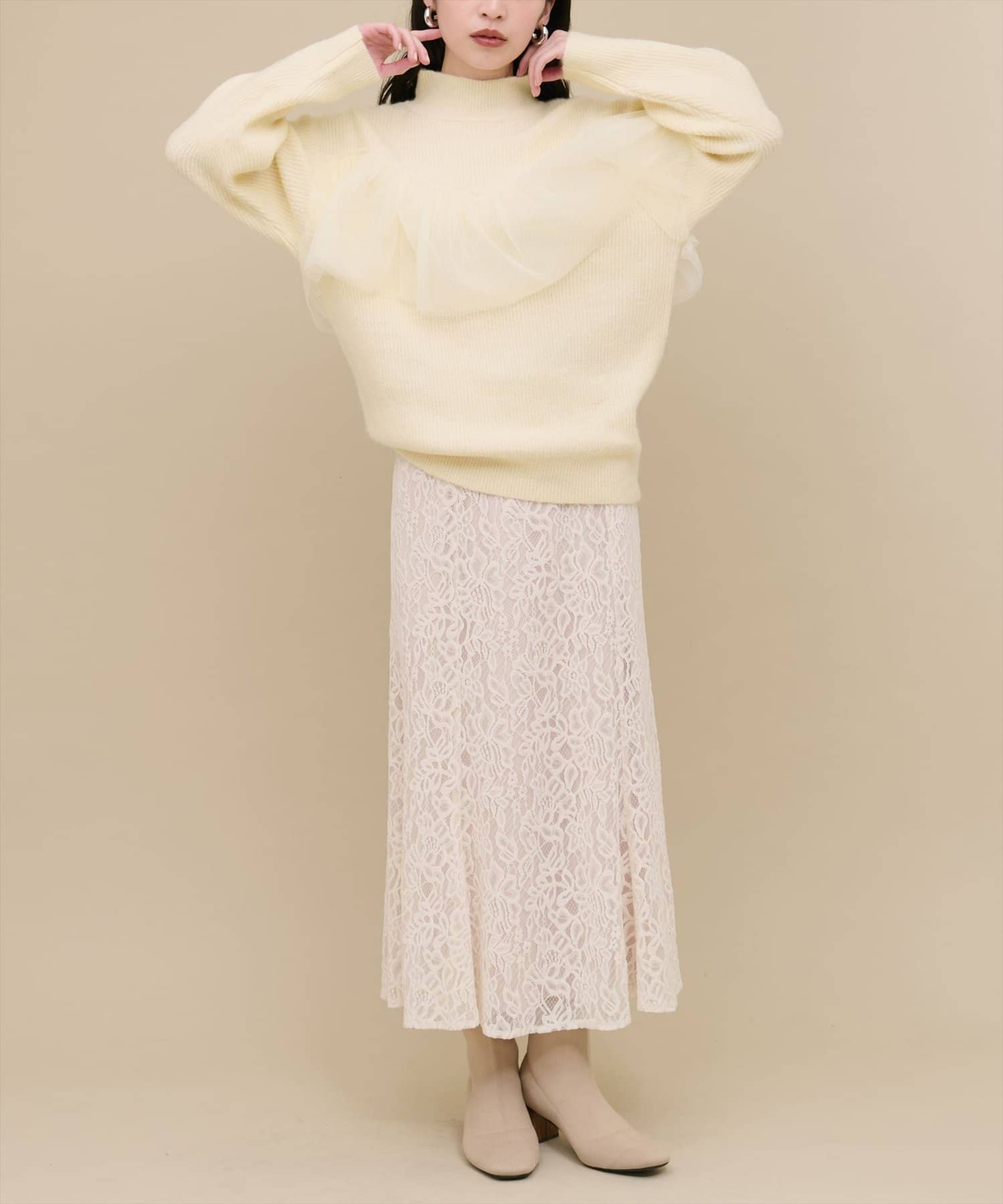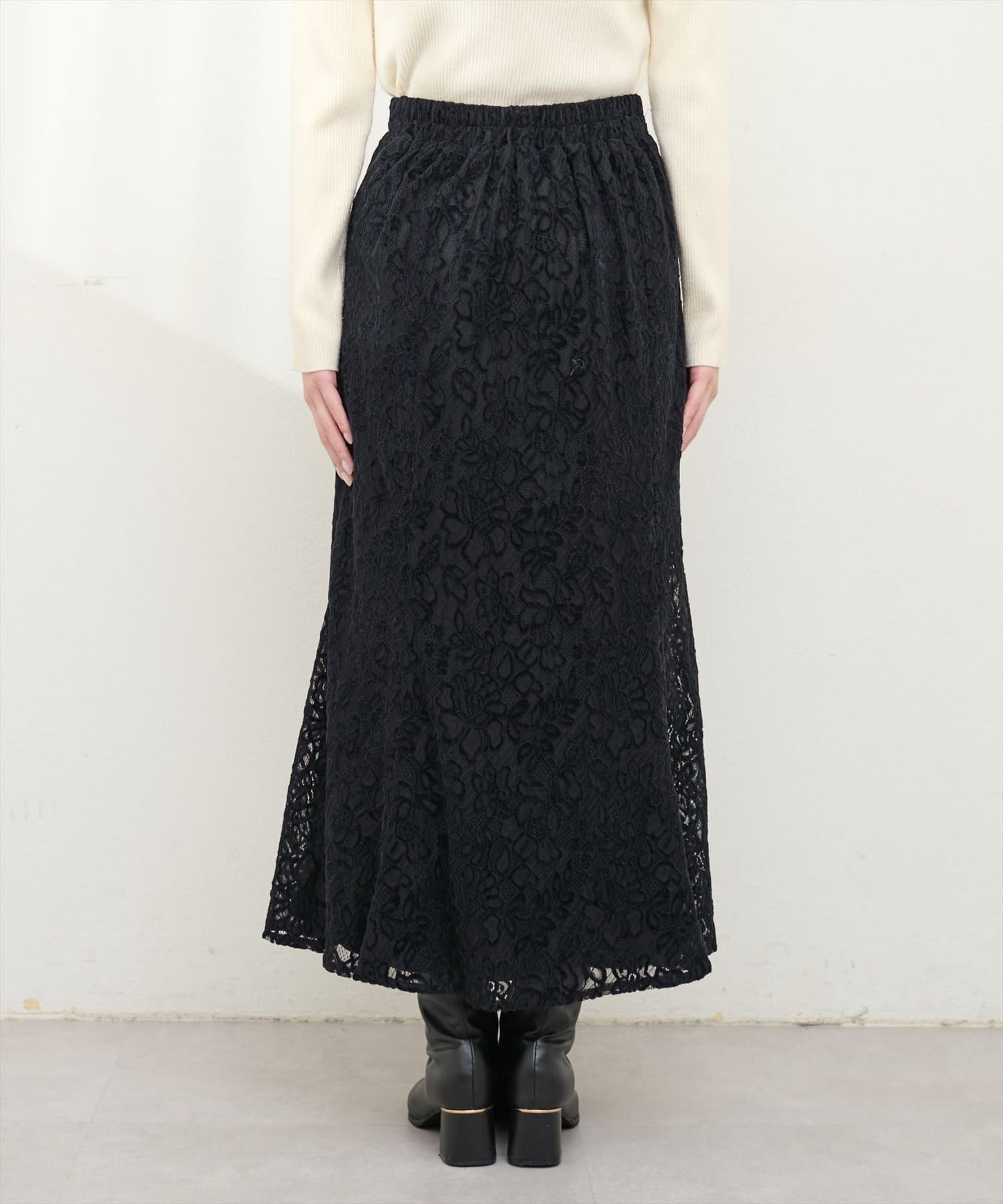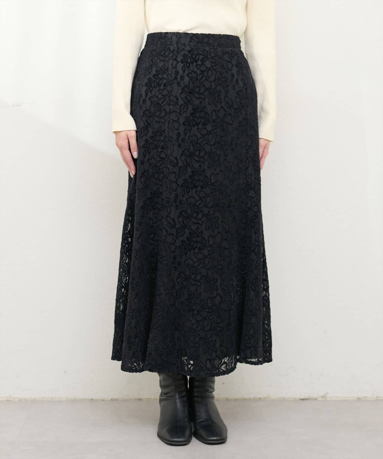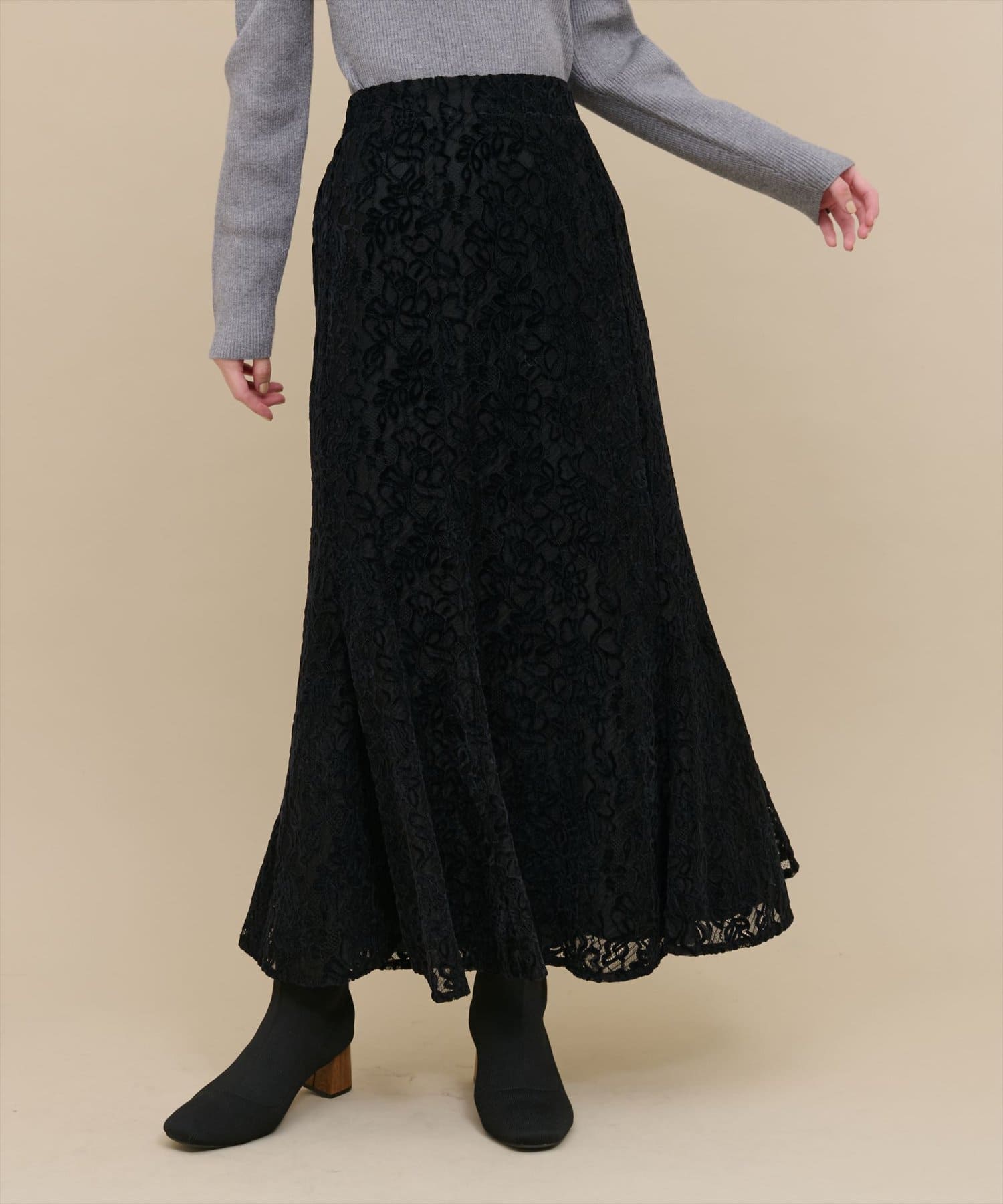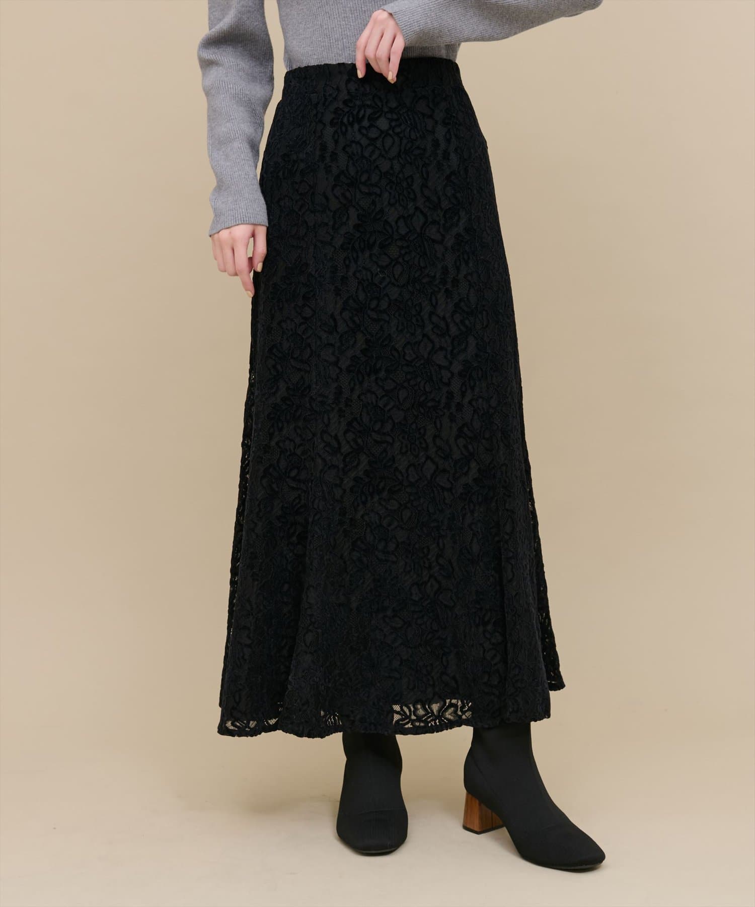 レースの透け感と花柄部分の起毛で立体感のある大人のマーメイドスカート。