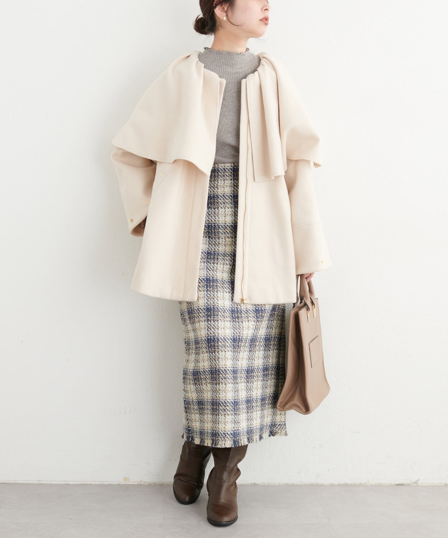 バックスリットを施しているので足捌きも良く、すっきりと女性らしいナローシルエットでボリュームがあるアウターともバランス良く合わせられるのが魅力です。
