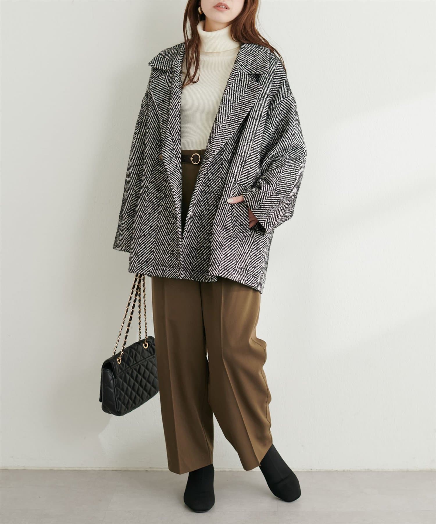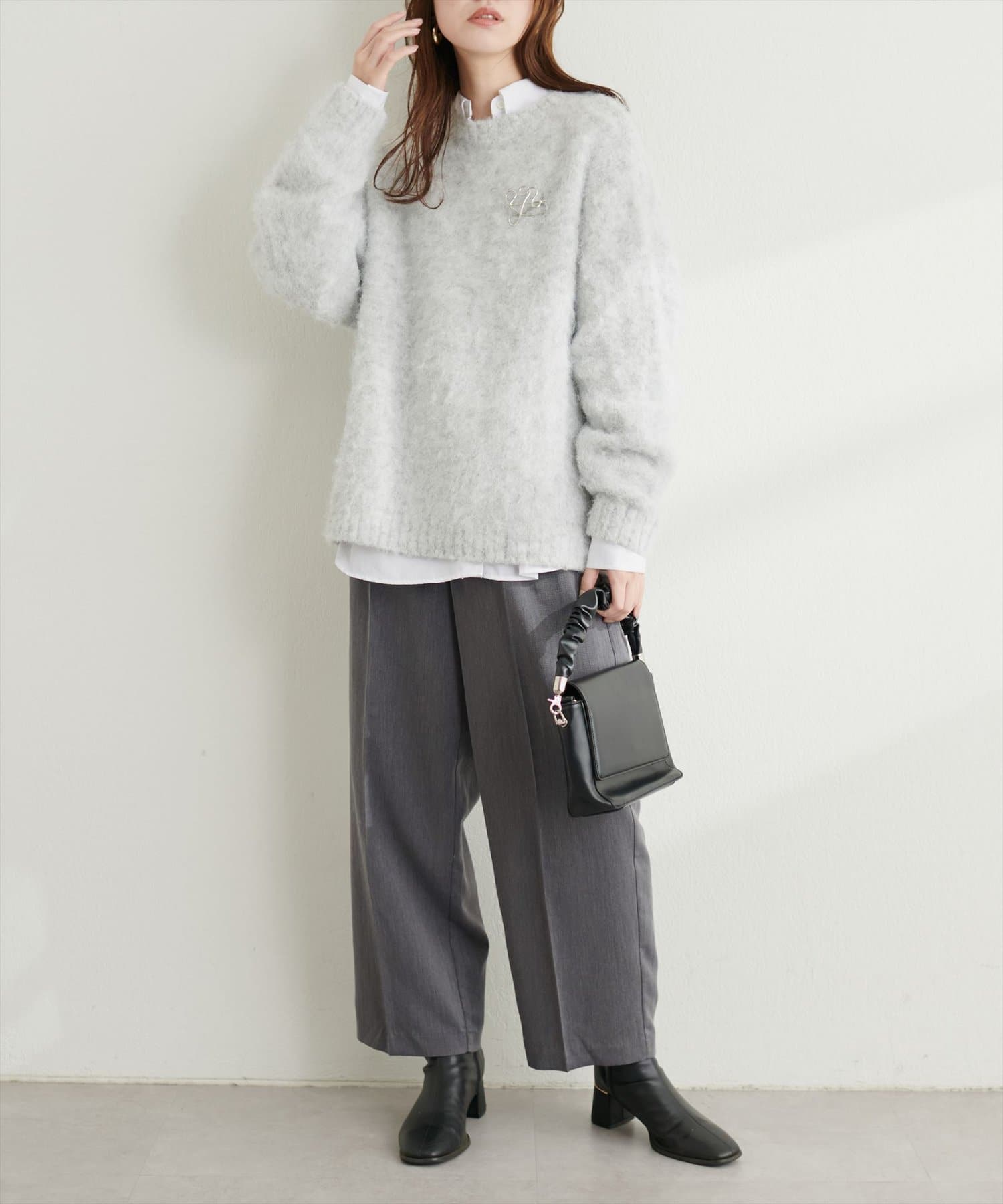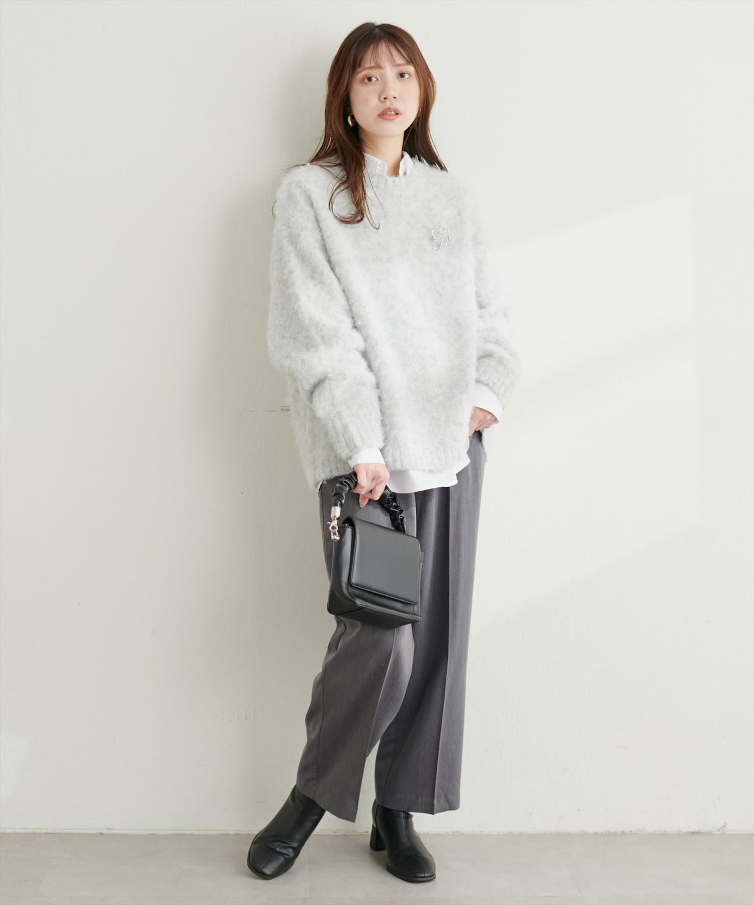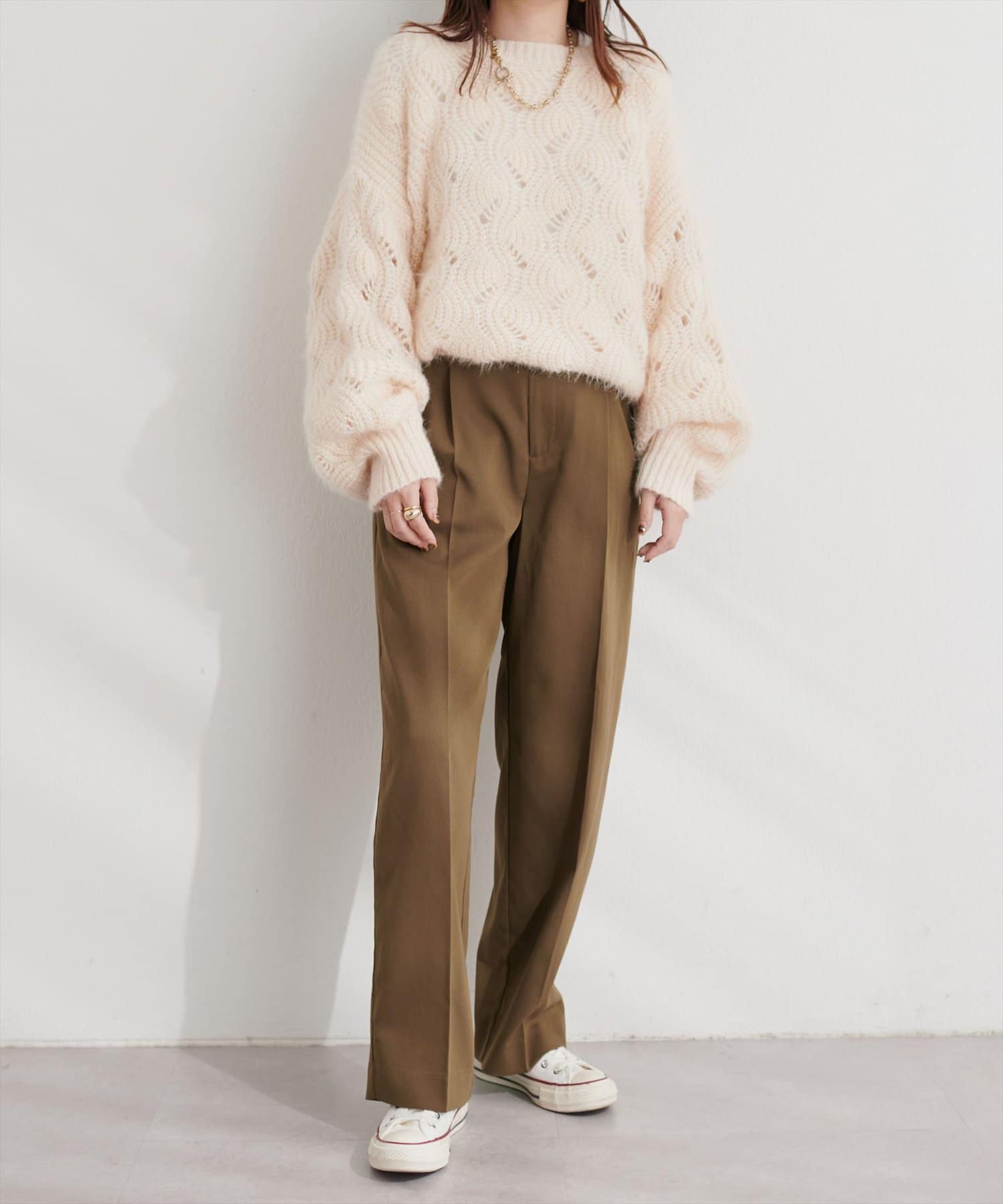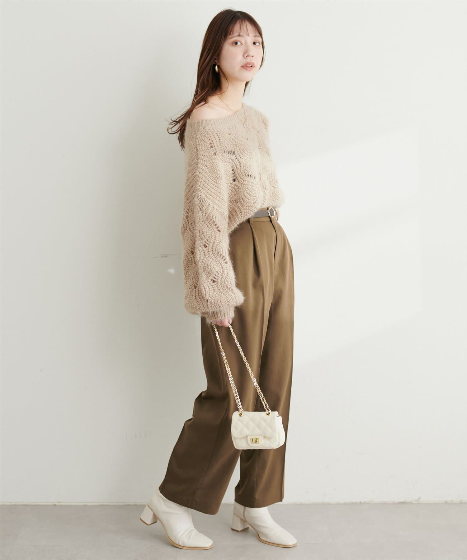ざっくりニットやスウェットと合わせて、トレンドのカジュアルダウンスタイルに仕上げるのもおすすめ。