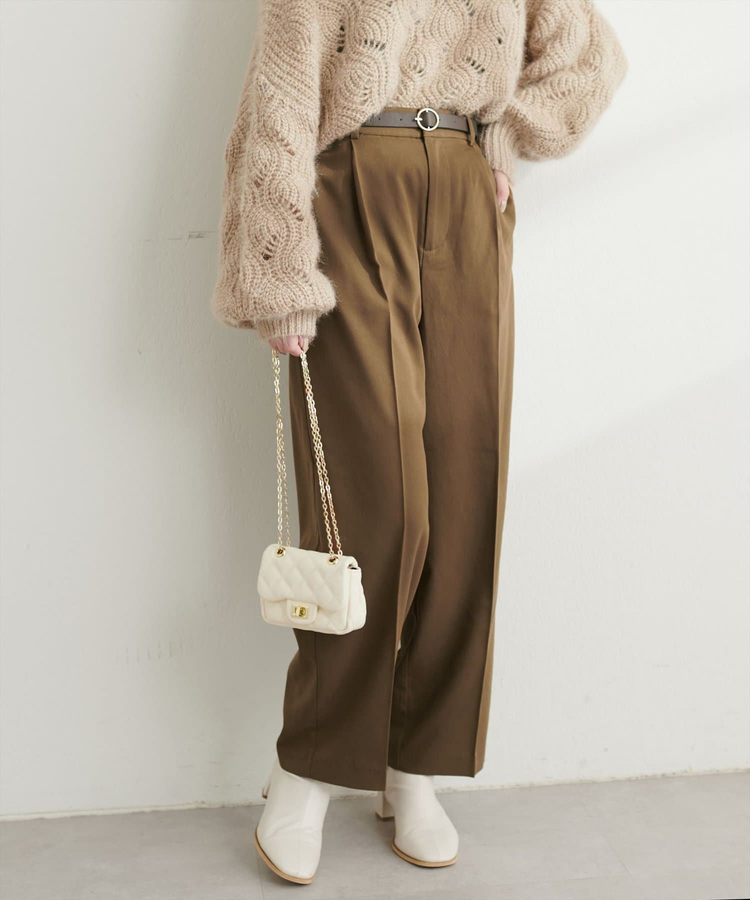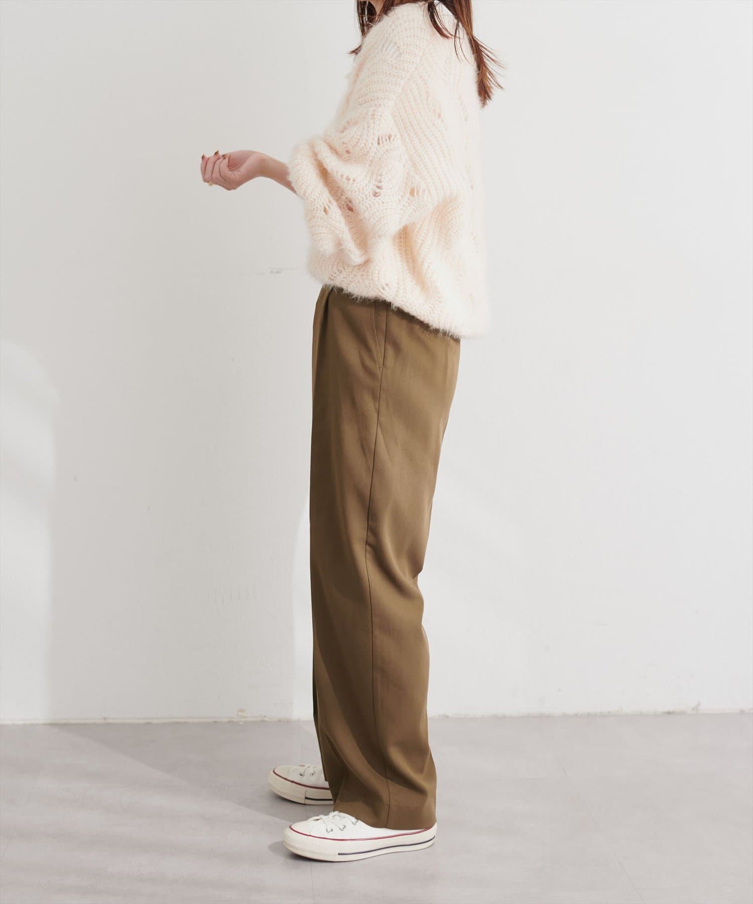 ボディラインを拾いにくくストンと落ちるストレートワイドシルエットのパンツ。