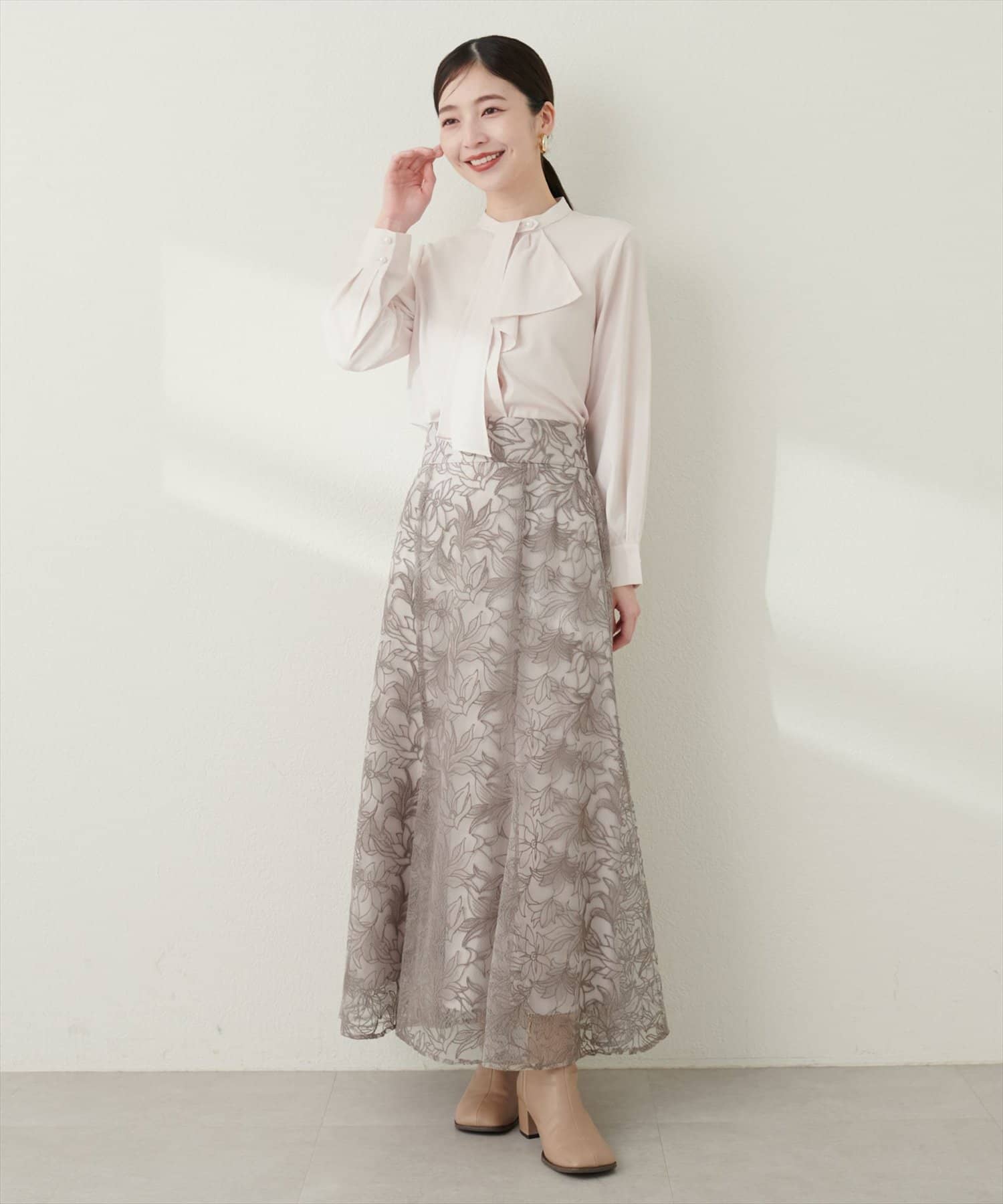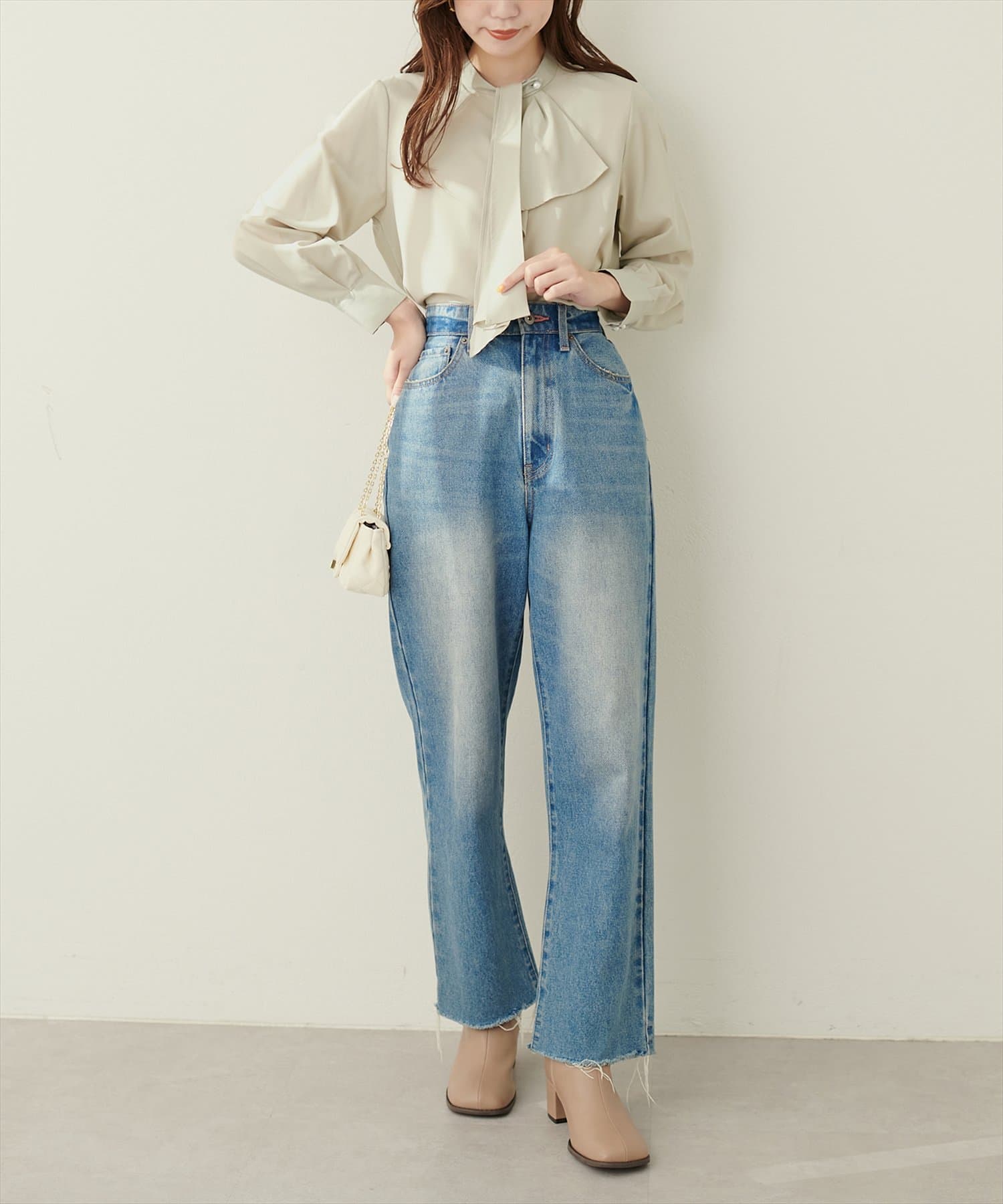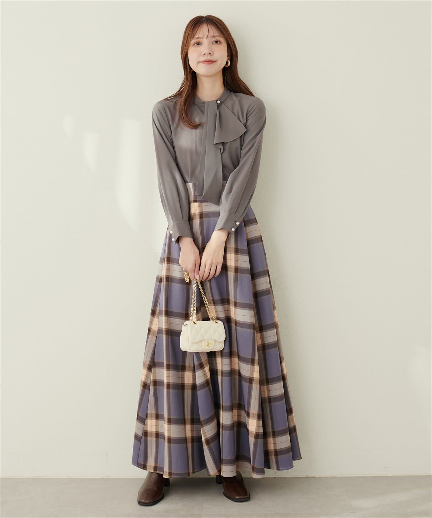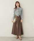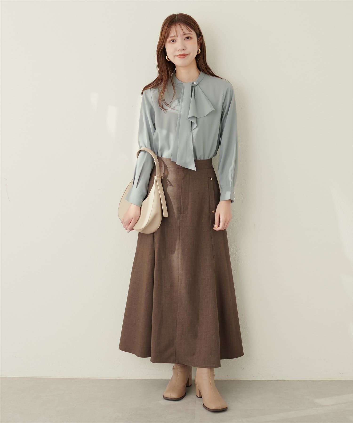 ブラウスがさらりとしている分、ボトムは厚みのあるアイテムを合わせて素材感にメリハリを付けるのがおすすめです。