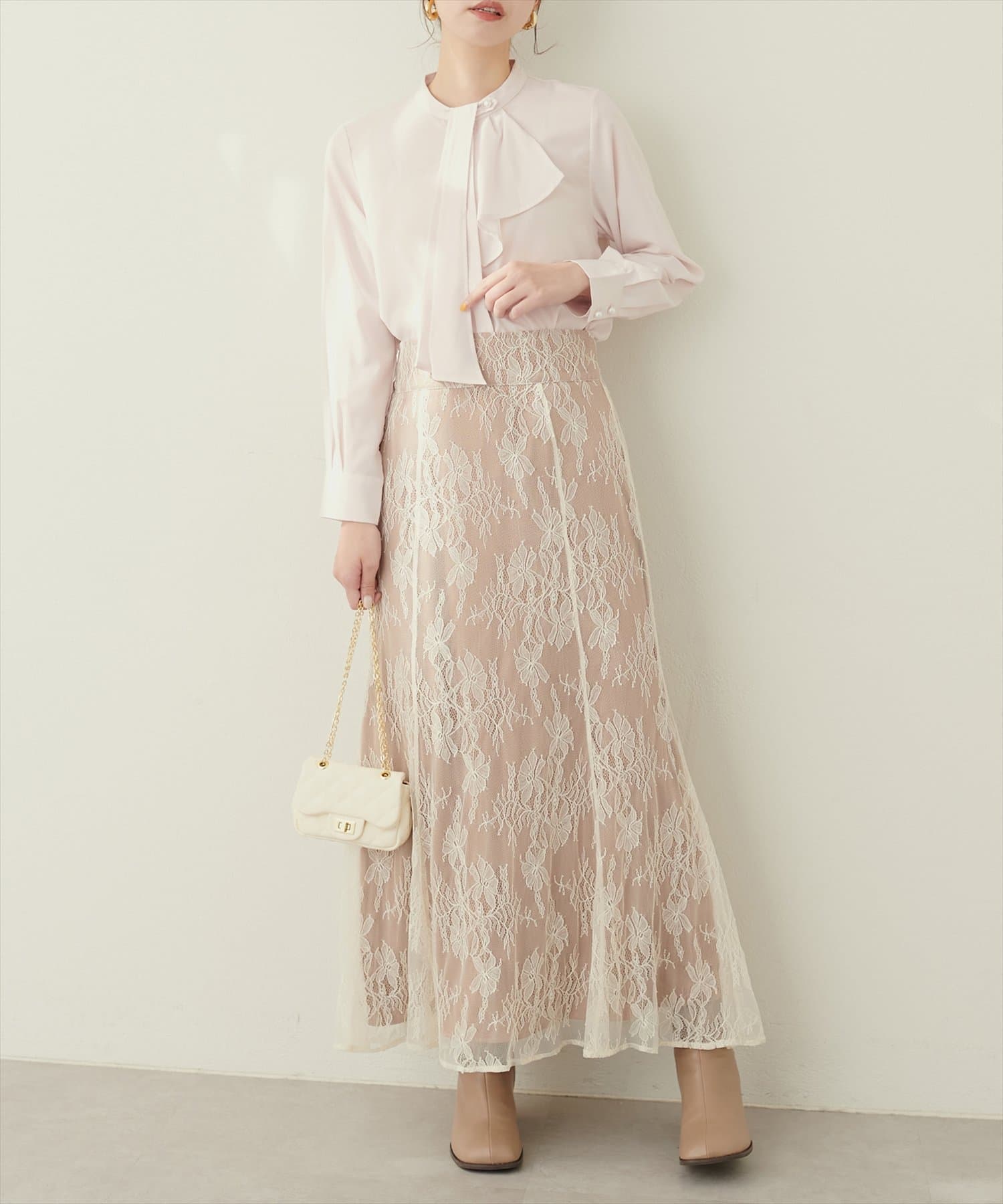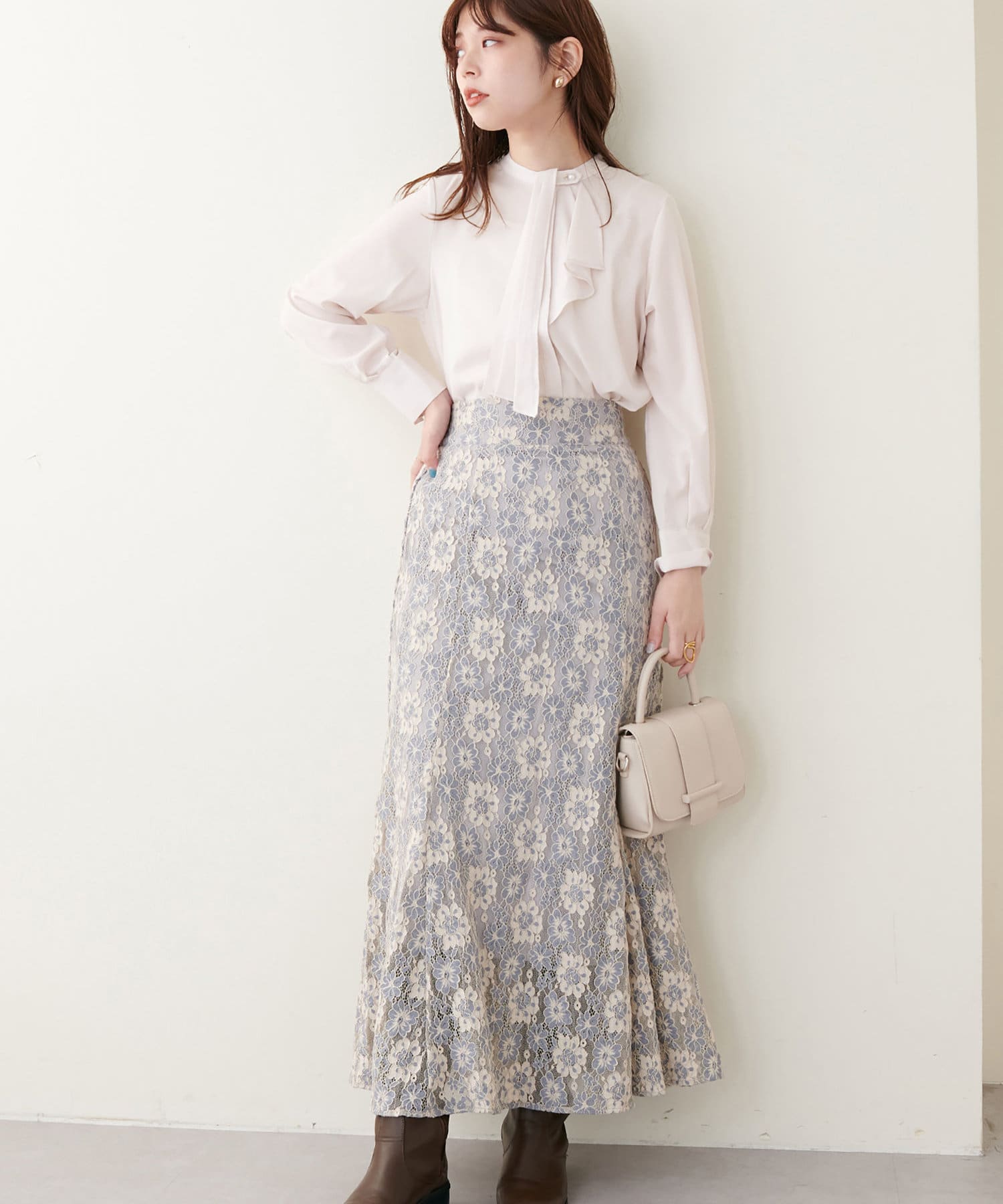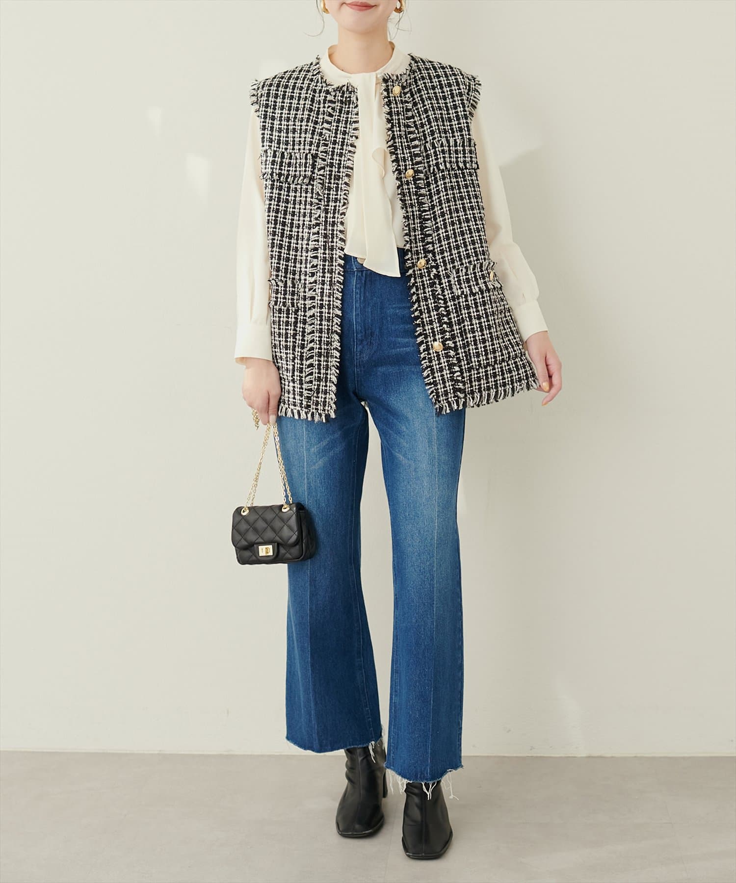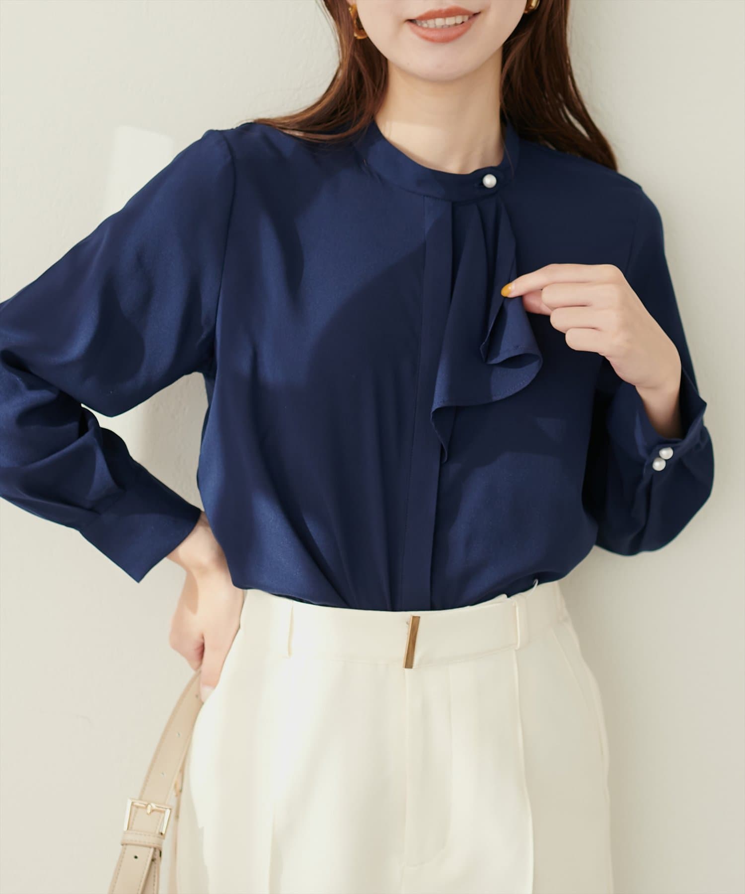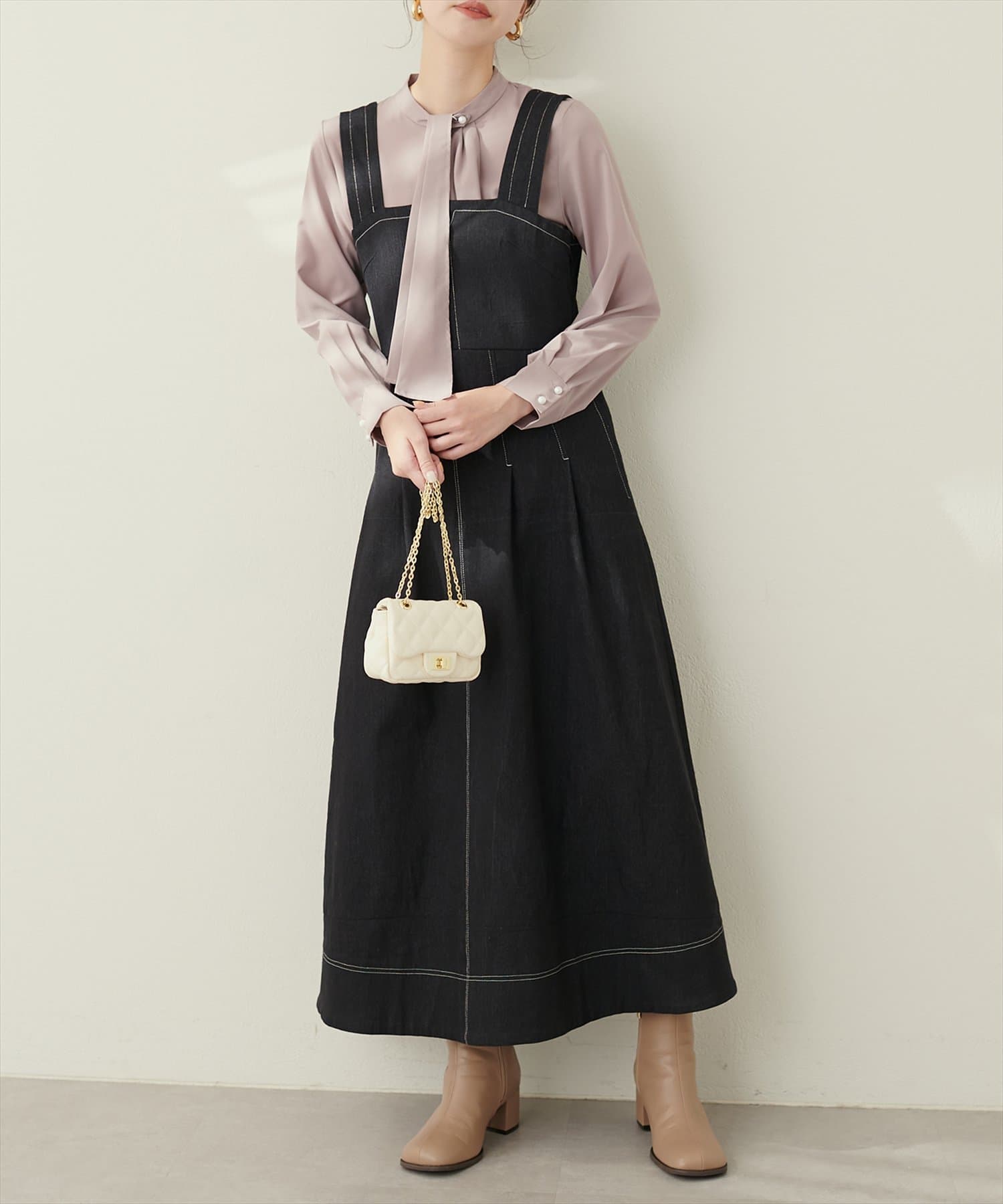 ブラウスがさらりとしている分、ボトムは厚みのあるアイテムを合わせて素材感にメリハリを付けるのがおすすめです。