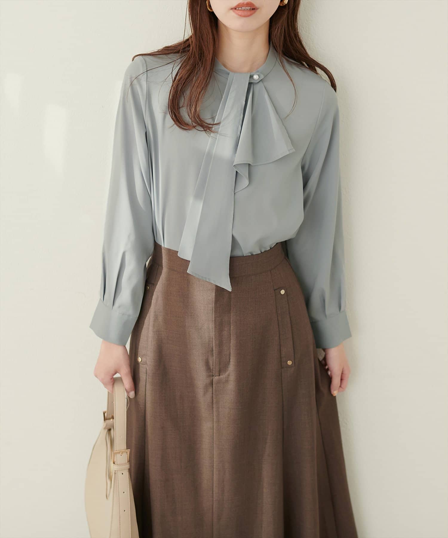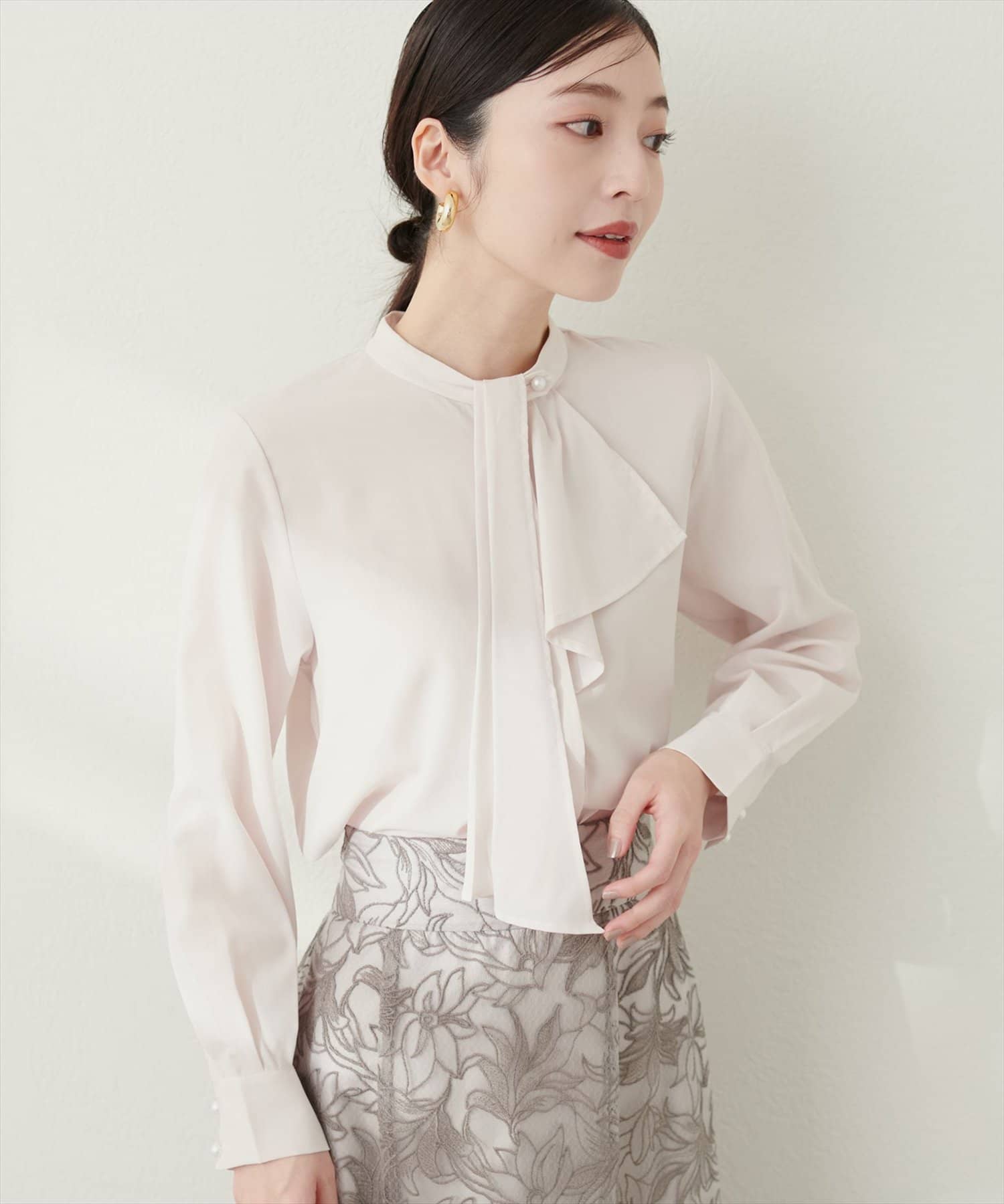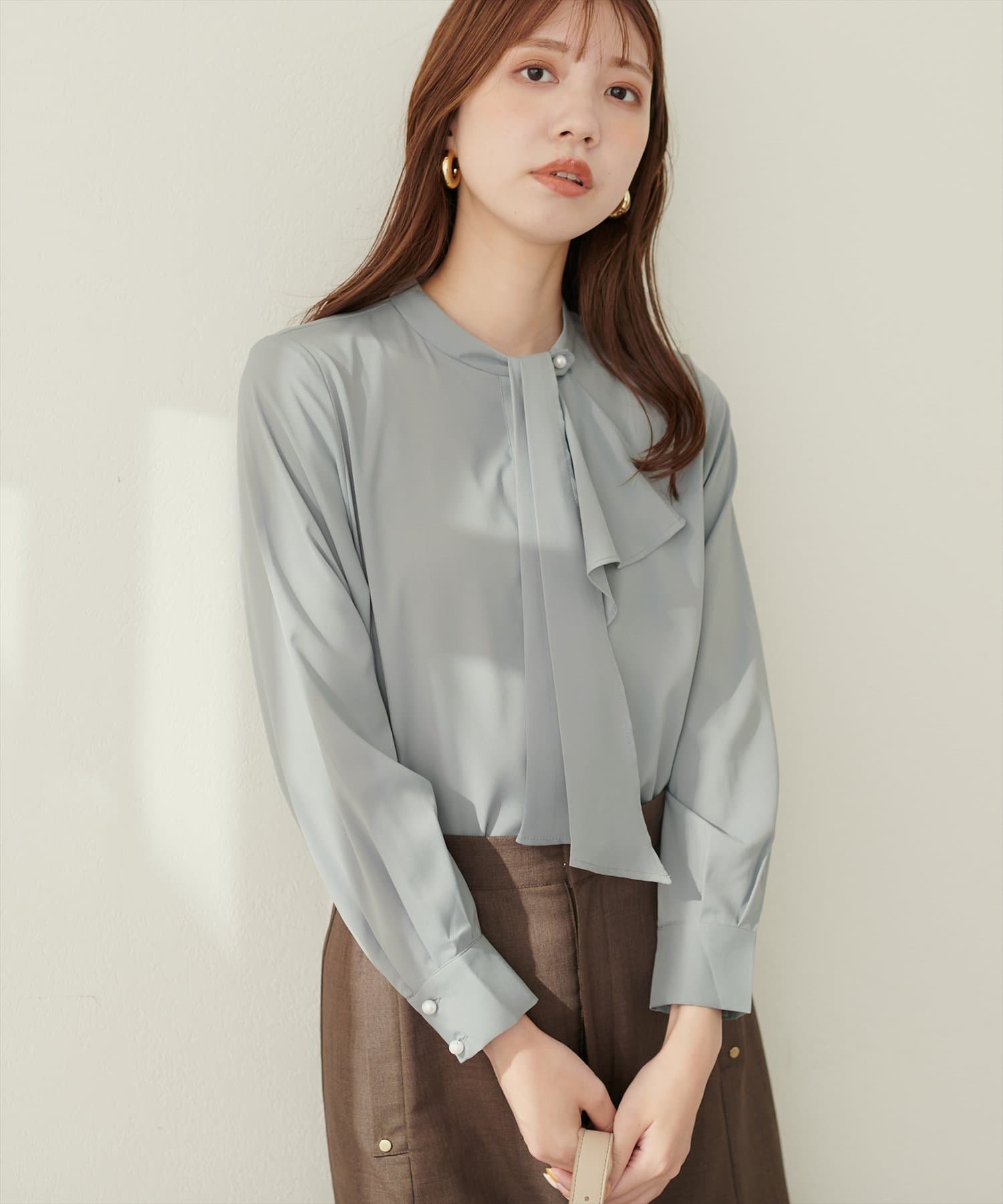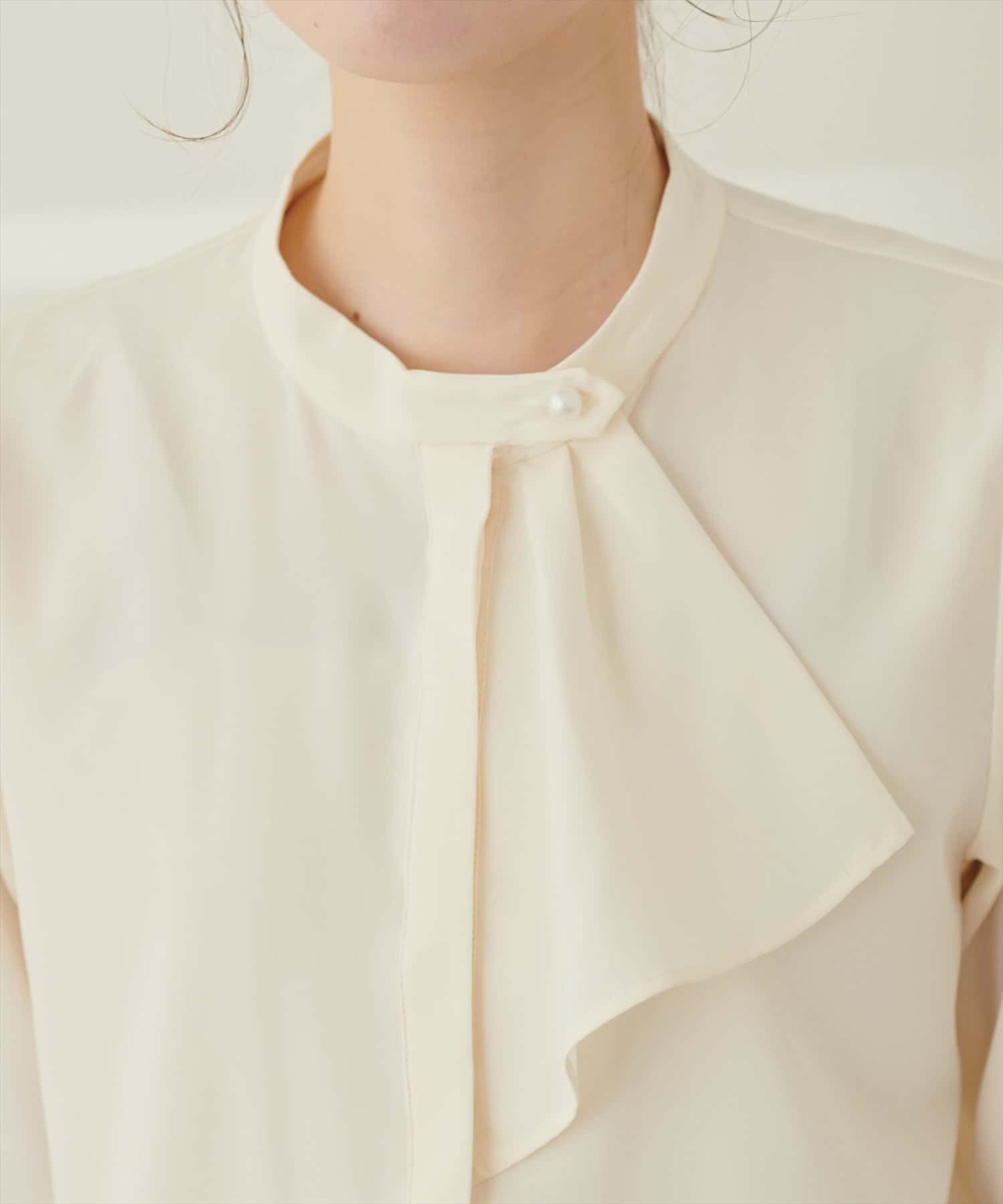 ドレープになったスカーフタイのデザインが特徴のお上品ブラウス。