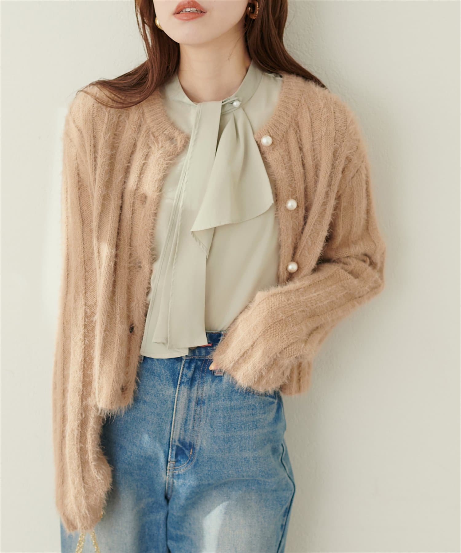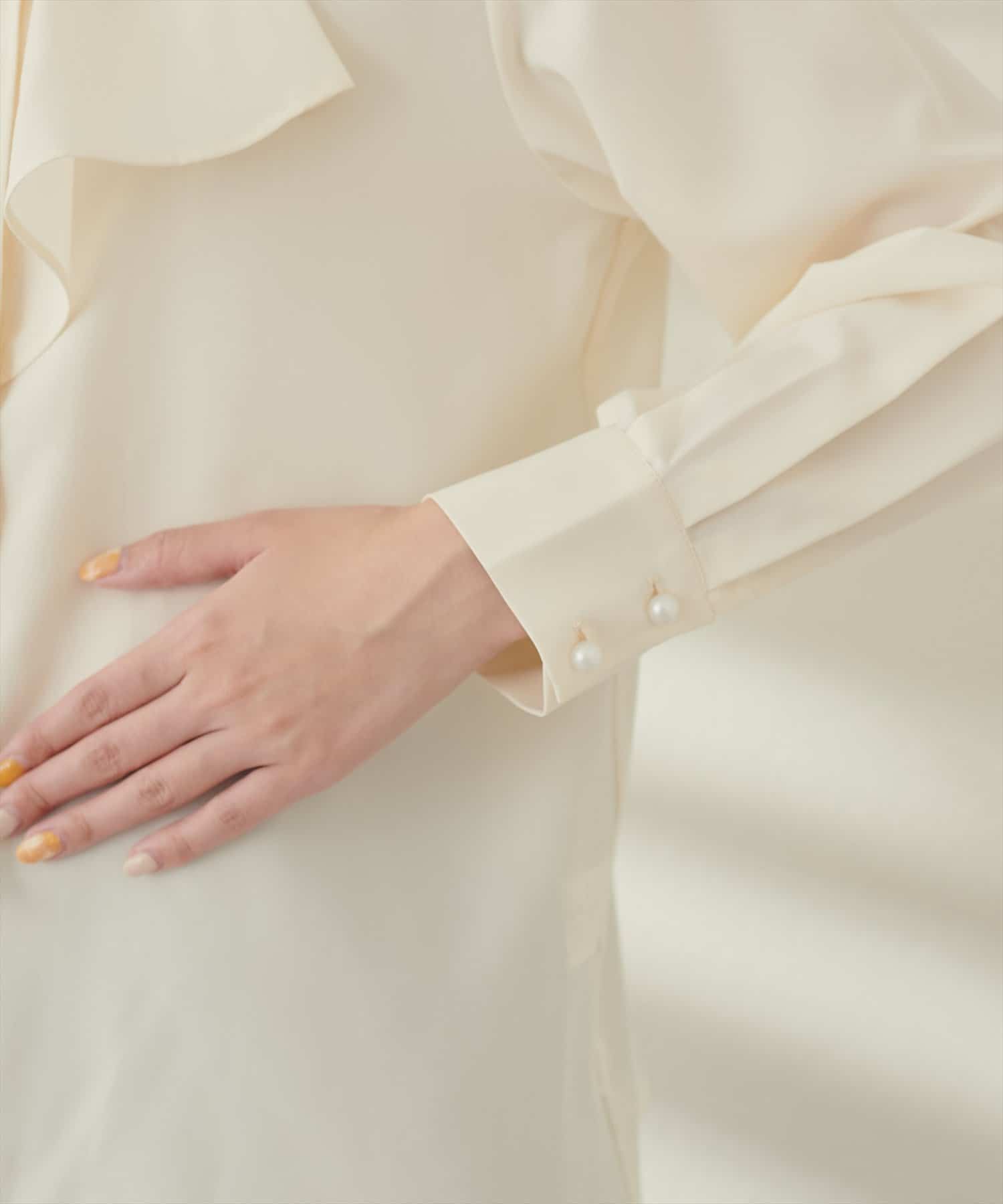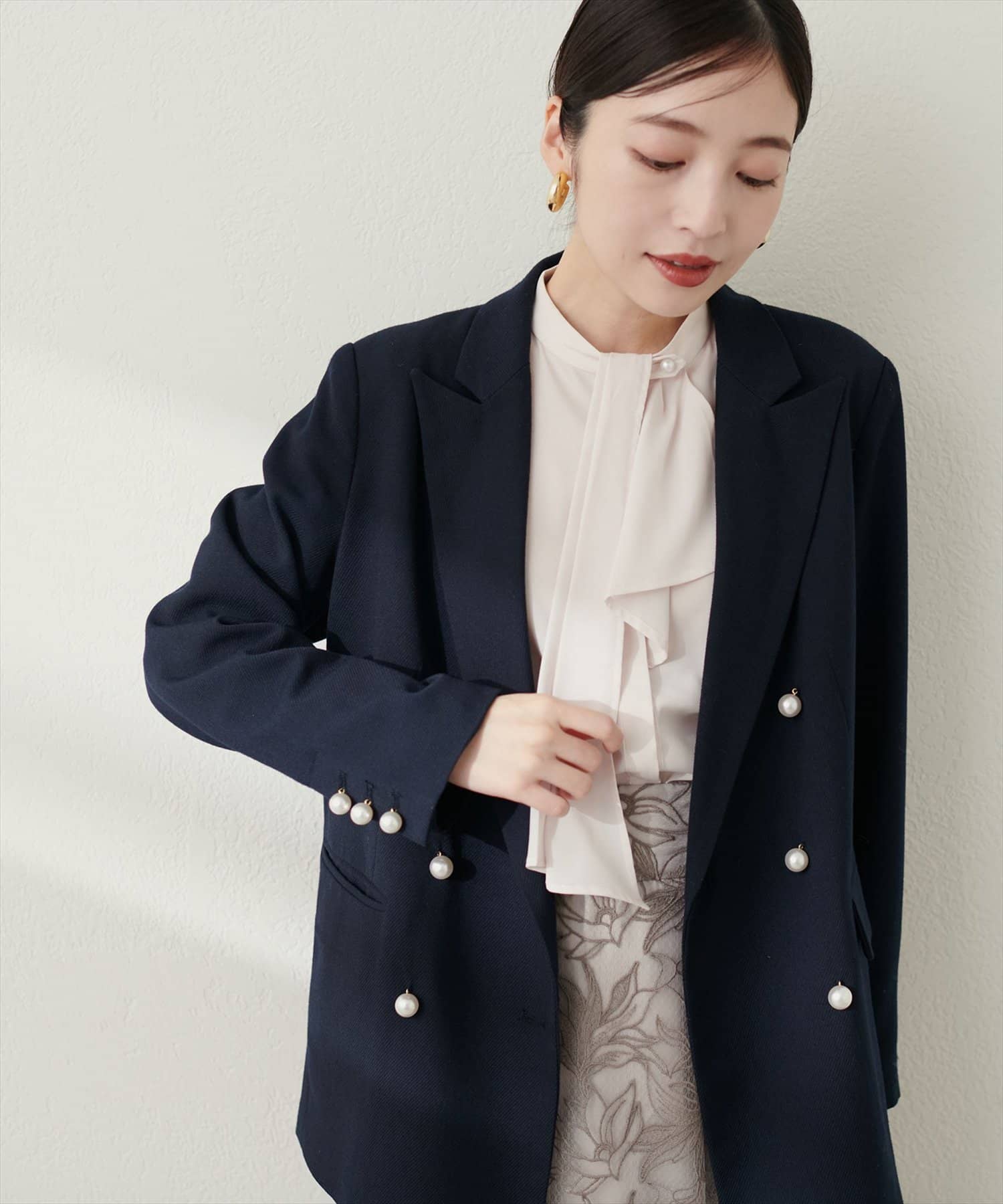 襟元と袖口にあしらわれた、さりげないパール釦もポイントです。