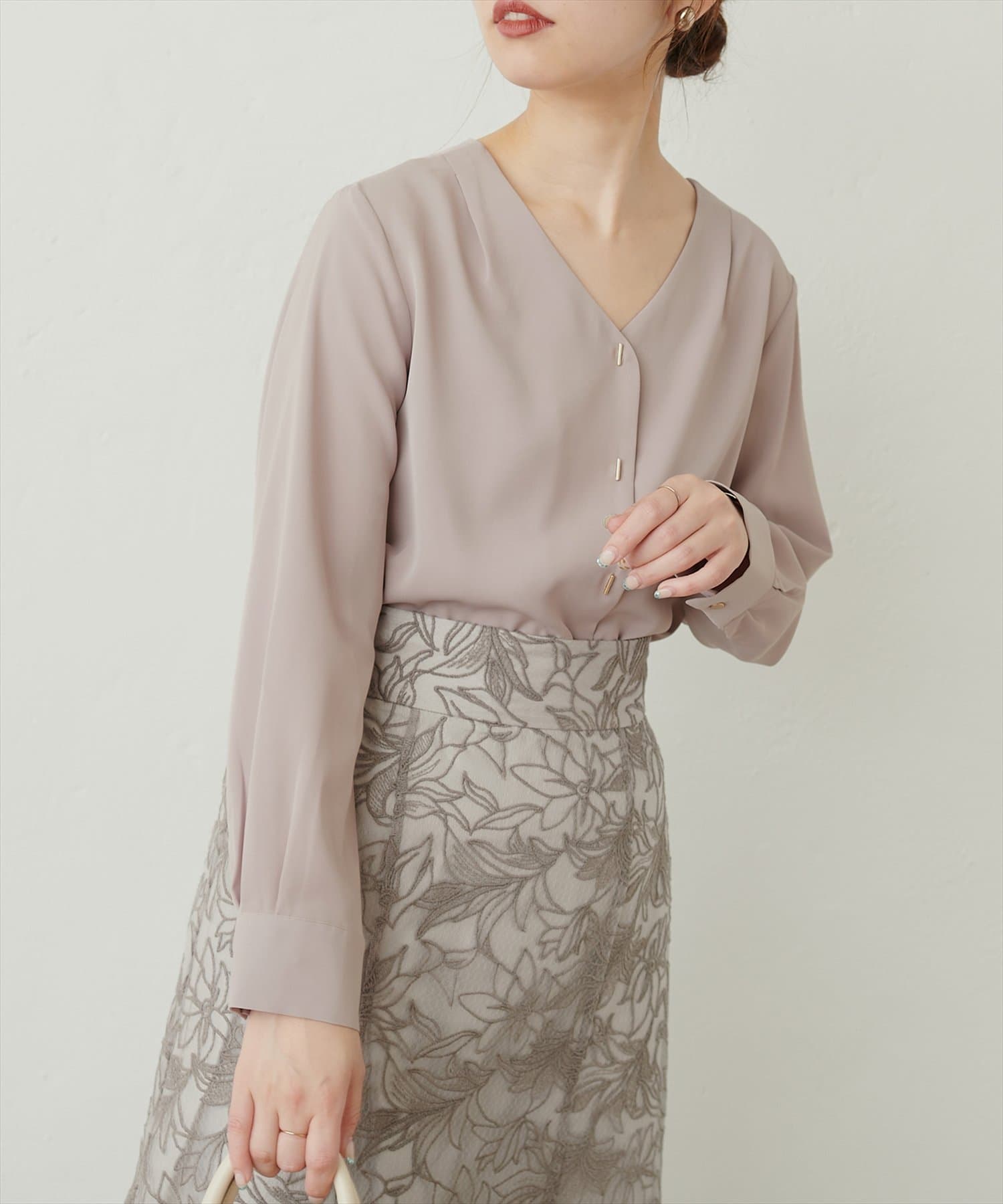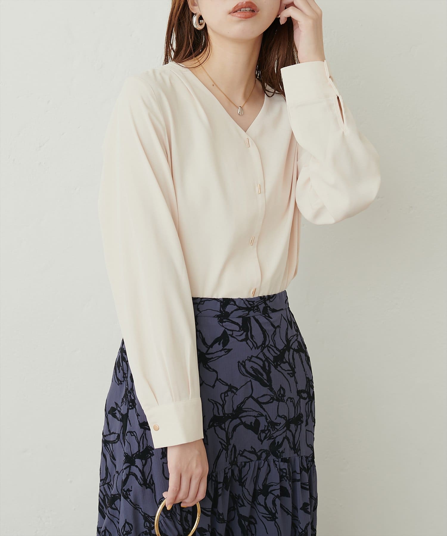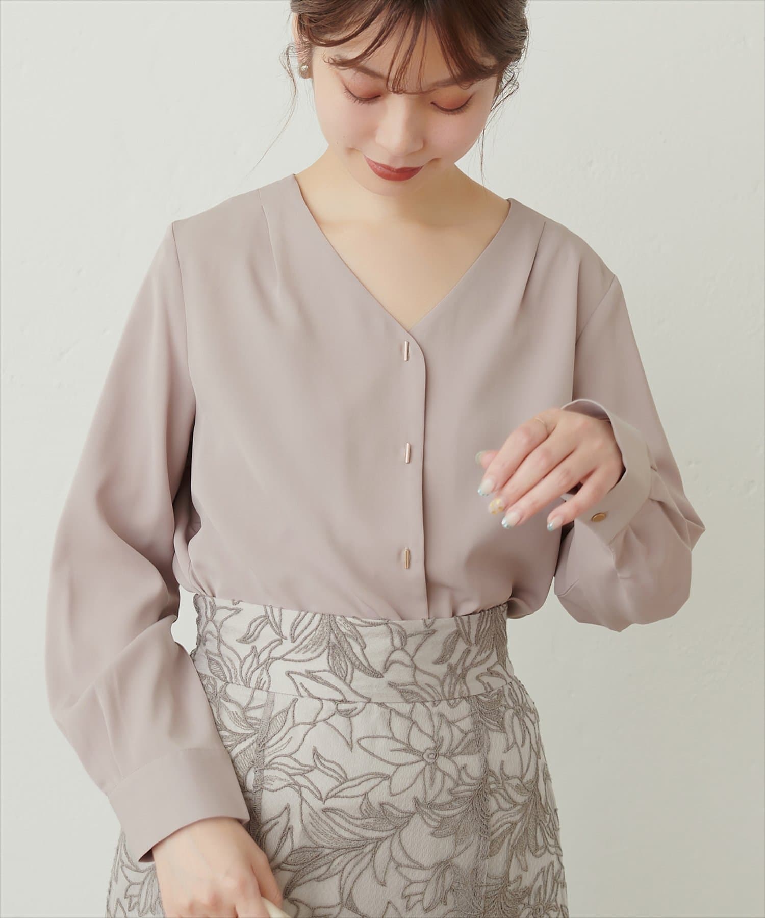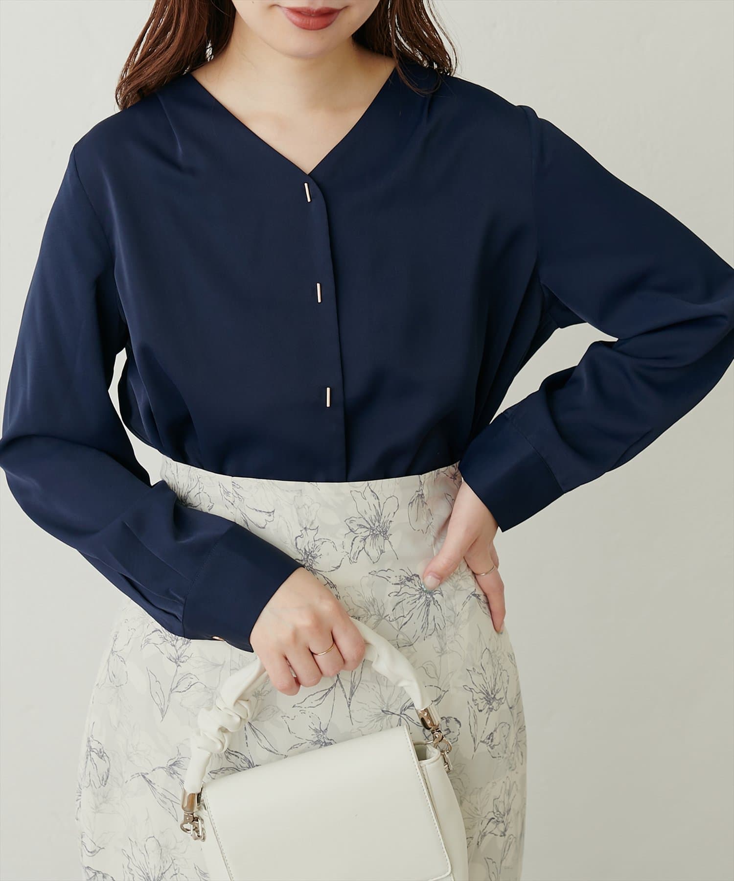 フロントにあしらったゴールドのバーボタンがポイントのお上品ブラウス。
