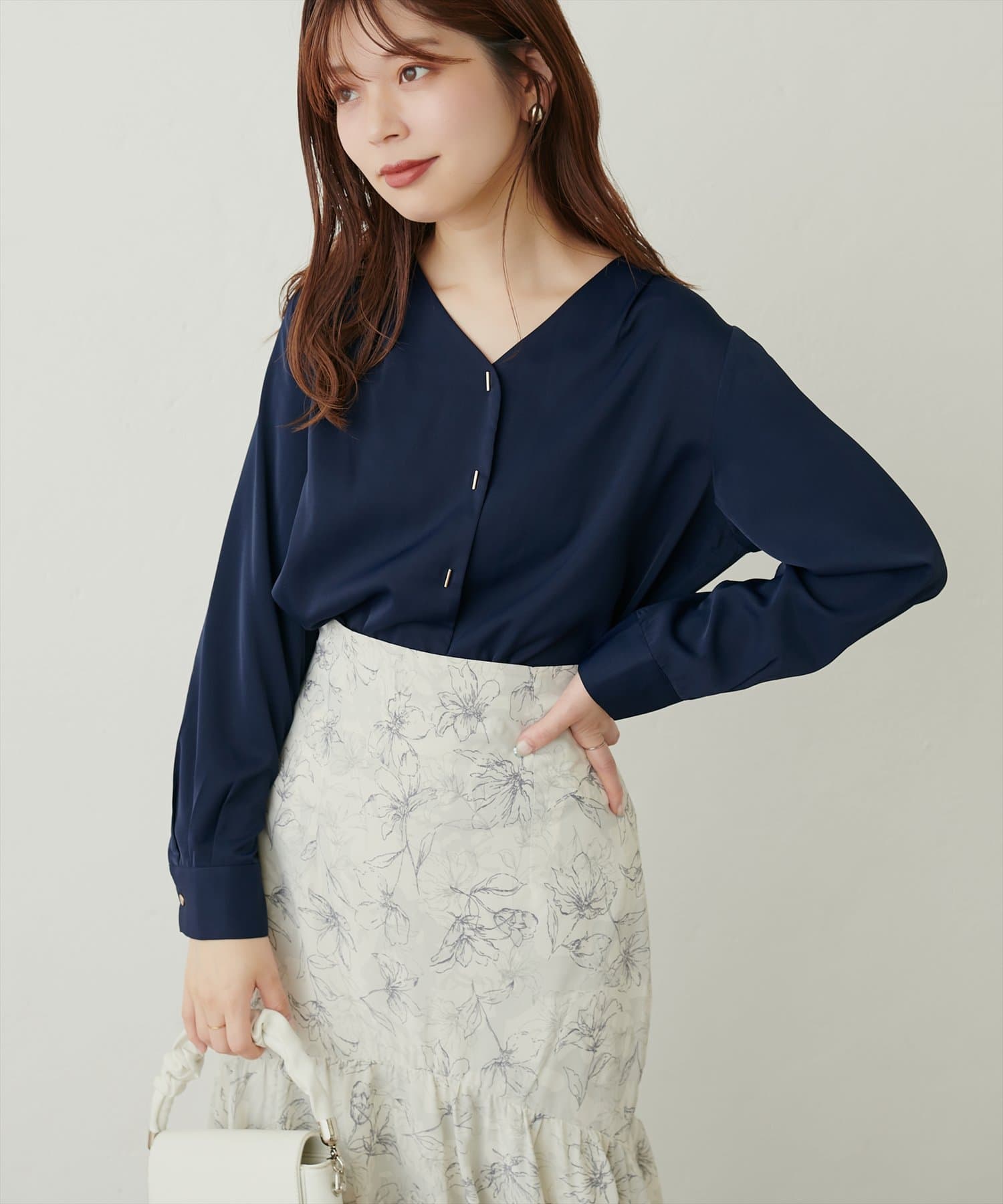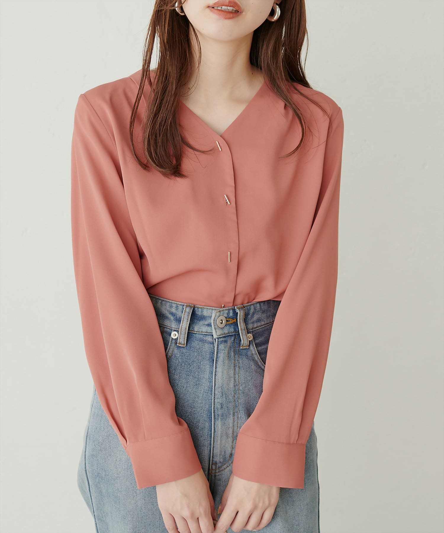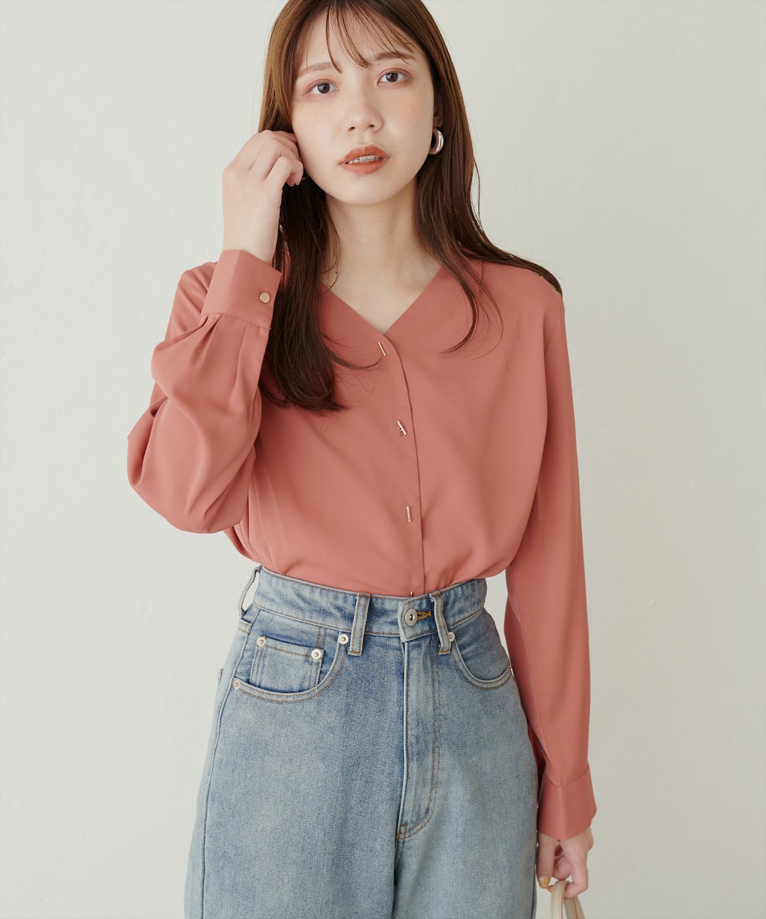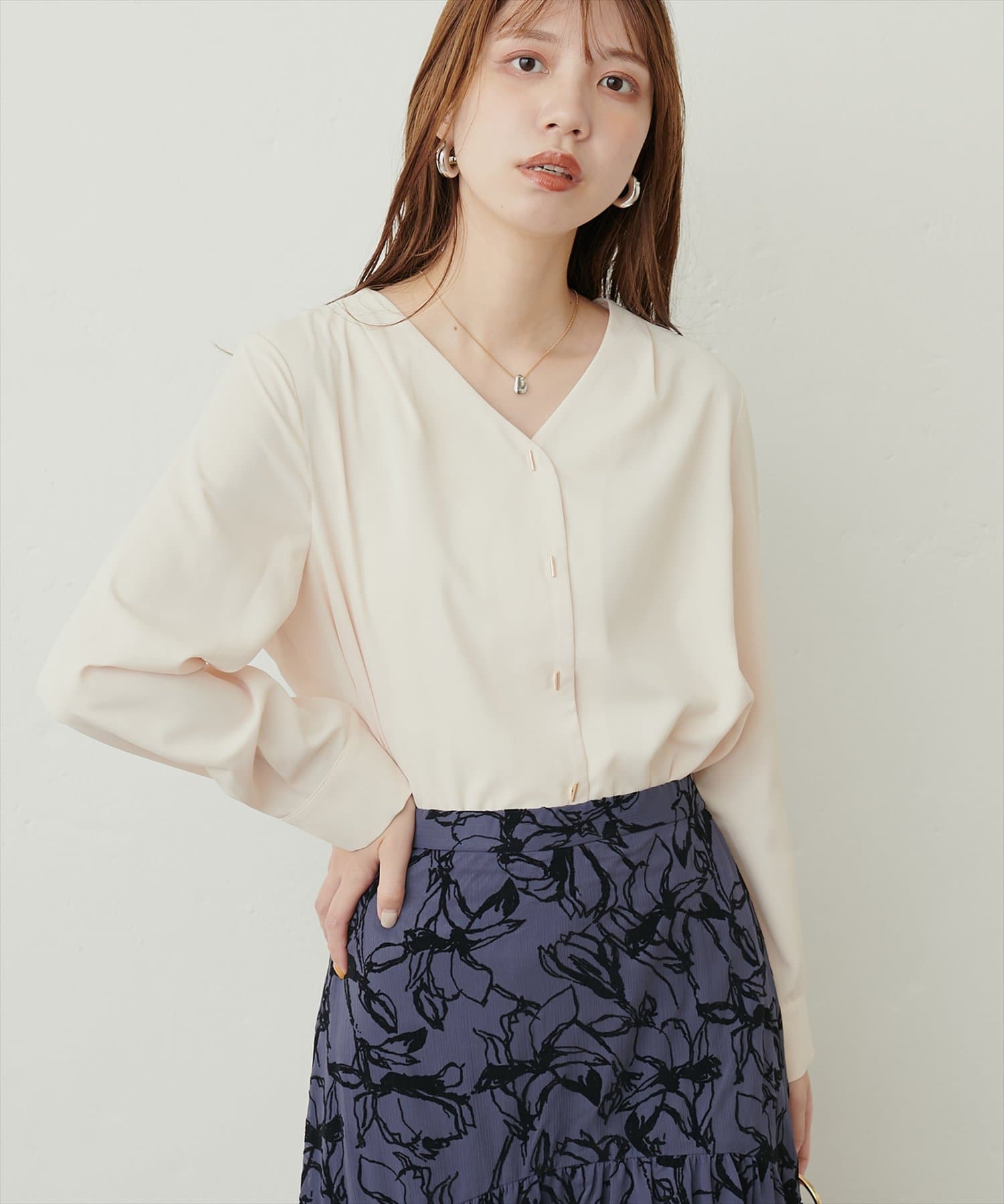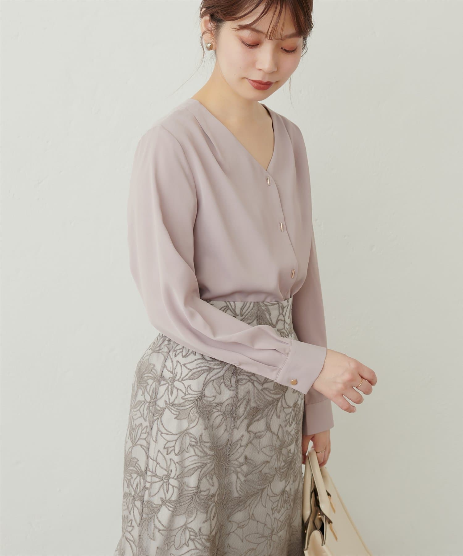フロントにあしらったゴールドのバーボタンがポイントのお上品ブラウス。