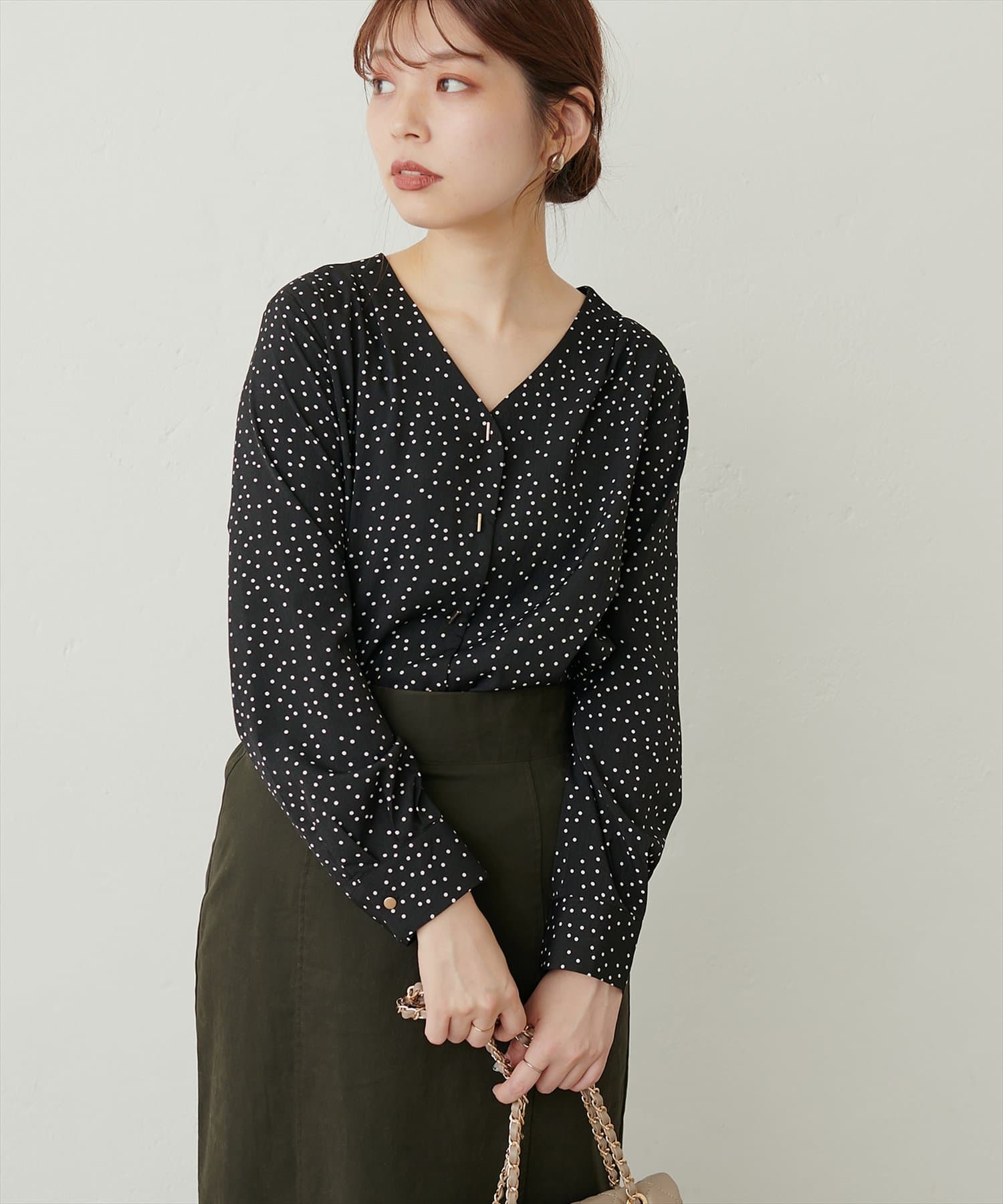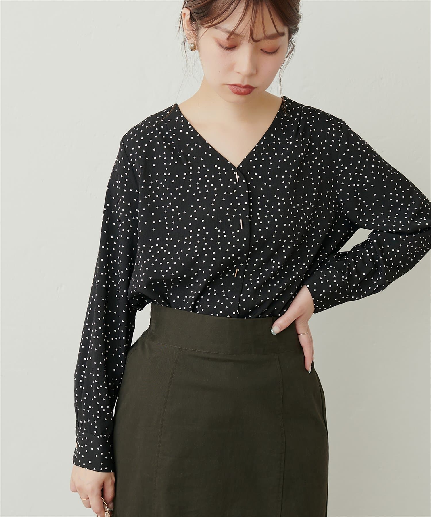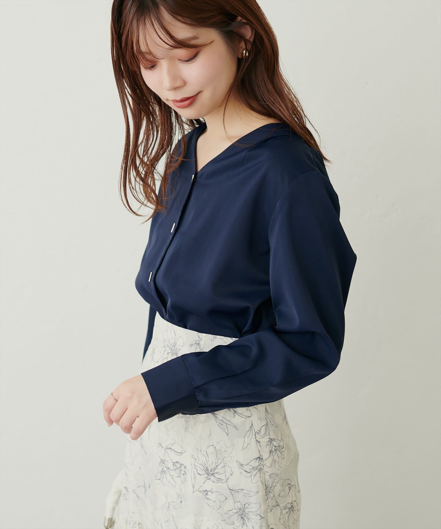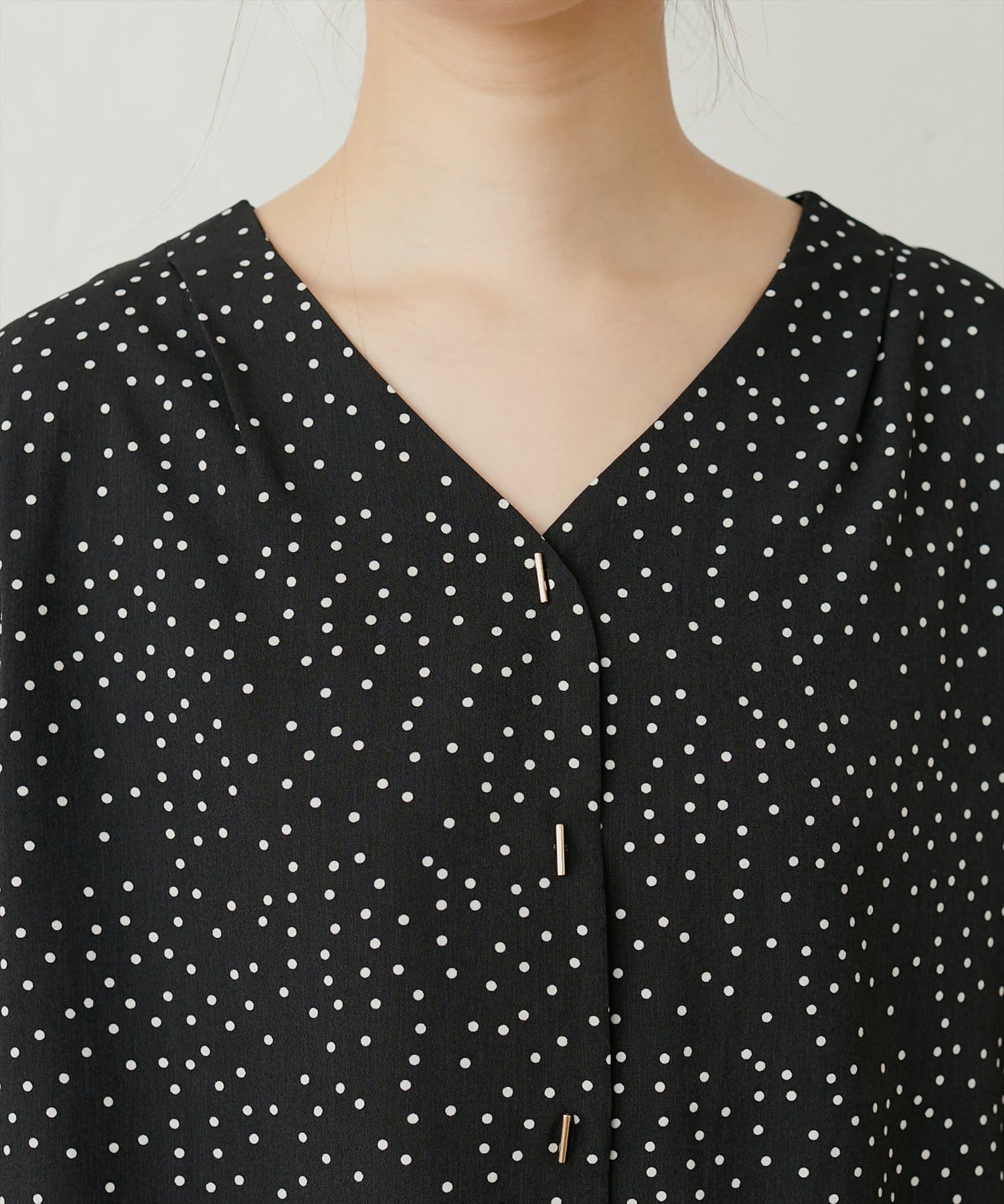 フロントにあしらったゴールドのバーボタンがポイントのお上品ブラウス。