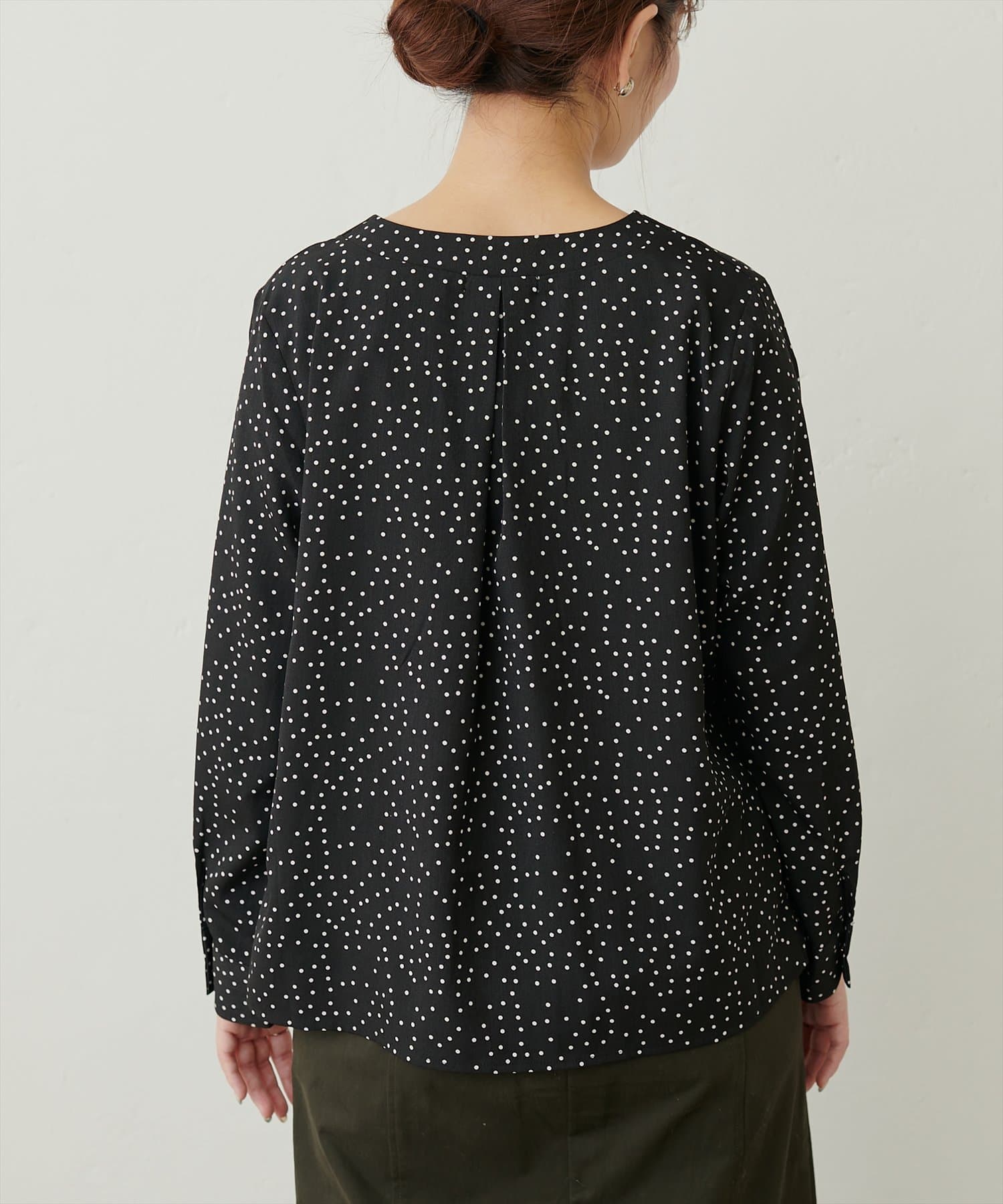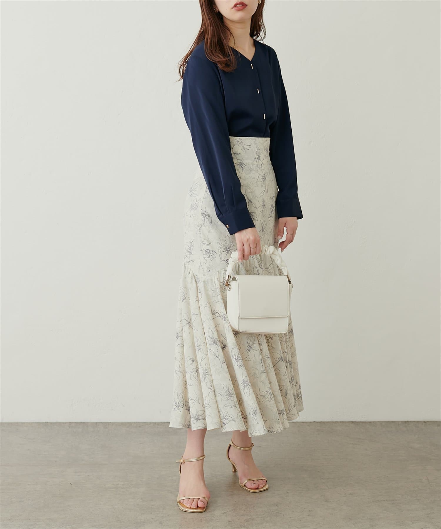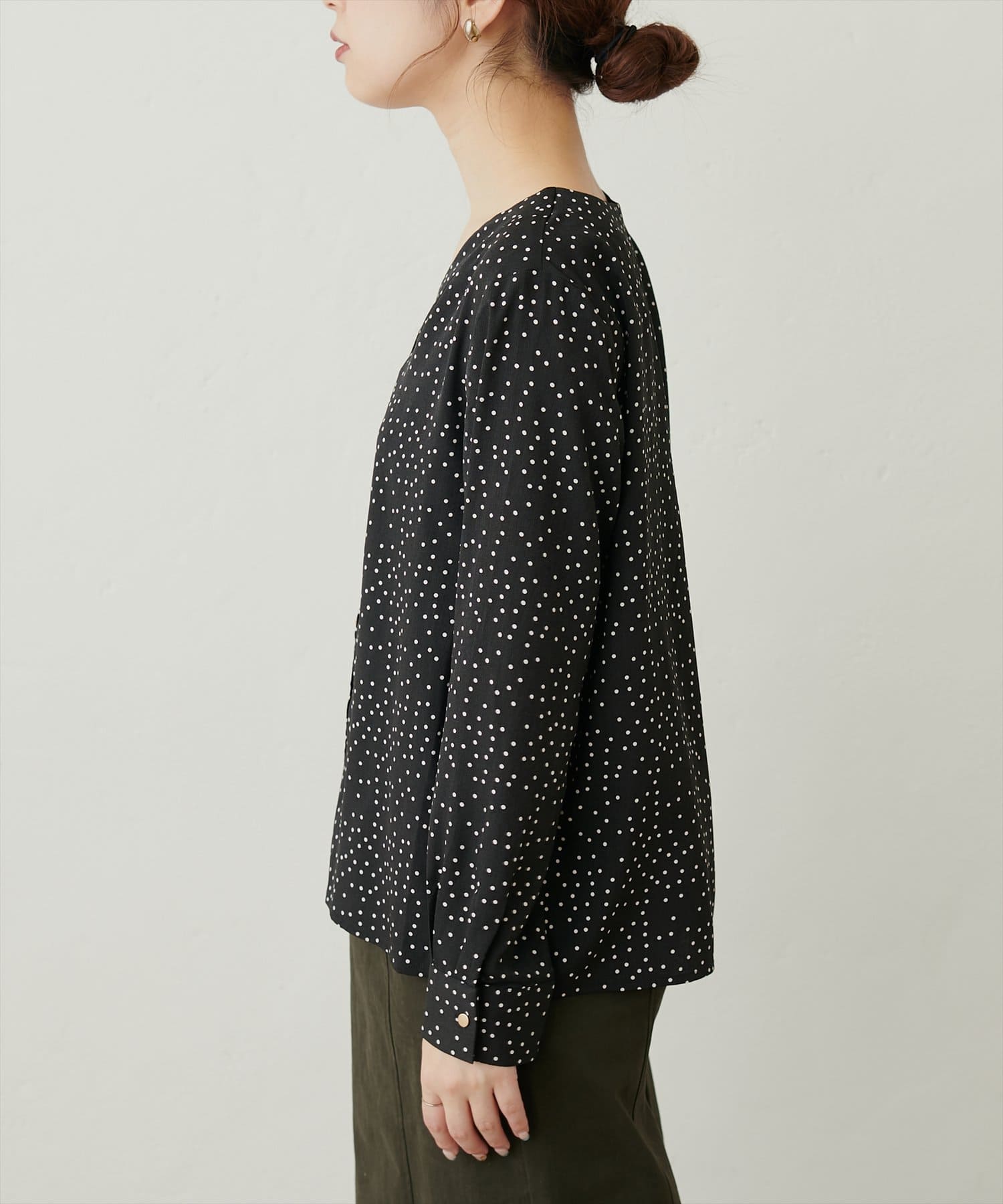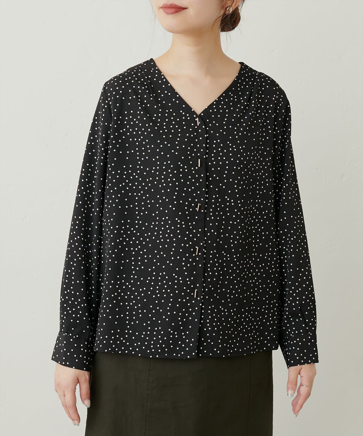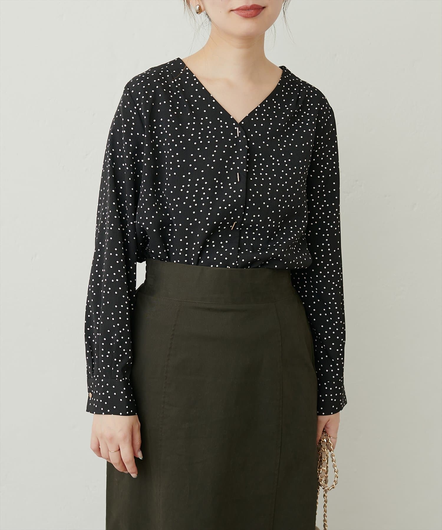 フロントにあしらったゴールドのバーボタンがポイントのお上品ブラウス。
