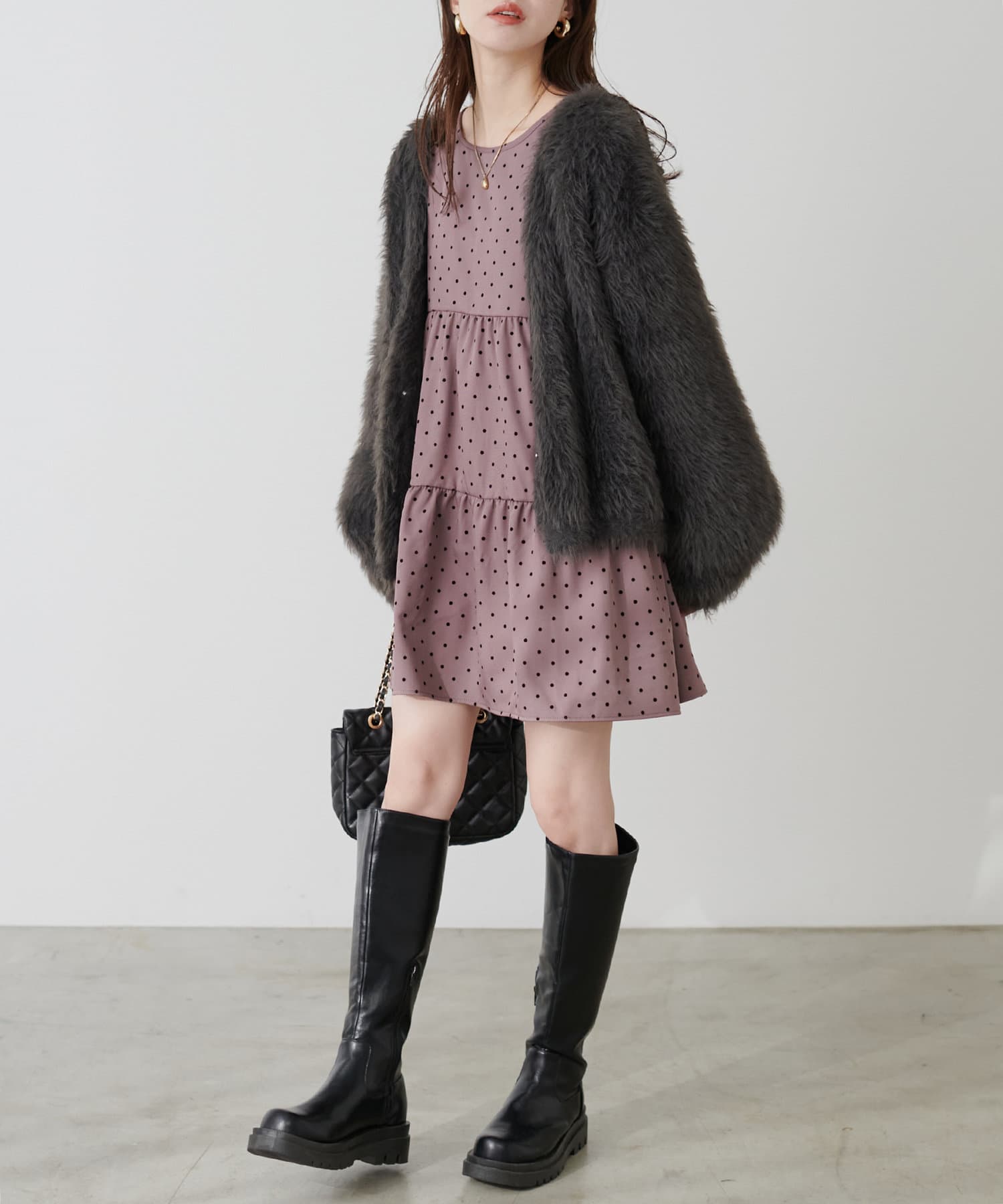 ミニワンピースとして、ロングブーツを合わせた王道フェミニンな着こなしがおすすめ。