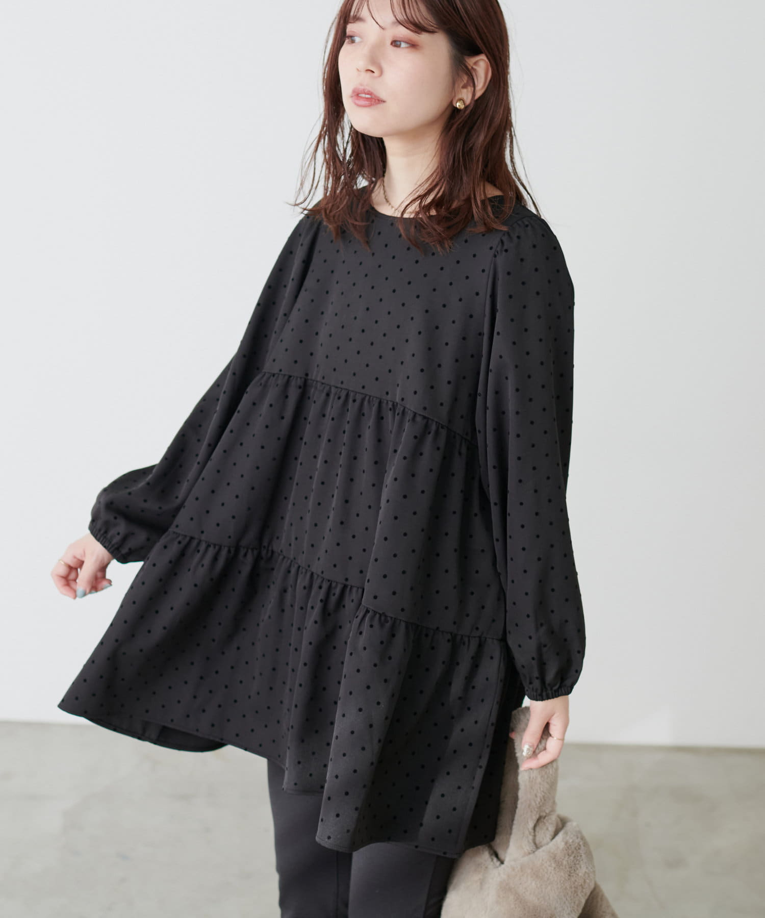 フロッキー素材の立体的なドット柄で存在感のあるフェミニンなチュニック。