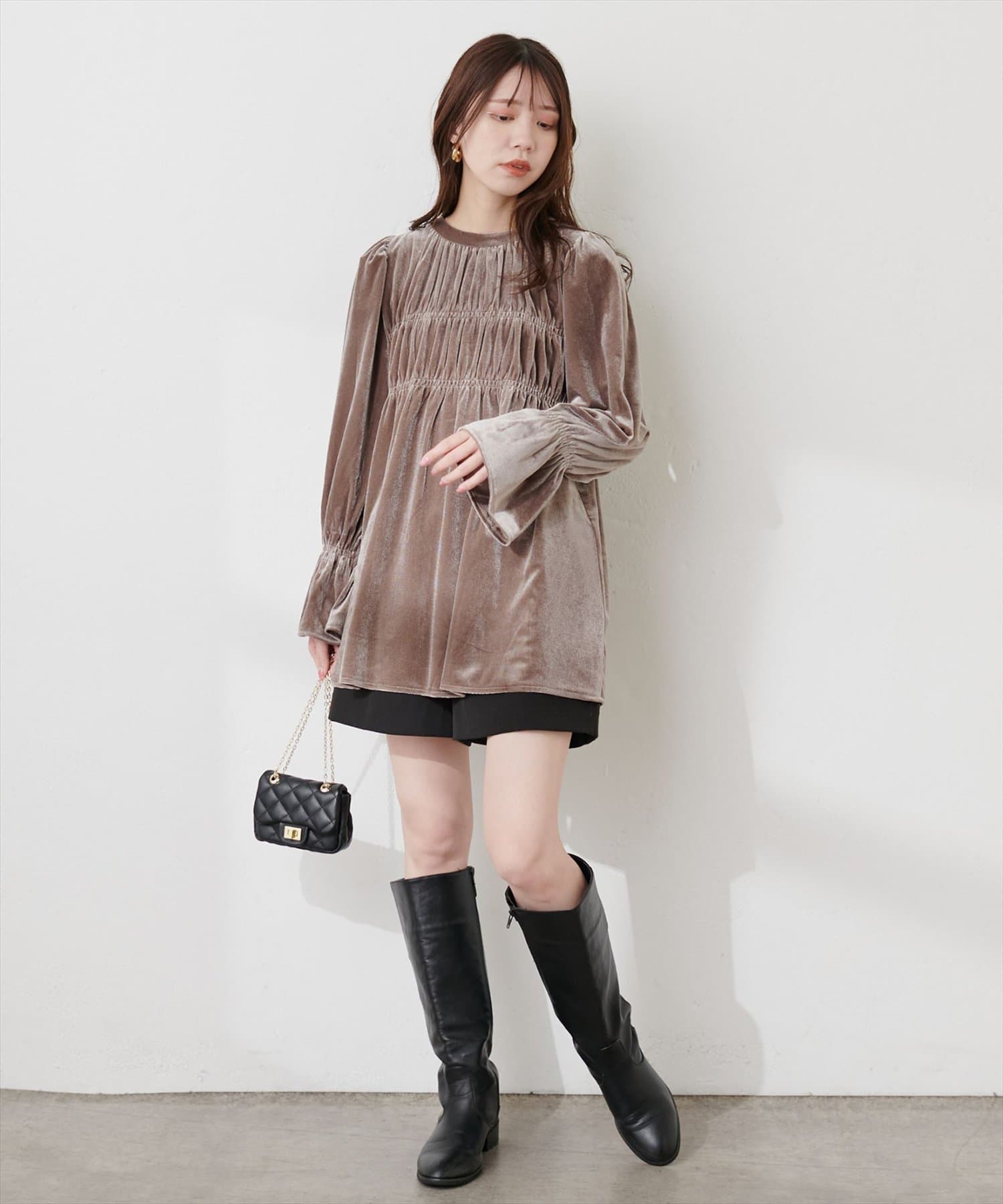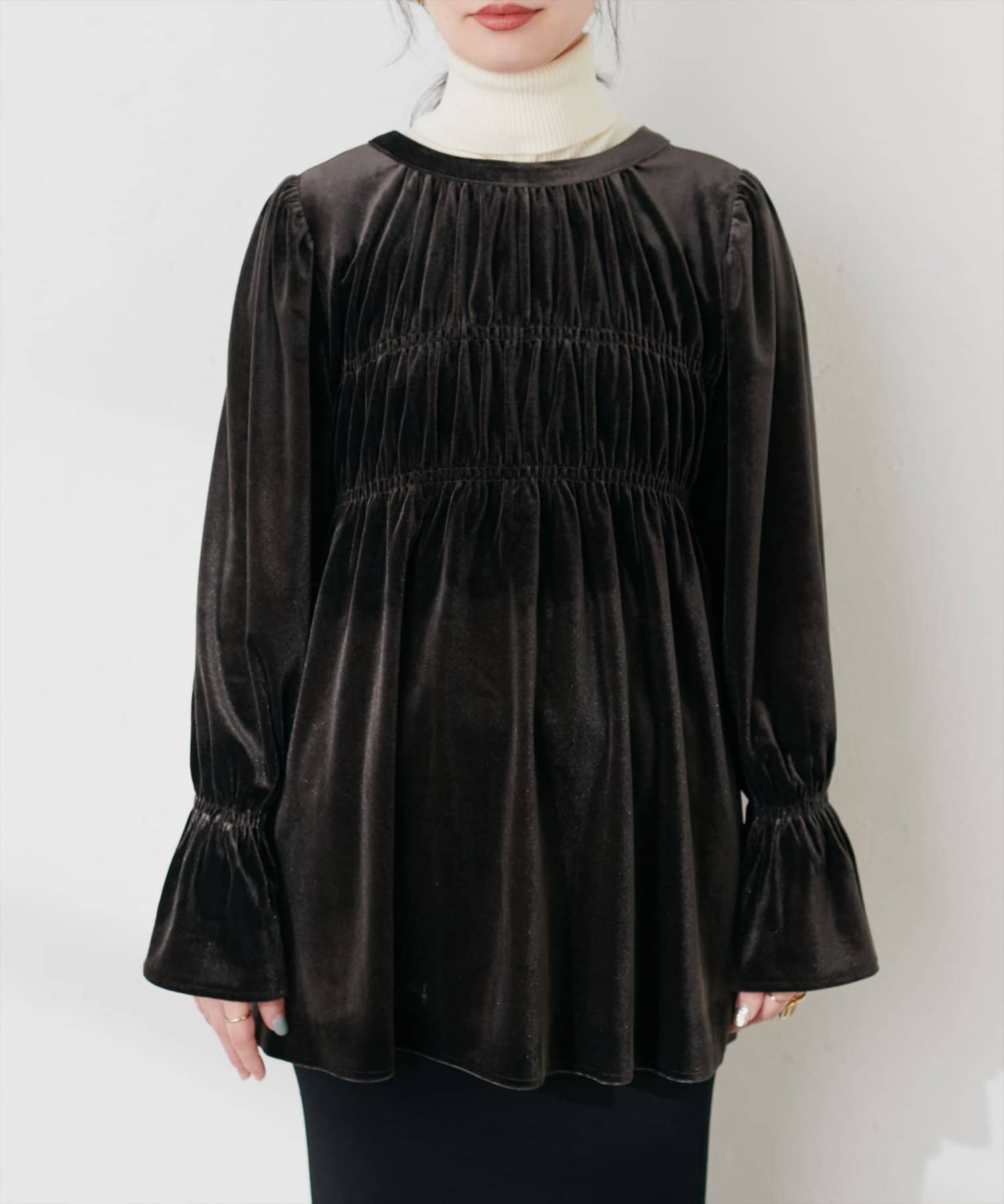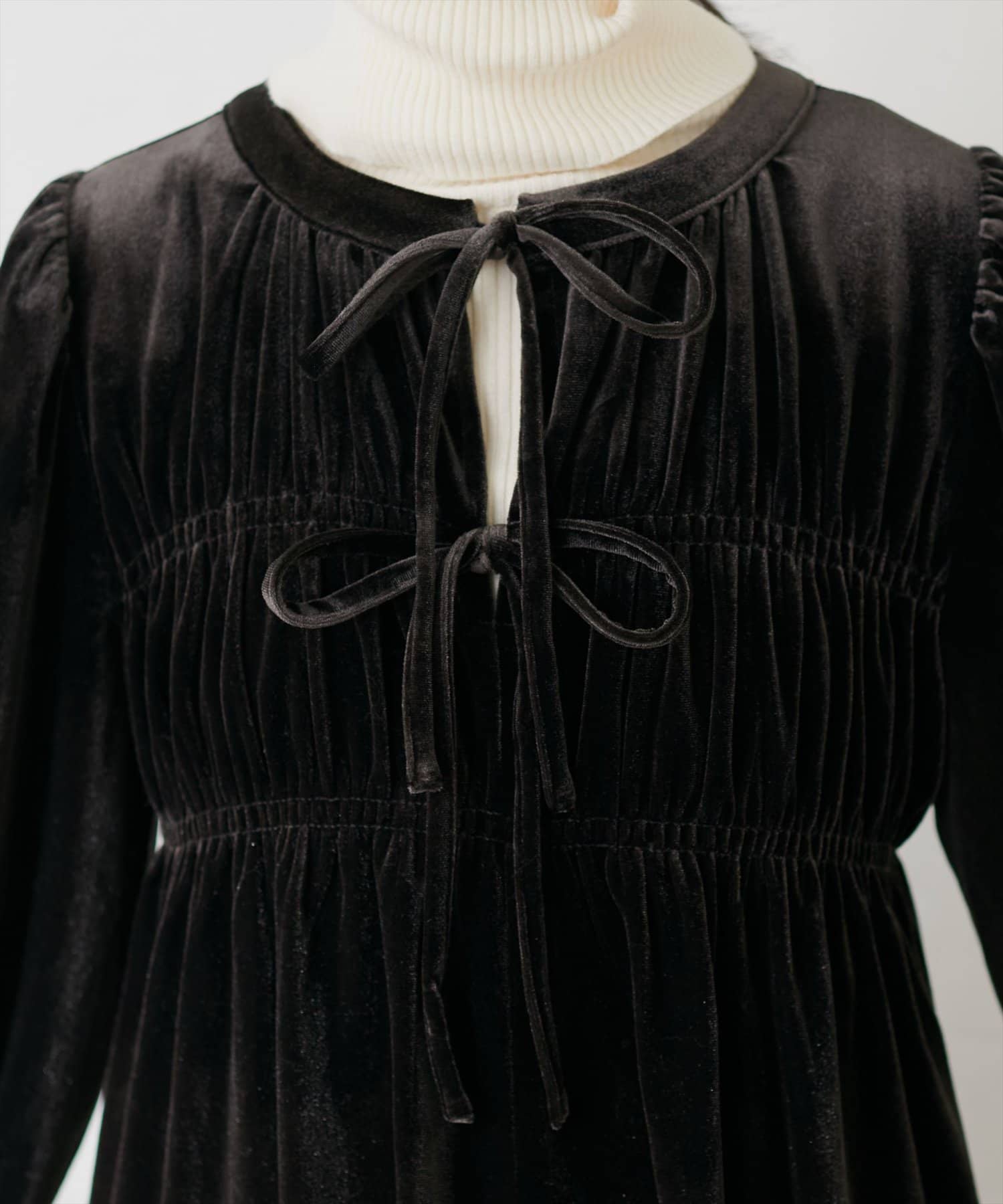ベロア素材とシャーリングやリボンのデザイン性で一枚で様になるアイテムです。