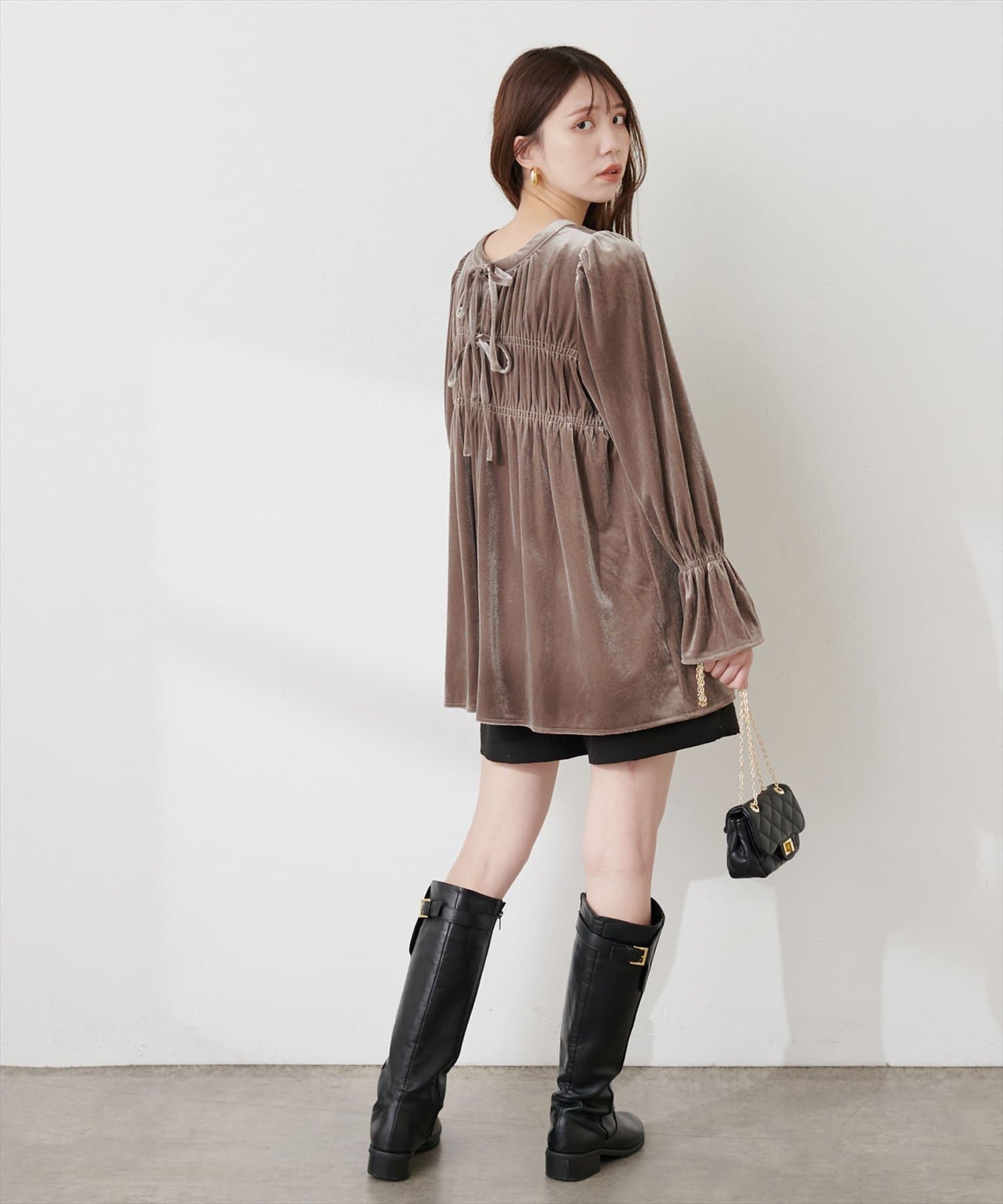 シャーリングデザインとフロントのリボンがポイントのベロアトップス。