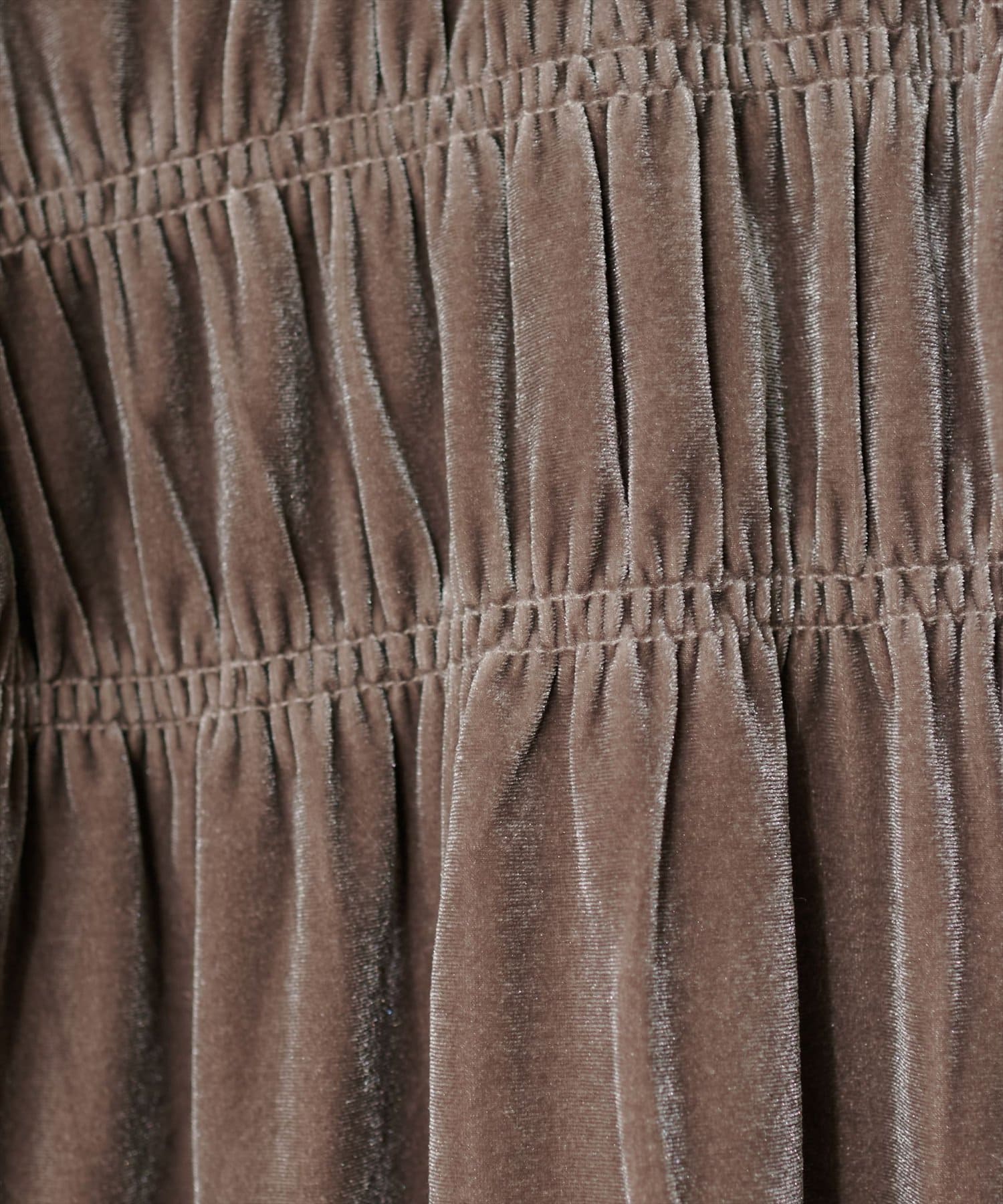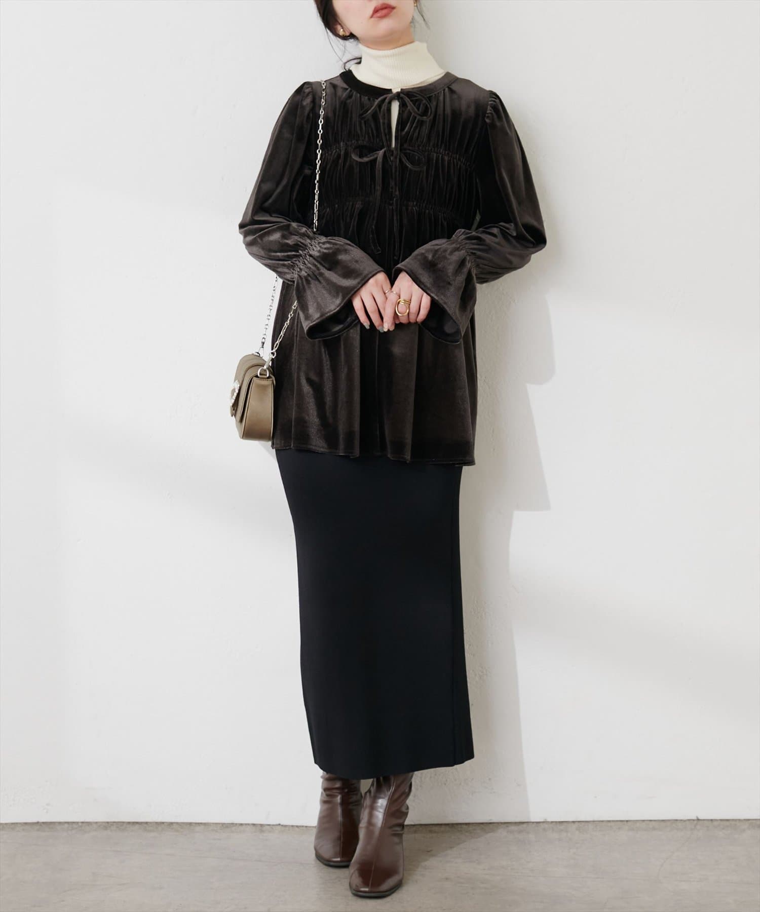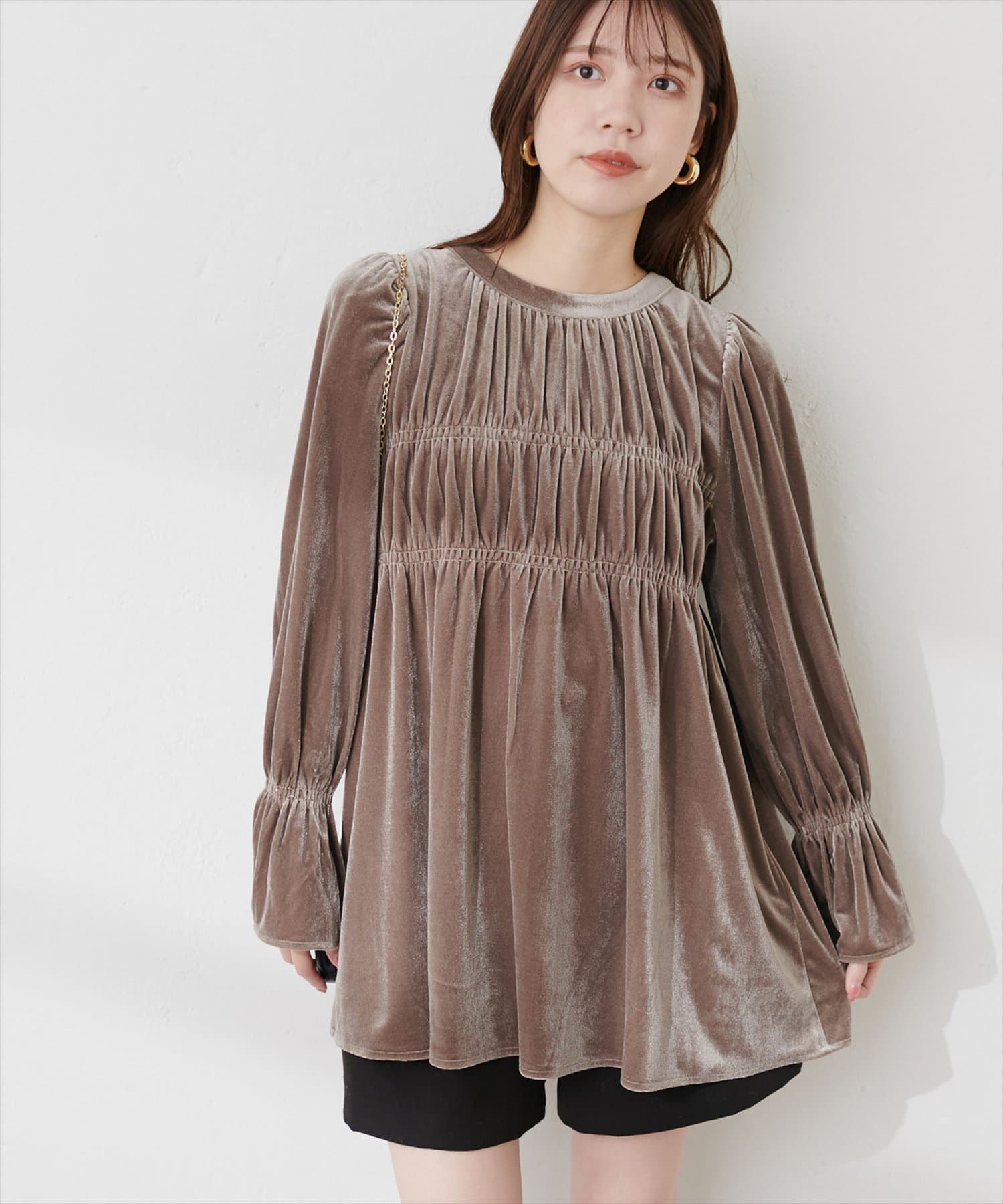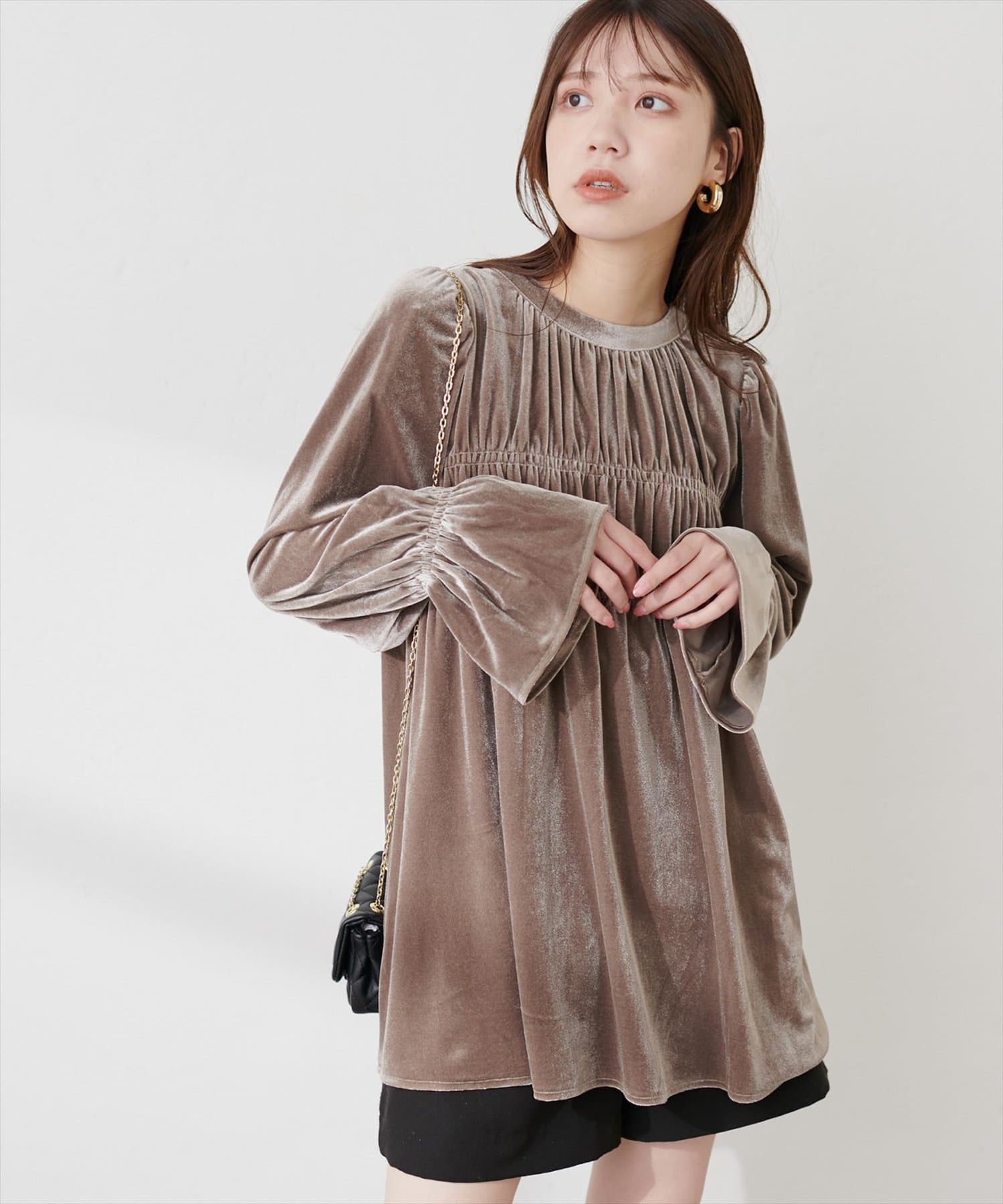 ベロア素材とシャーリングやリボンのデザイン性で一枚で様になるアイテムです。