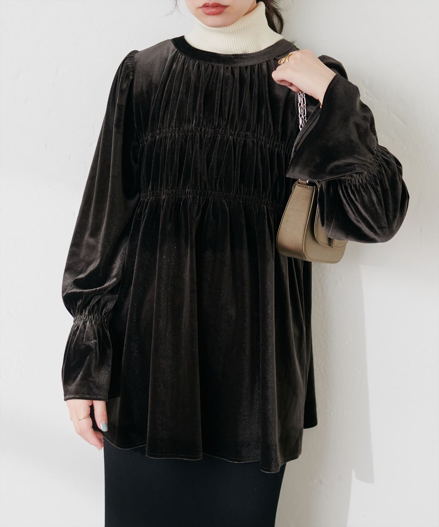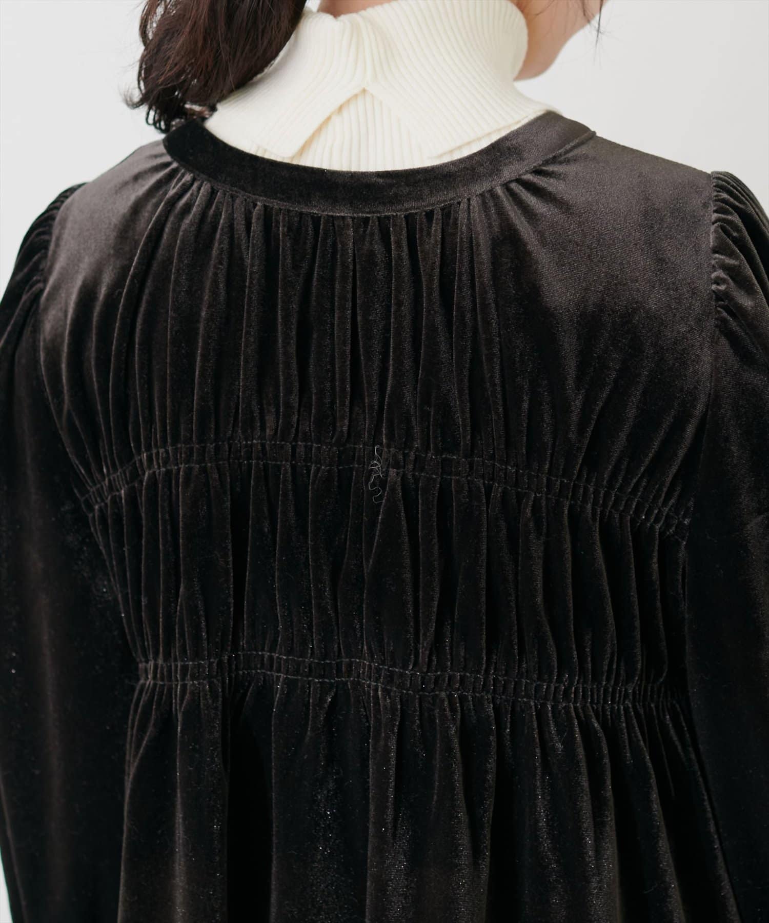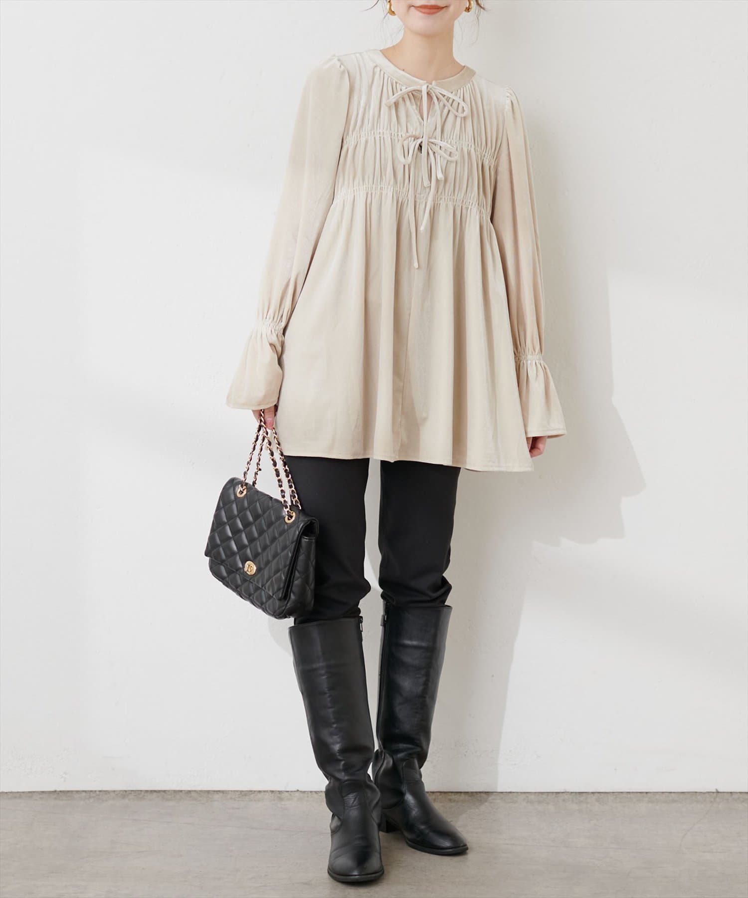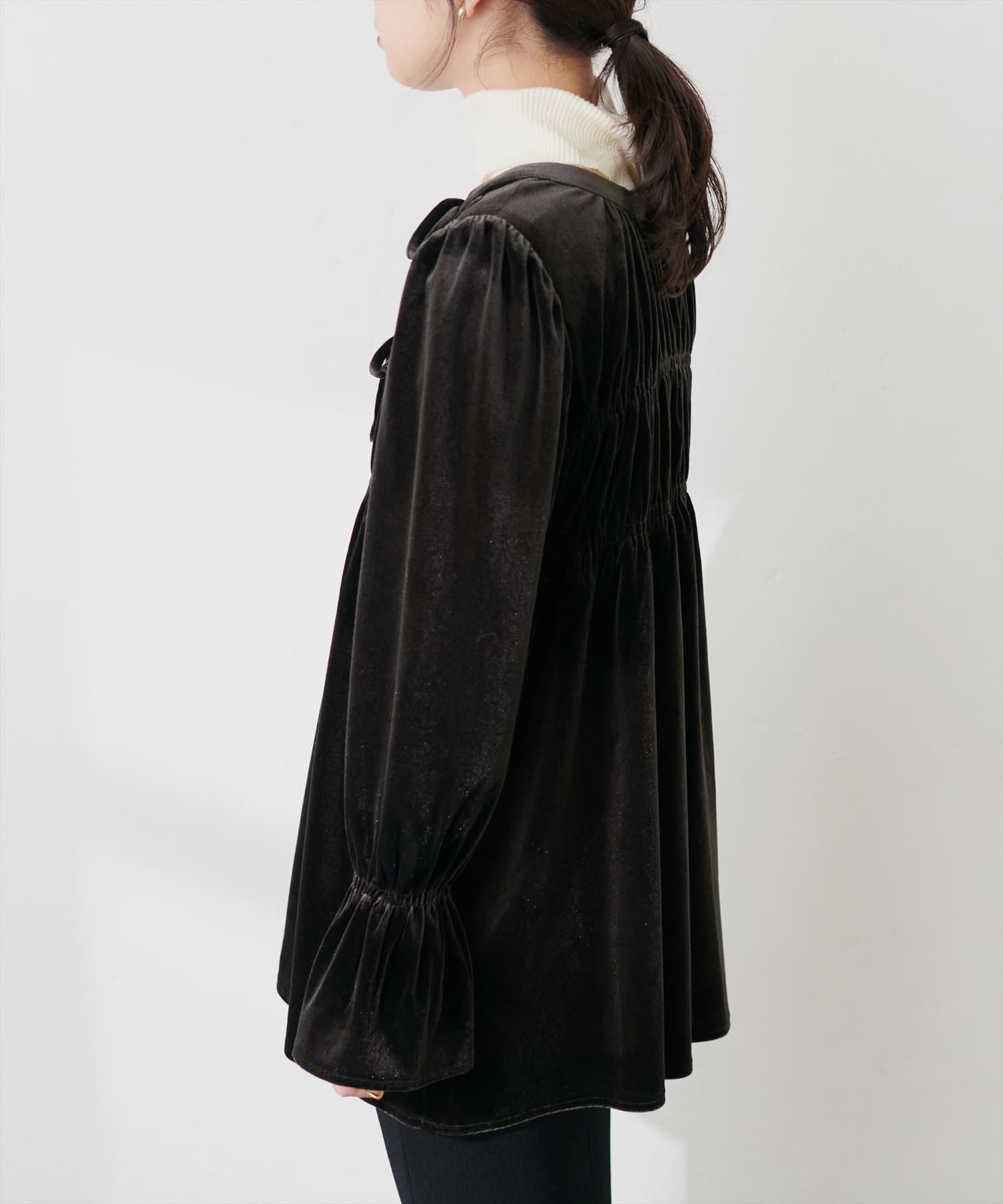 ベロア素材とシャーリングやリボンのデザイン性で一枚で様になるアイテムです。