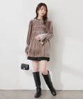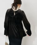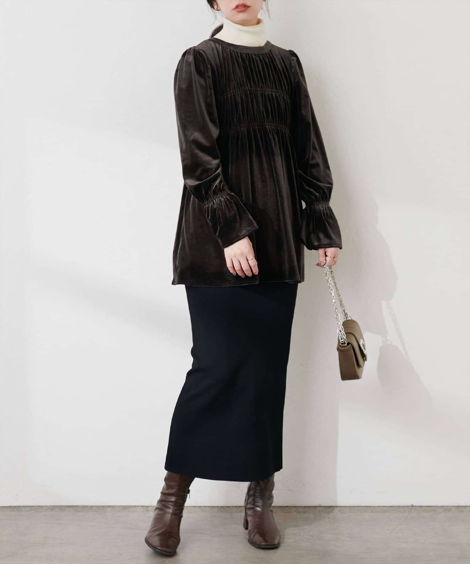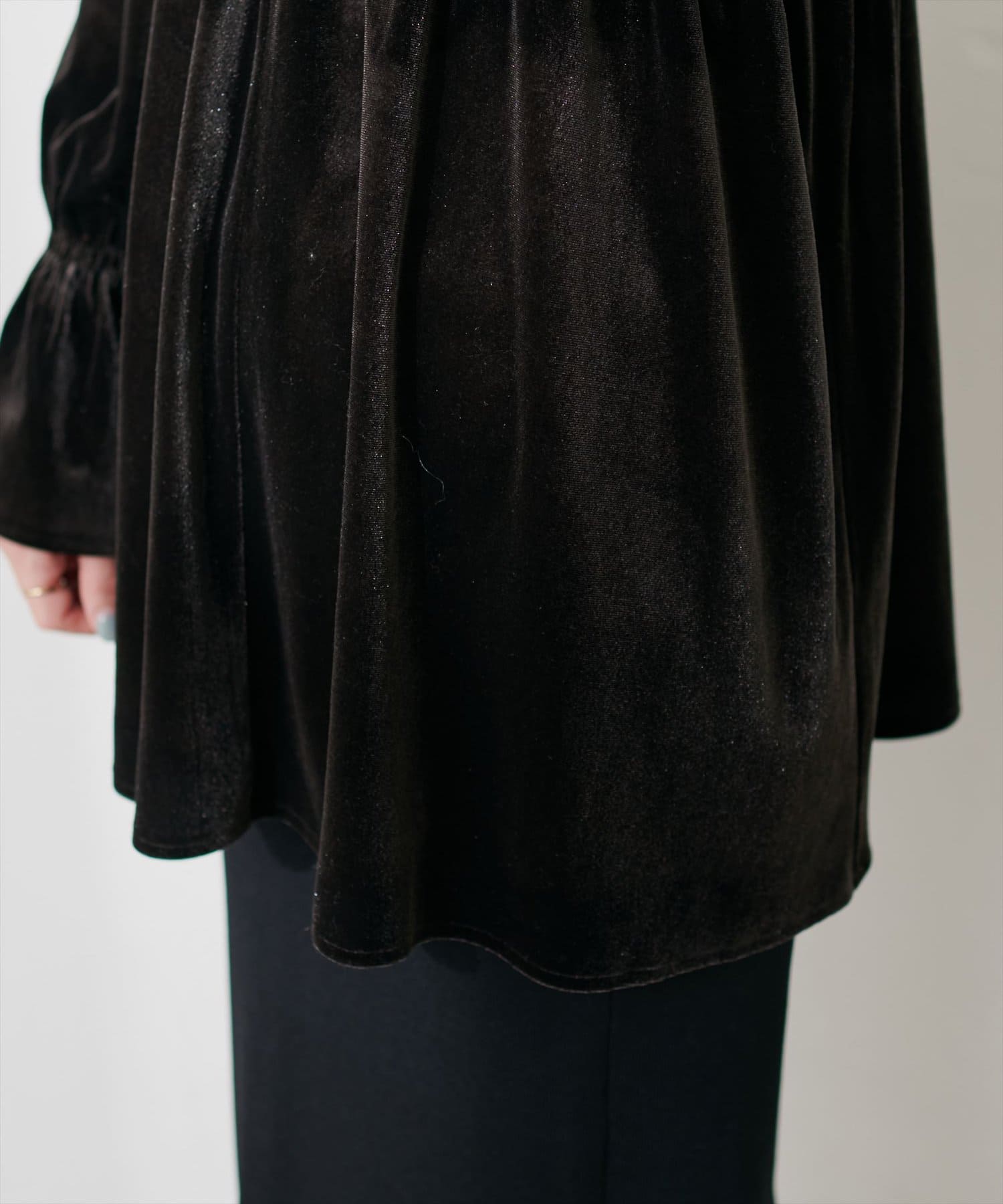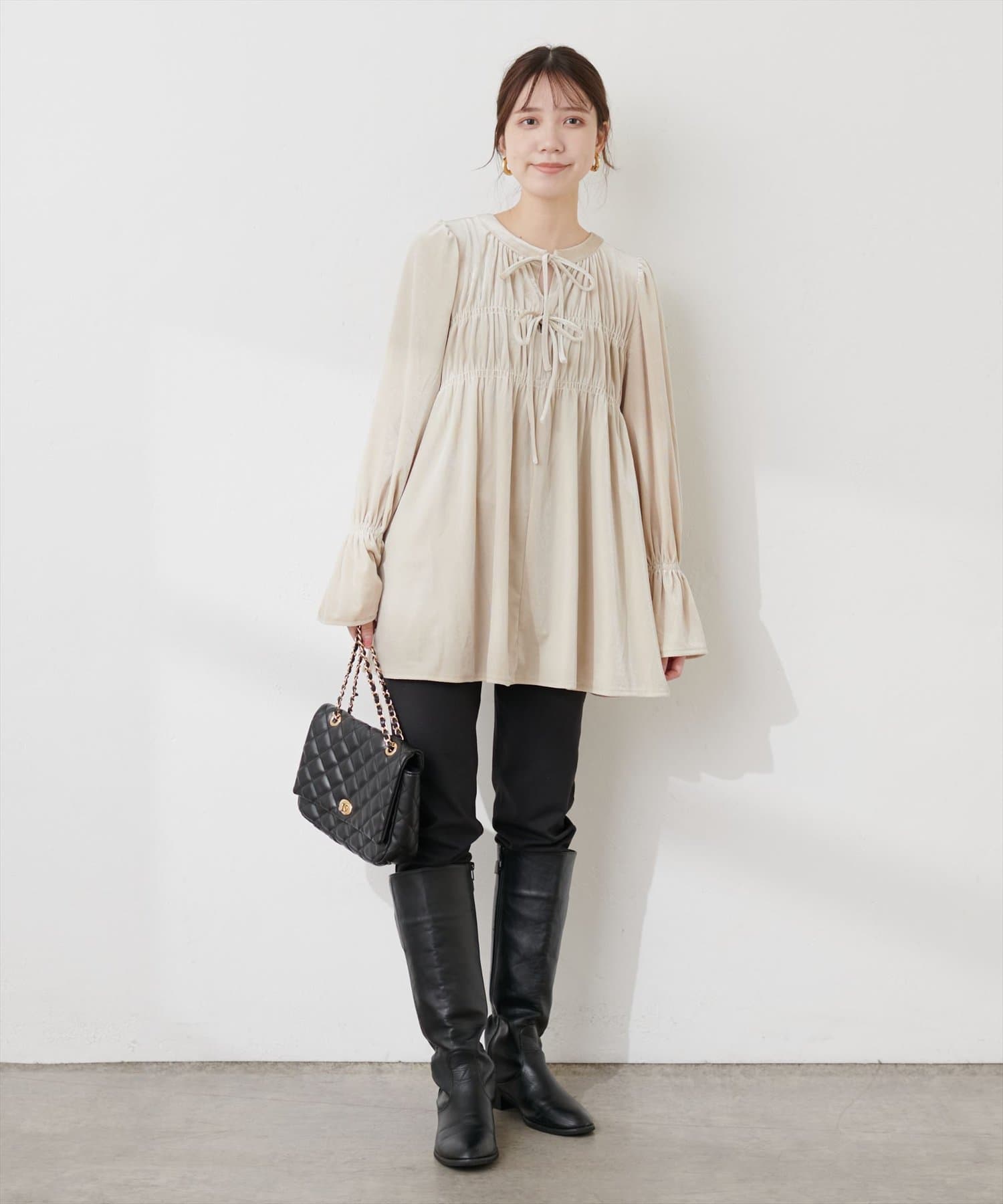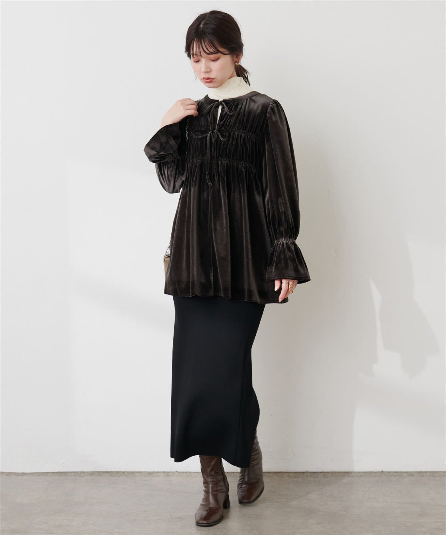 ベロア素材とシャーリングやリボンのデザイン性で一枚で様になるアイテムです。