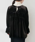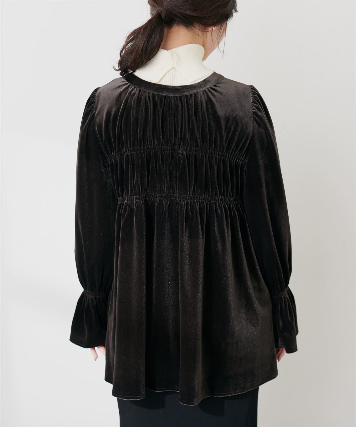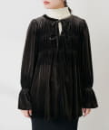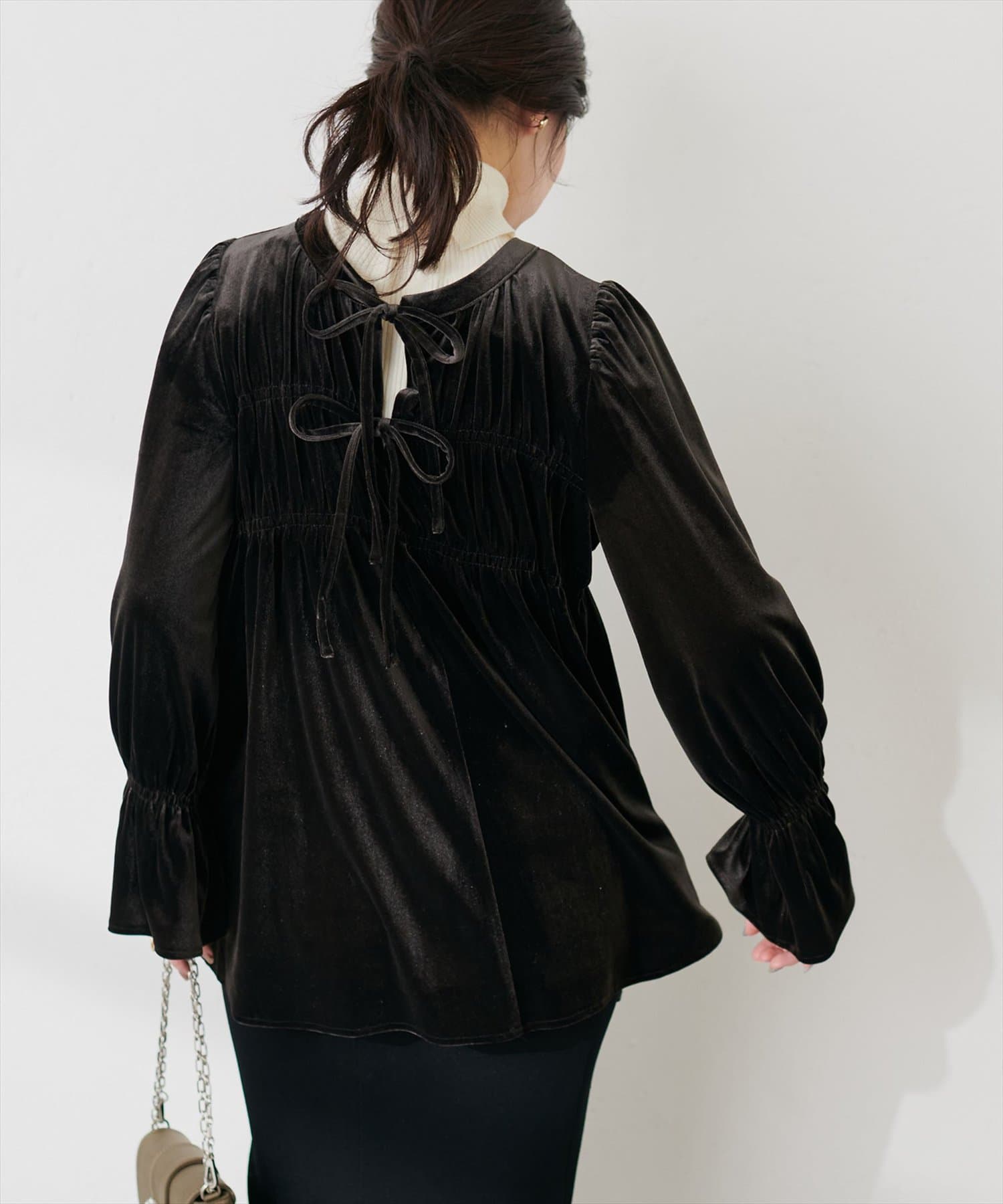 シャーリングデザインとフロントのリボンがポイントのベロアトップス。