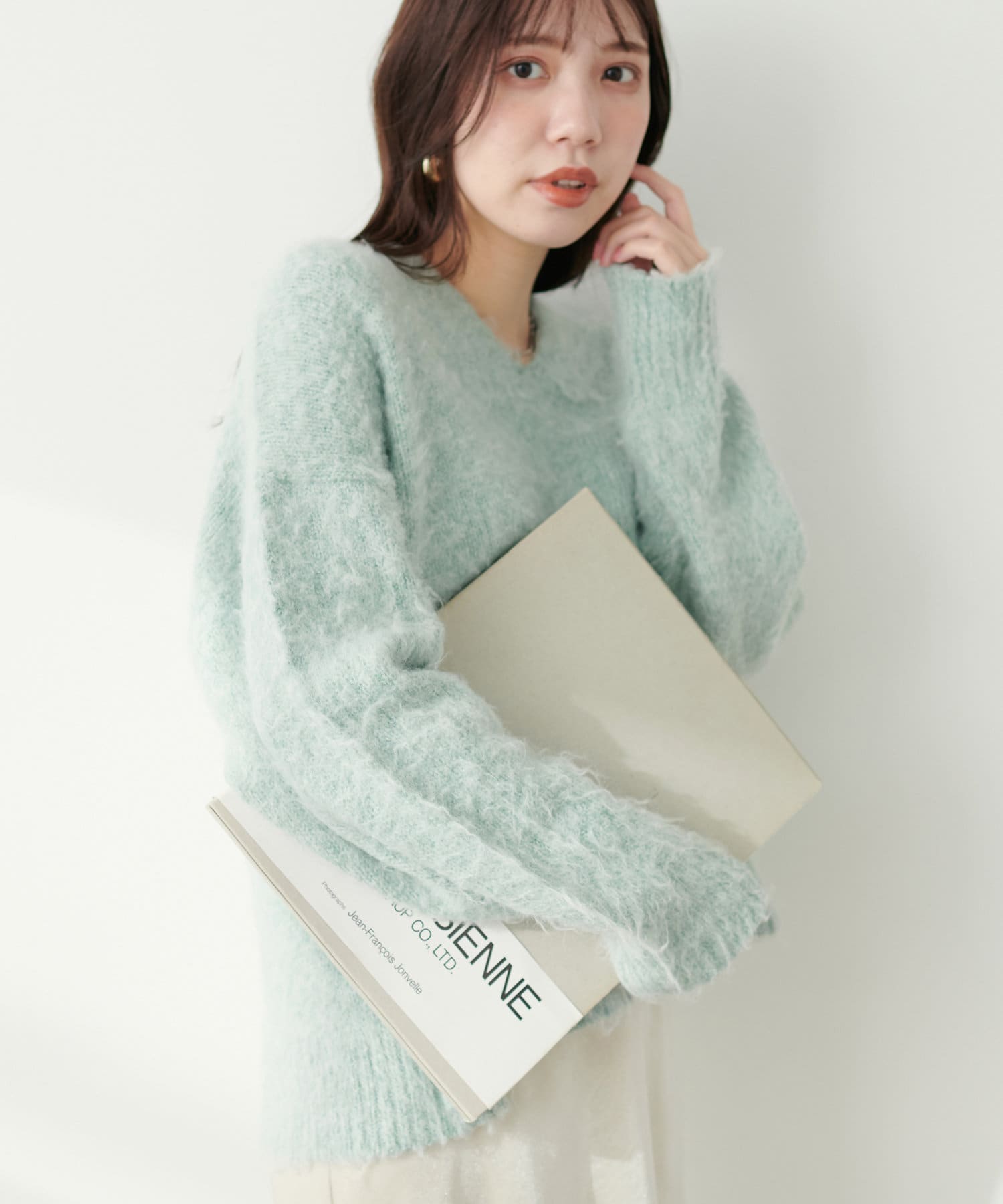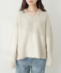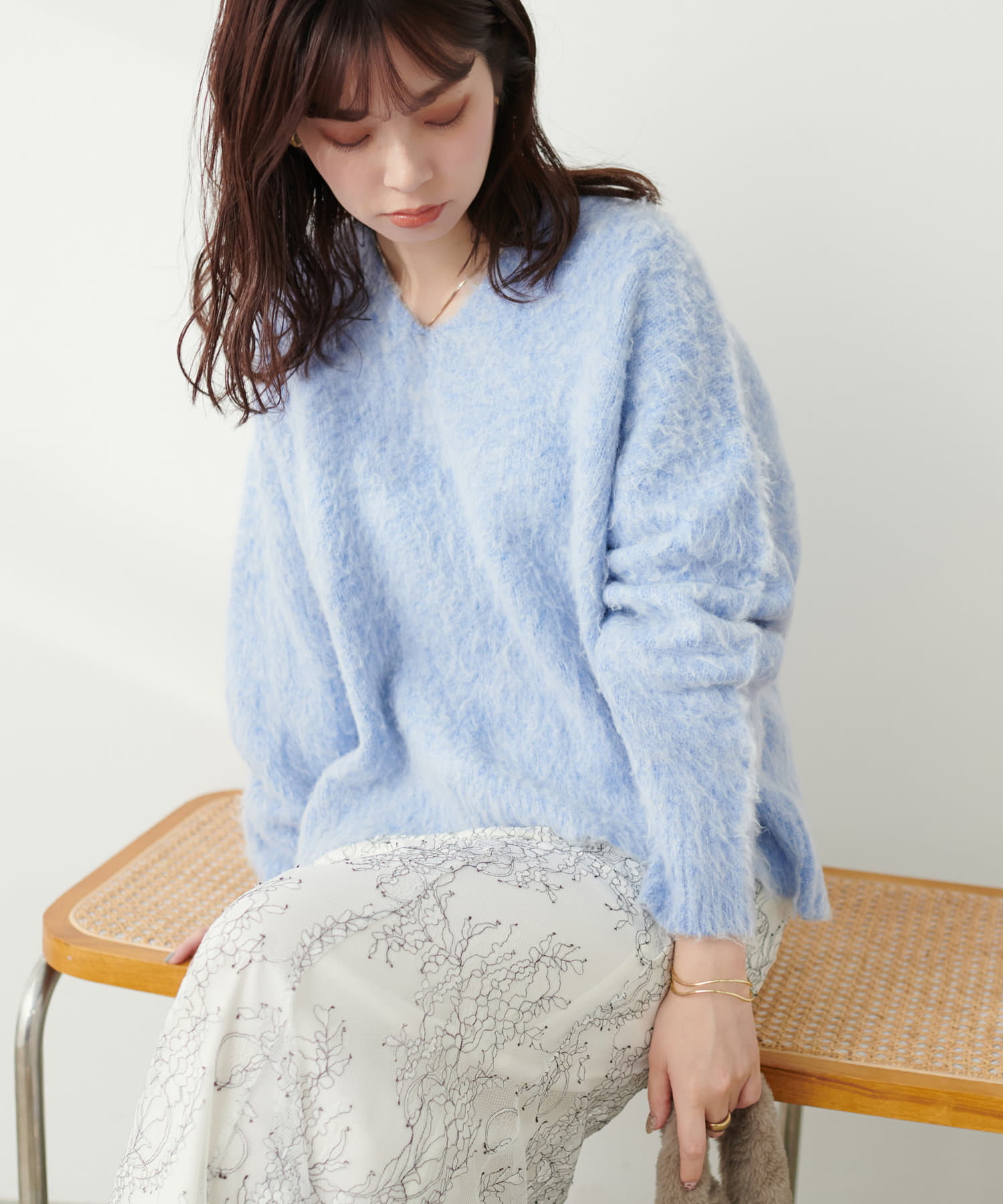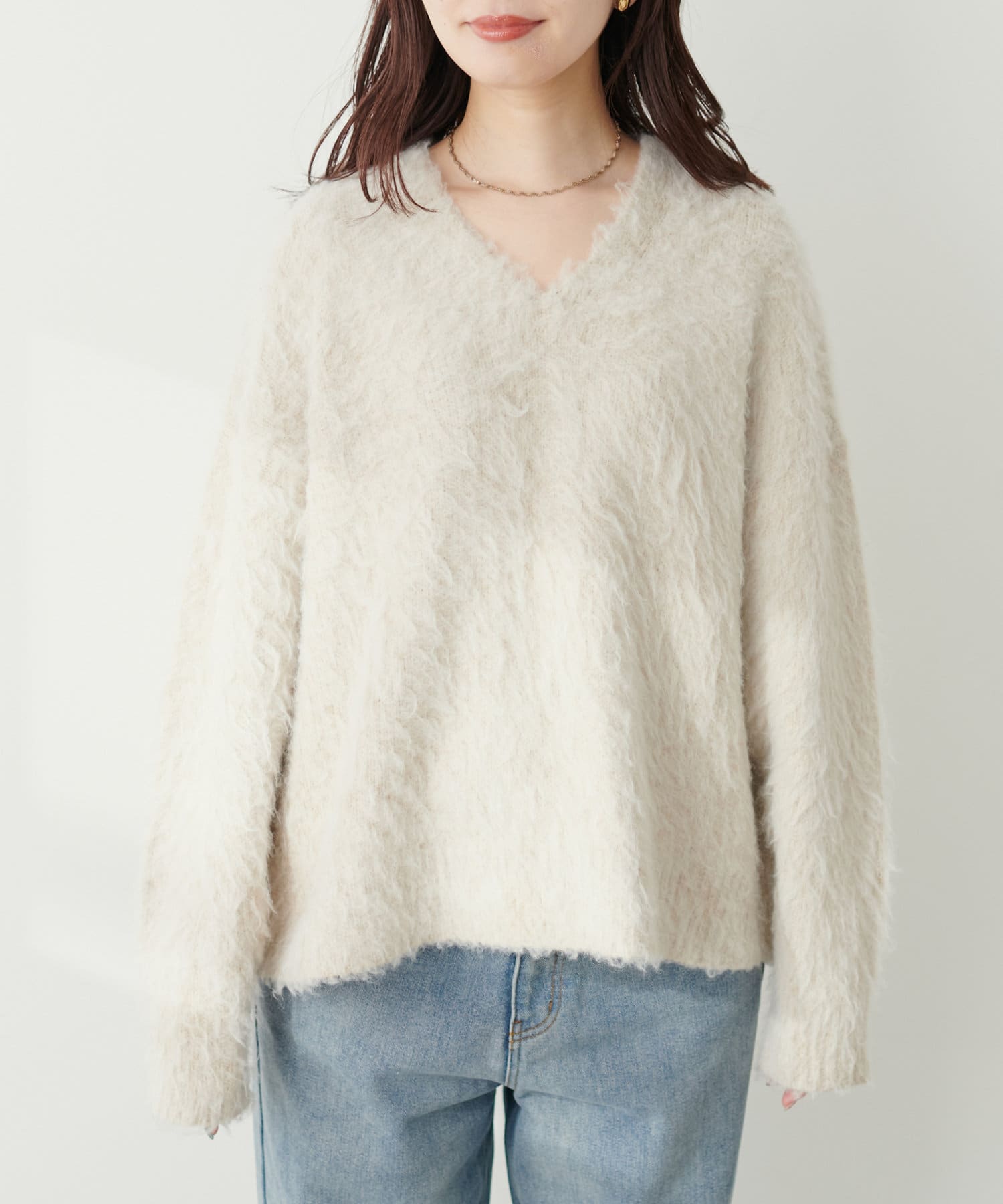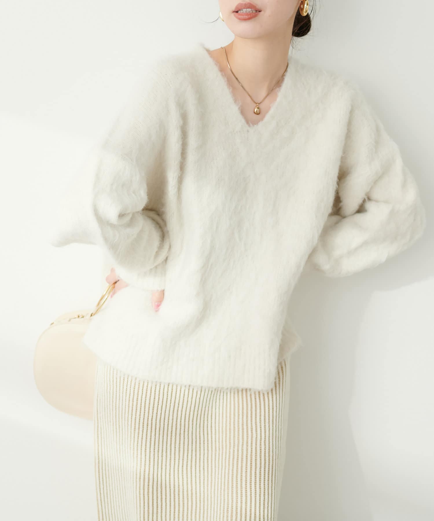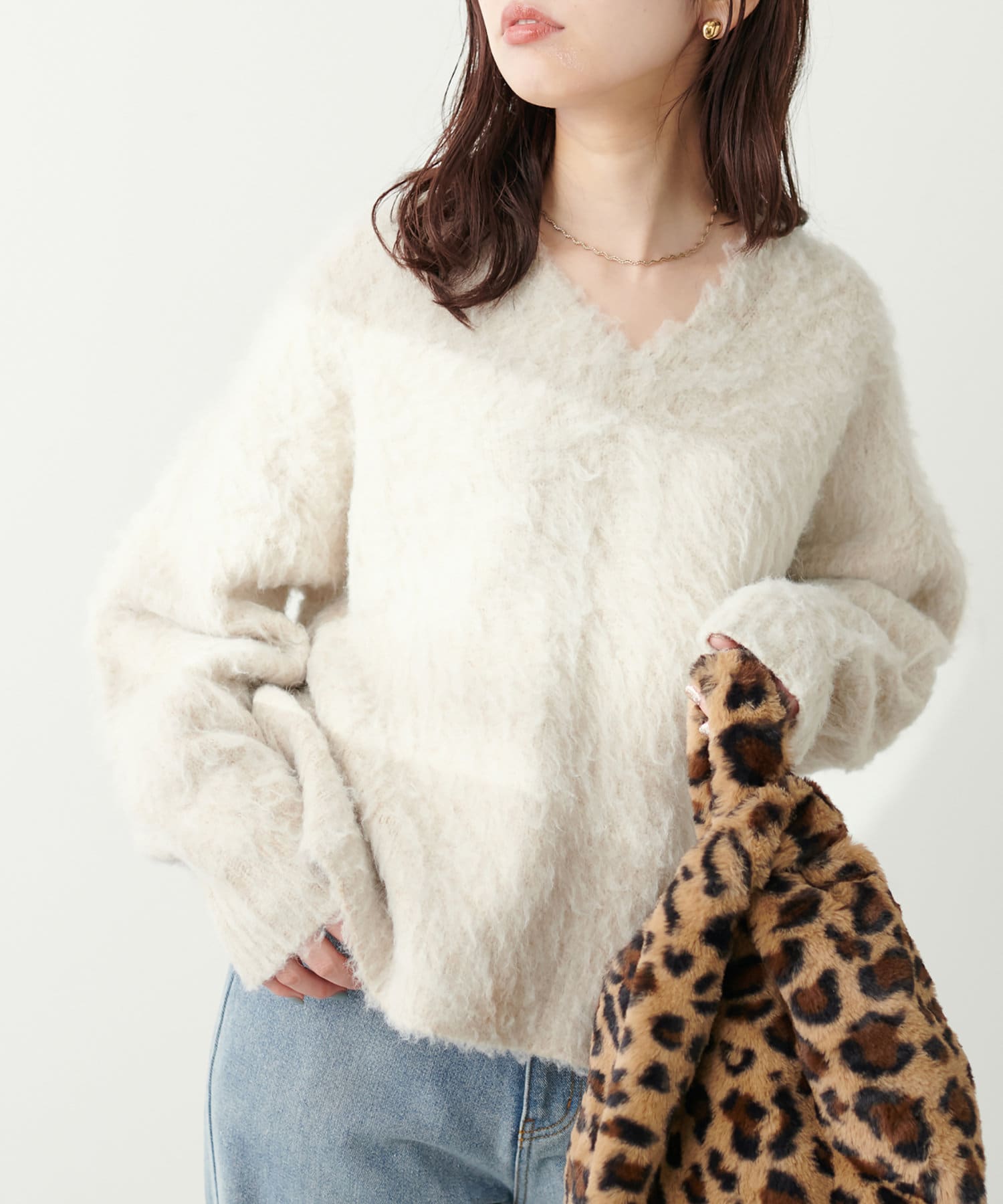 長い毛足とふわふわの肌触りが魅力のVネックニット