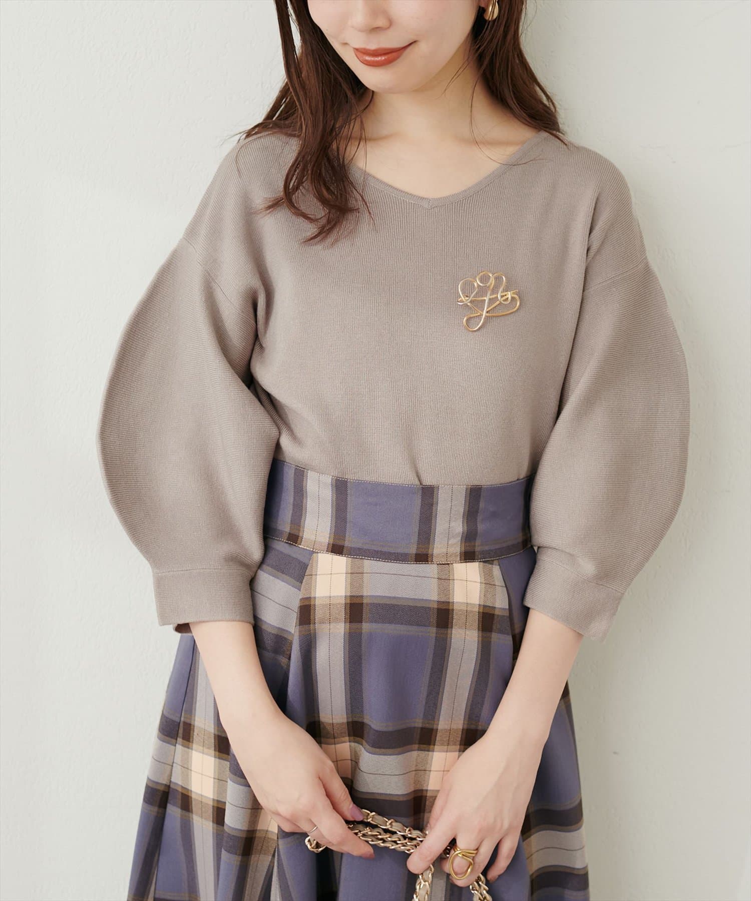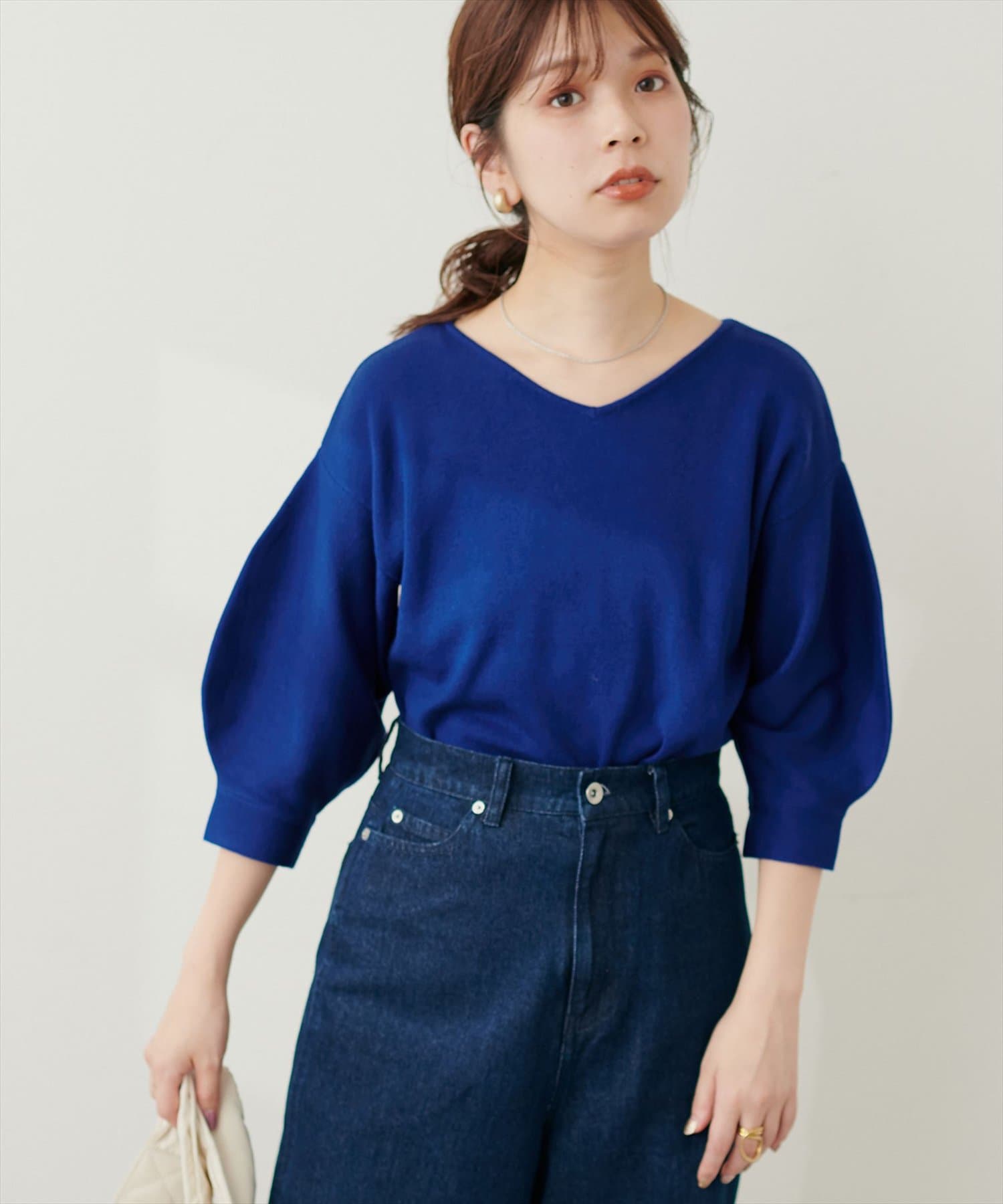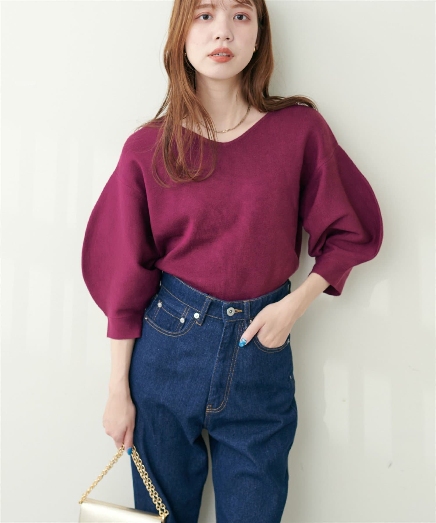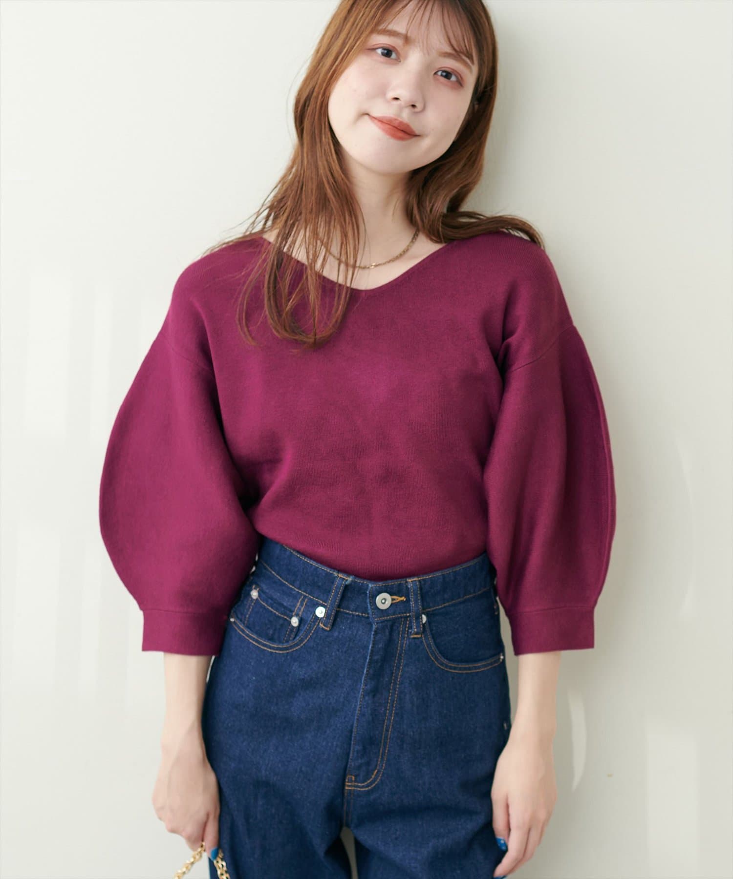 シャツと違ってバルーン袖なので、カジュアルの装いと合わせても、ちょっと可愛らしさを取り入れられる万能ニット。