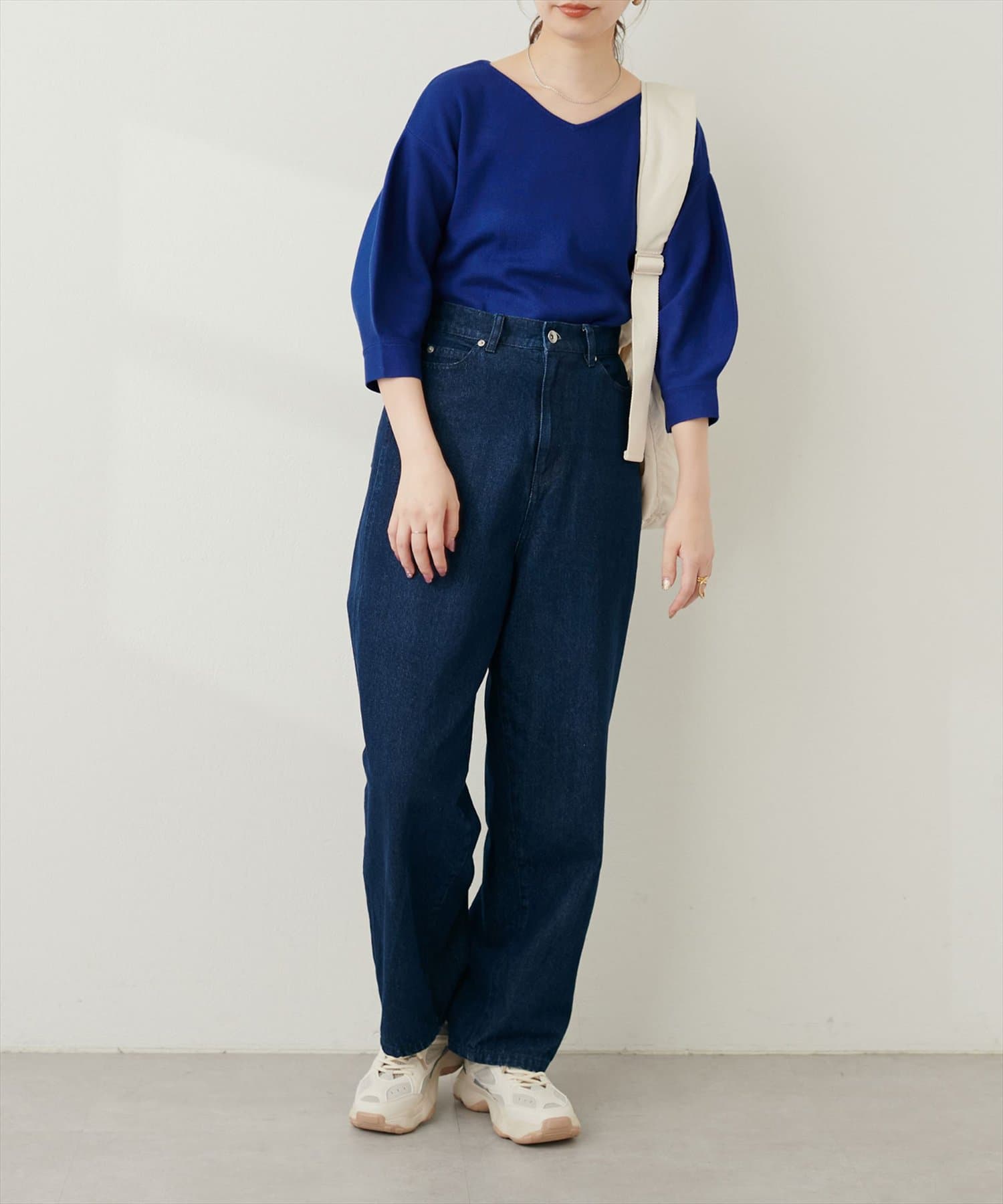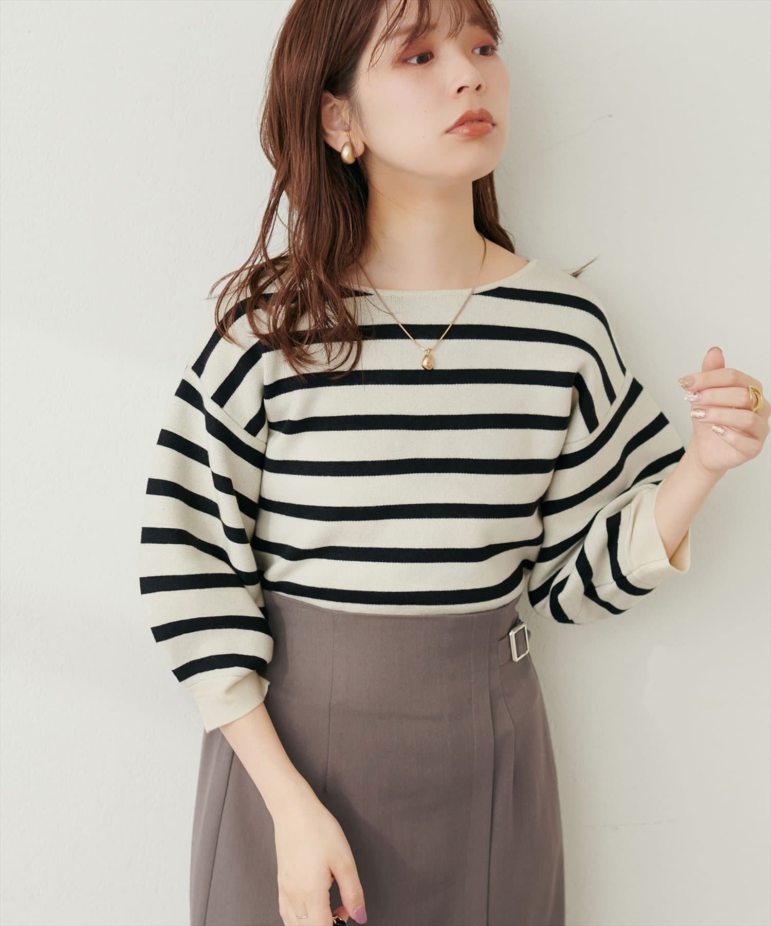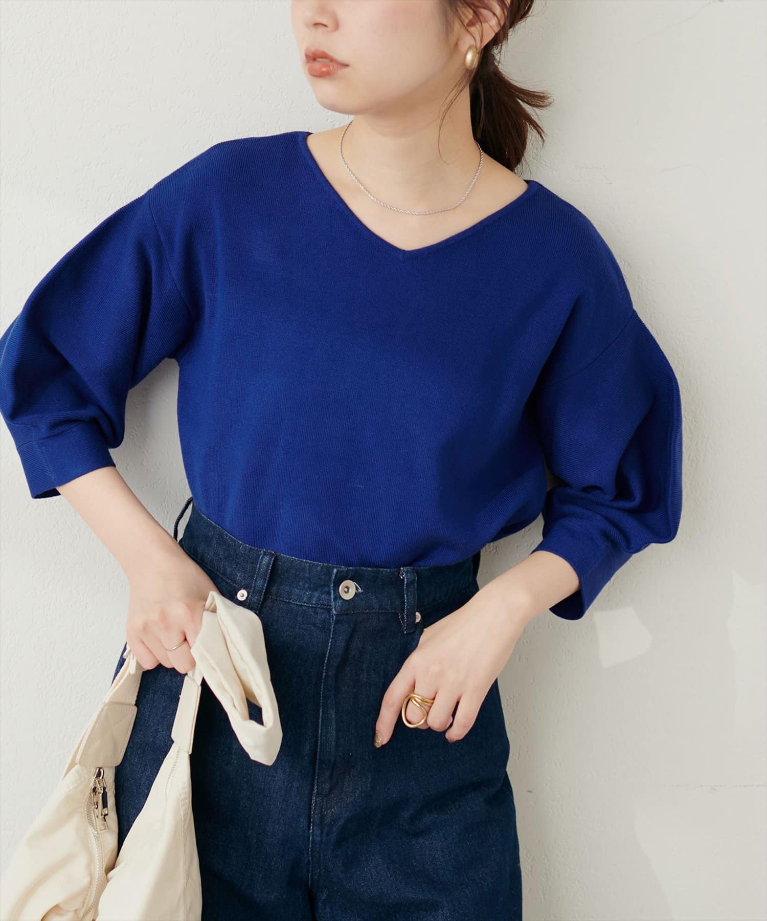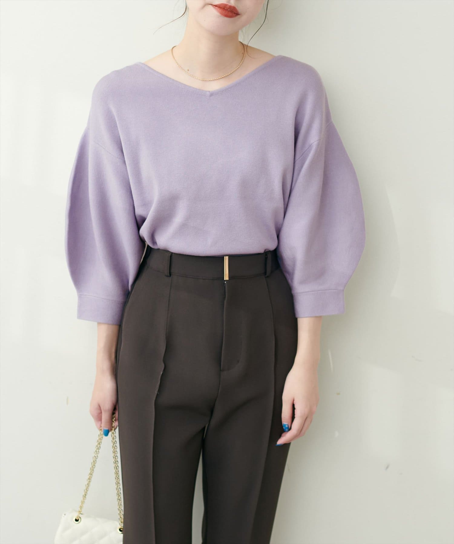シャツと違ってバルーン袖なので、カジュアルの装いと合わせても、ちょっと可愛らしさを取り入れられる万能ニット。