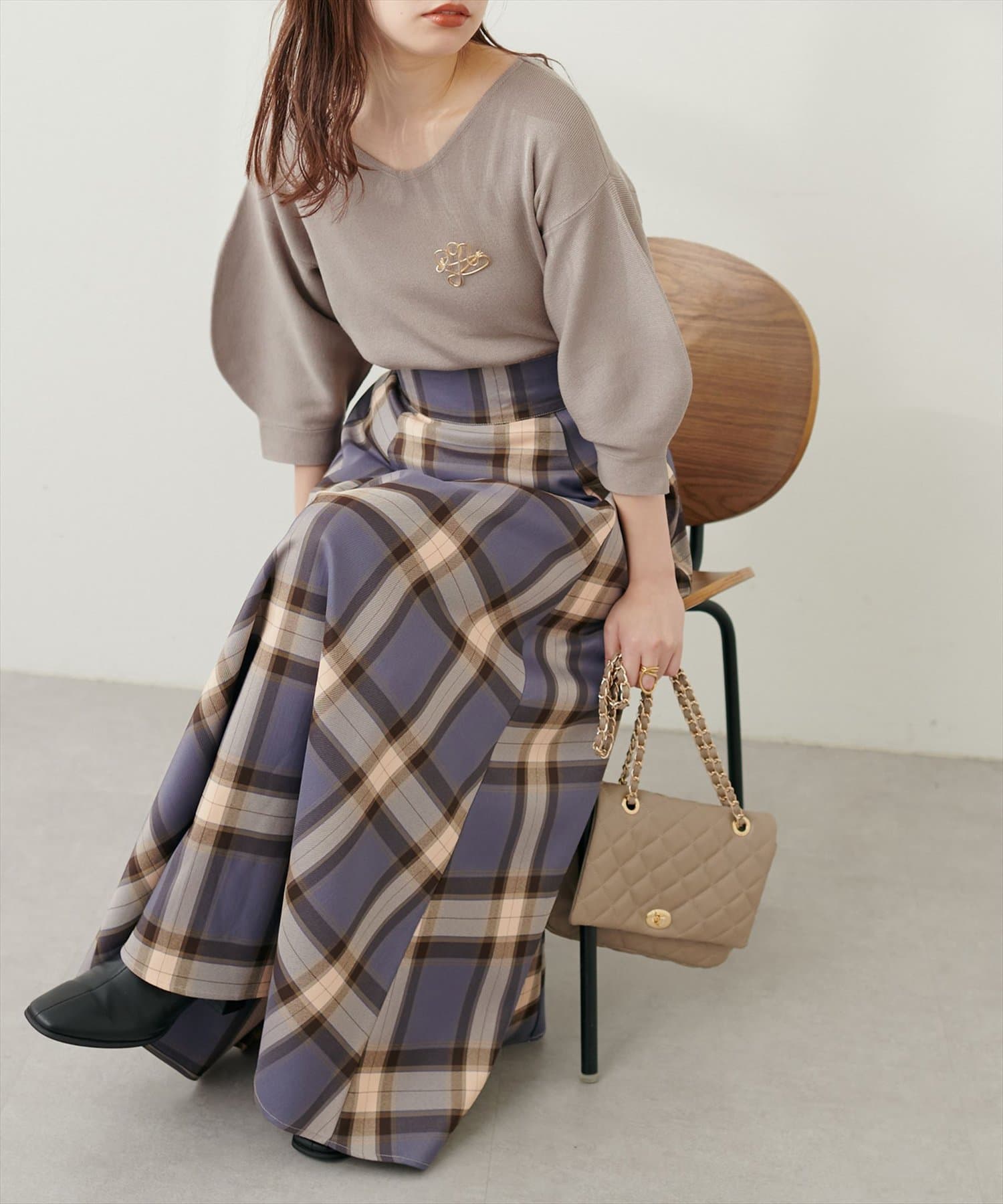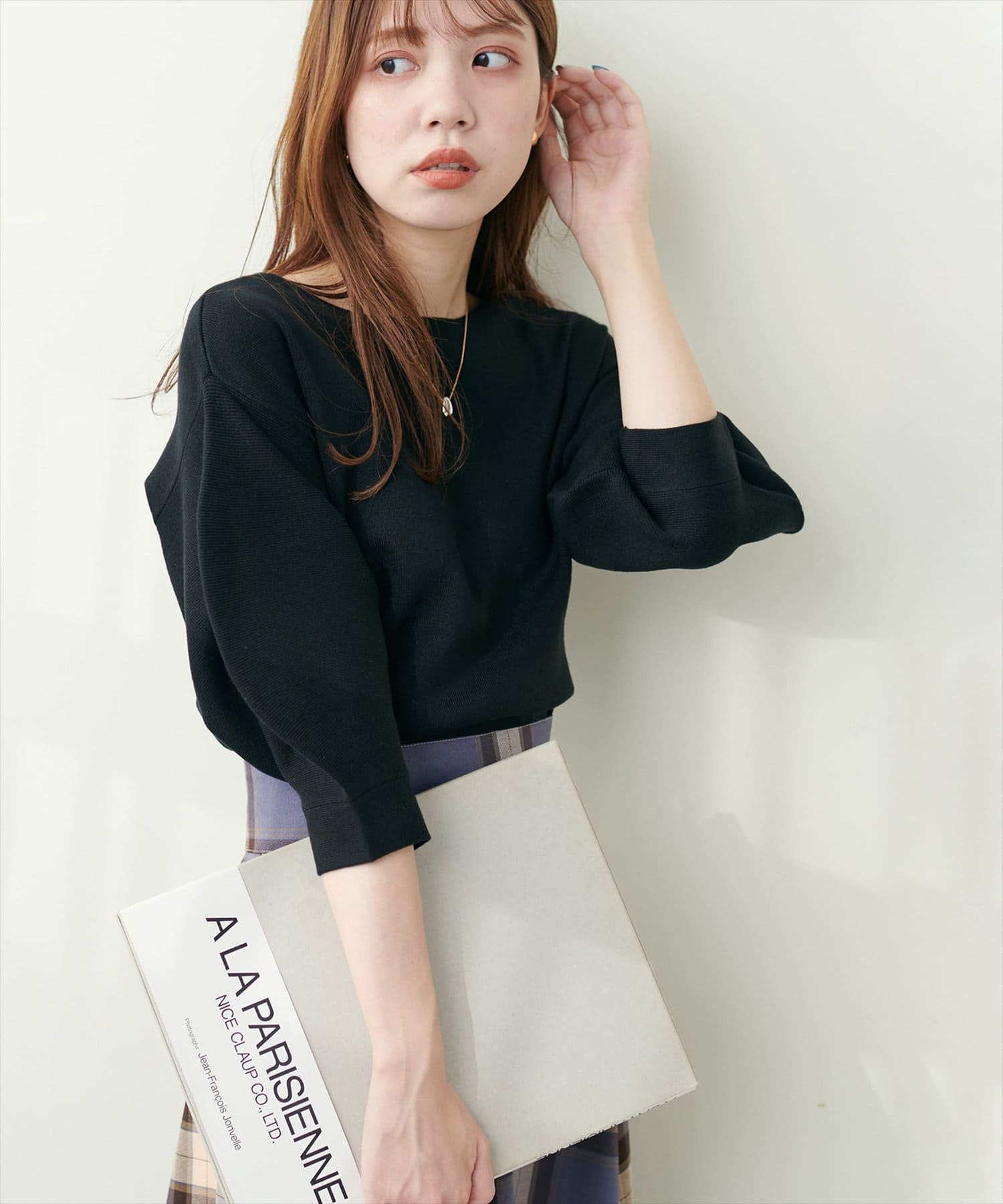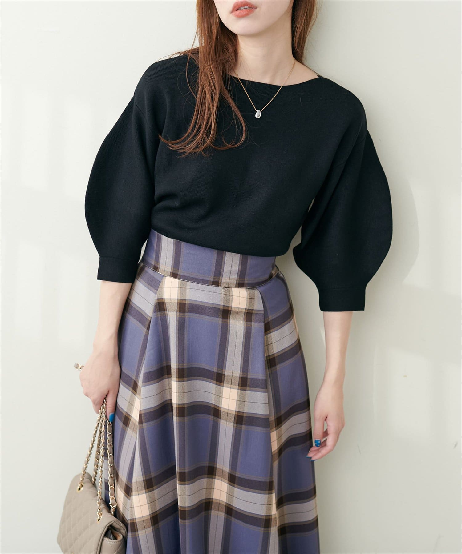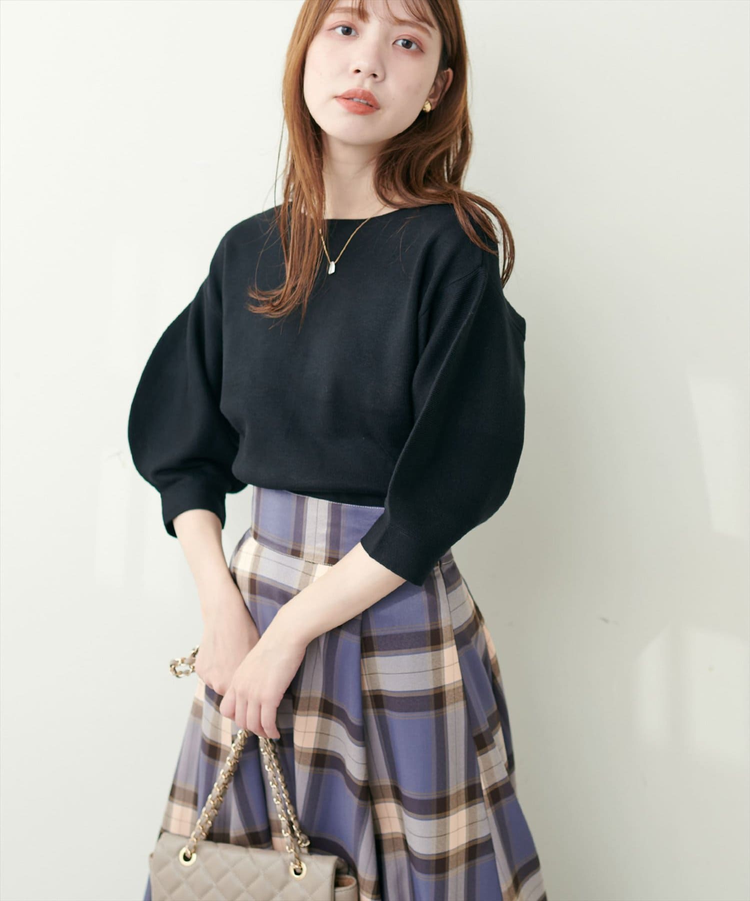 シャツと違ってバルーン袖なので、カジュアルの装いと合わせても、ちょっと可愛らしさを取り入れられる万能ニット。