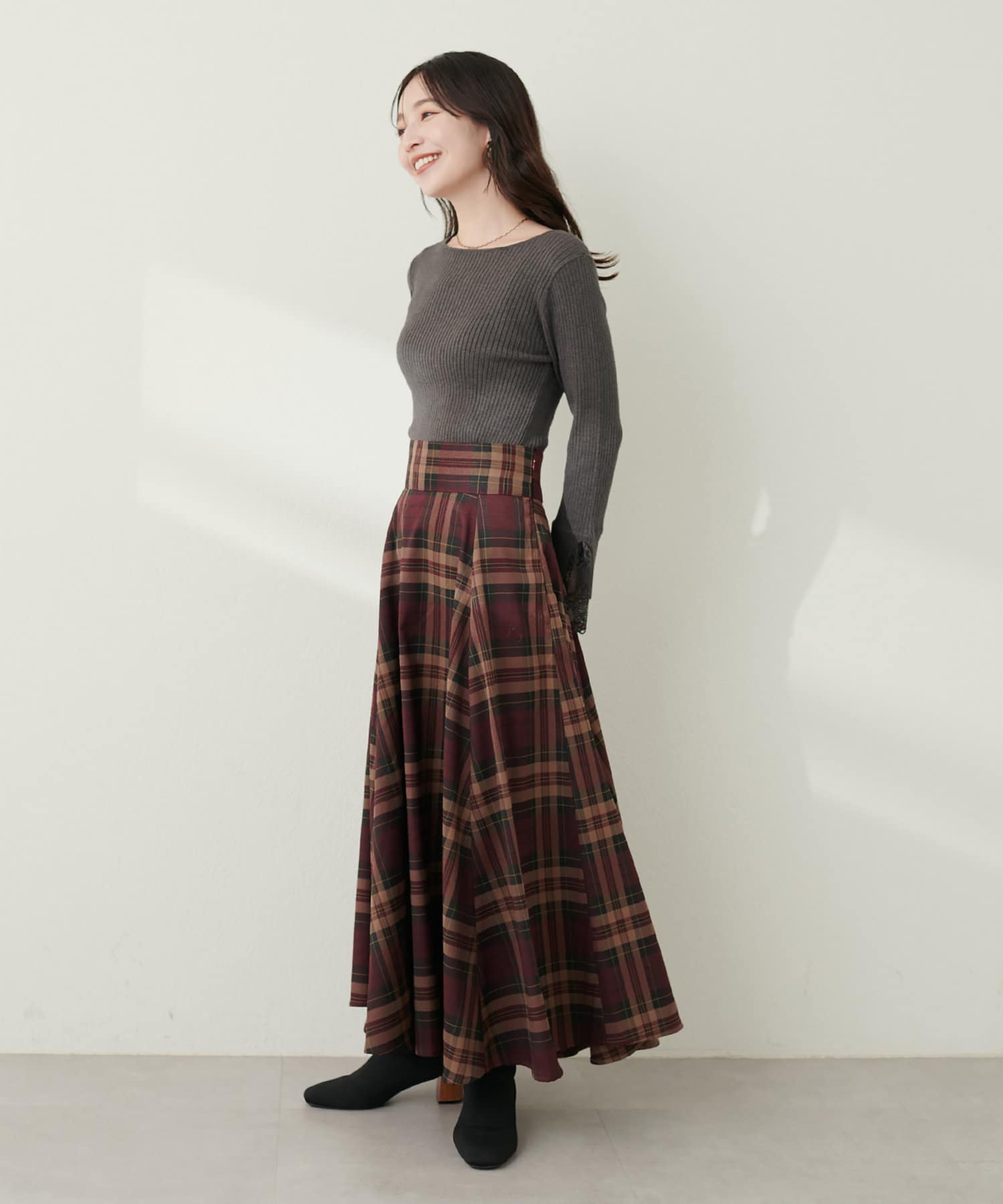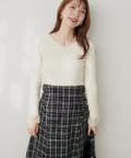 12Gで編みあげたリブニットはウエストインをして着用したときも