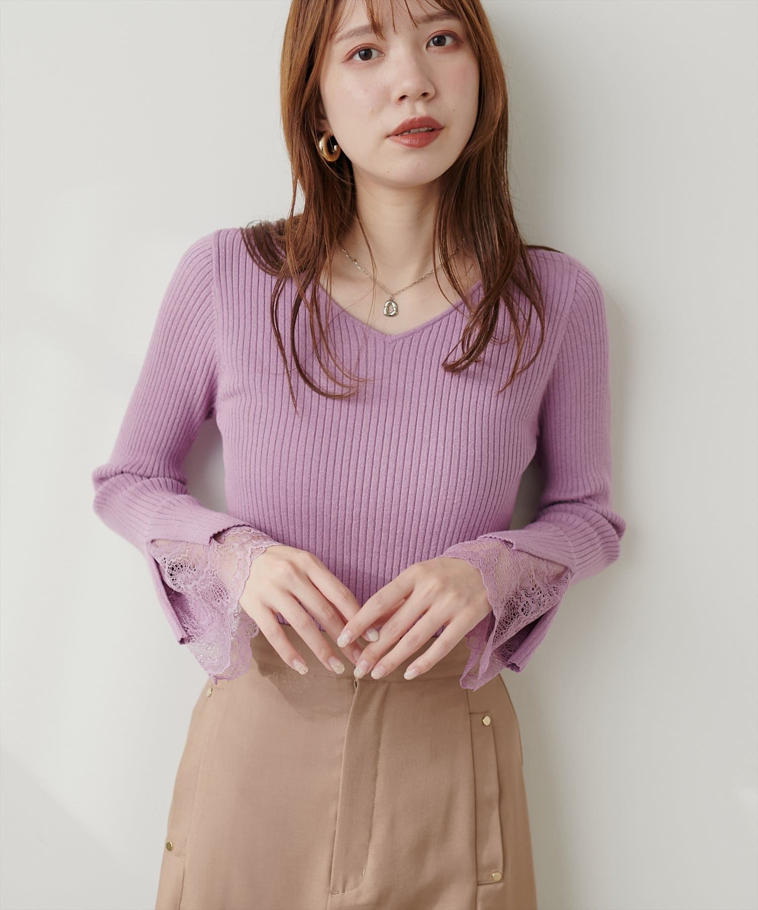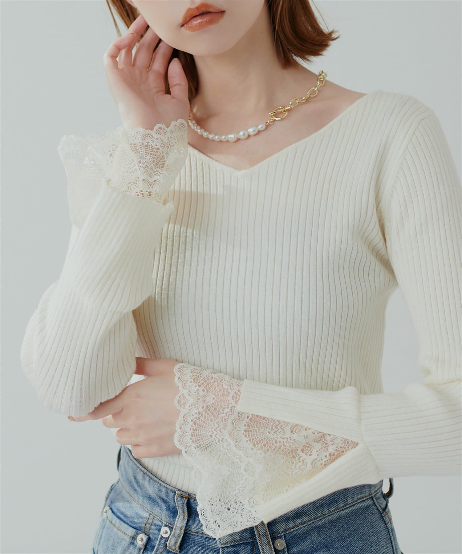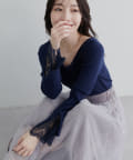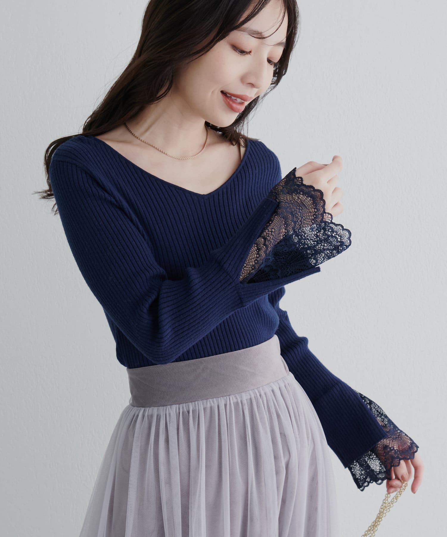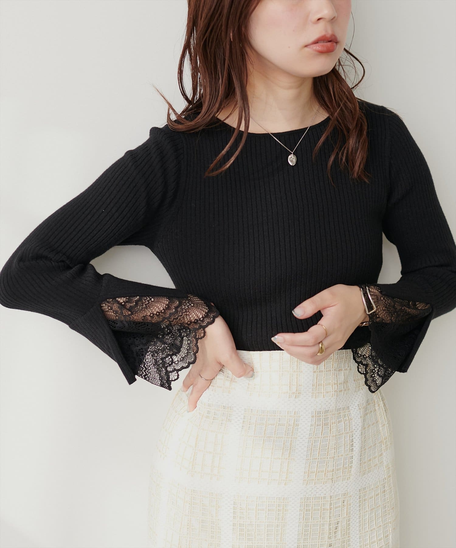 ニットの袖口には大きく切り込みをいれ、内側のレースでほんのり甘さもプラス。