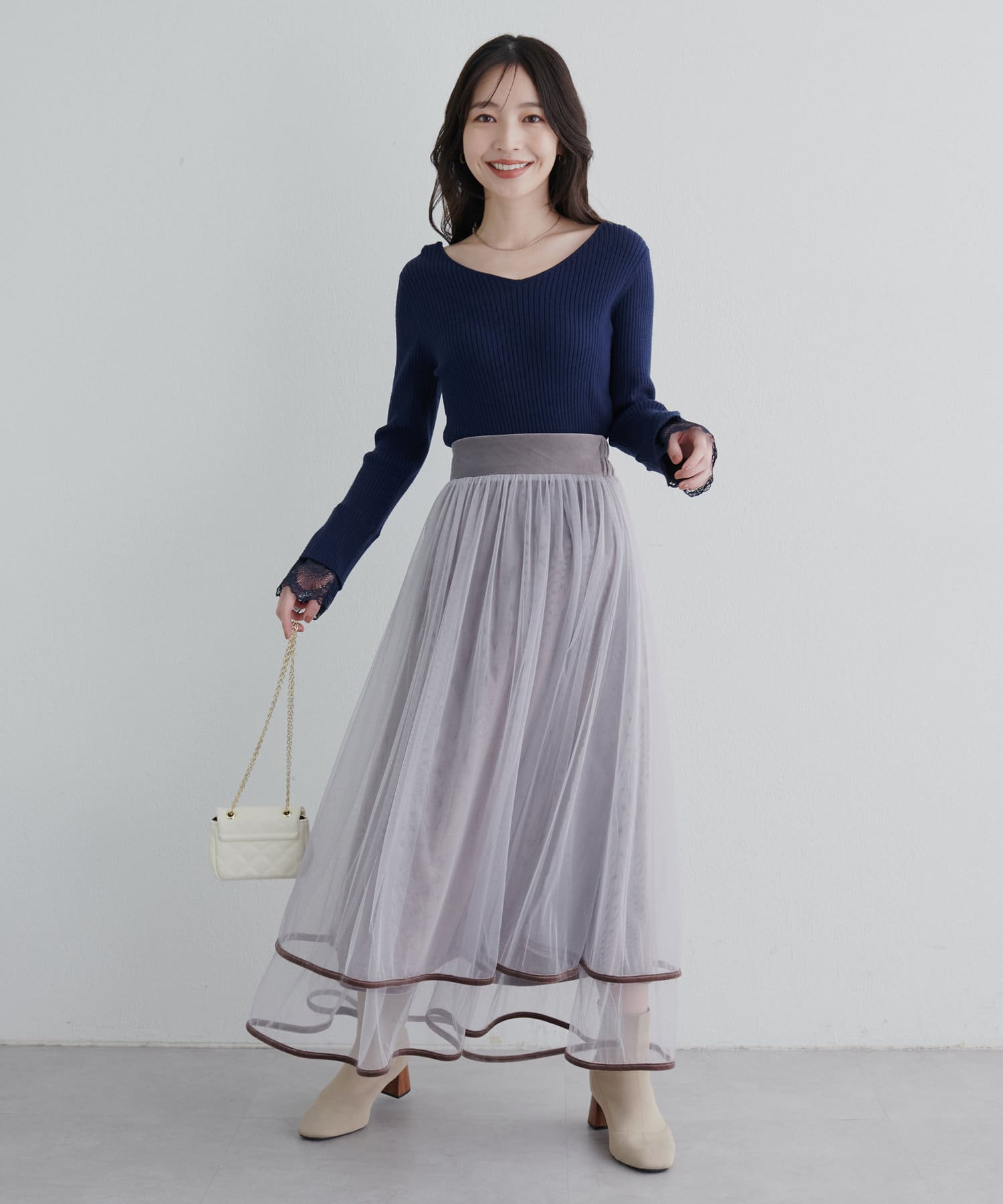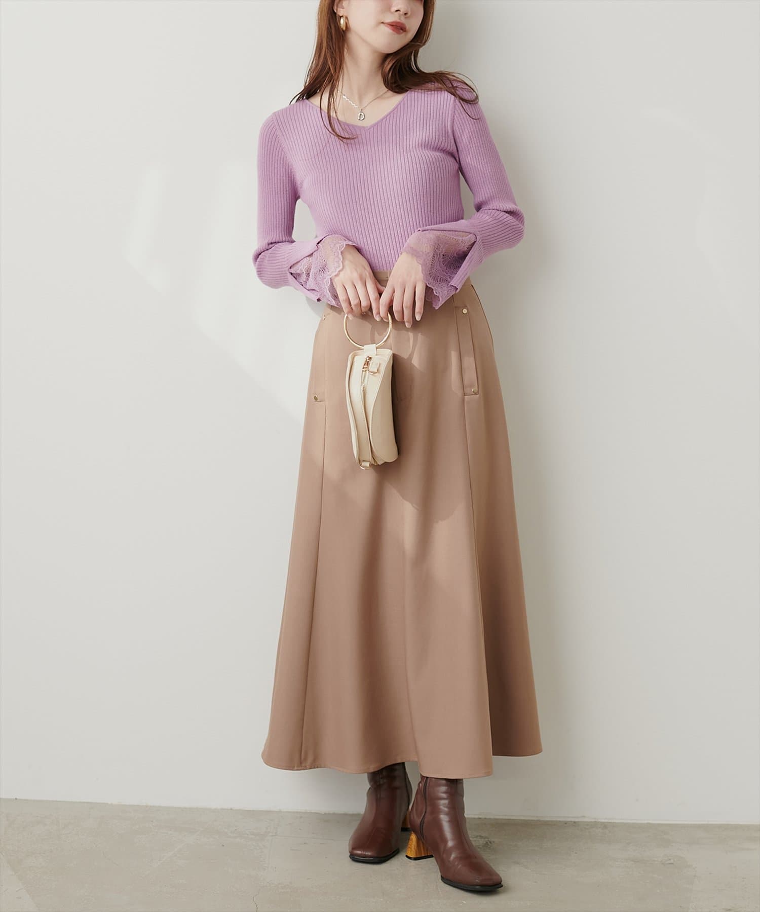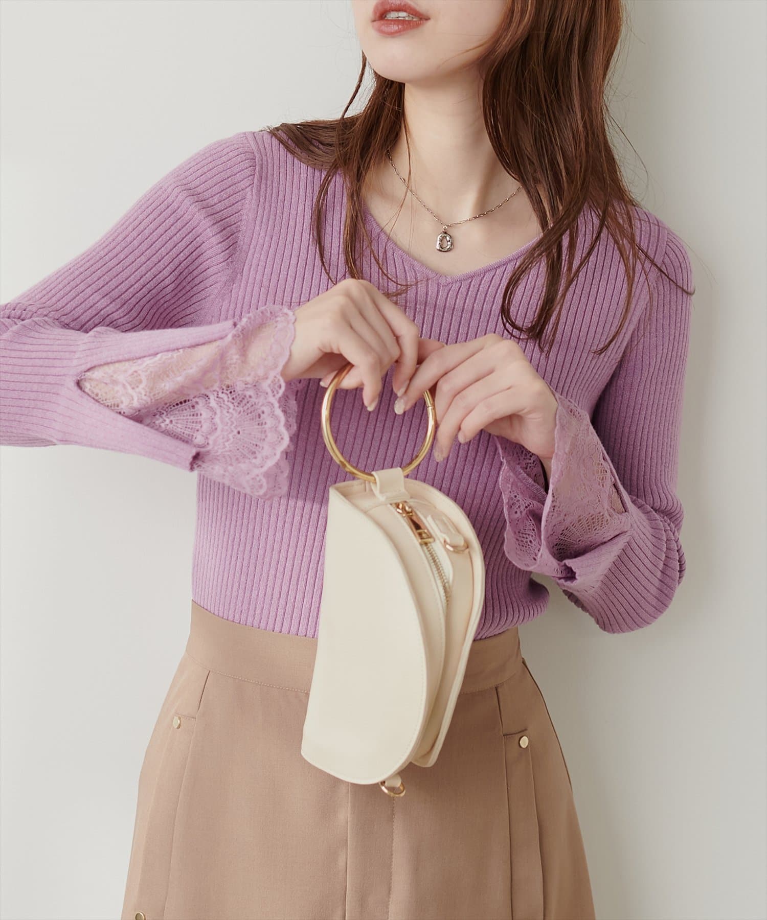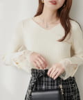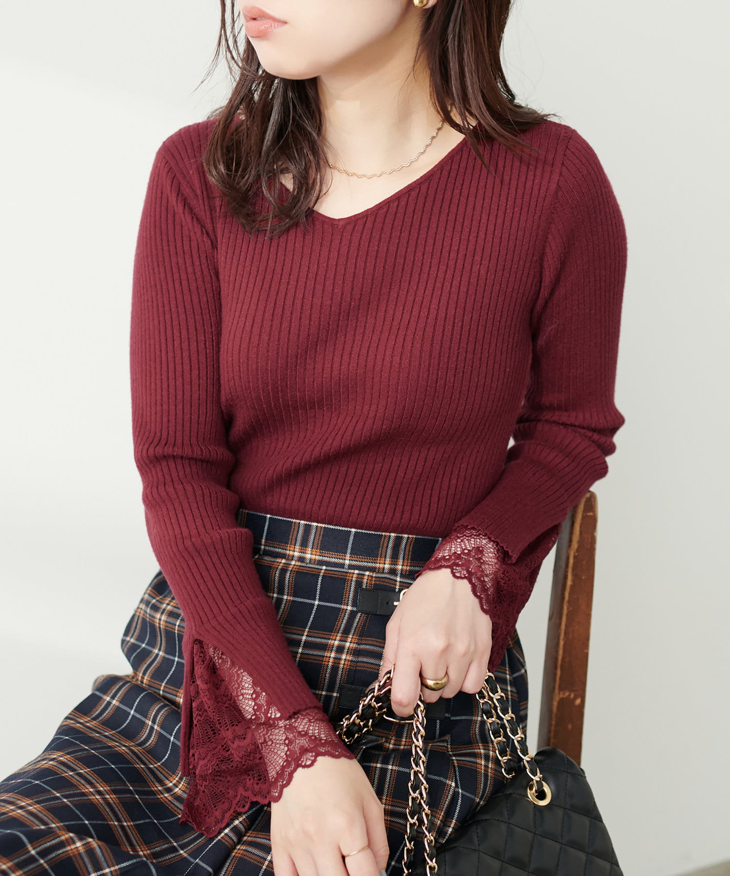 ニットの袖口には大きく切り込みをいれ、内側のレースでほんのり甘さもプラス。