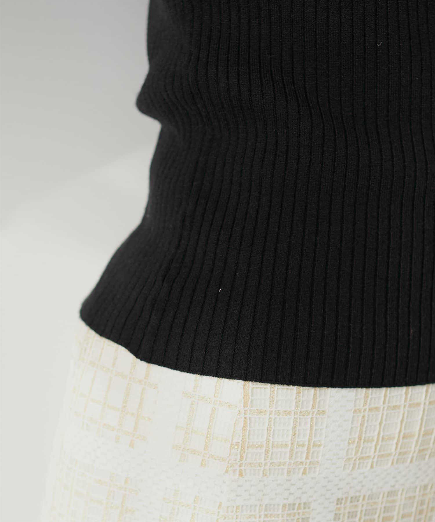 12Gで編みあげたリブニットはウエストインをして着用したときも