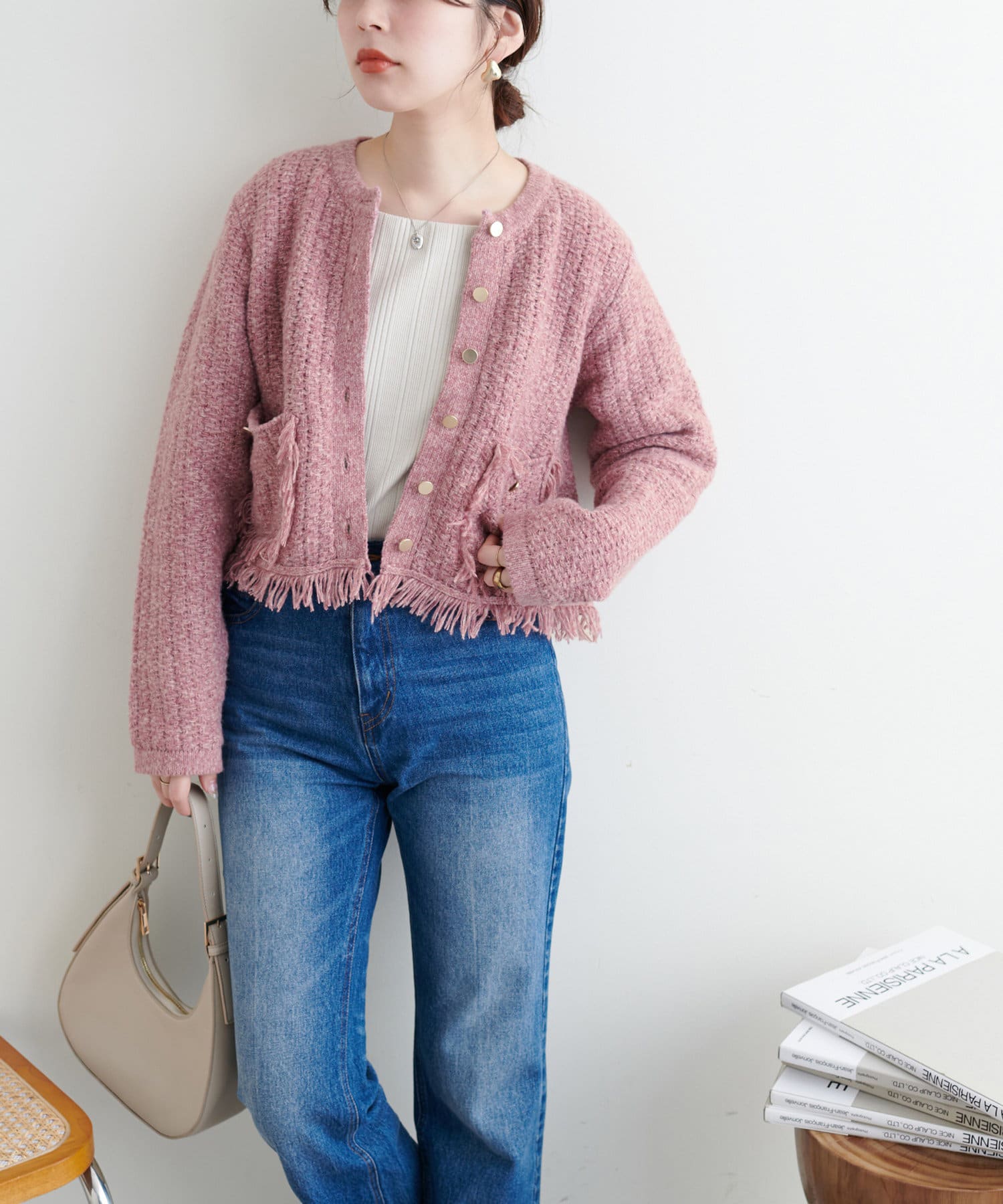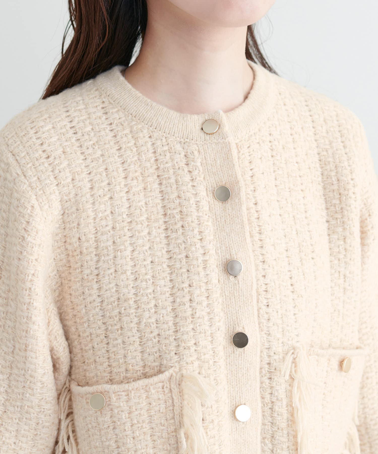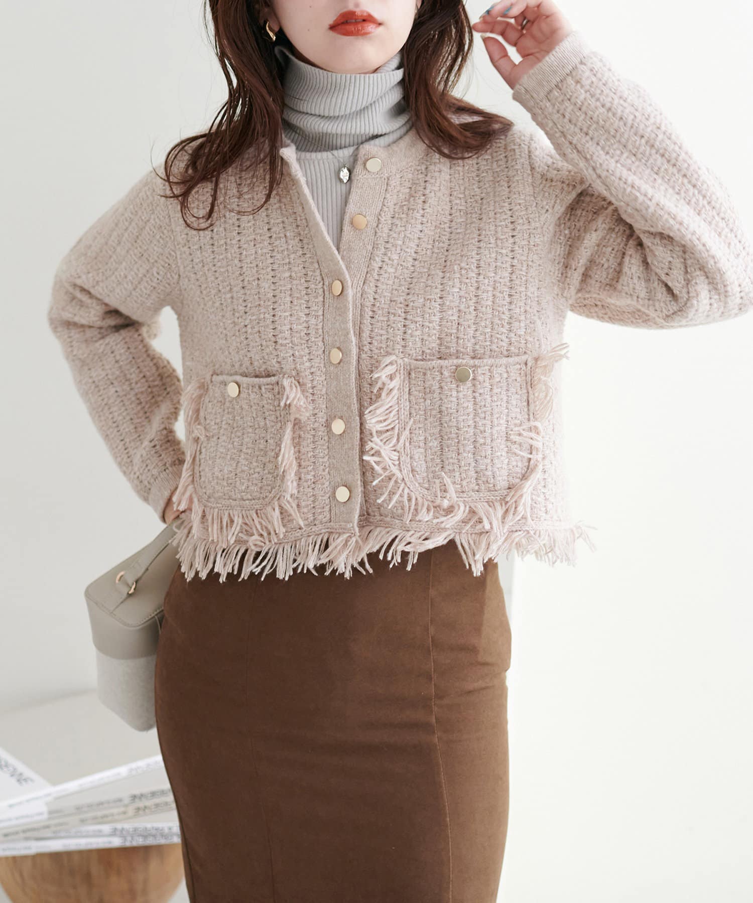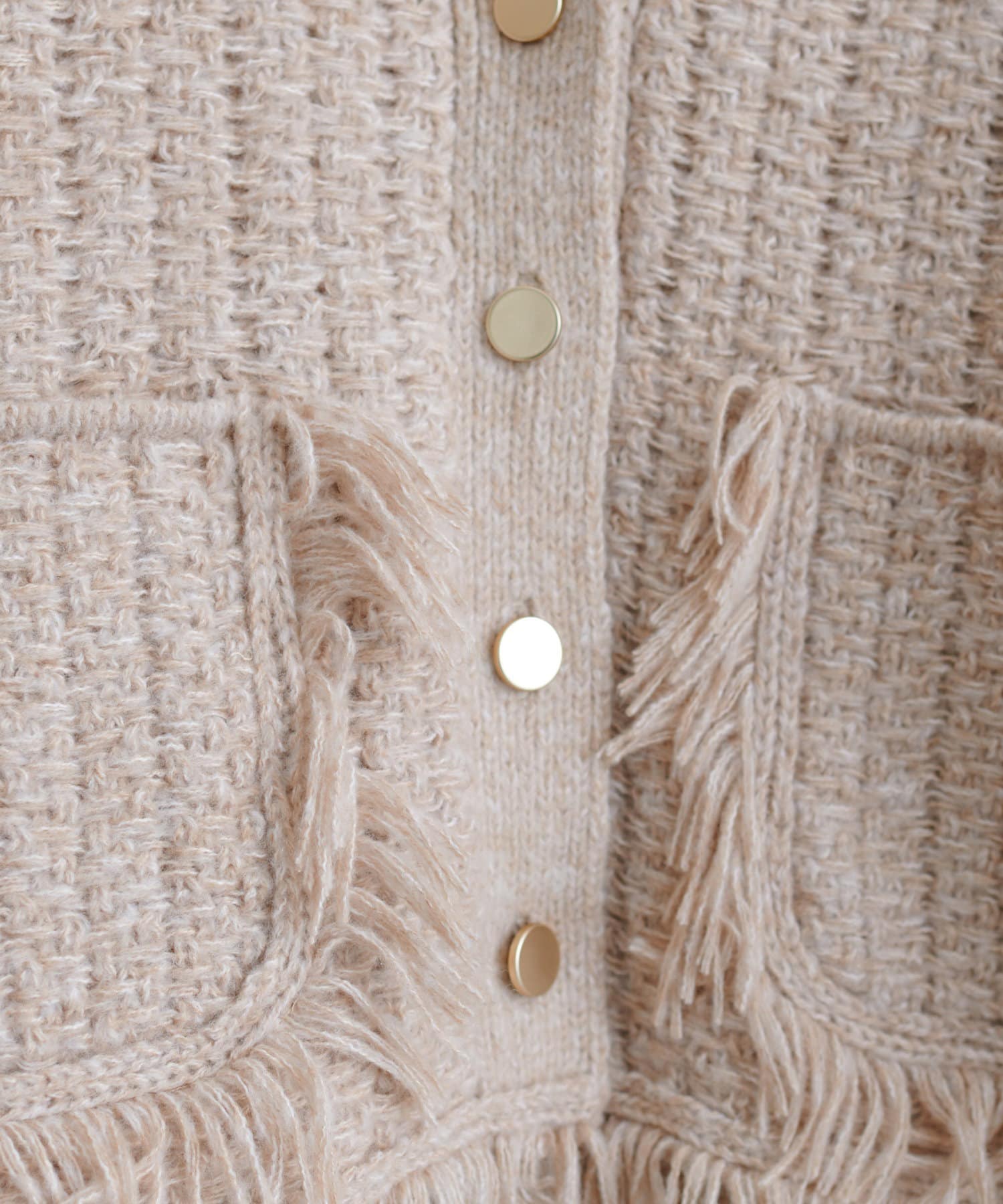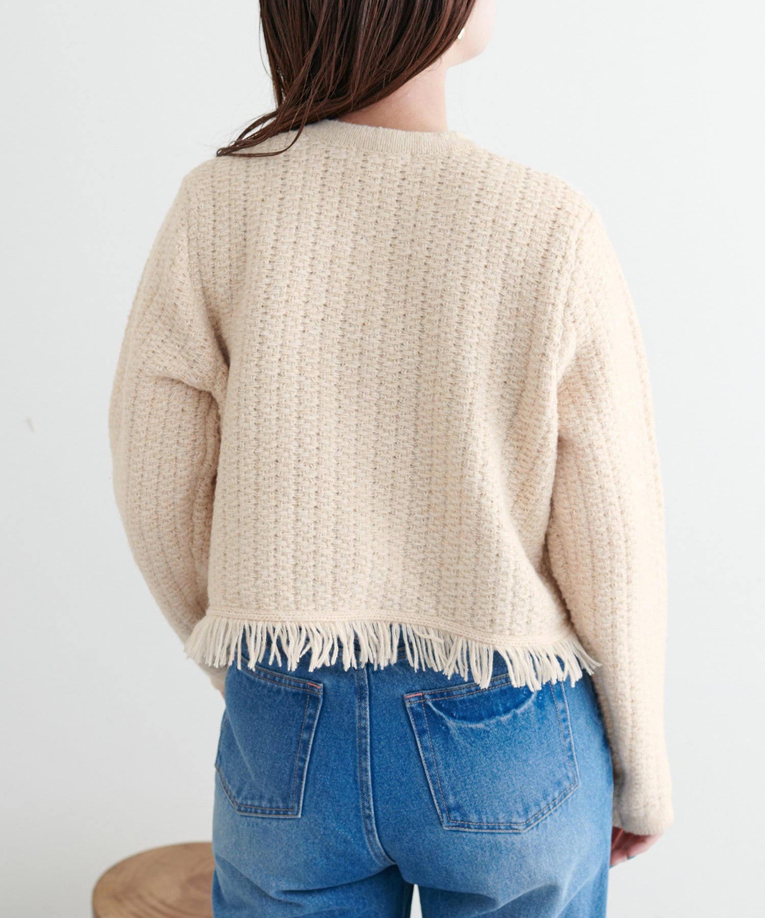贅沢なフリンジとぎゅっとつまった編地が可愛いカーディガン。