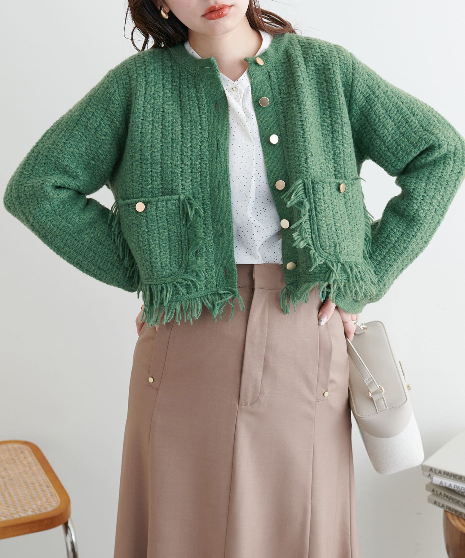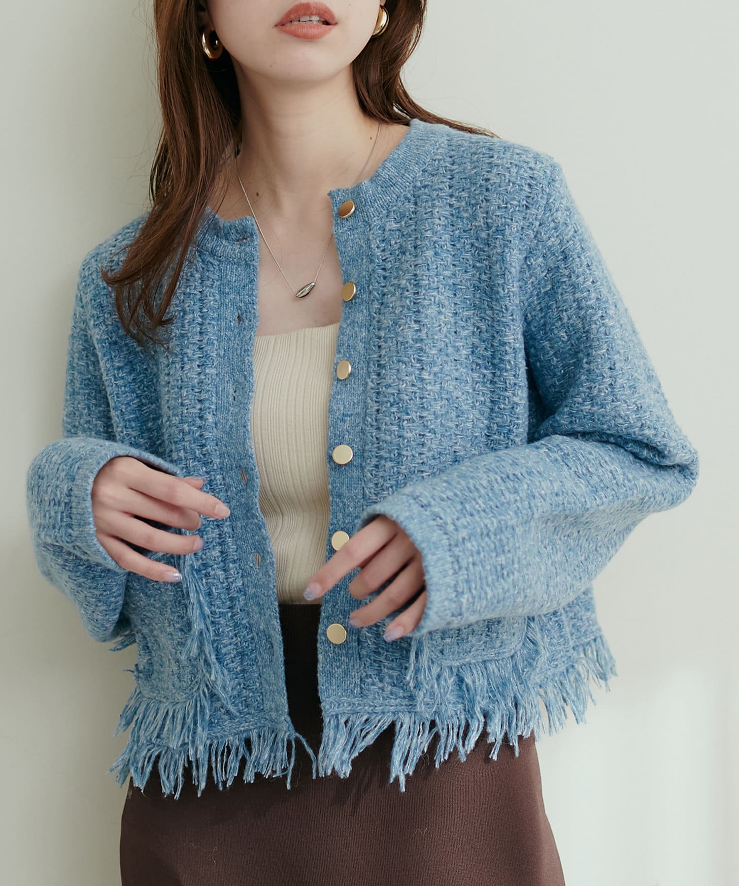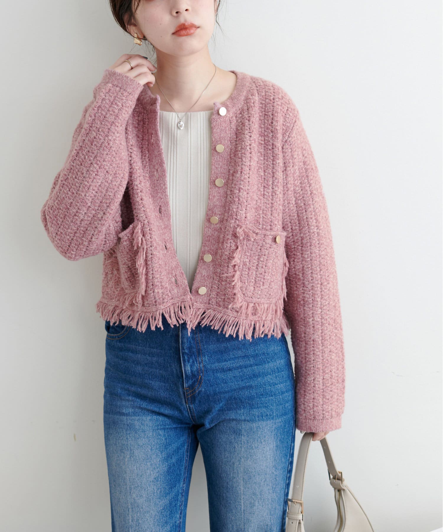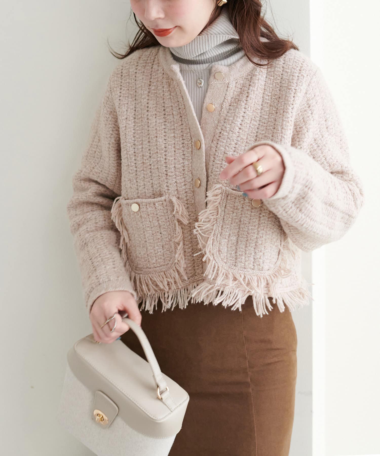 贅沢なフリンジとぎゅっとつまった編地が可愛いカーディガン。