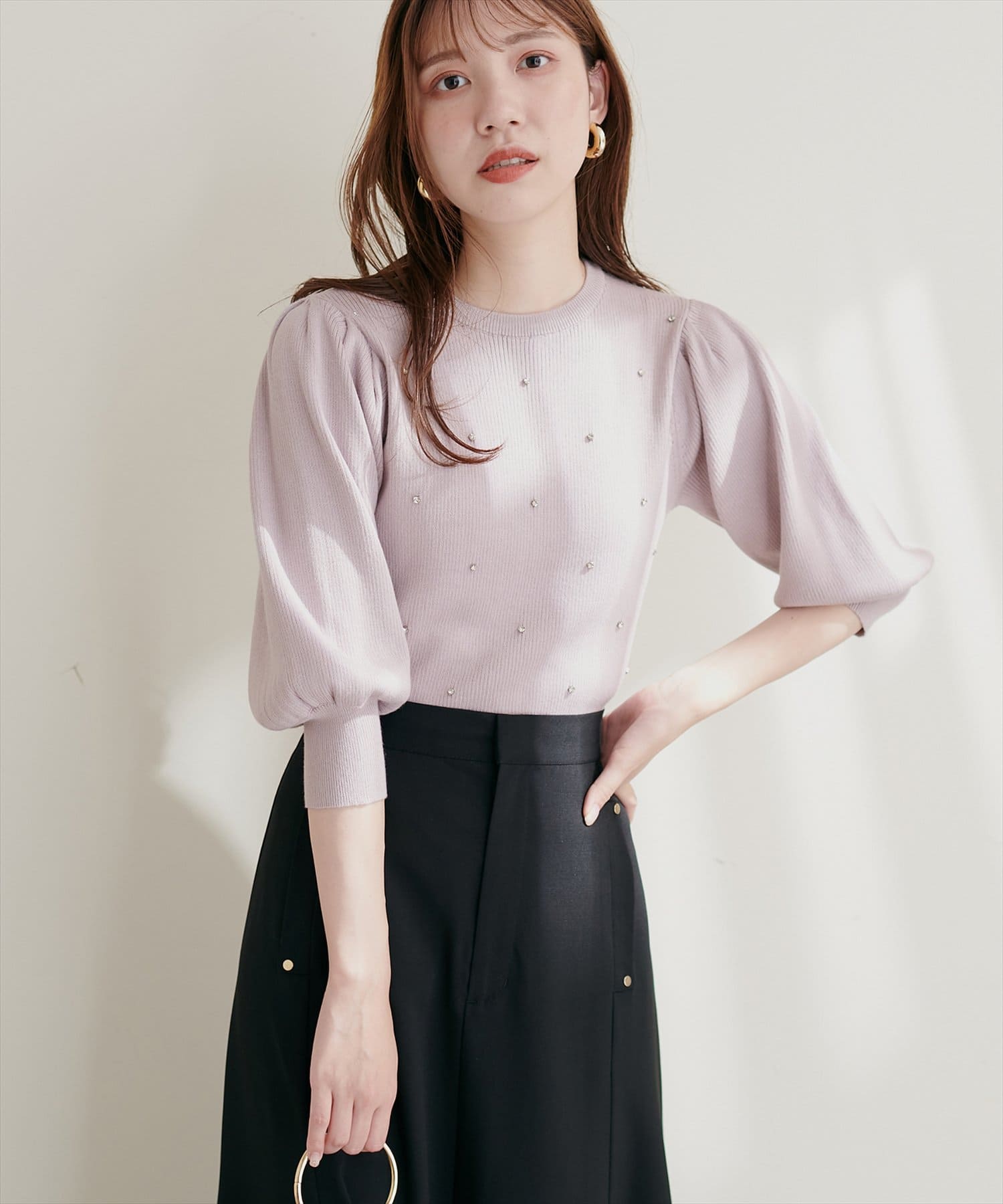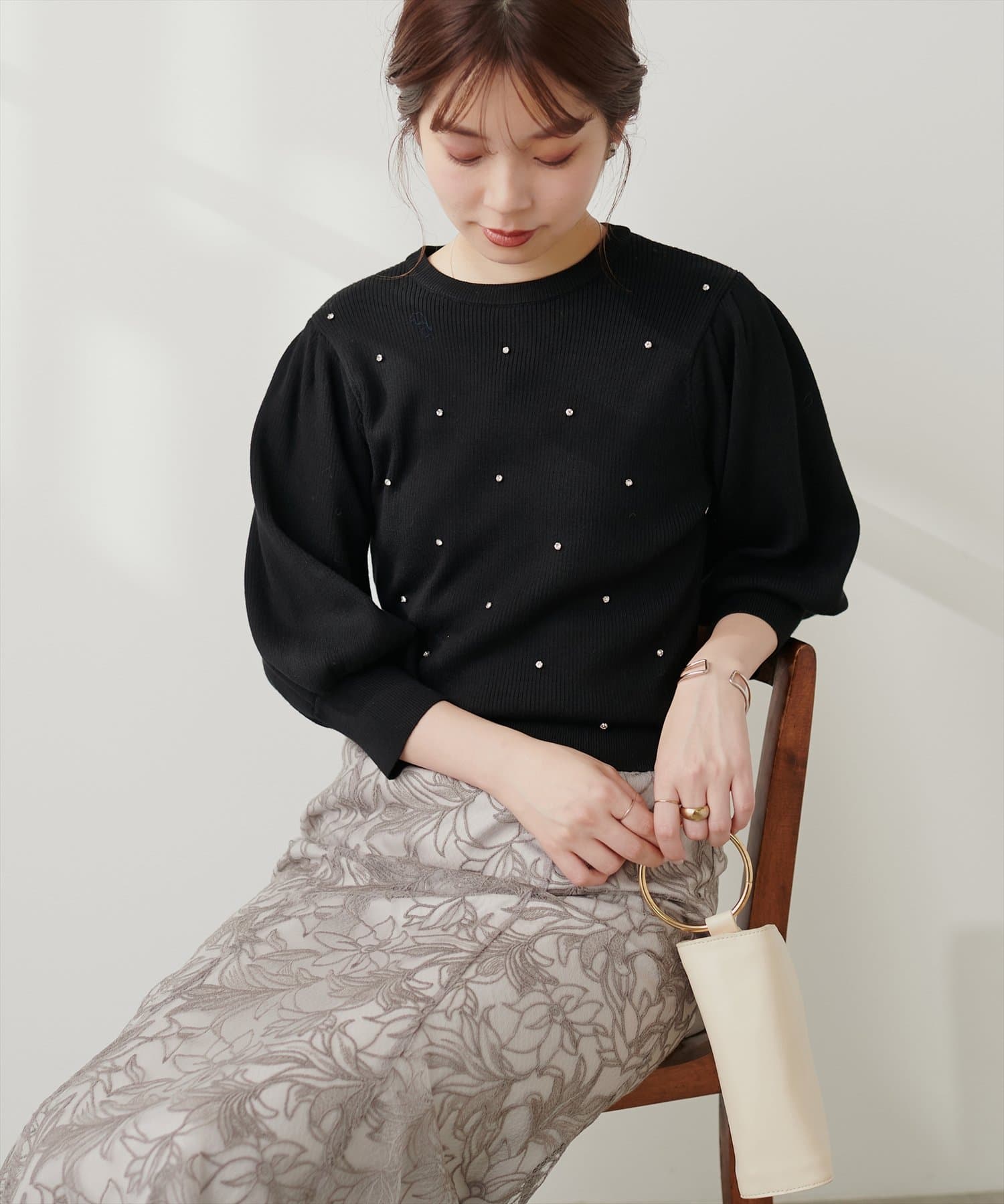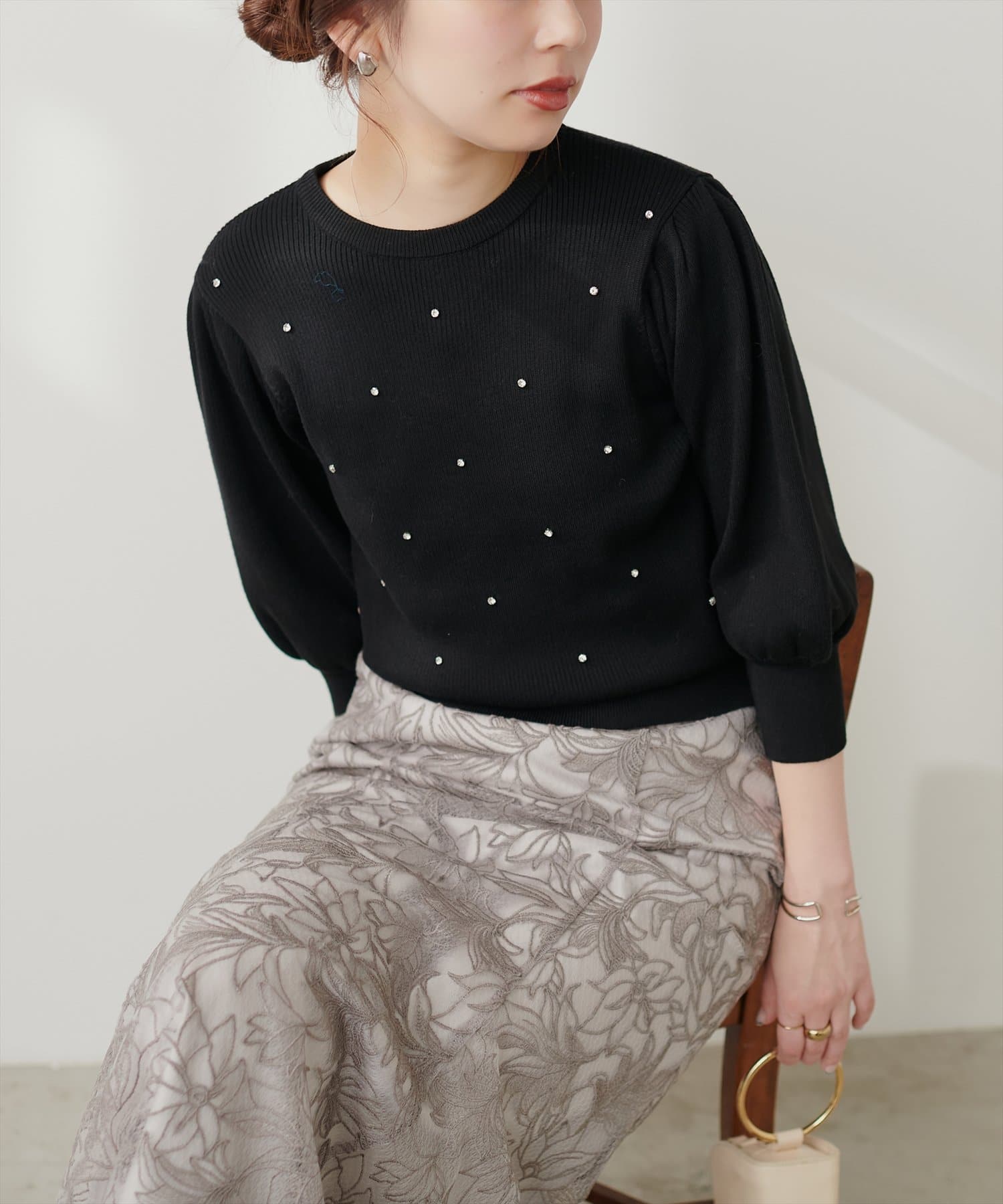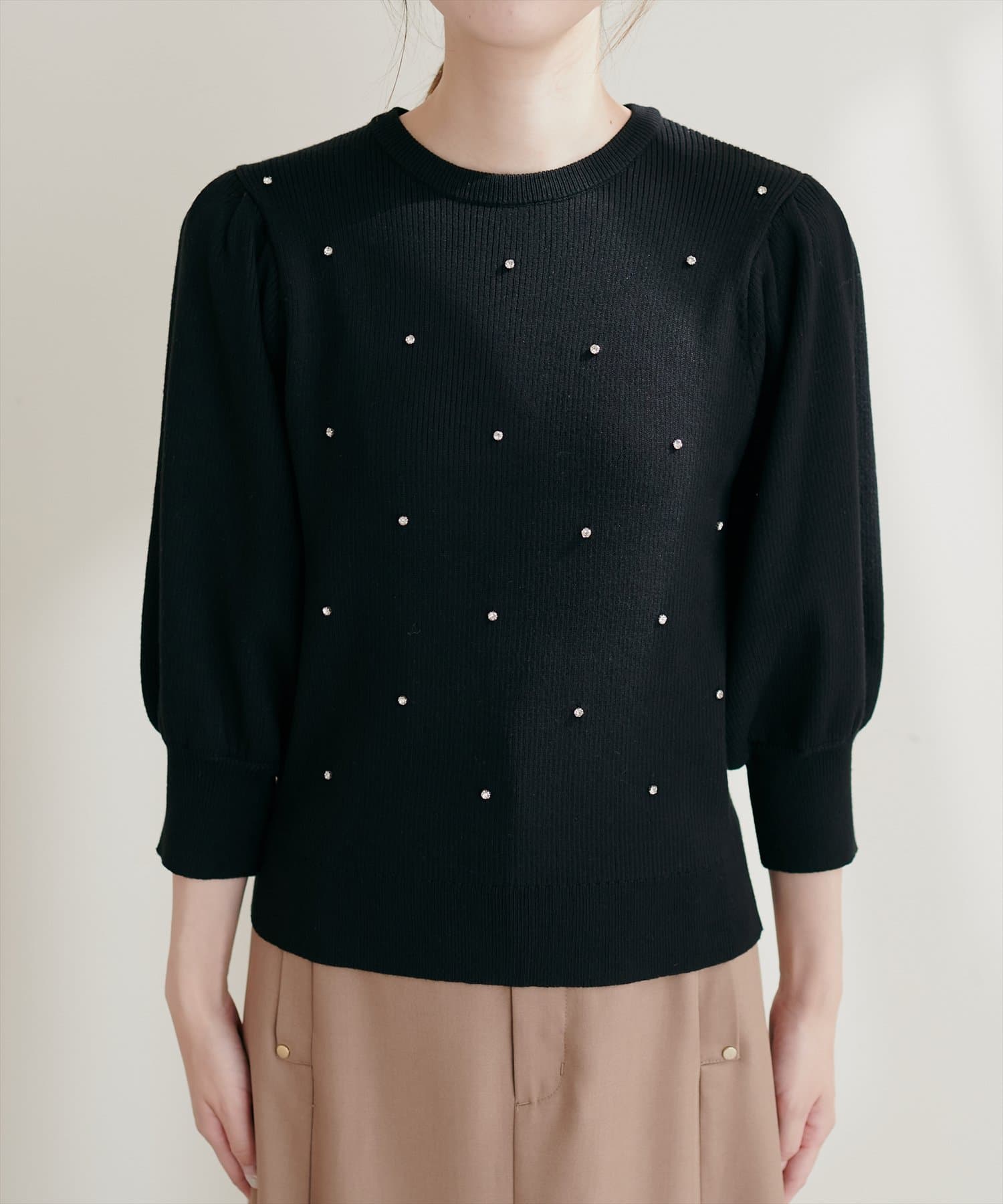 繊細なビジューが散りばめられた、秋に映える7分袖ニット。