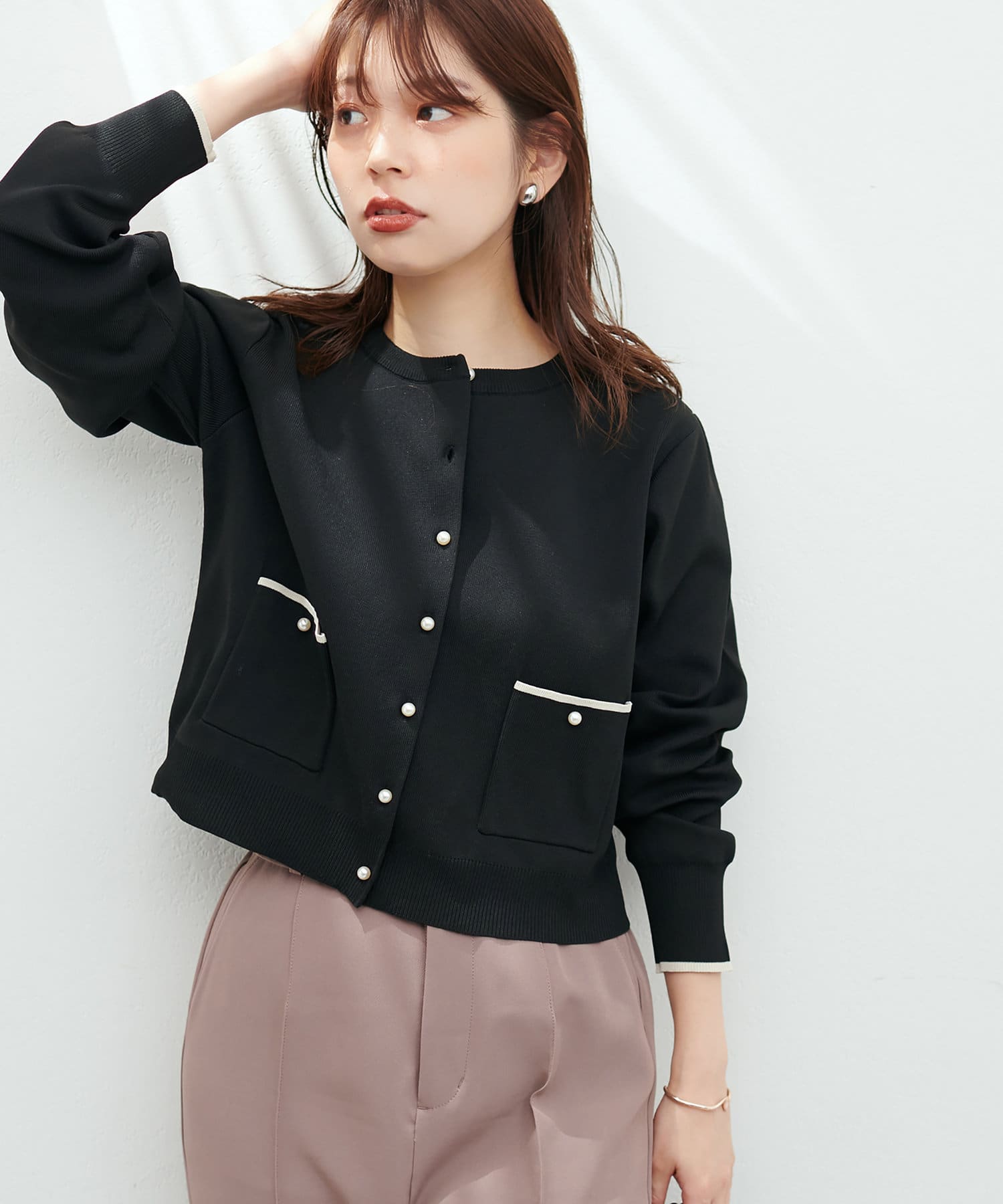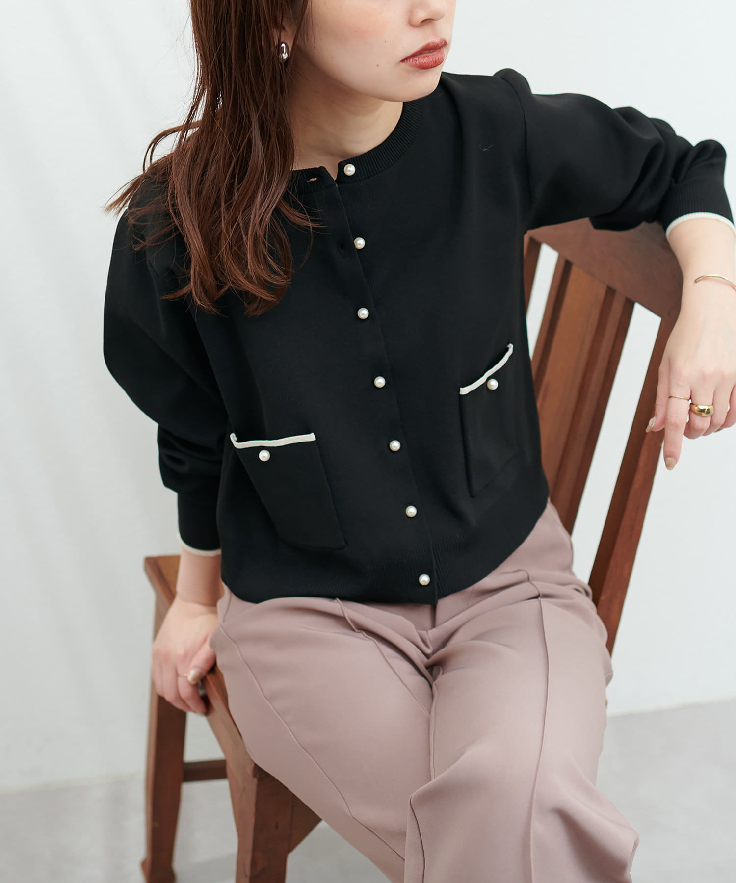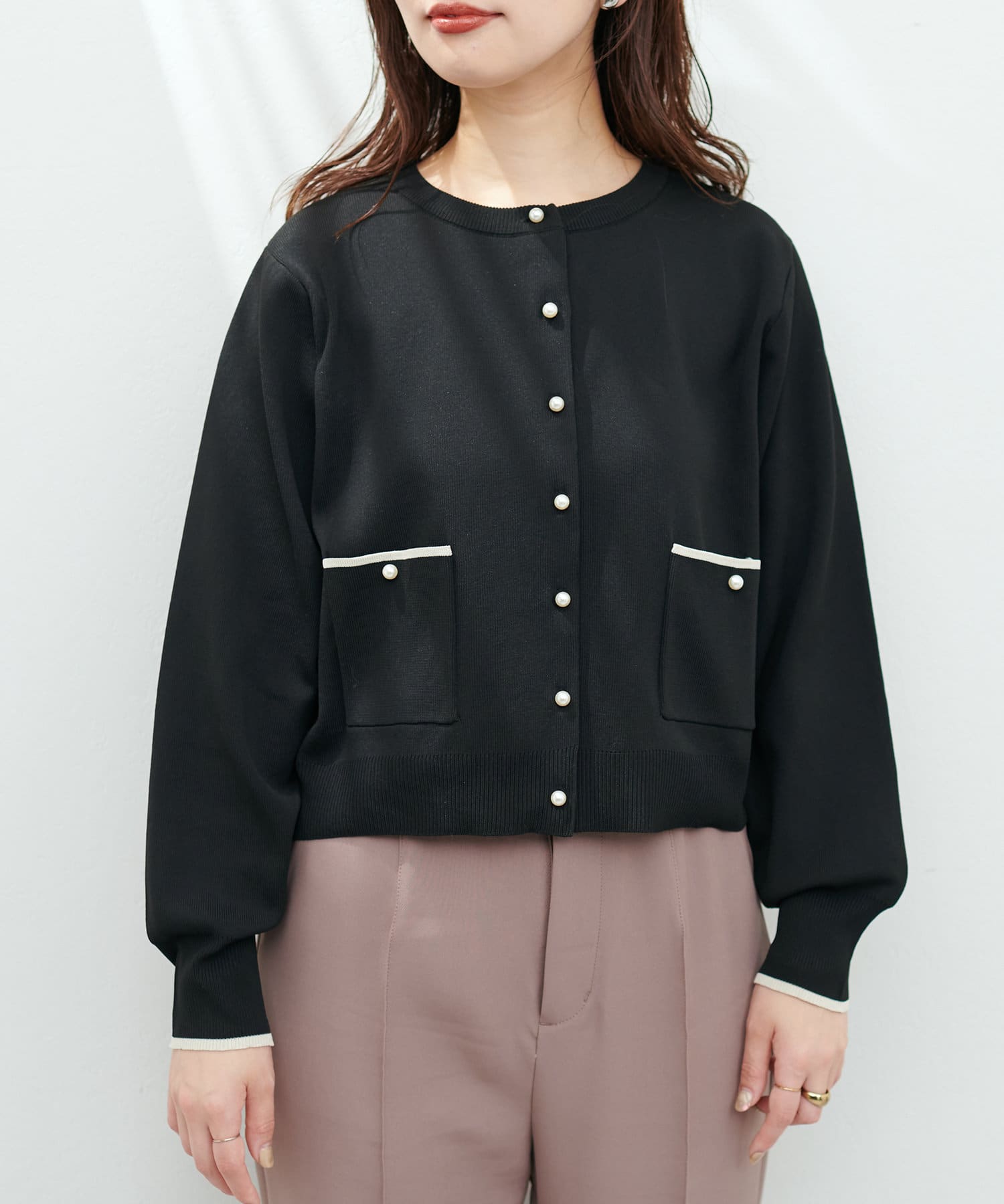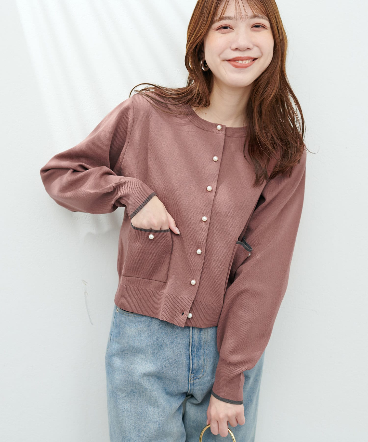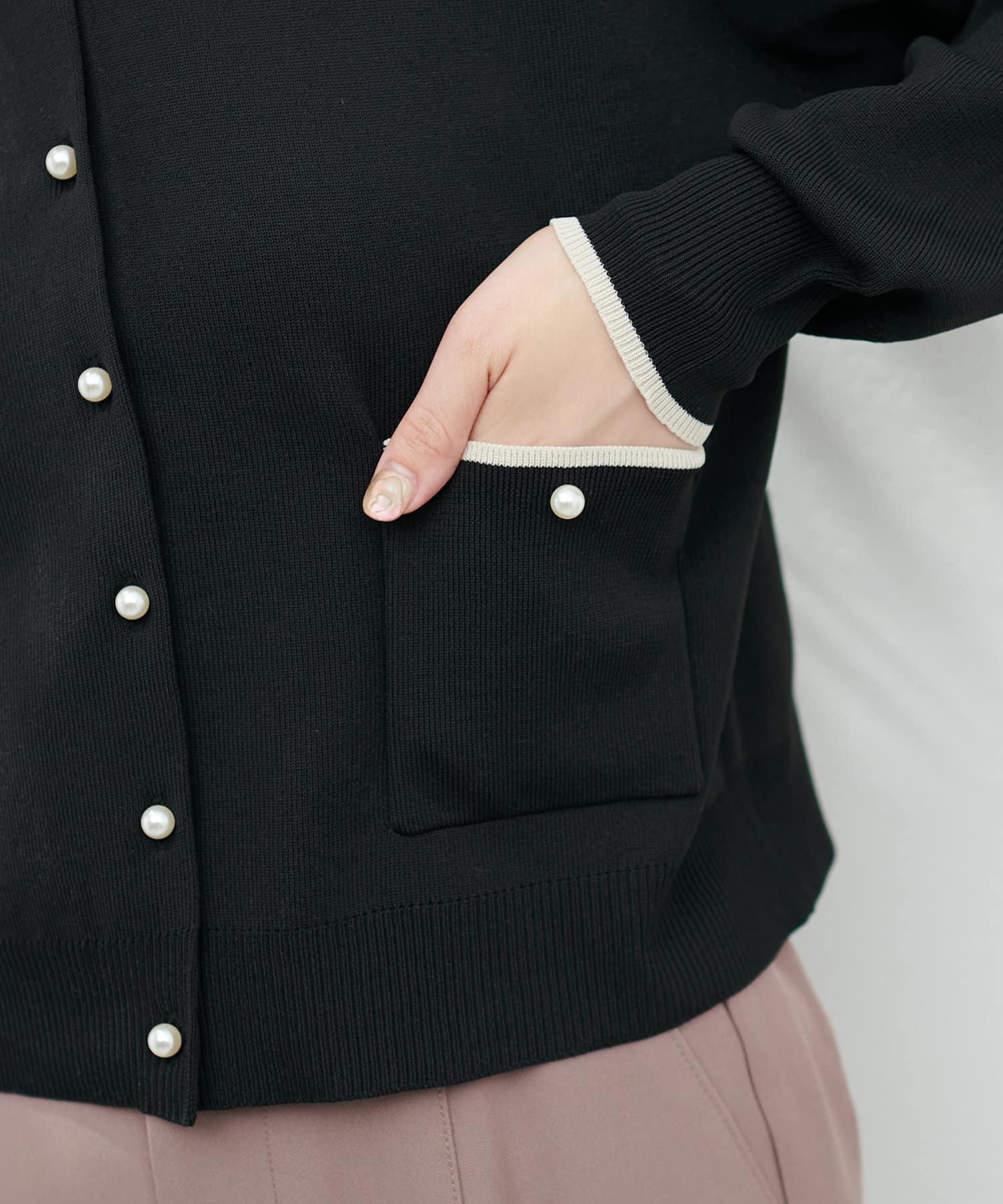 袖口とポケットの配色やパール釦がさりげないポイントで目を惹くカーディガン。