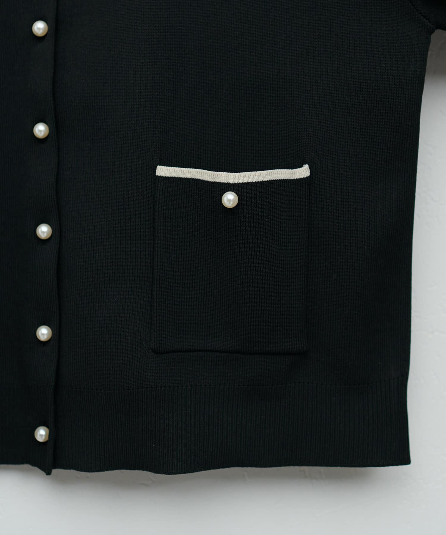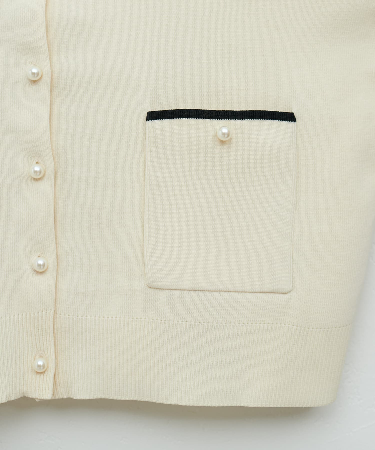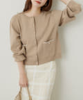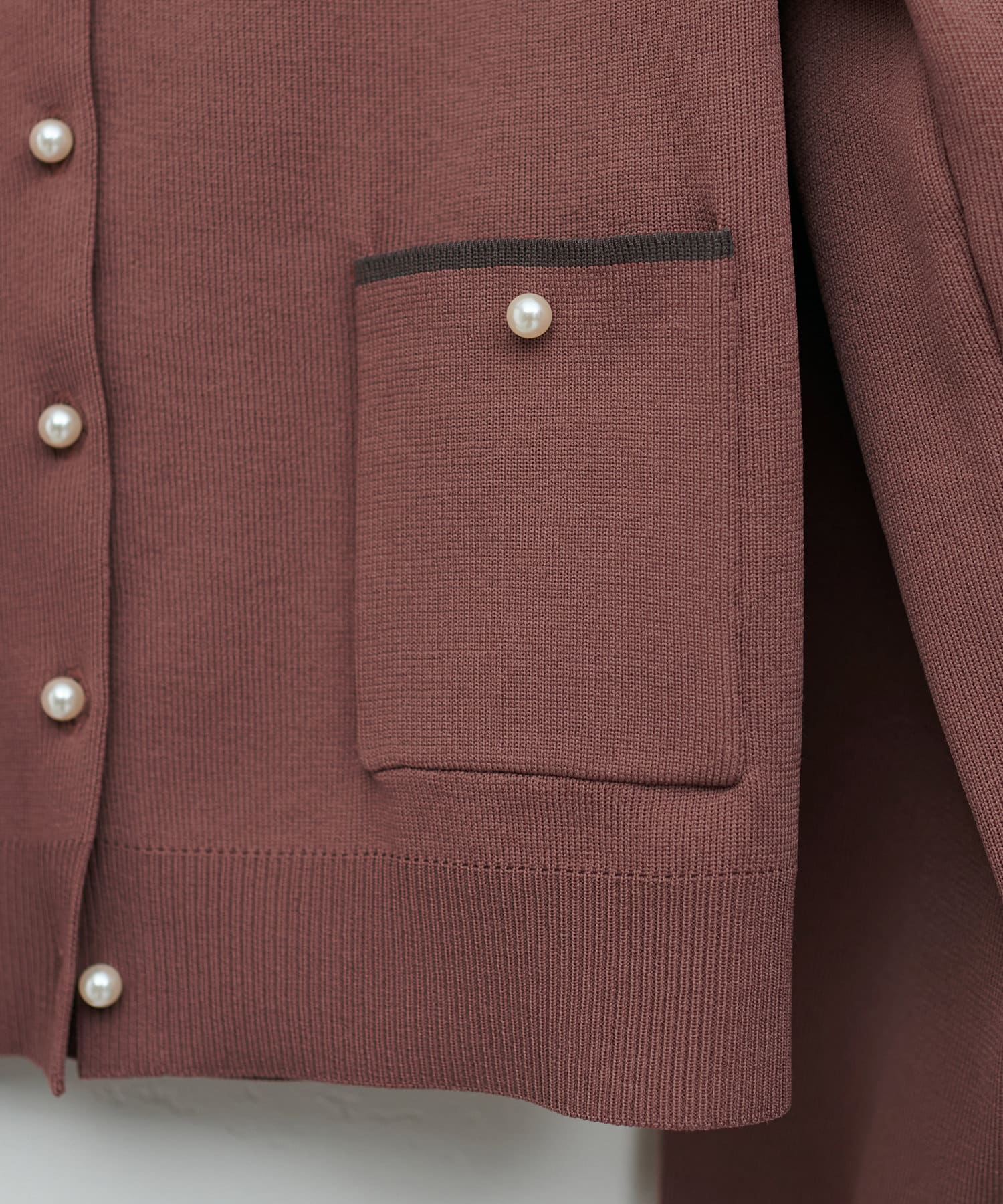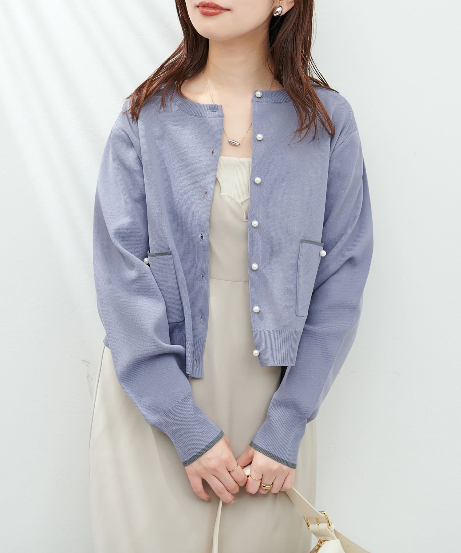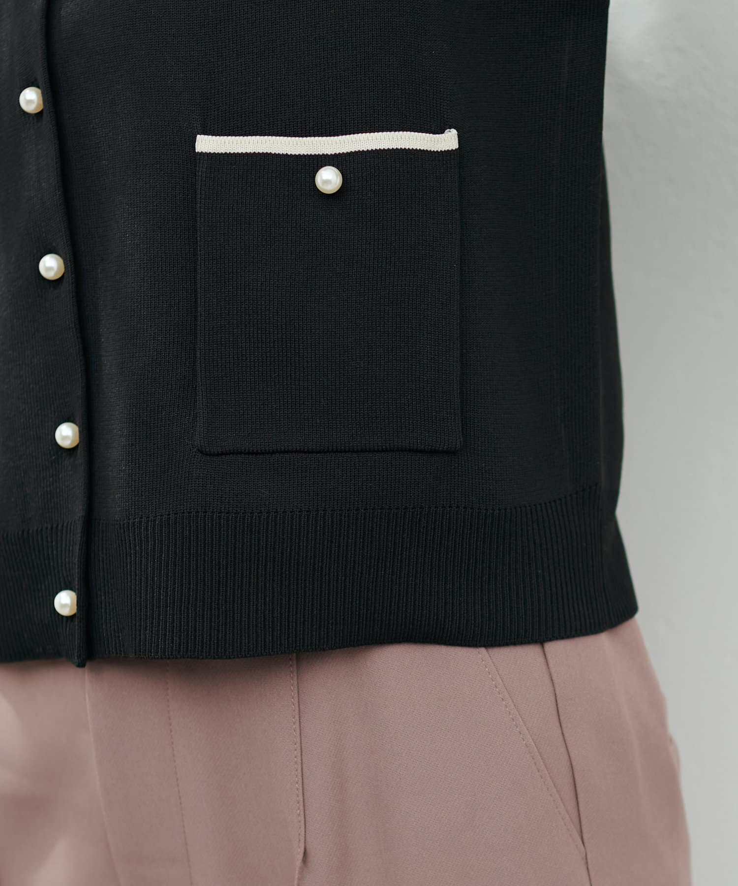 袖口とポケットの配色やパール釦がさりげないポイントで目を惹くカーディガン。