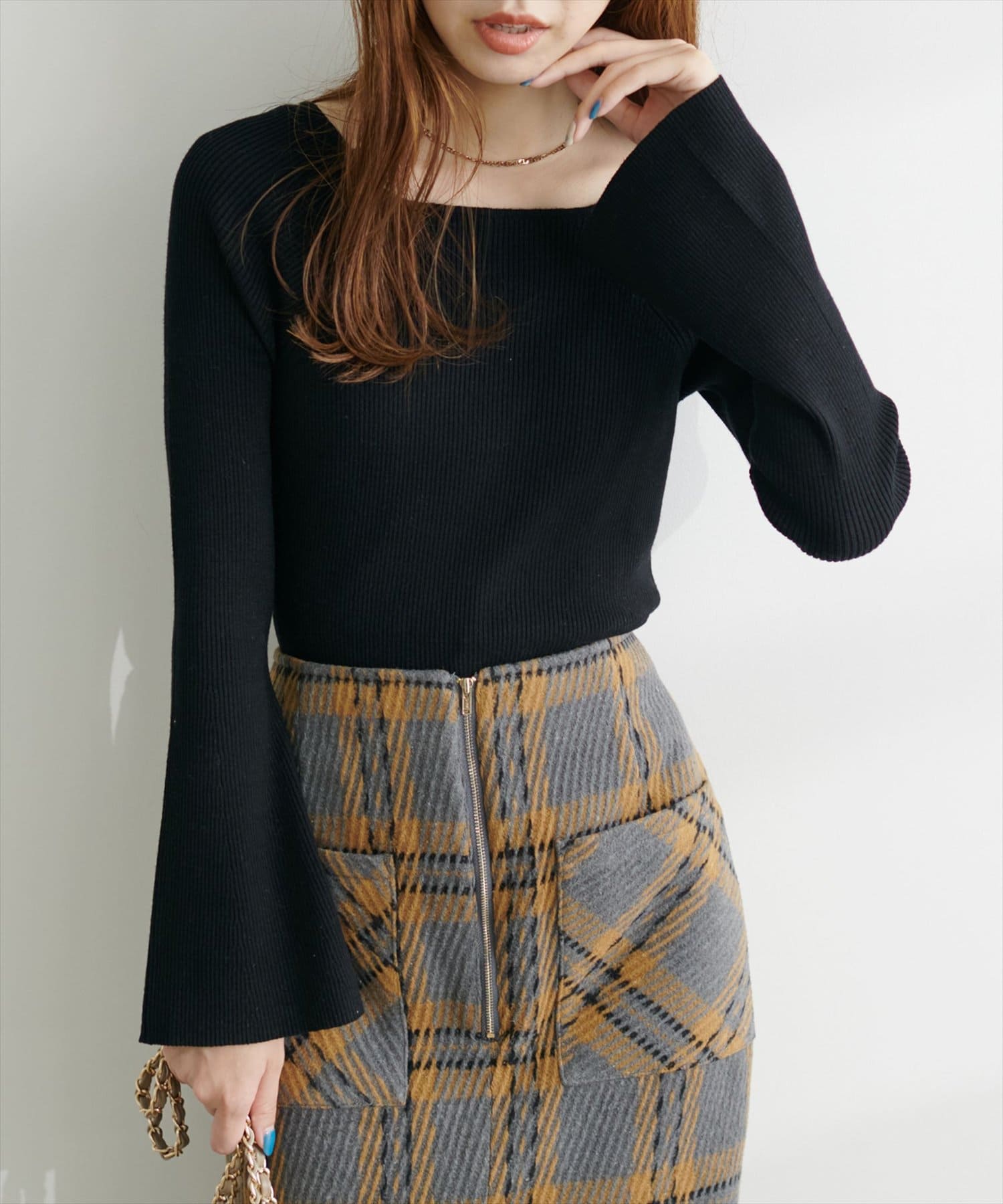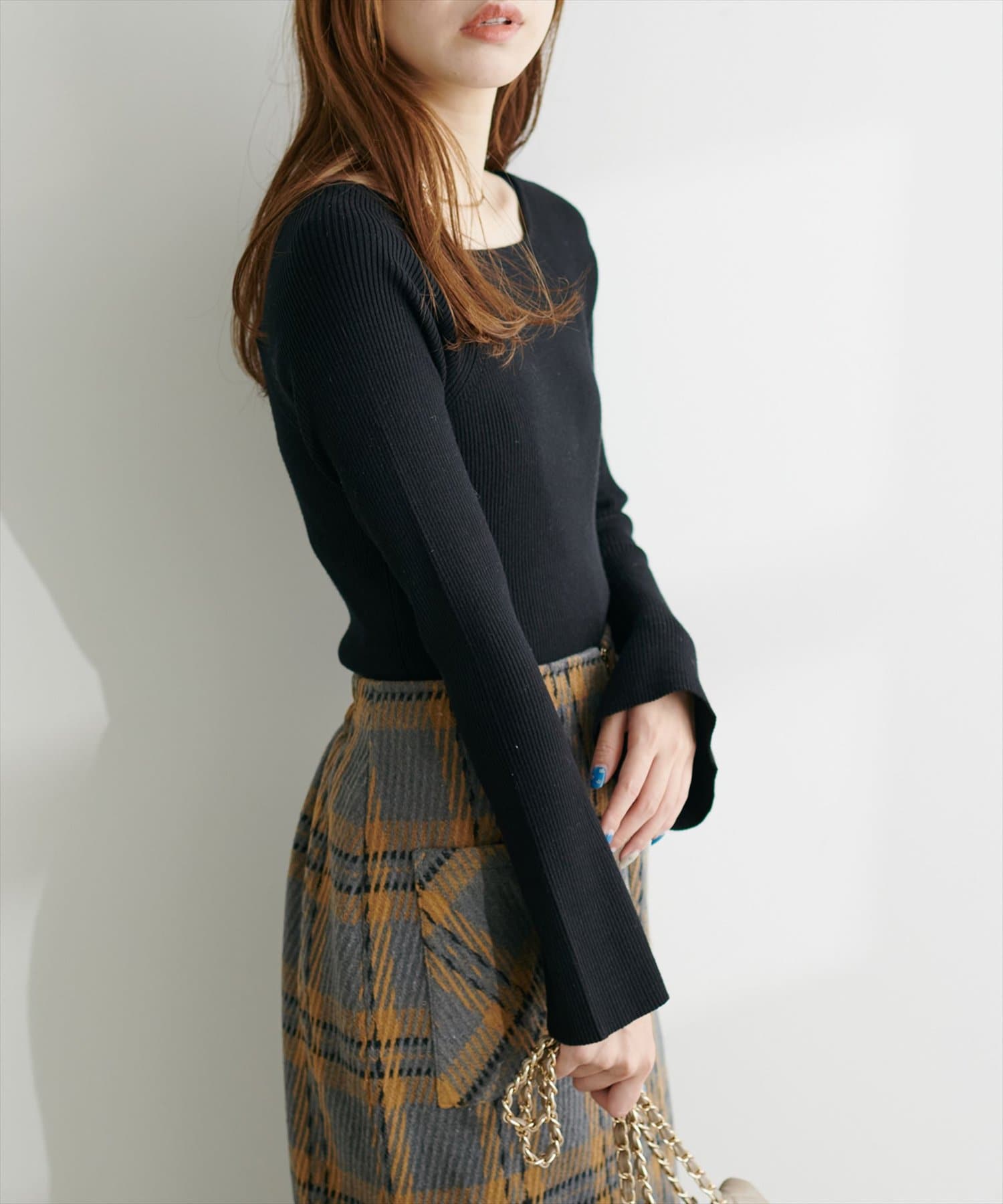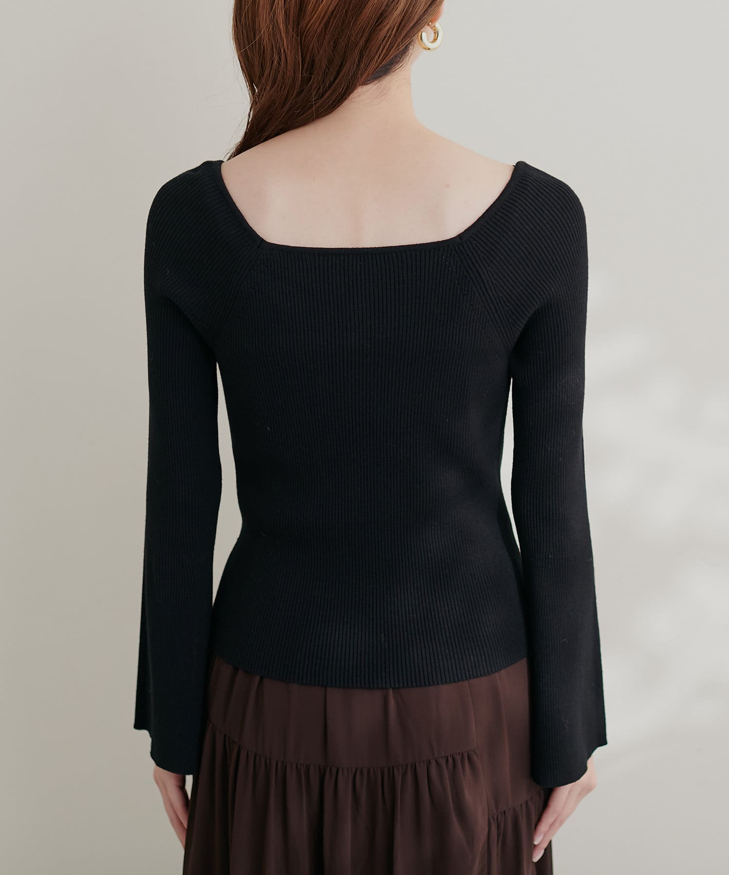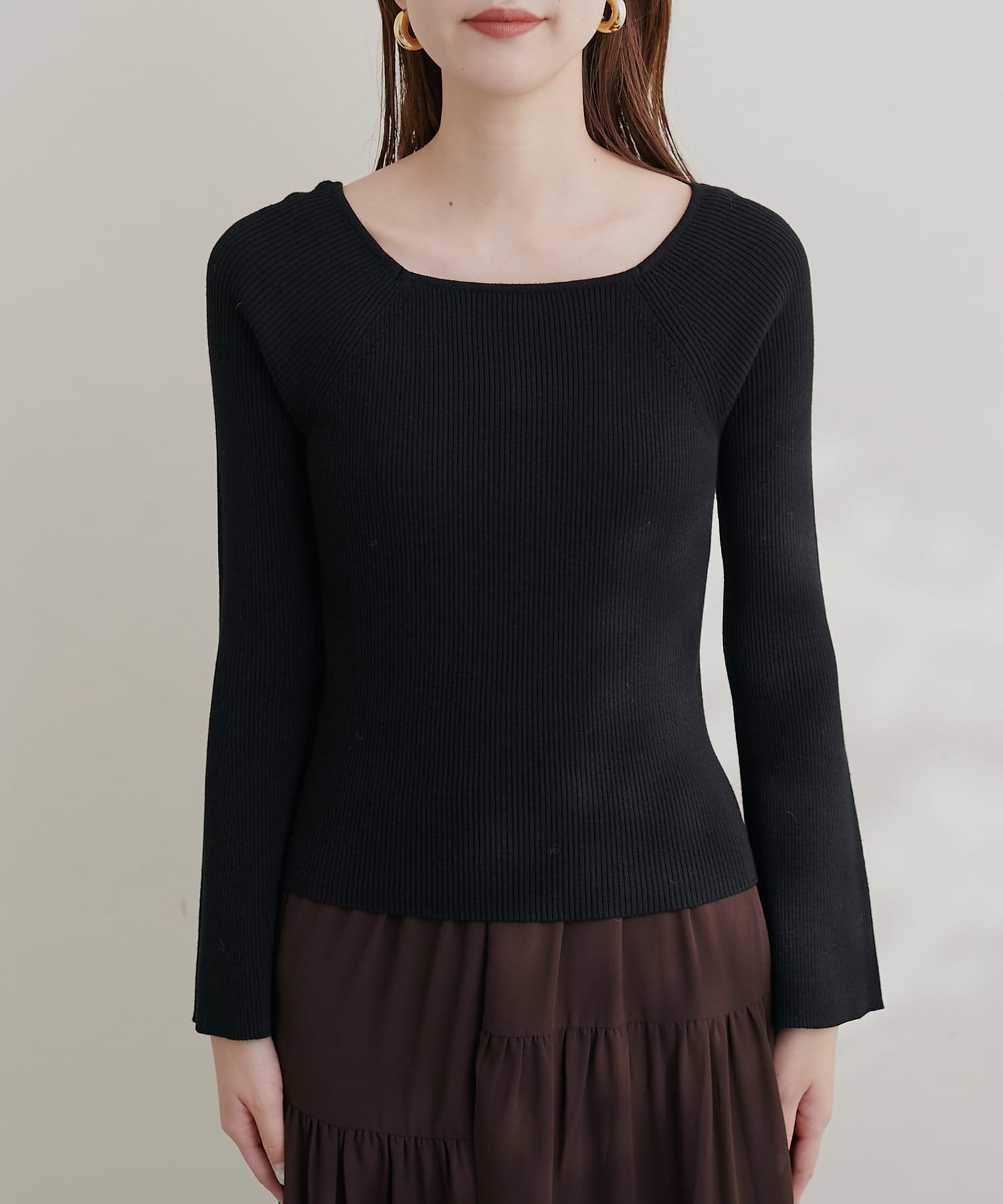 シンプルなスクエアネックのニットですが、袖口にかけてフレアになっているシルエットがポイント。