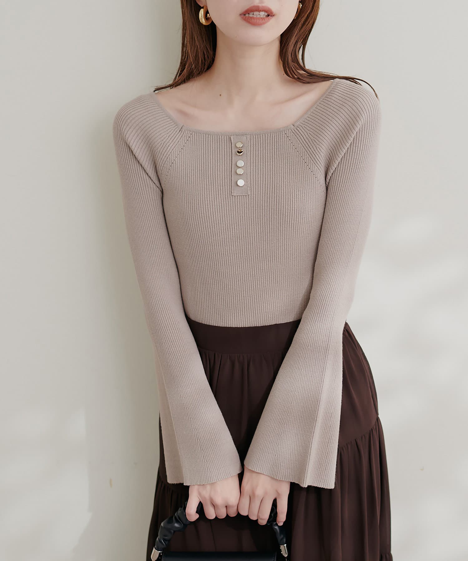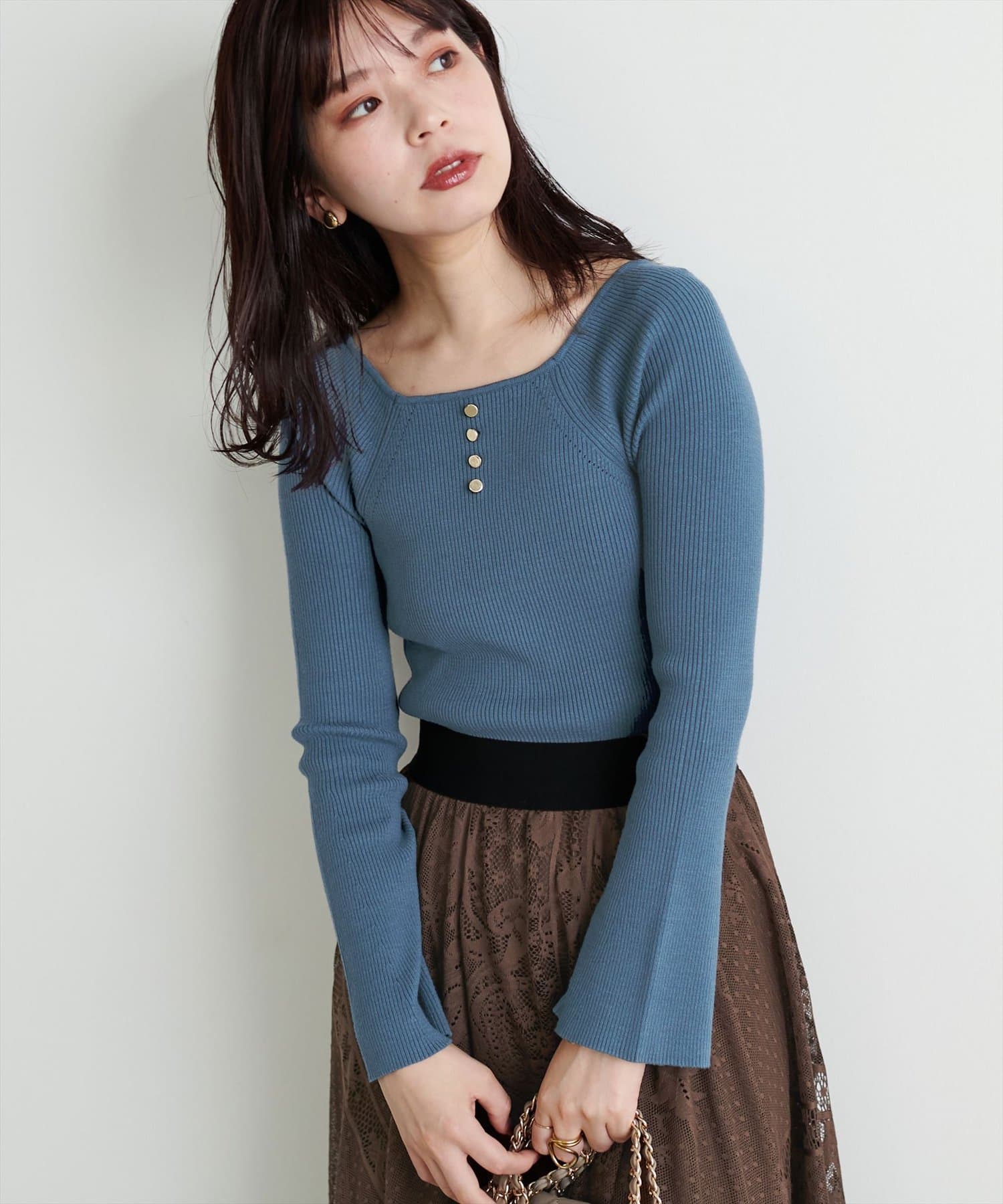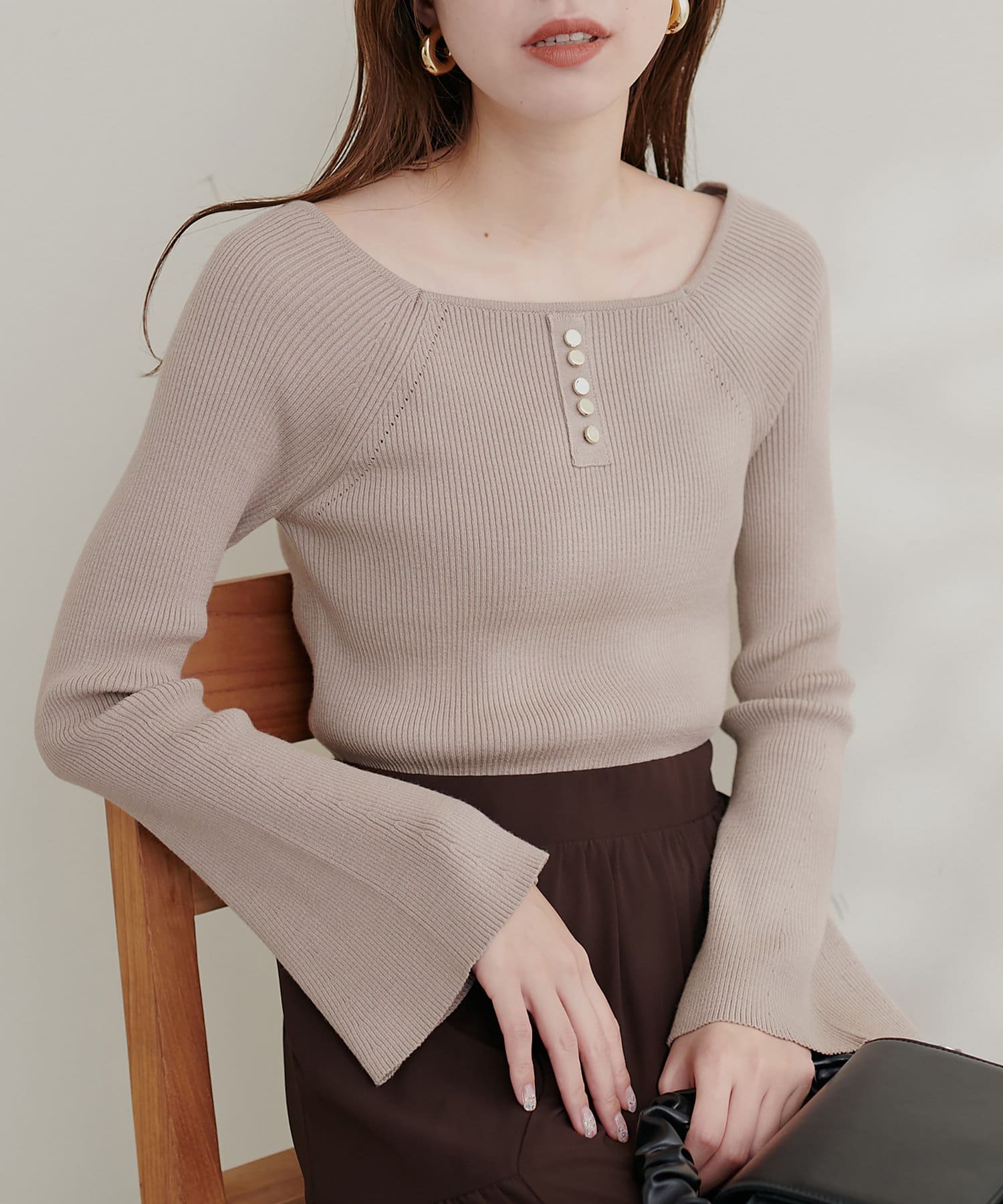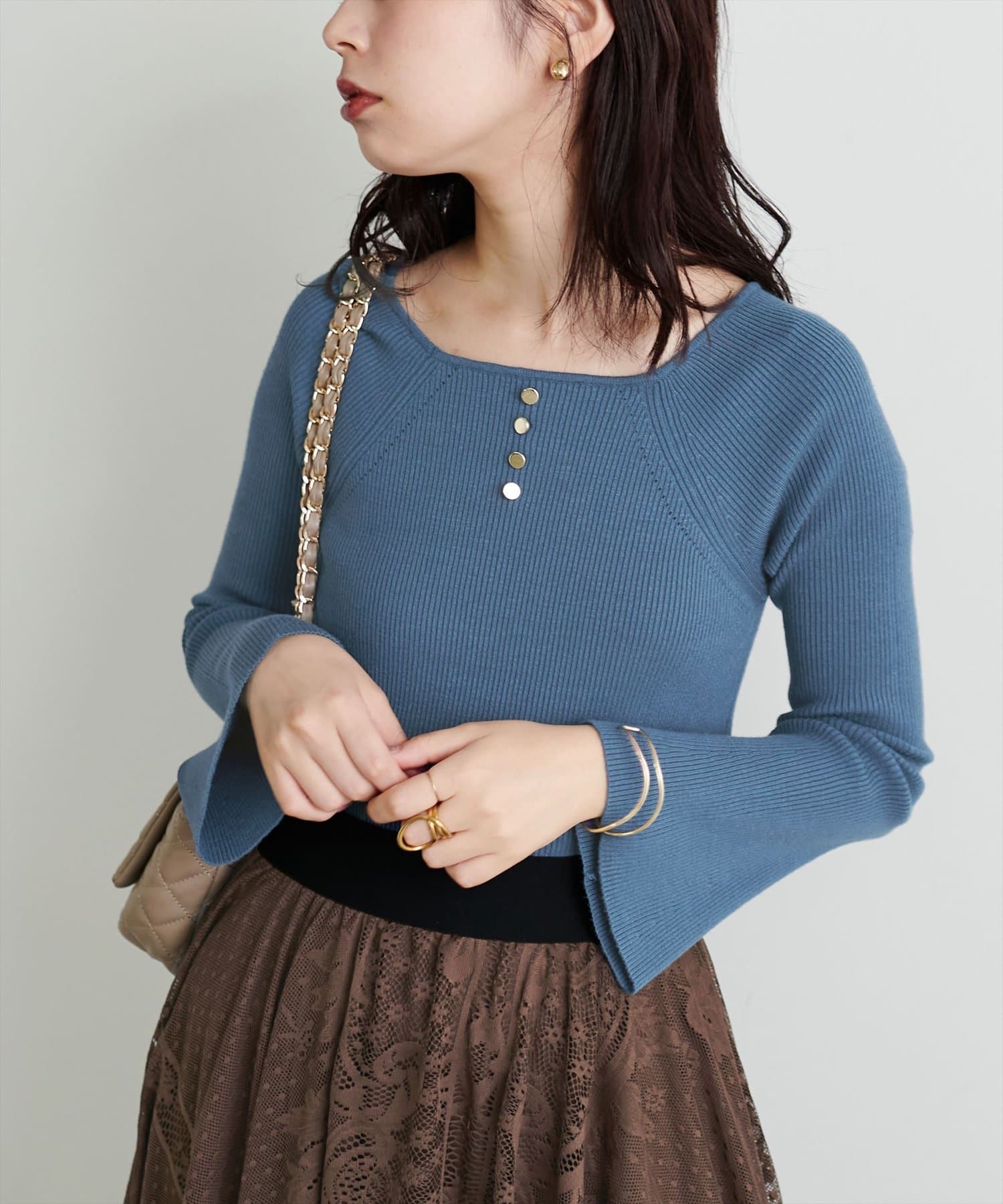 シンプルなスクエアネックのニットですが、袖口にかけてフレアになっているシルエットがポイント。