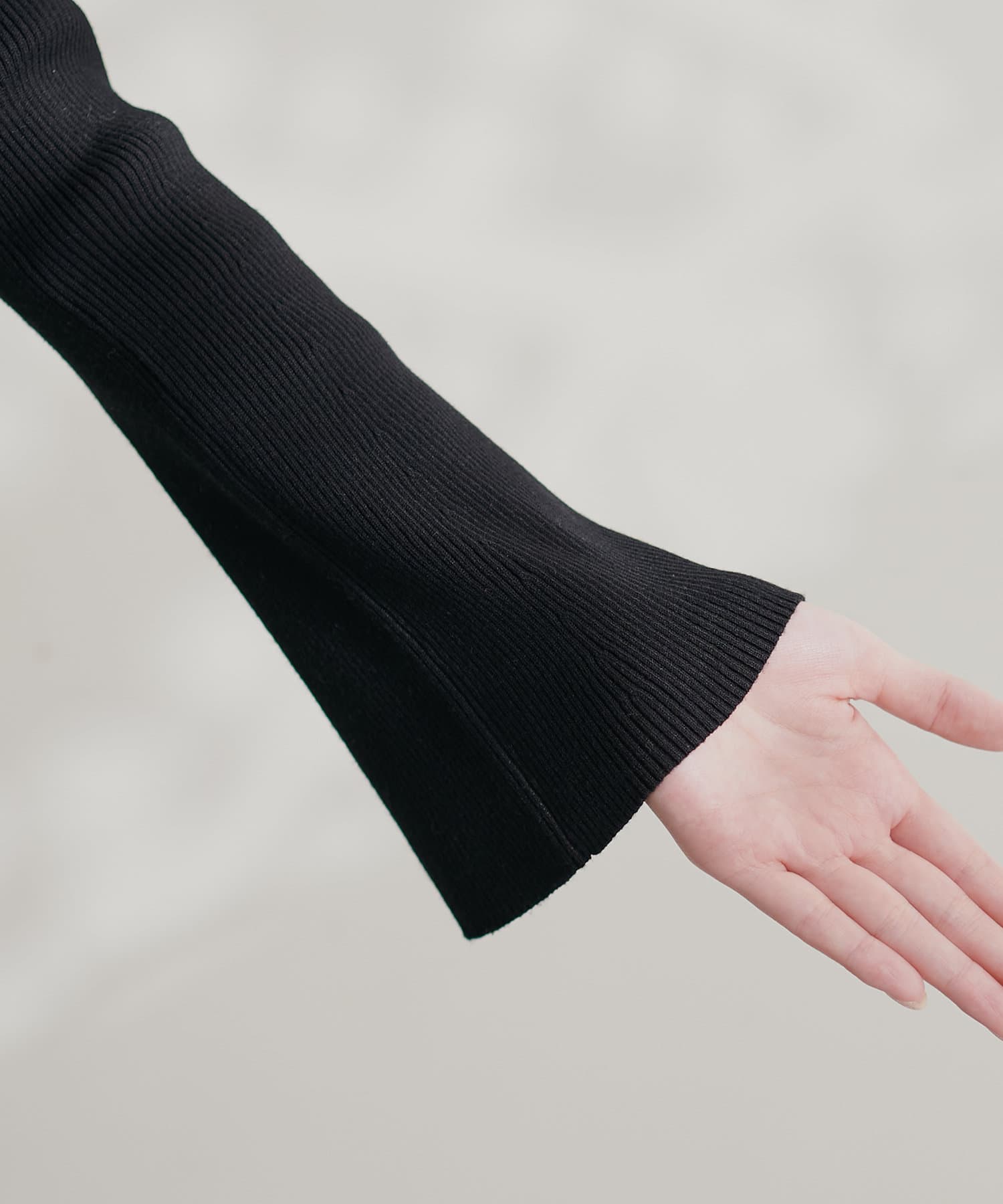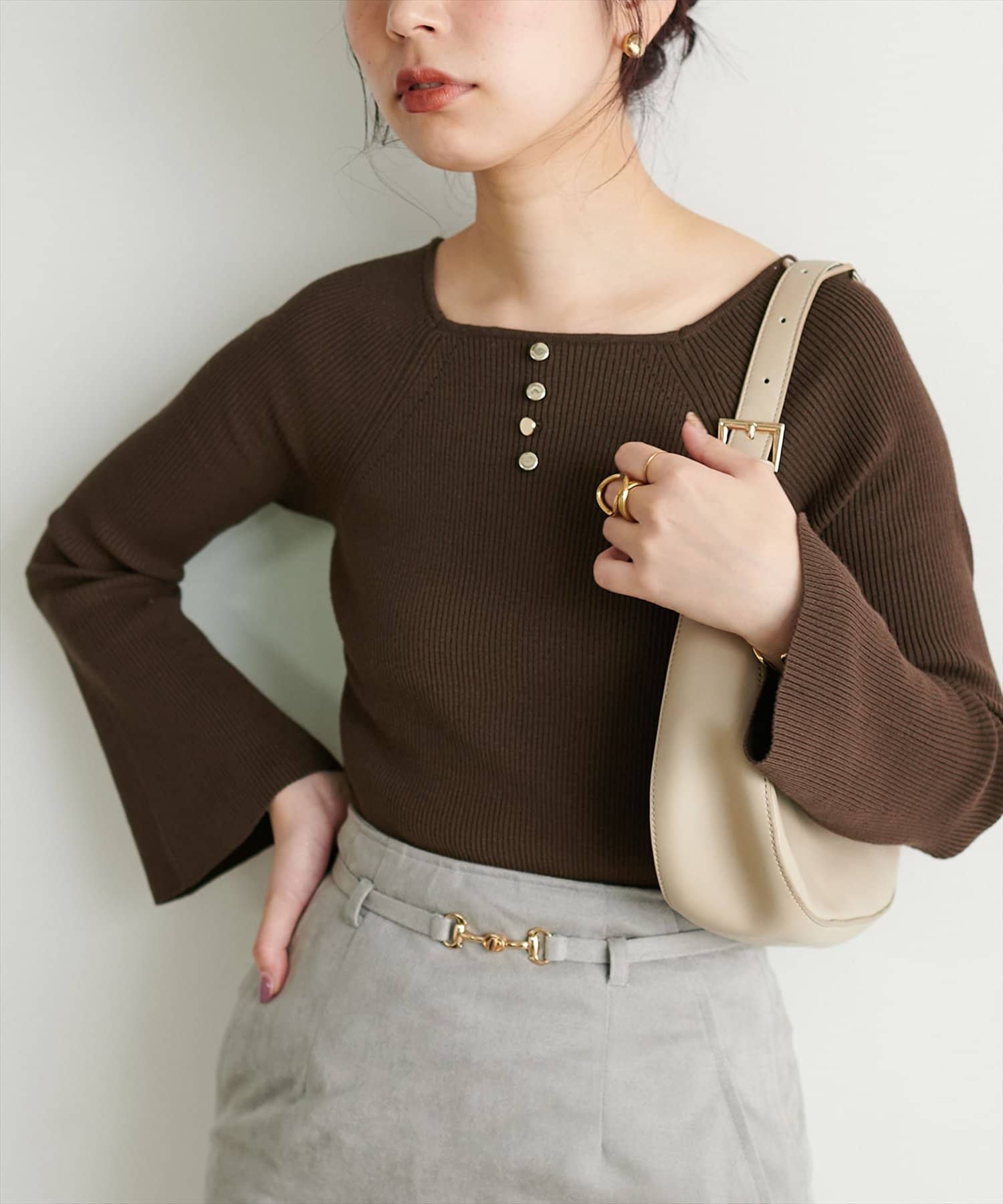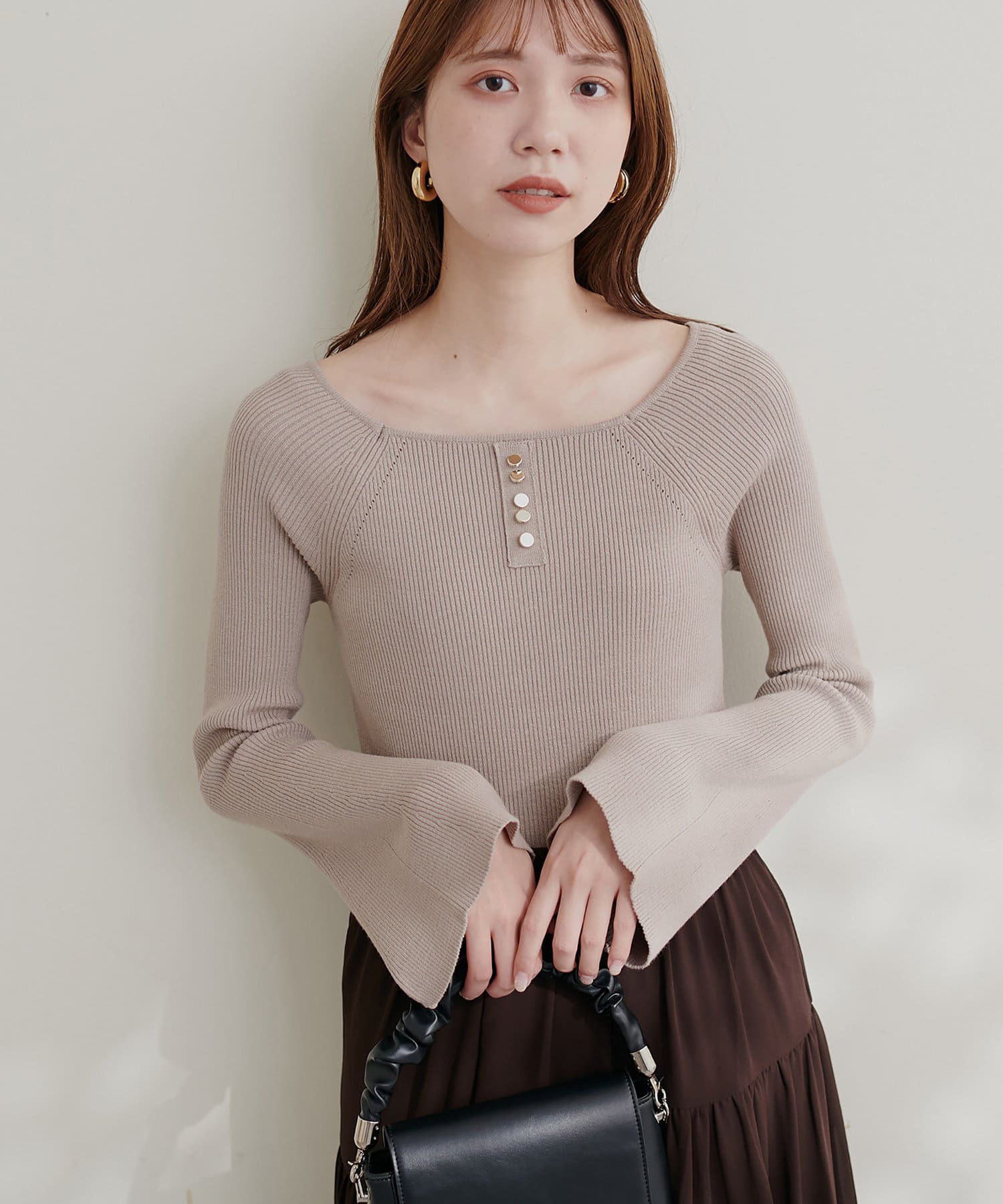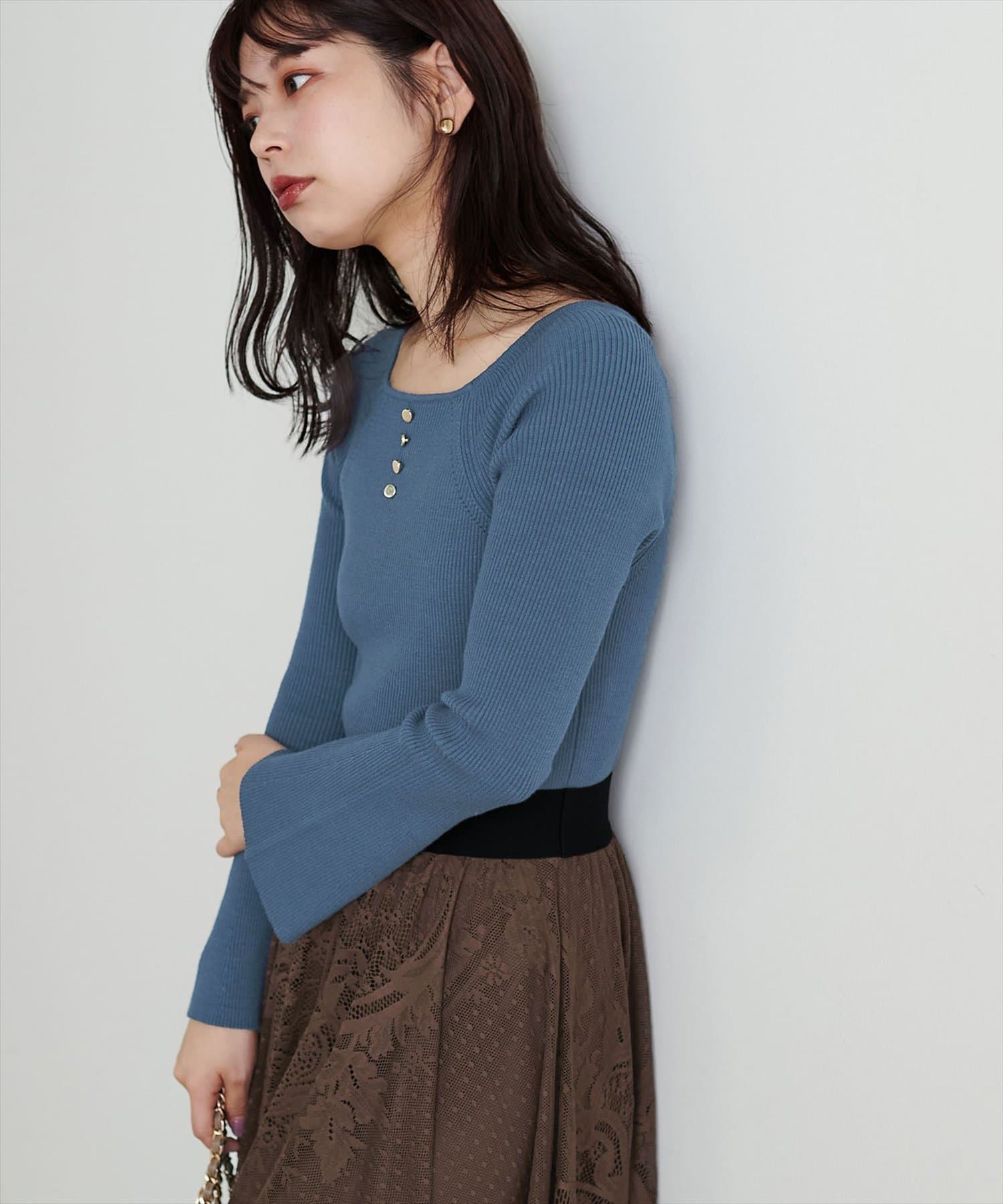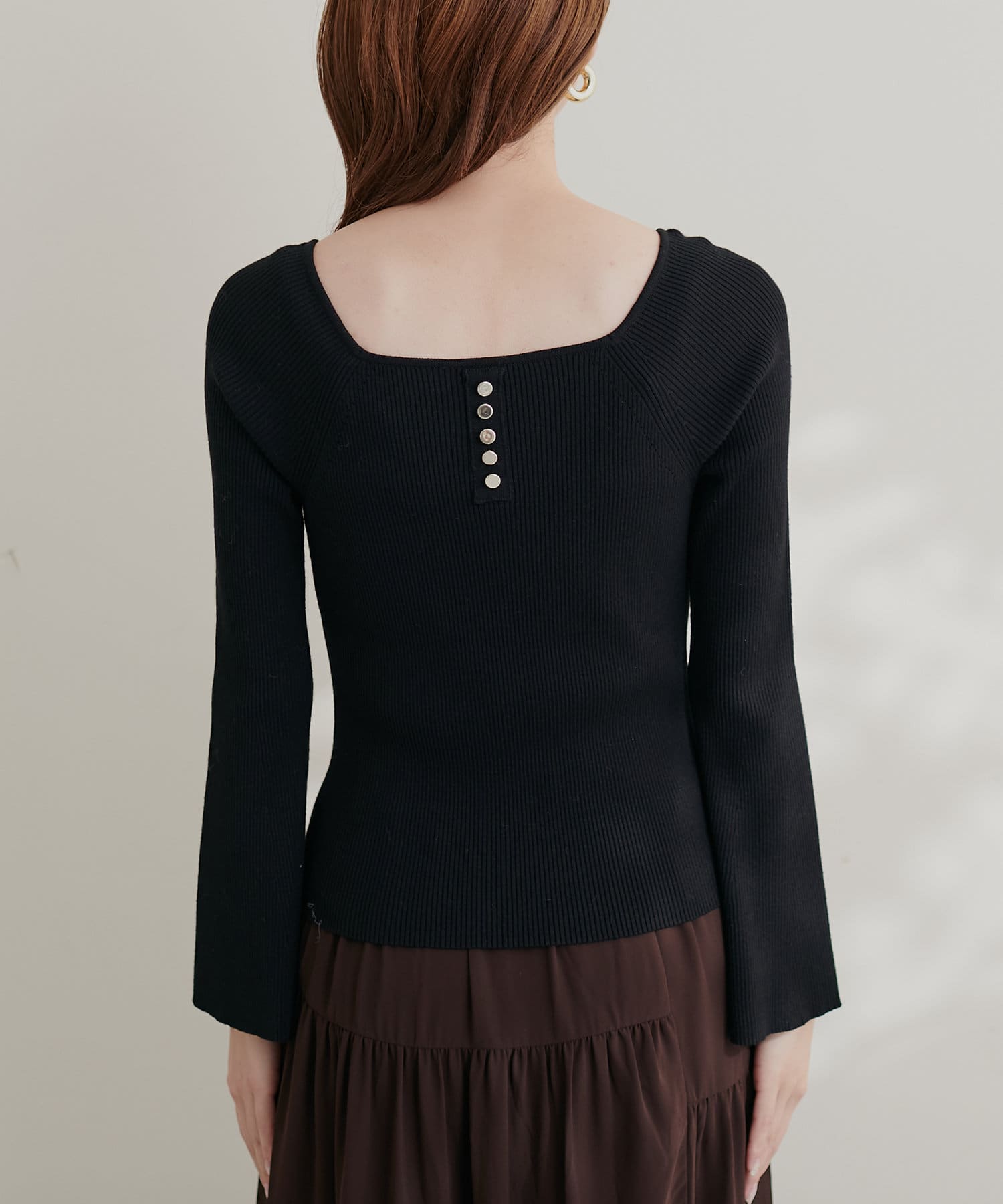 シンプルなスクエアネックのニットですが、袖口にかけてフレアになっているシルエットがポイント。