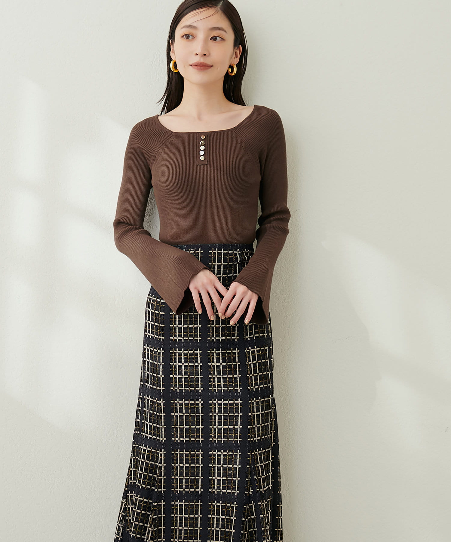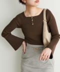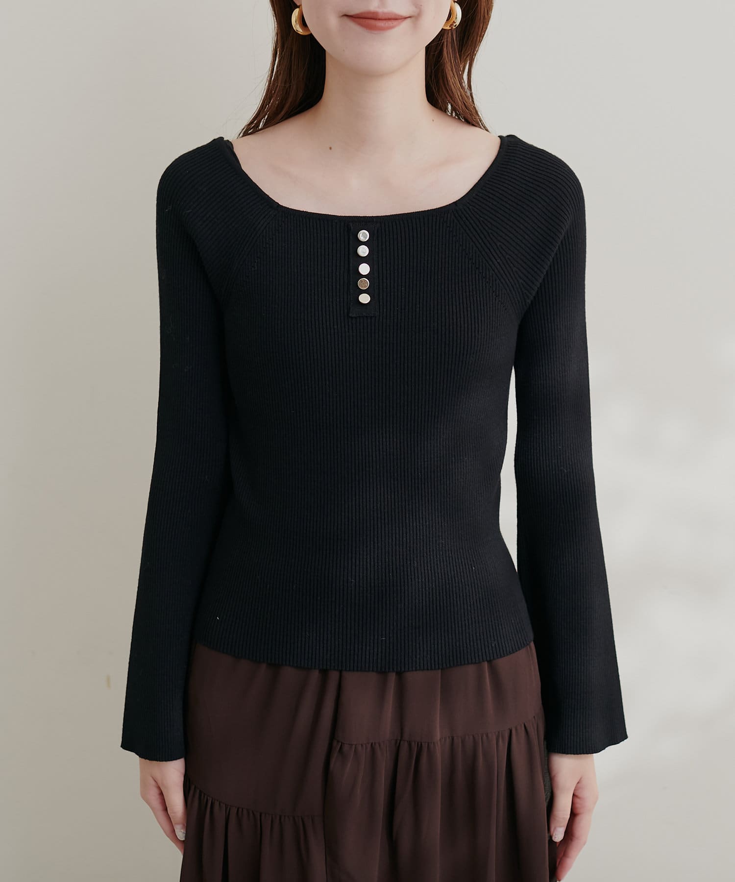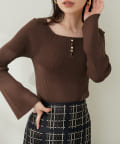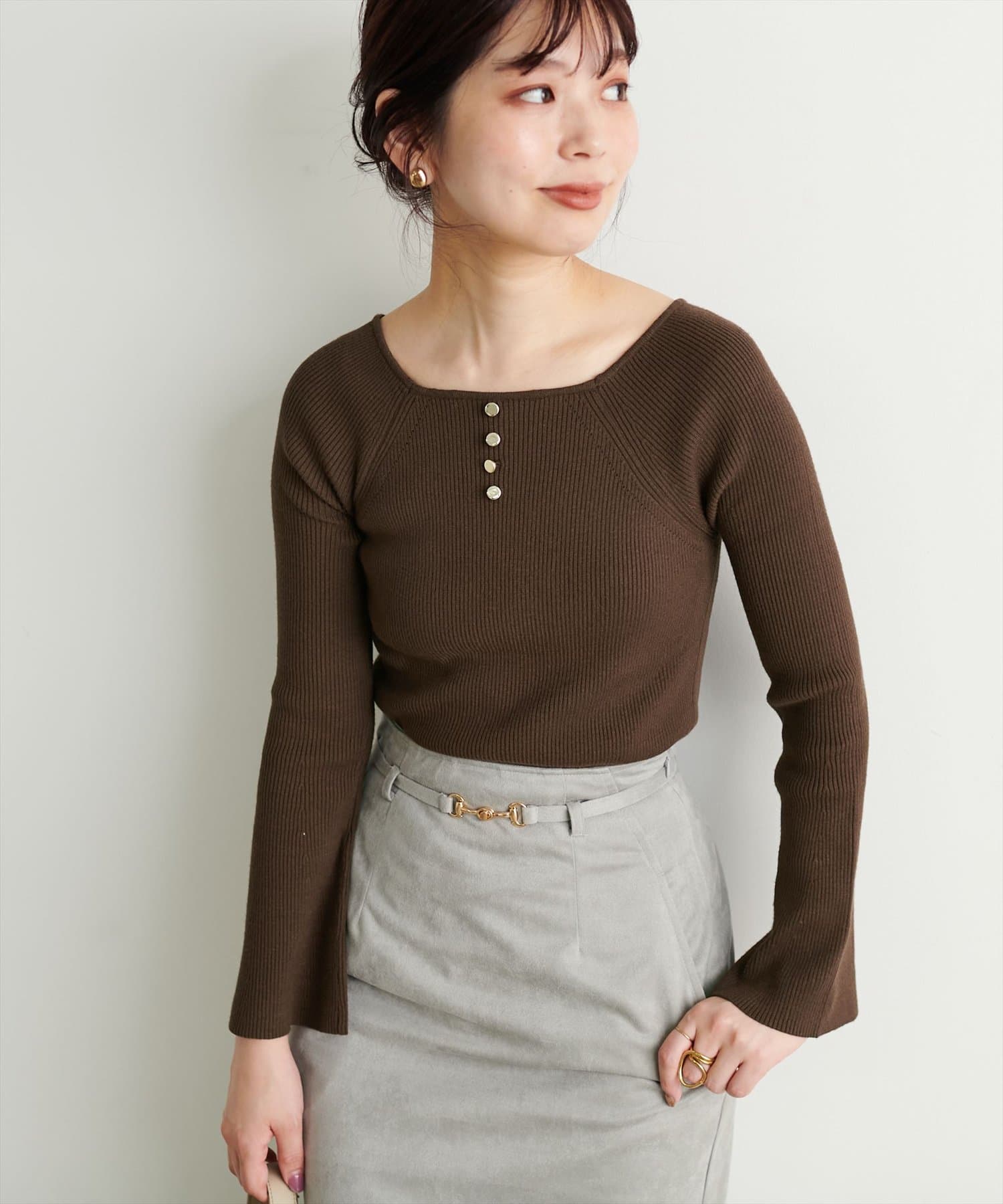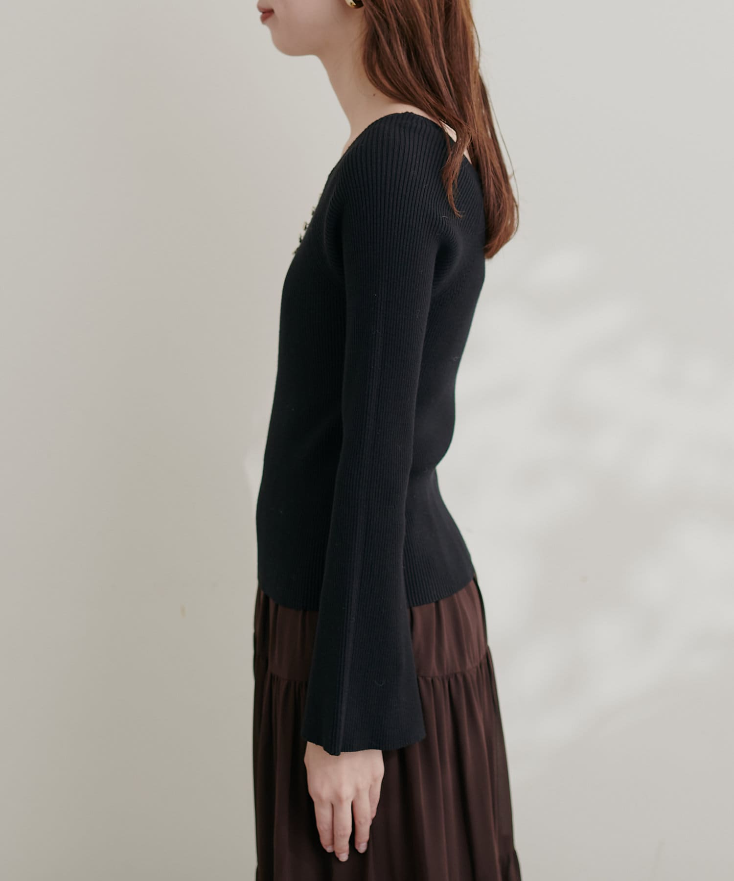 シンプルなスクエアネックのニットですが、袖口にかけてフレアになっているシルエットがポイント。