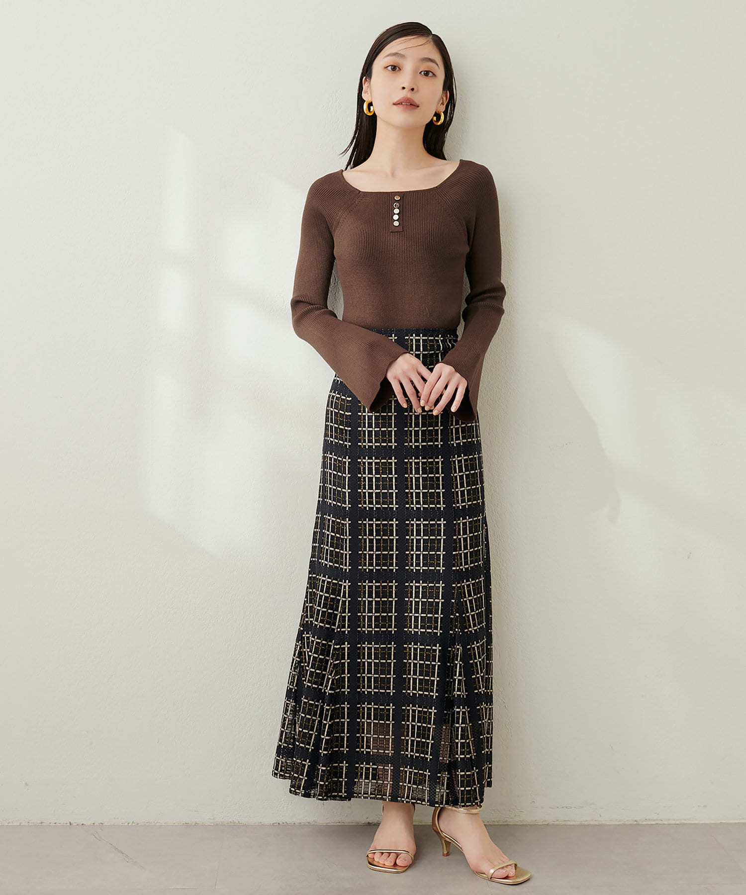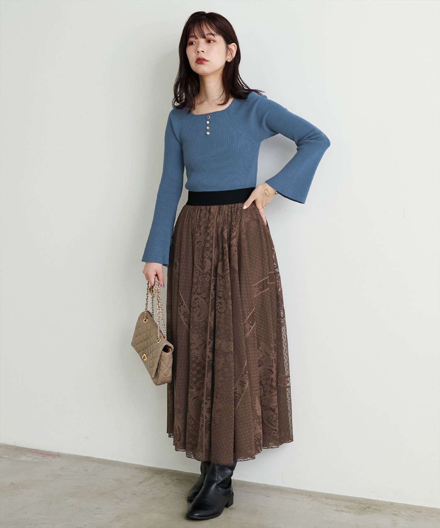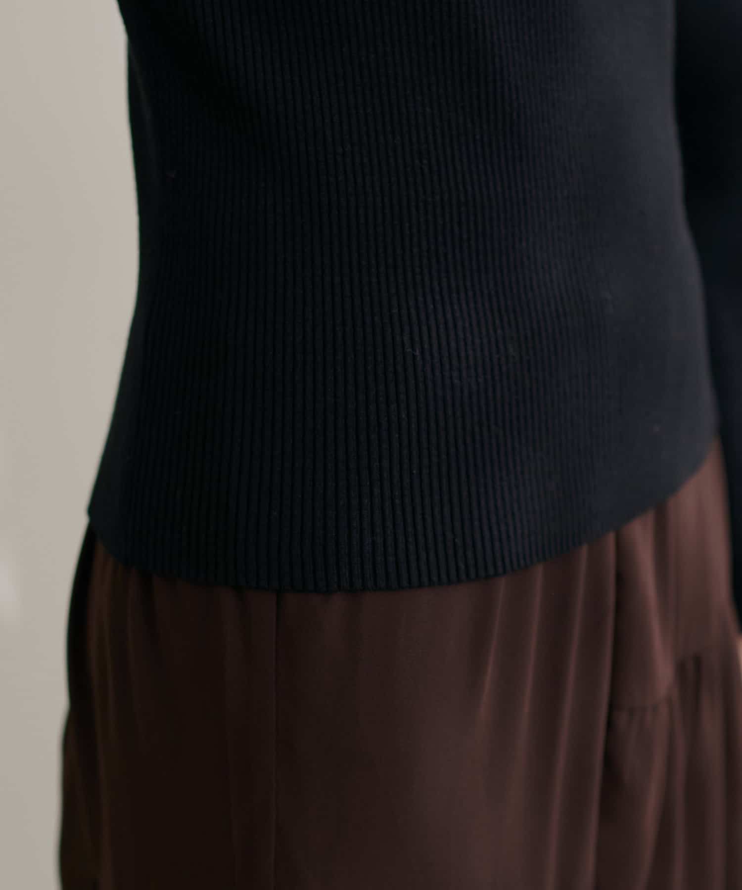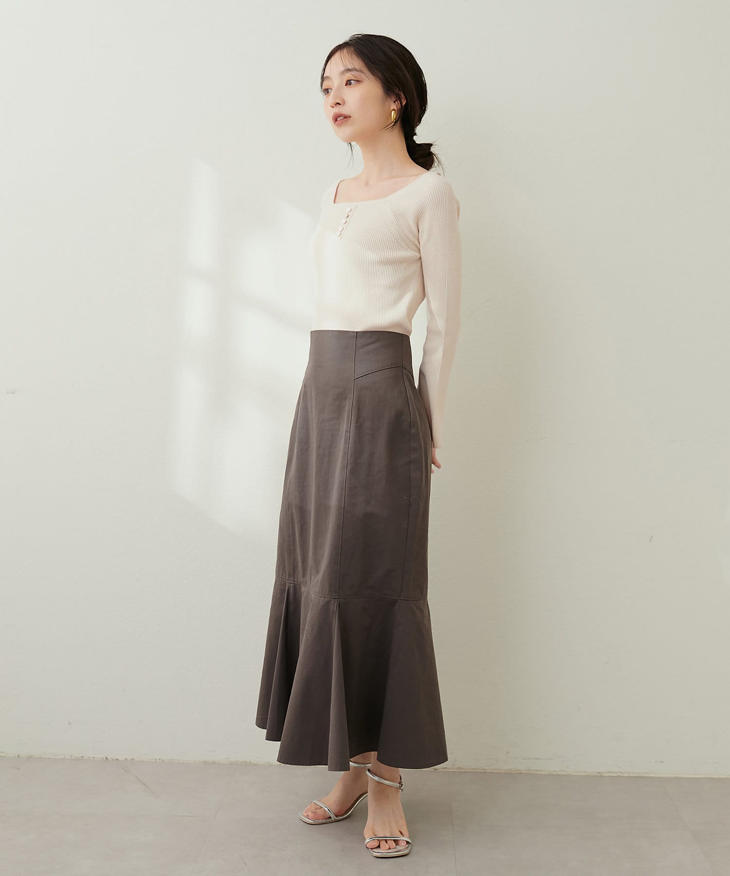 シンプルなスクエアネックのニットですが、袖口にかけてフレアになっているシルエットがポイント。