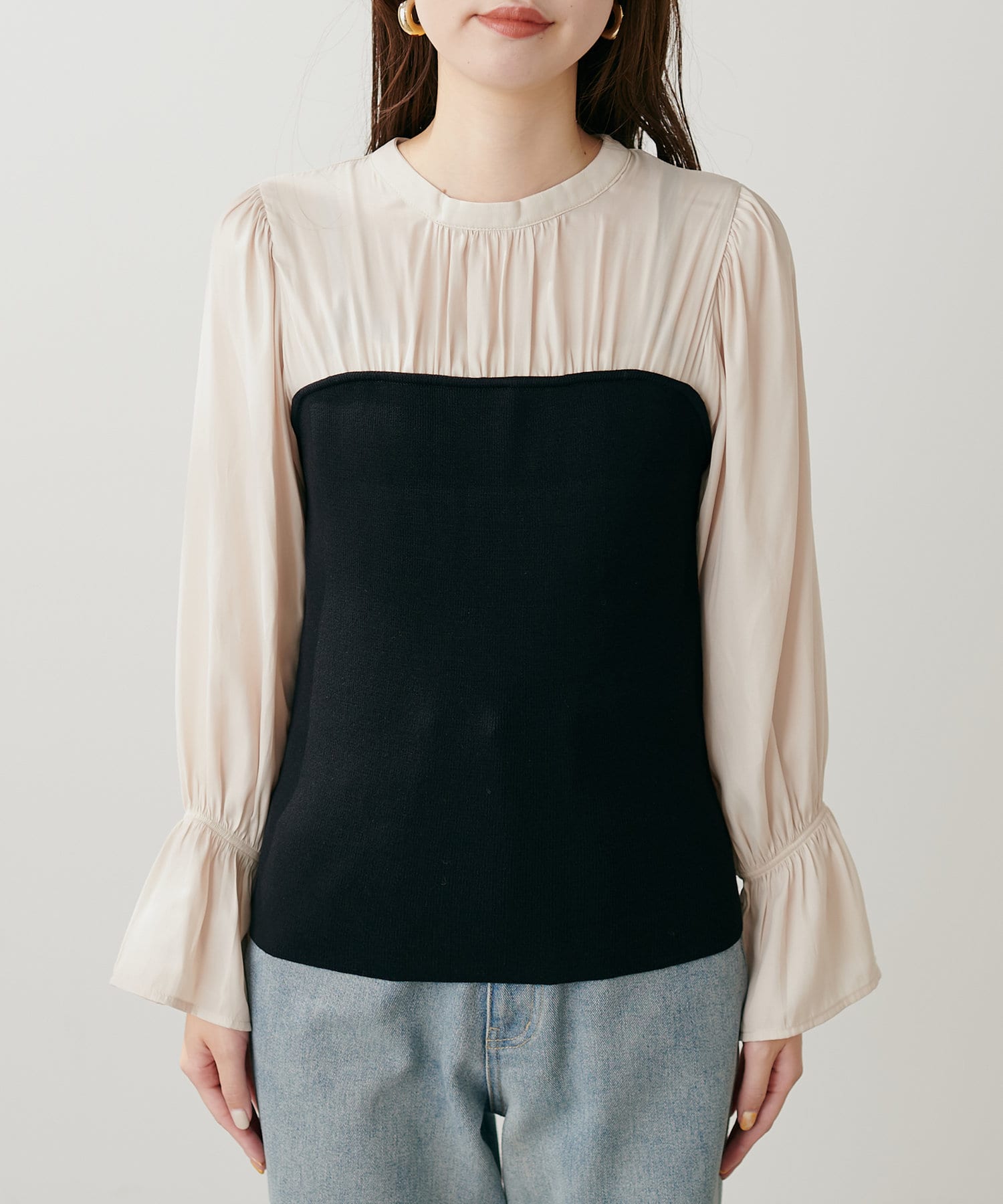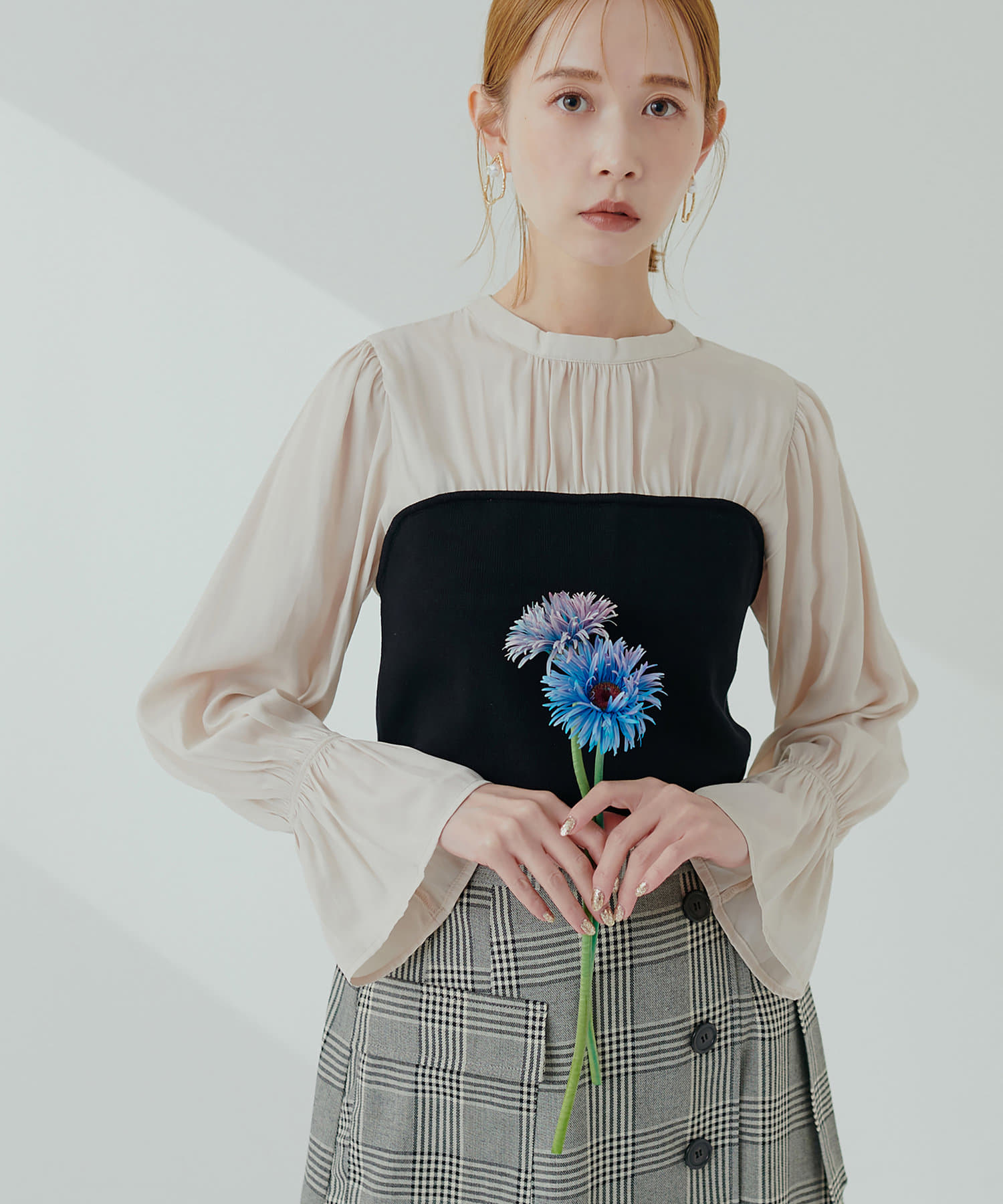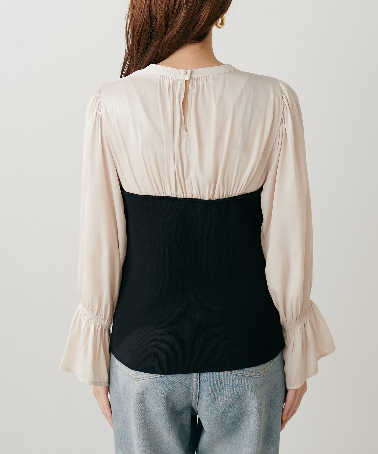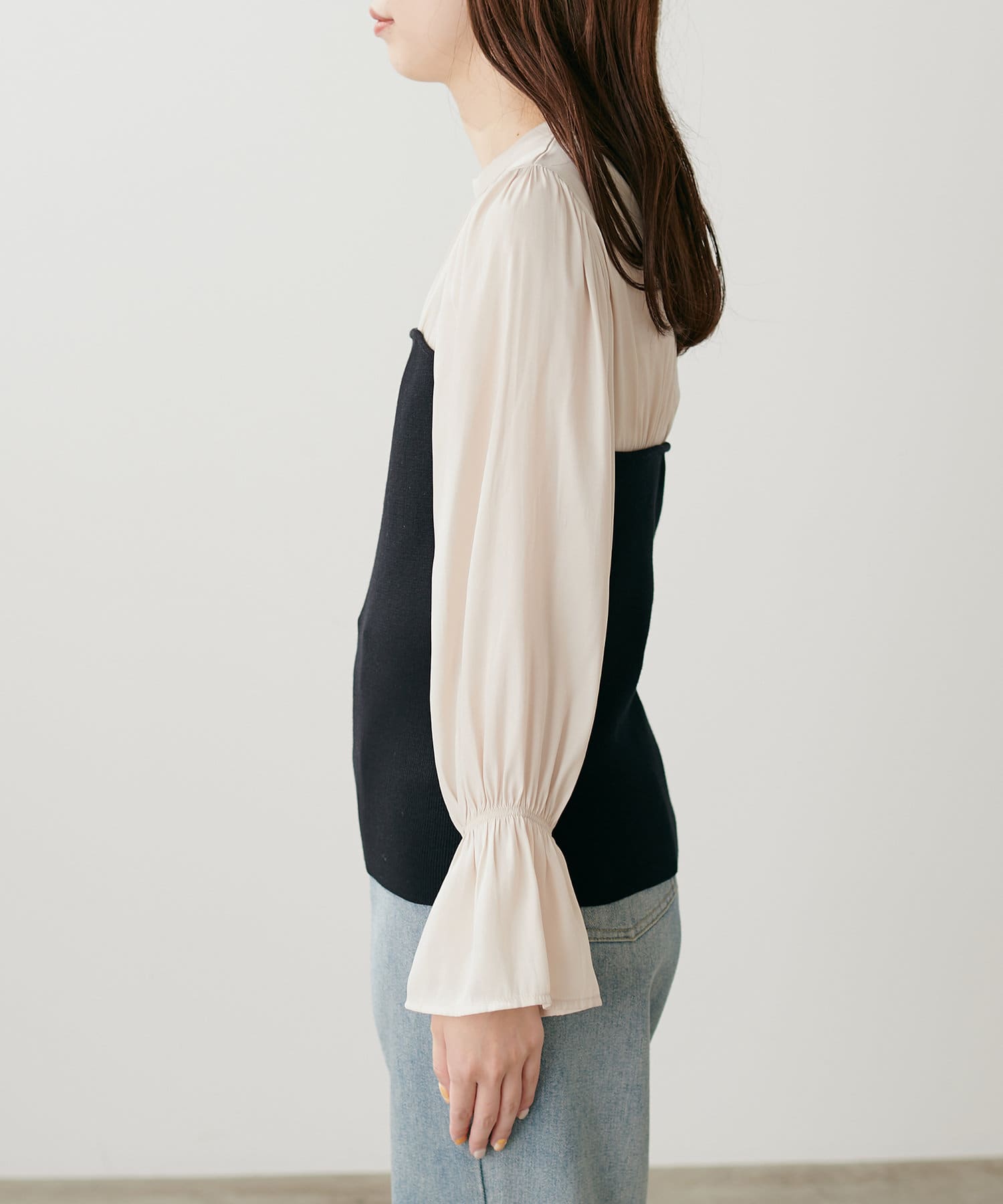 ブラウス部分のややとろみがかった生地とビスチェ部分のハイゲージニットになっている素材感の違いが高見えします。