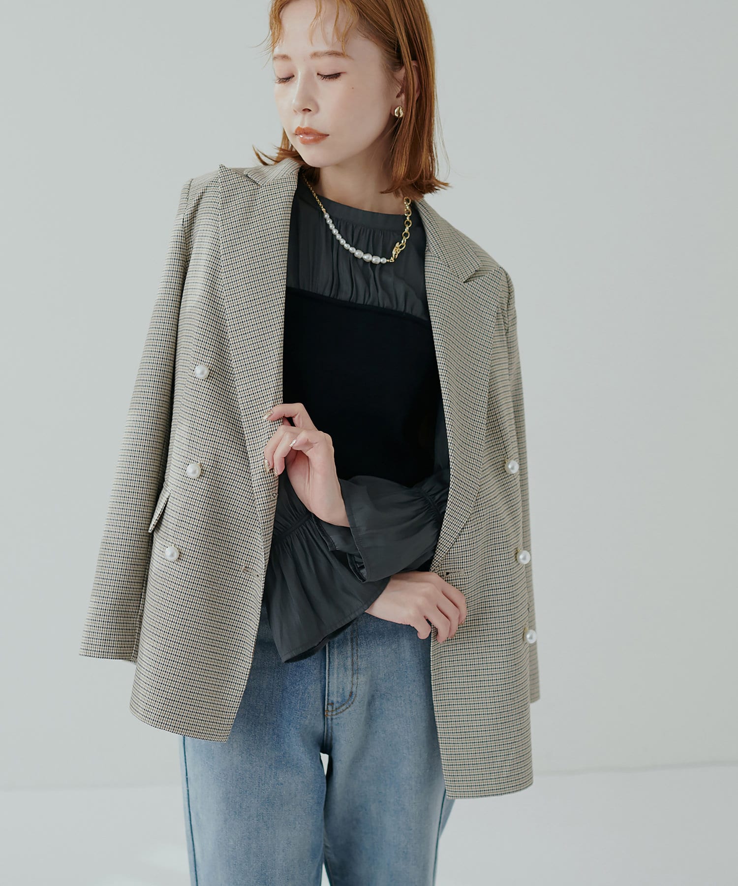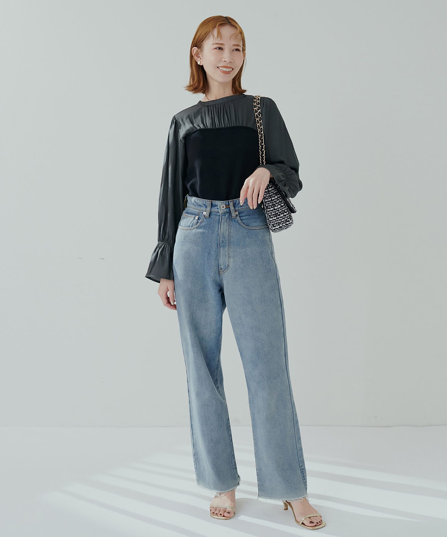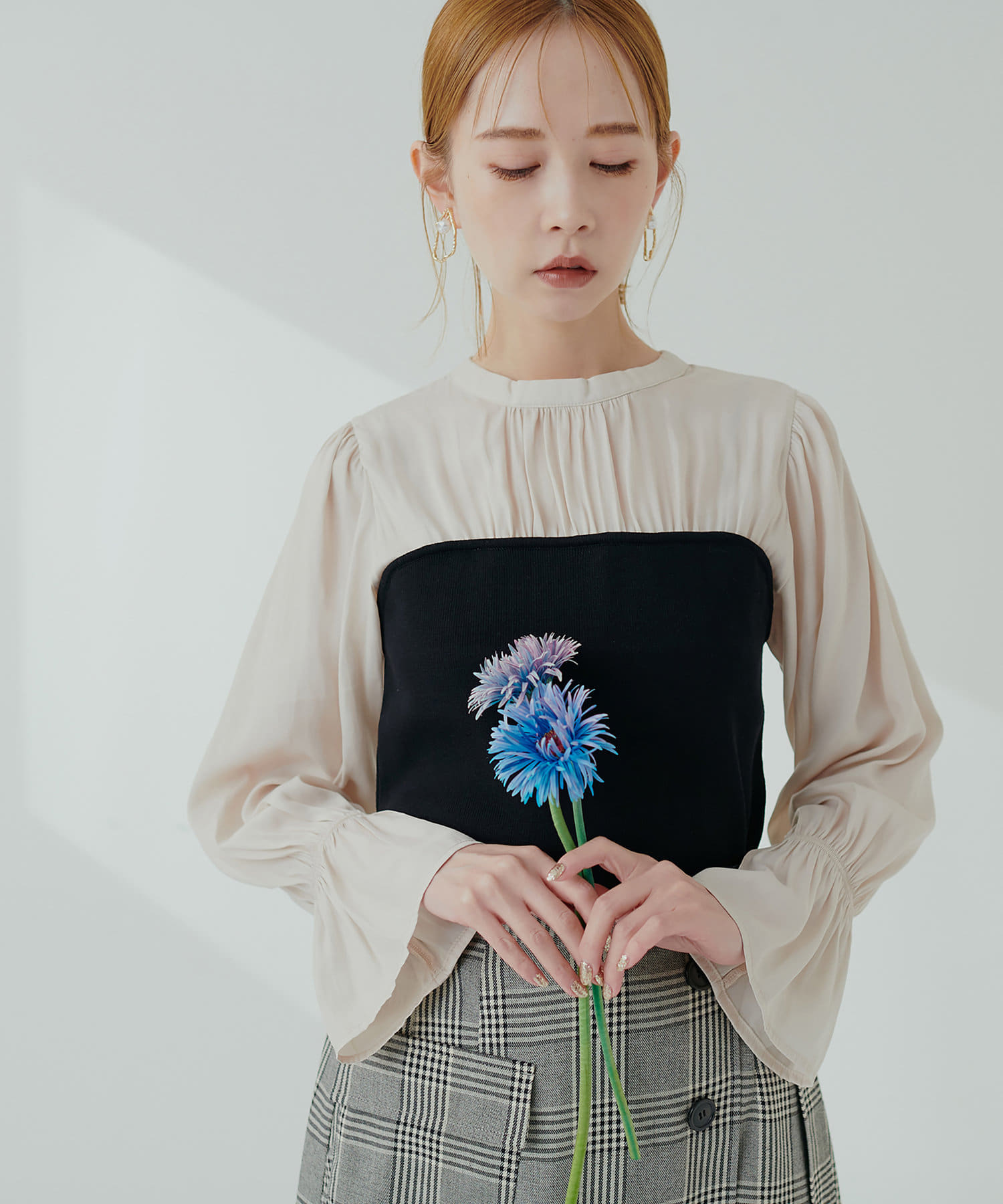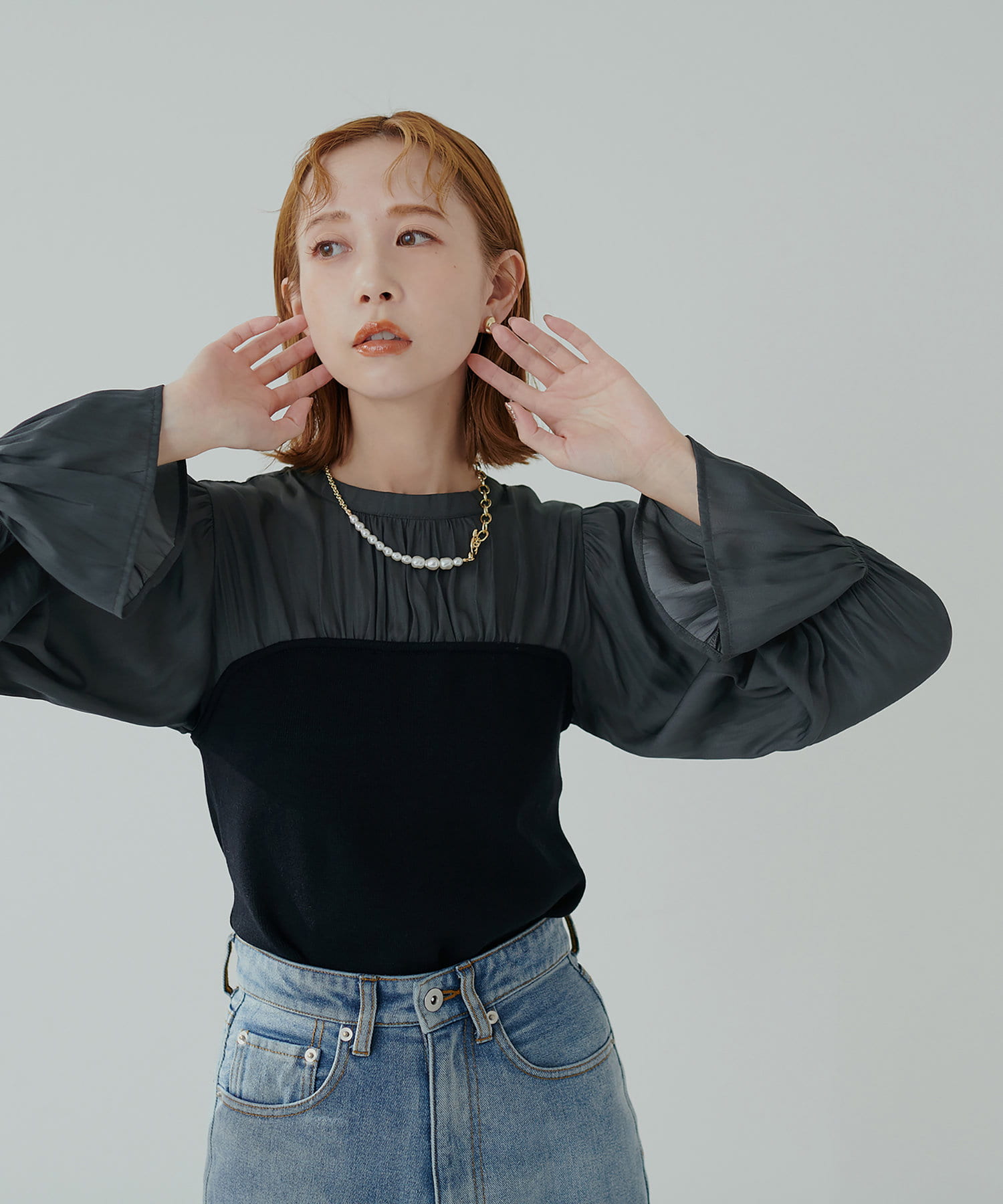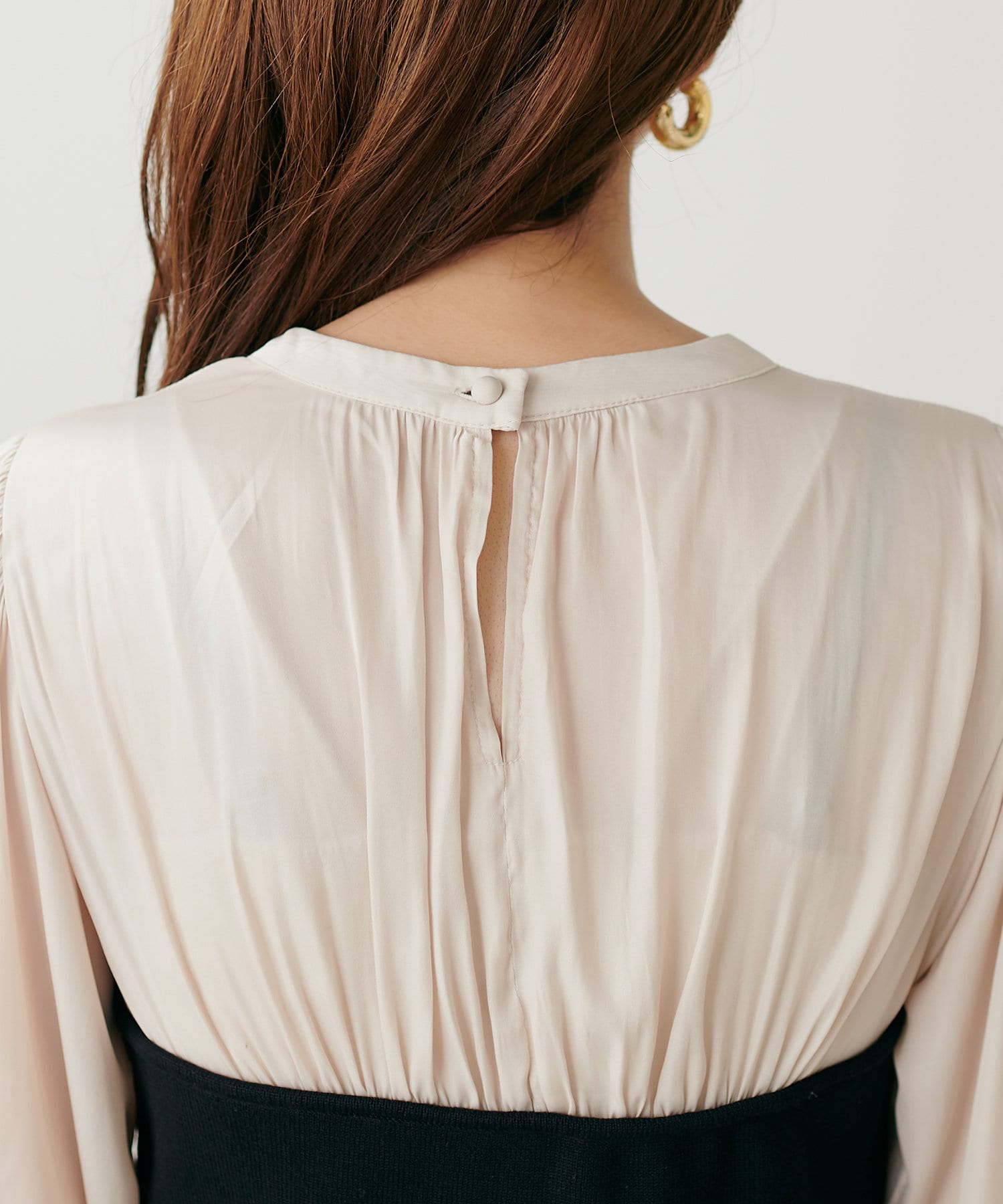 ブラウス部分のややとろみがかった生地とビスチェ部分のハイゲージニットになっている素材感の違いが高見えします。