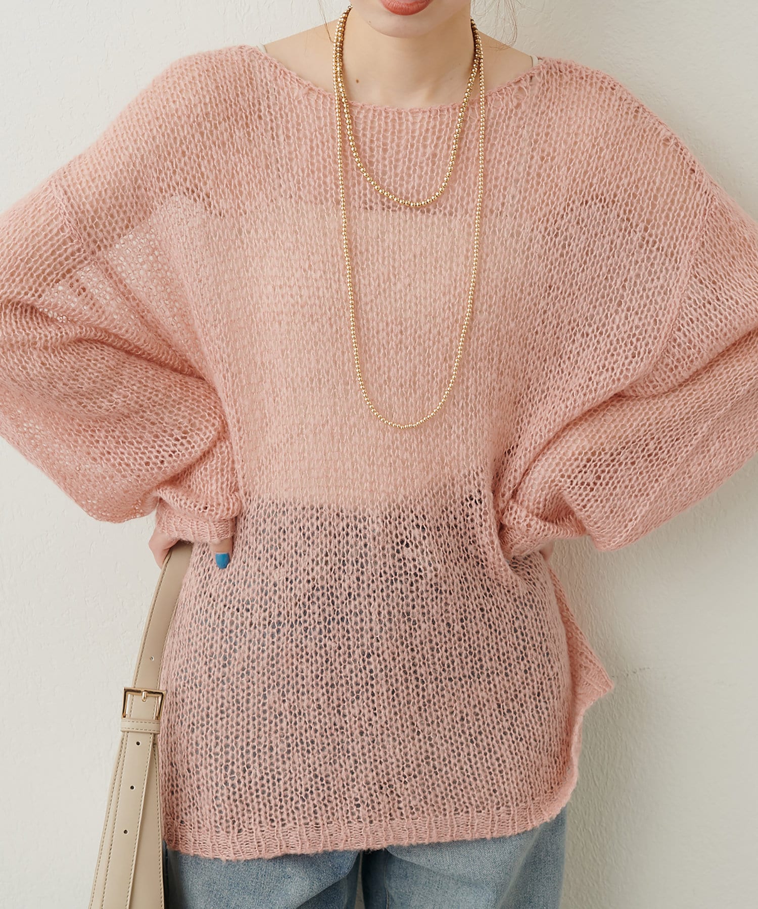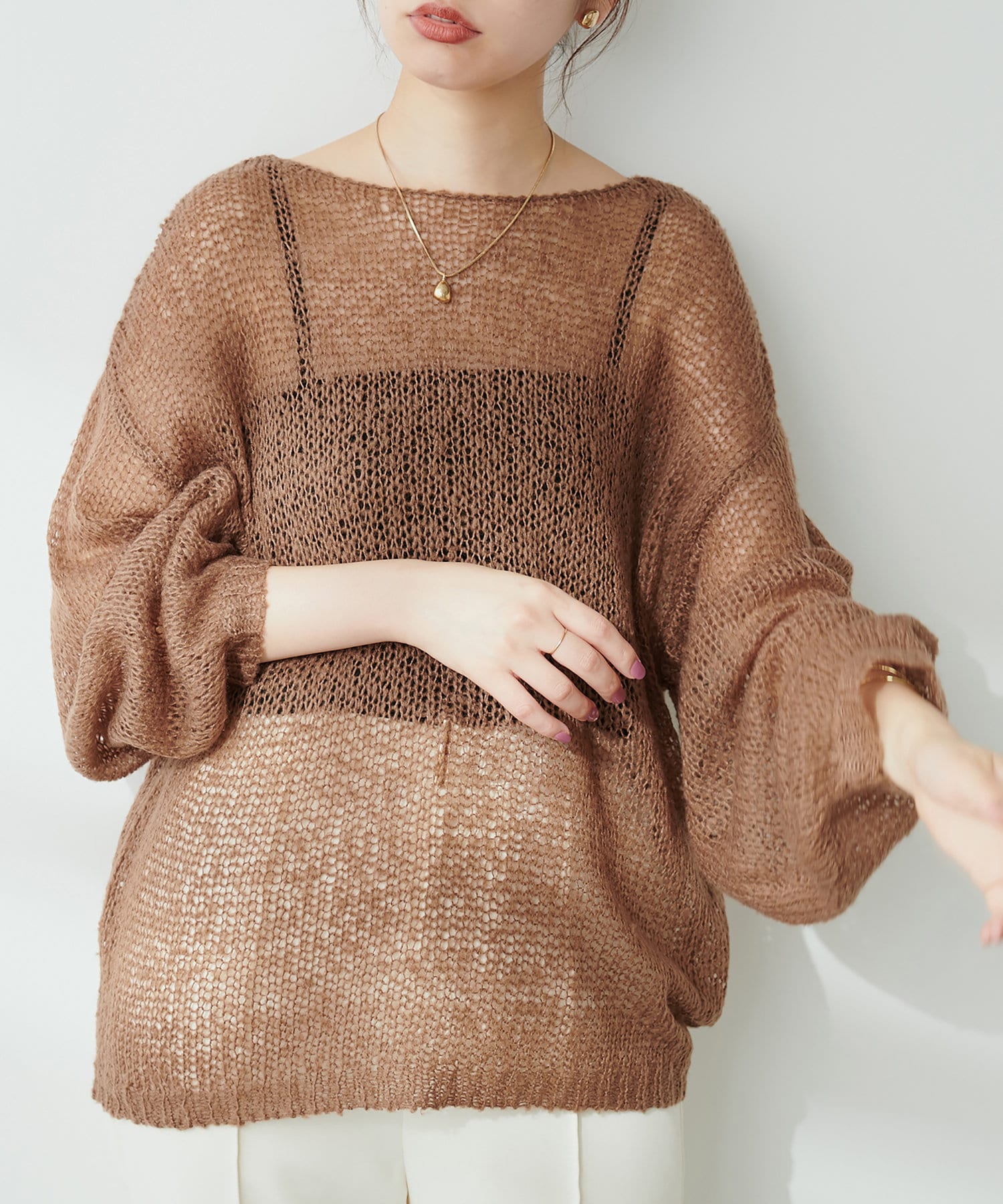透け感があるので、インナーにキャミソールやタンクなどを合わせてお召し下さい。