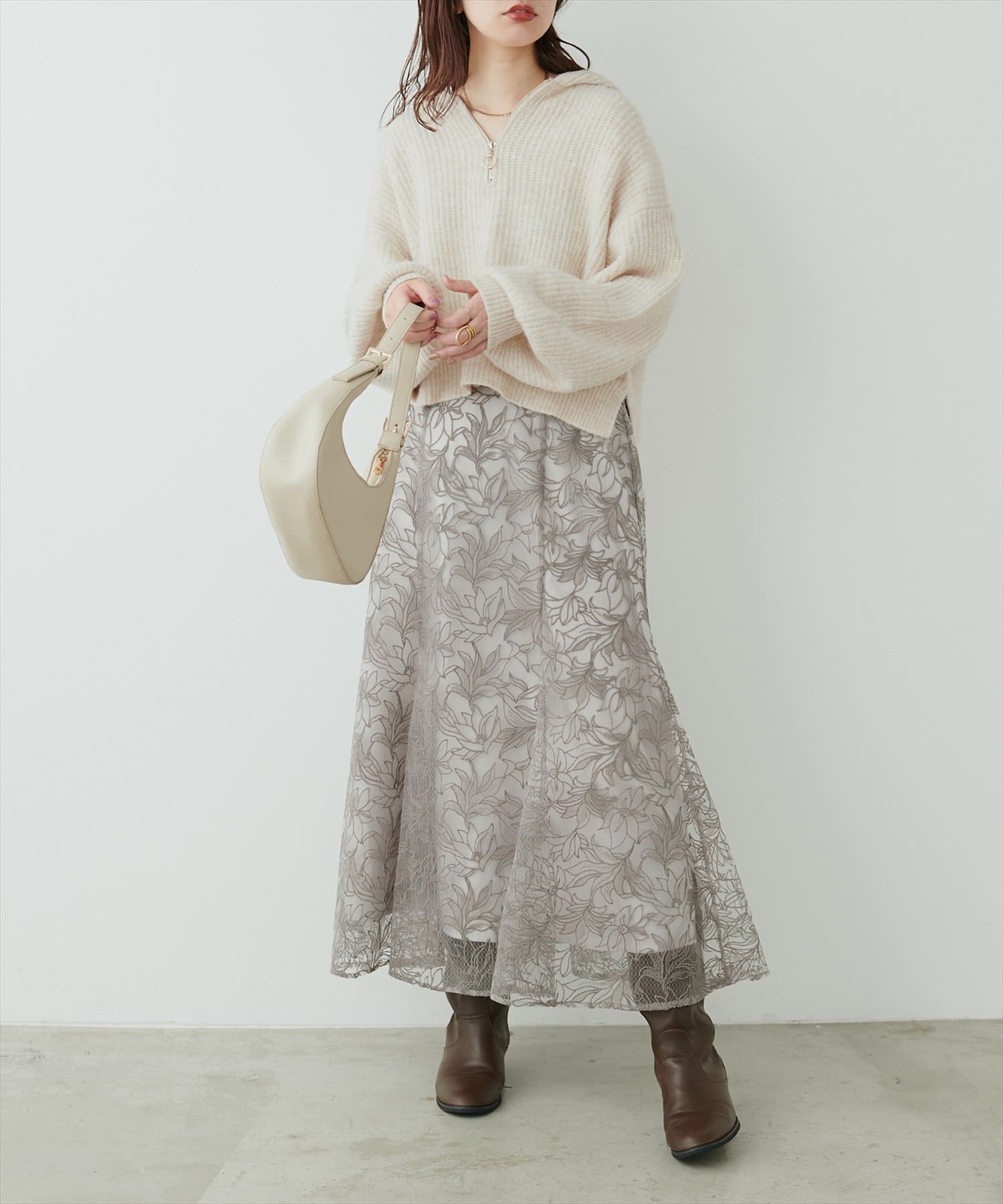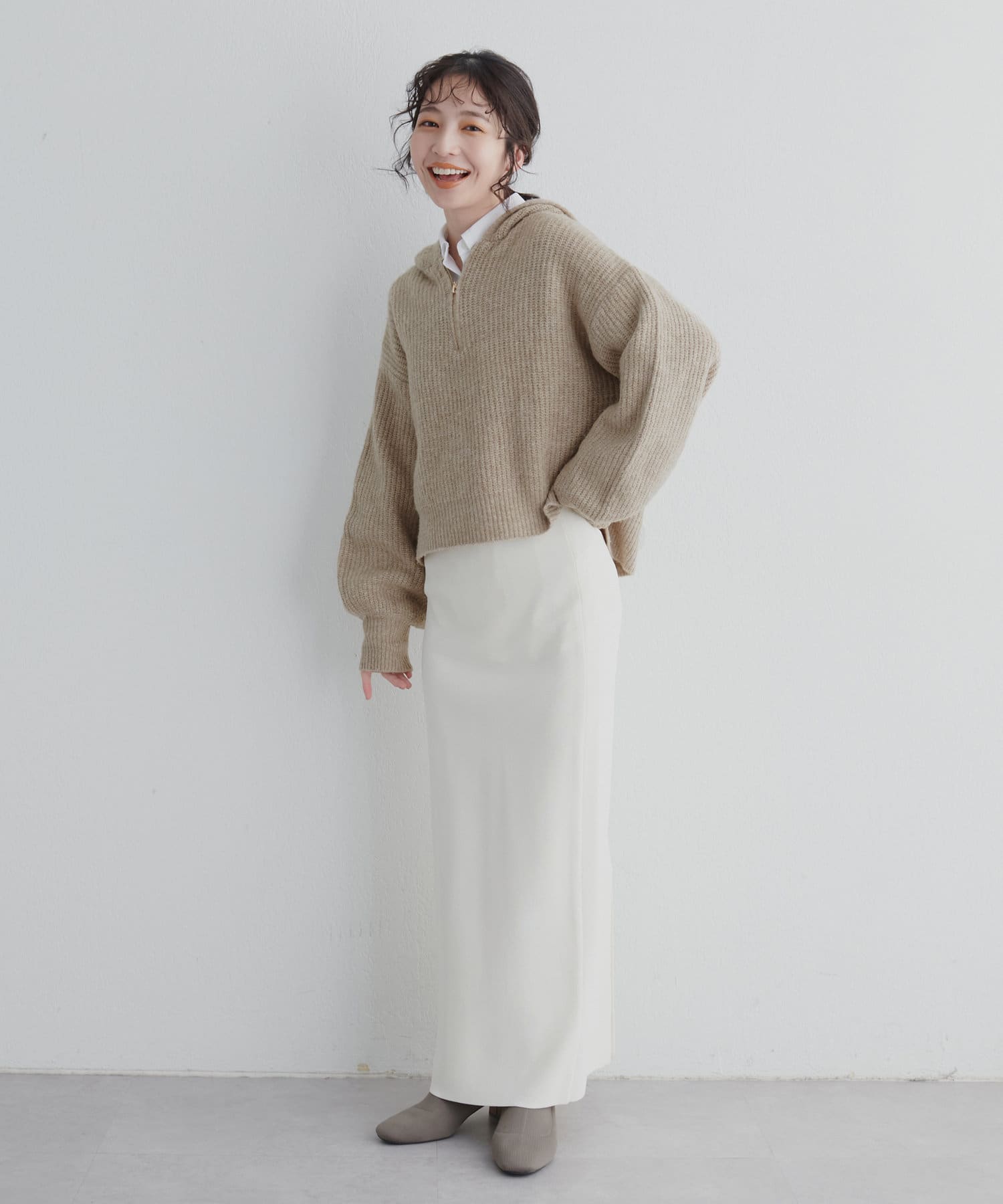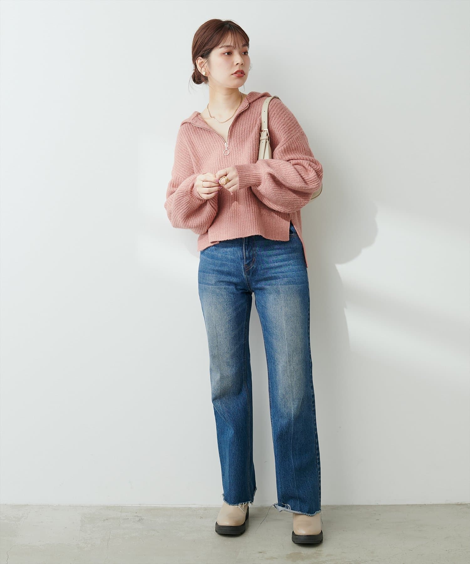 1枚でさらっとお召し頂くのはもちろん、寒くなってきたらタートルネックやハイネックのインナーを仕込むのも、ハーフジップならではの楽しみ方でおすすめです。