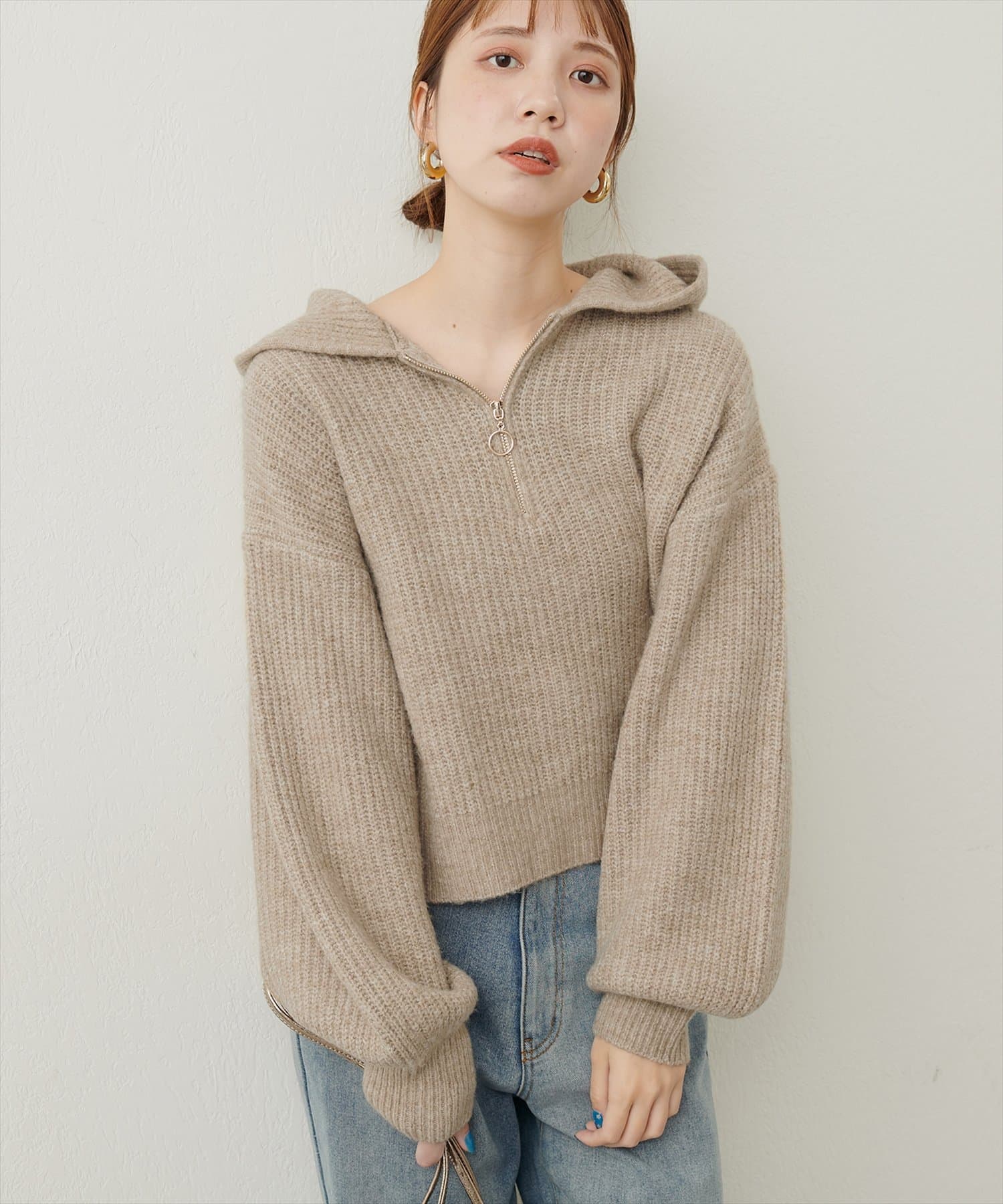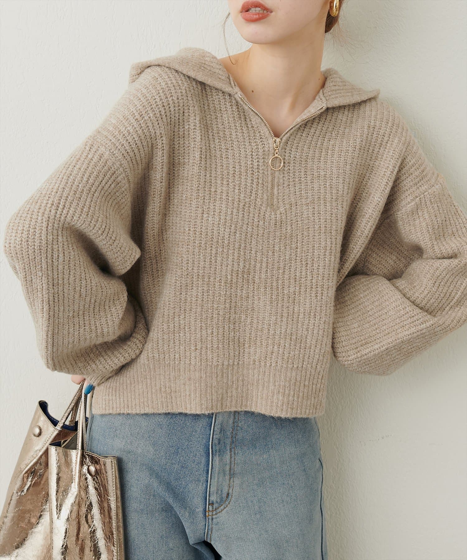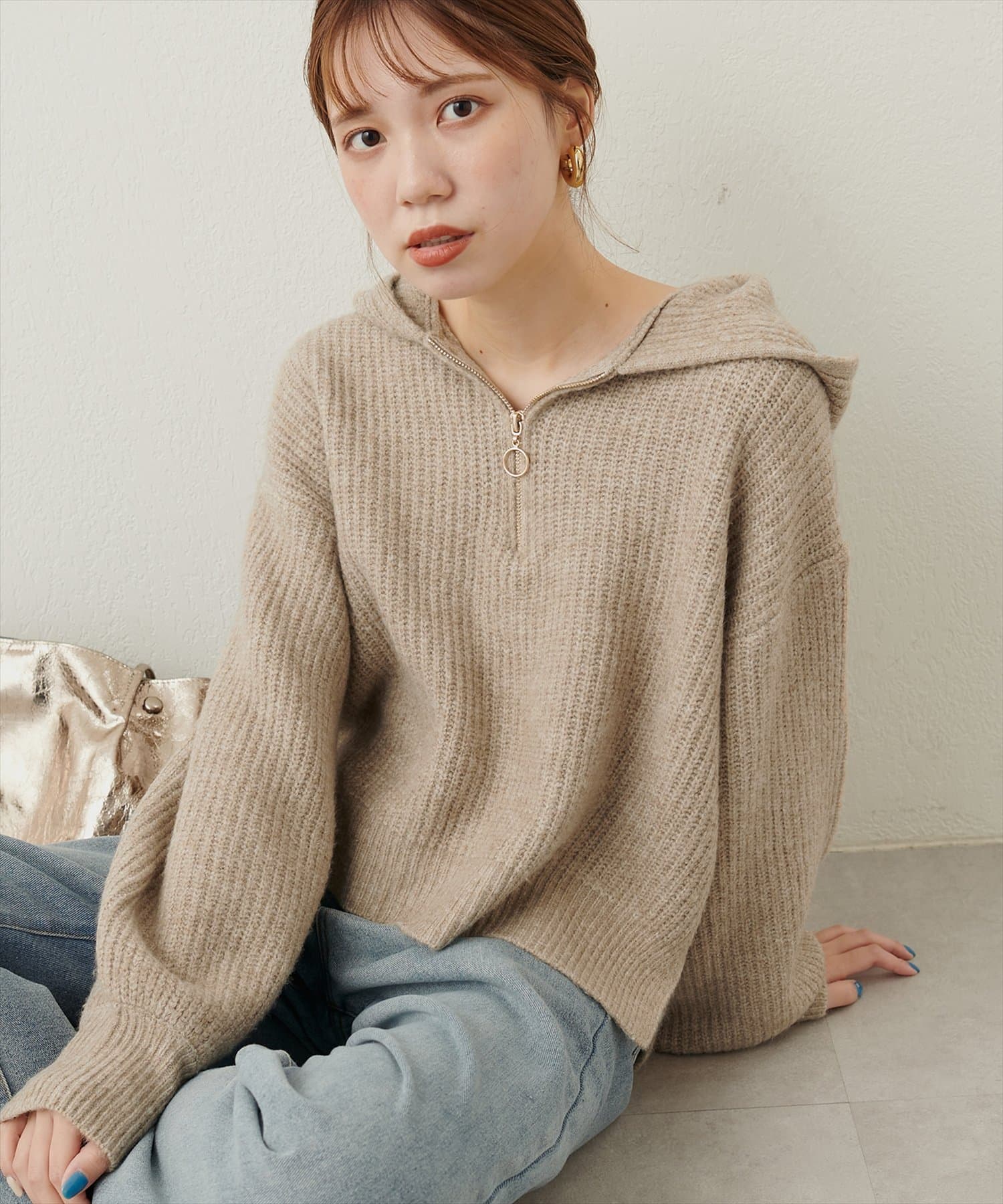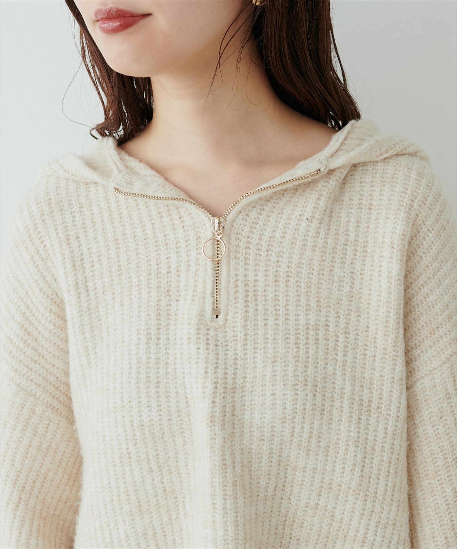 ゴールドのファスナーがポイントの、大人カジュアルなフード付きニット。