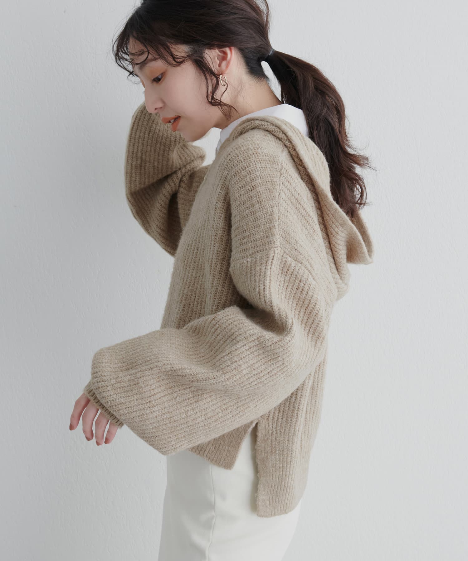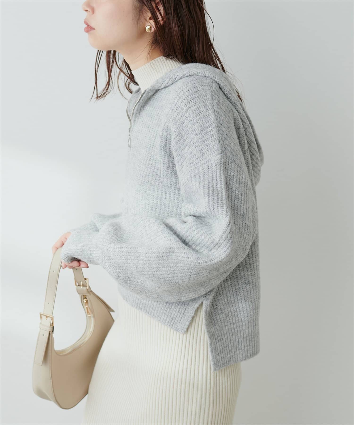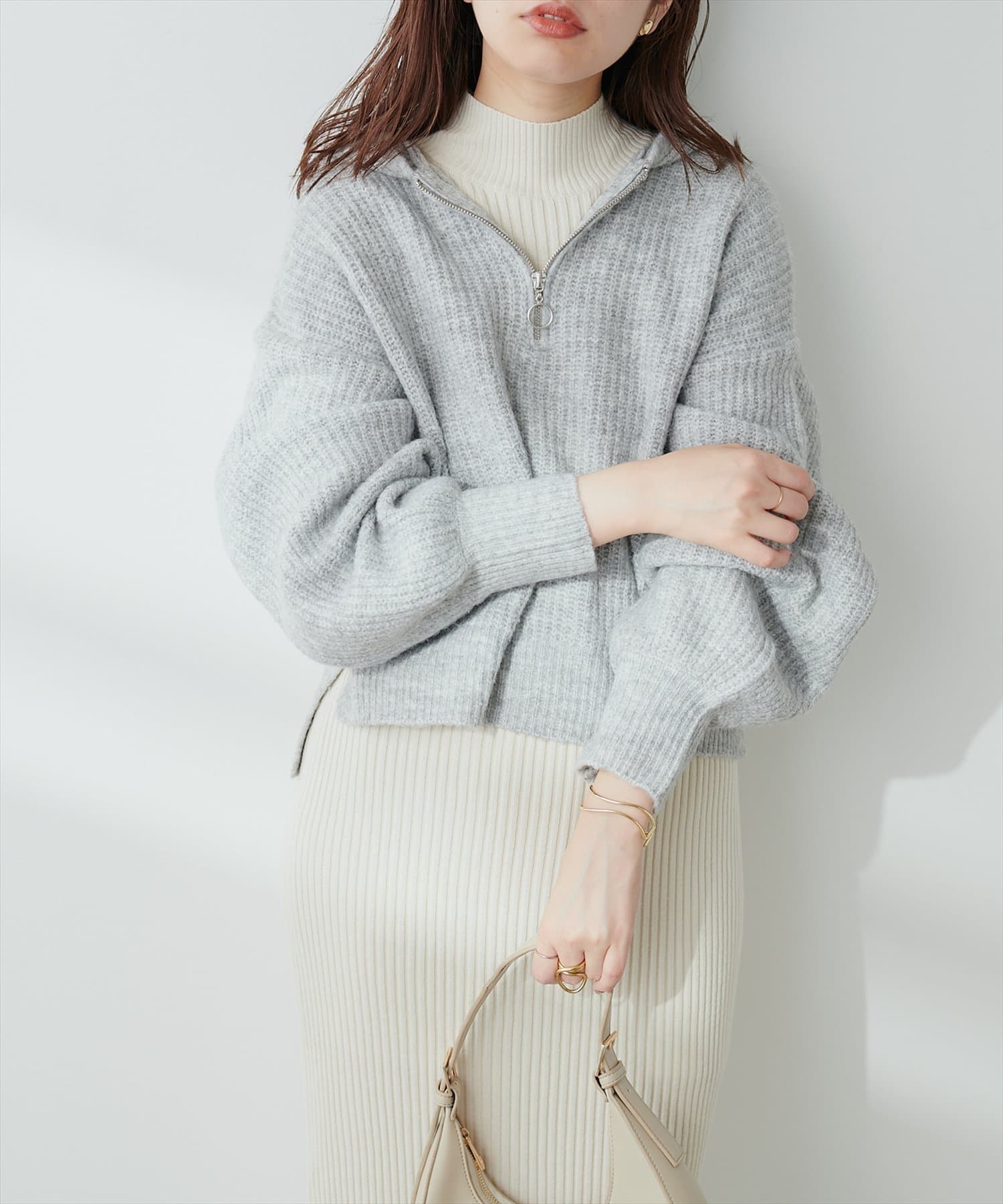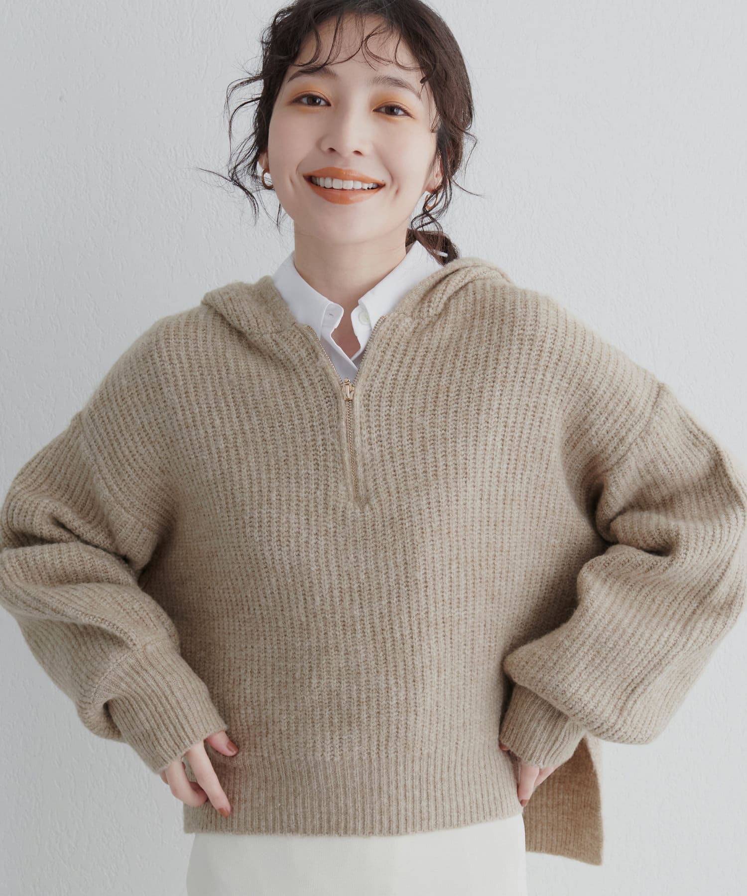 ゴールドのファスナーがポイントの、大人カジュアルなフード付きニット。